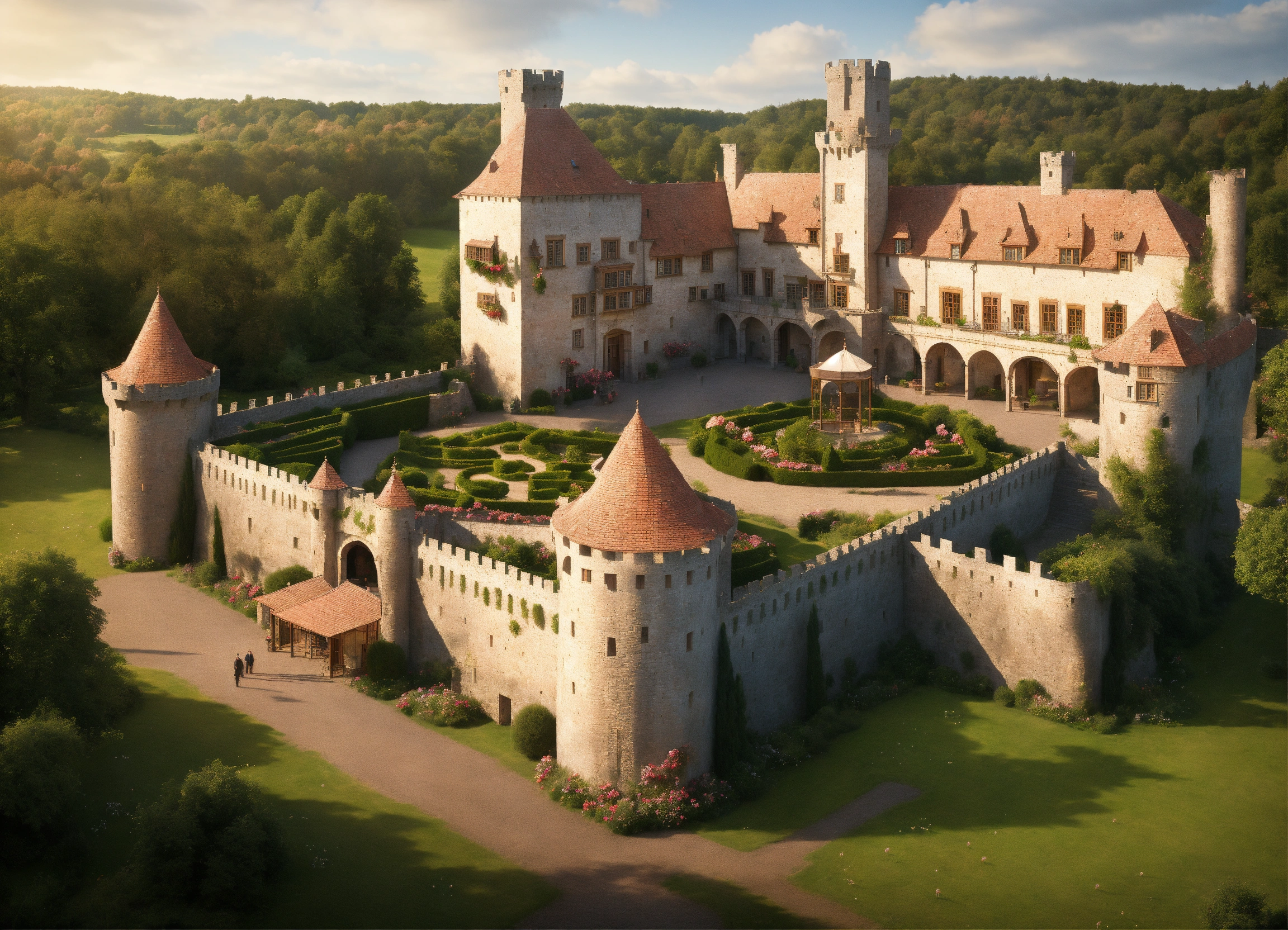Ultra realistic, photorealistic, bird's eye view of a small medieval castle on a rock, garden terraces with pond, rose bowers, magnificent rose garden and arcades, magnificent fountain, massive crenellated stone wall with a central wall gate and watchtowers surrounds the castle area, with a large inner courtyard and several servants quarters and stables, rose pavillon, pleasure grotto, large forecourt, a wide boulevard leads to the entrance of the castle, extensive rose fields on hilly landscapes in the area around the castle, ultra detailled, focus on castle, sharp focus, sharp, ambient lighting, ksiąz castle in poland