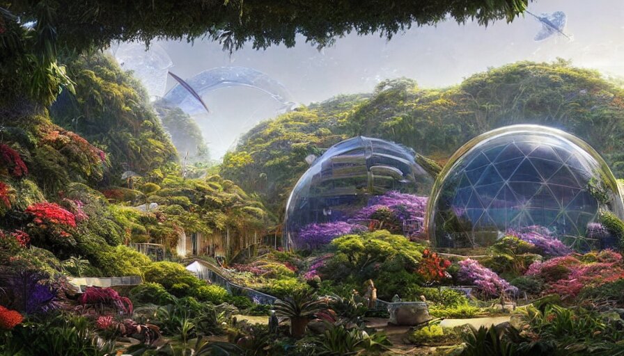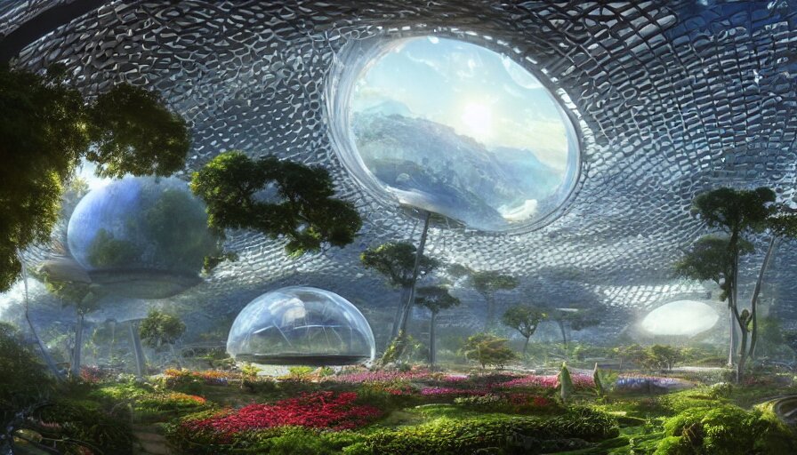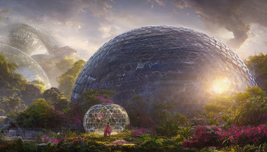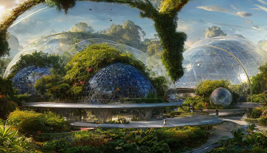 Highly detailed digital matte painting of beautiful gardens and a geodesic biodome on a massive ring shaped space station, by raphael lacoste and stephan martiniere and justin gerard and robert mccall, postcyberpunk, geodesic dome, hyperdetailed, sunrise, wide shot, octane render