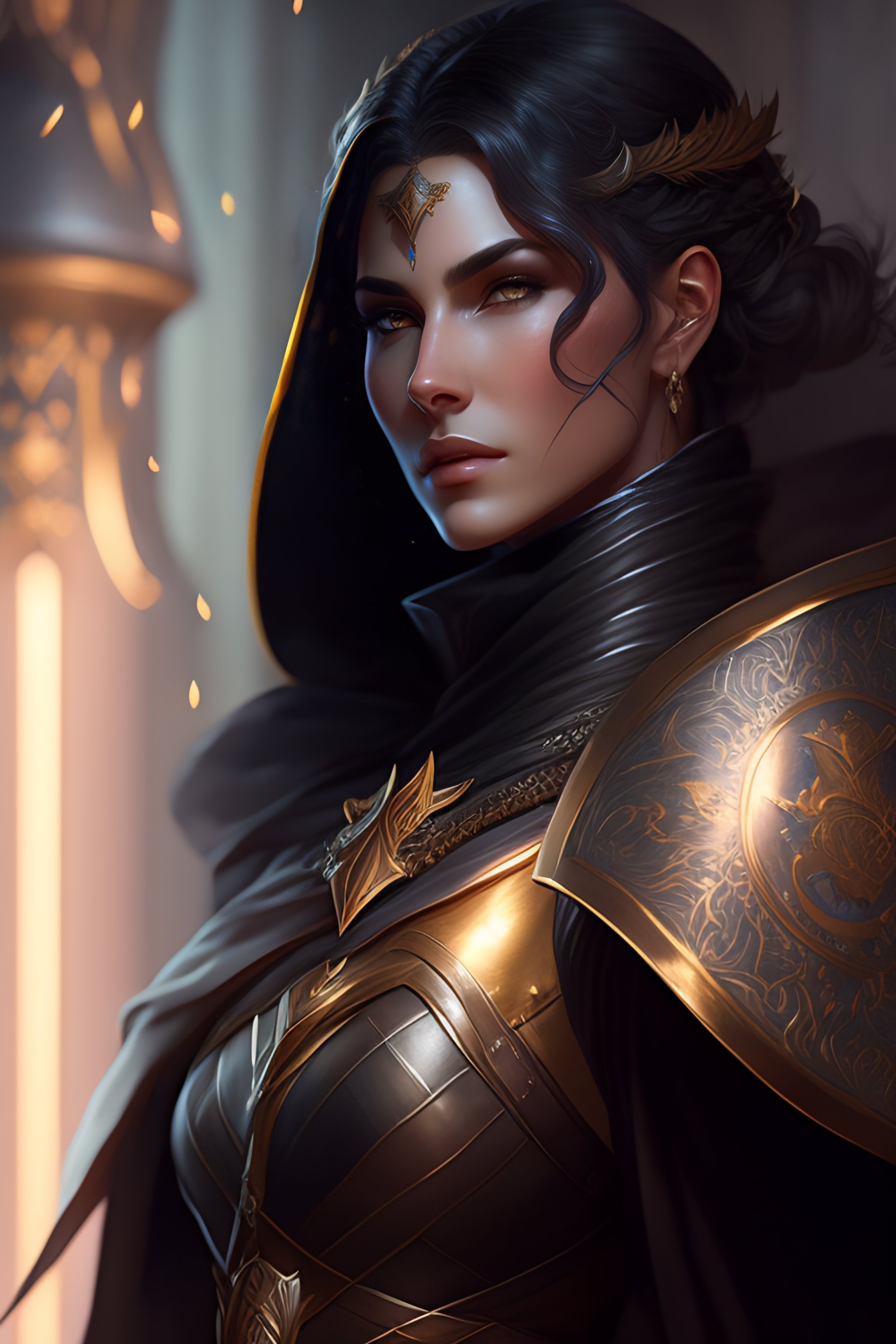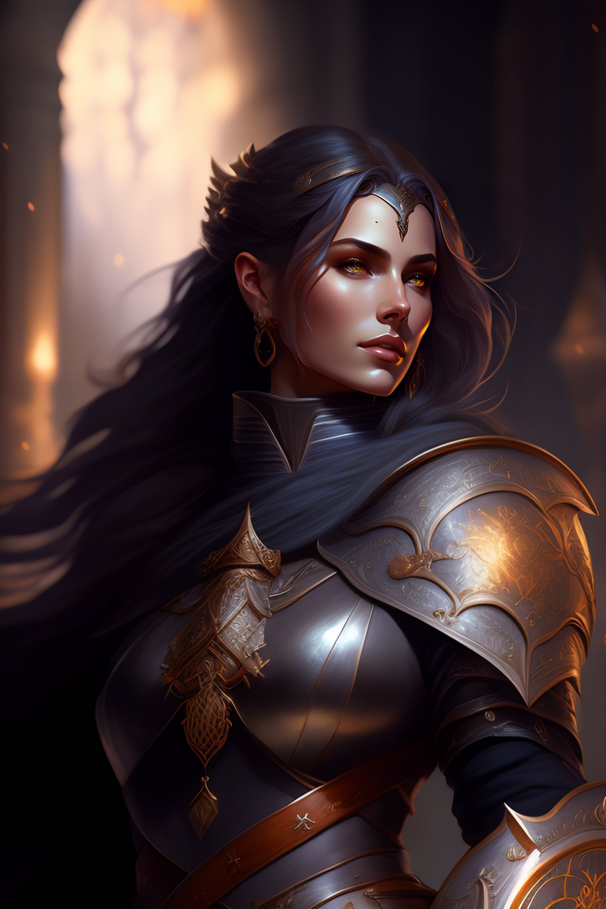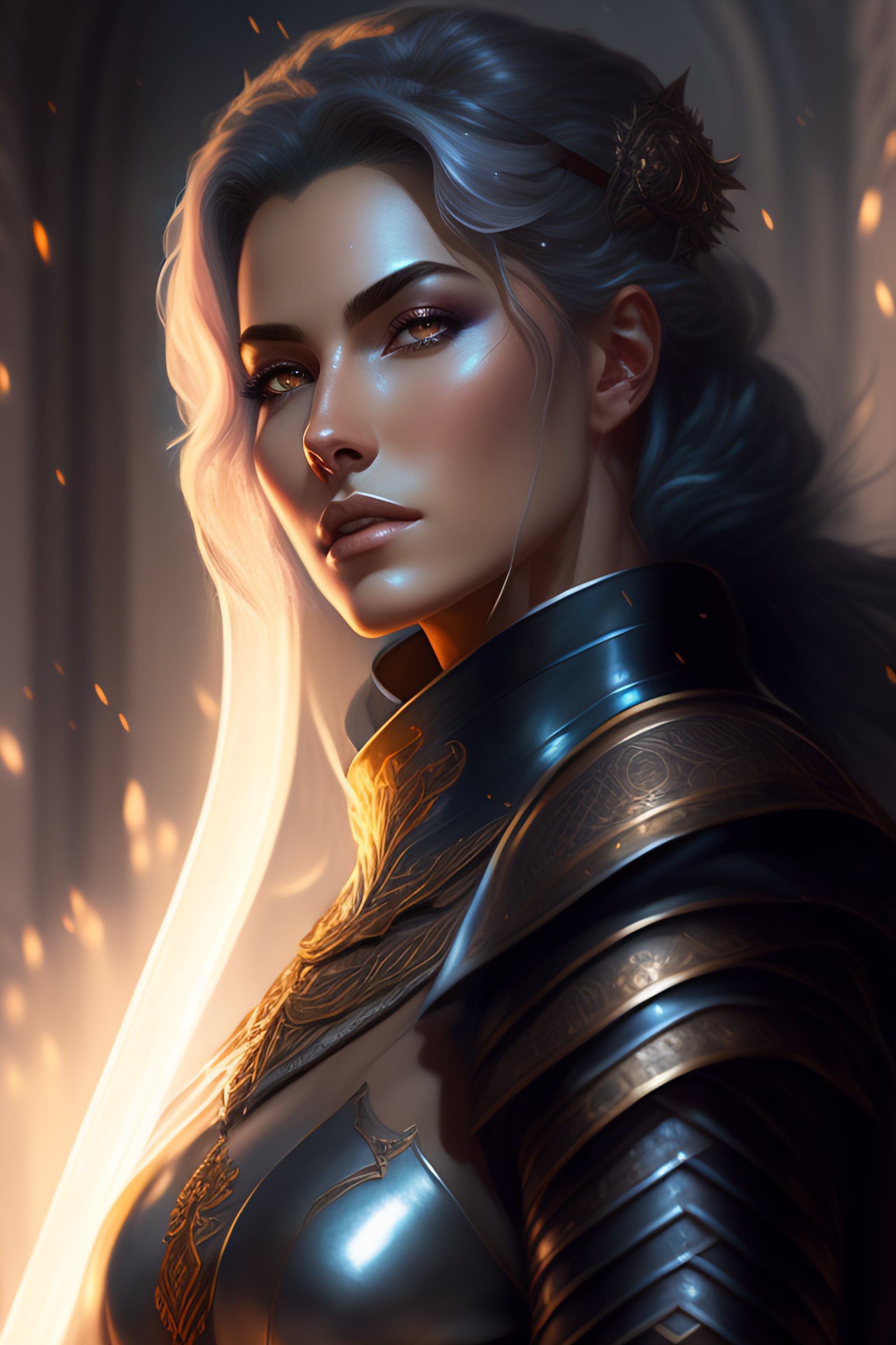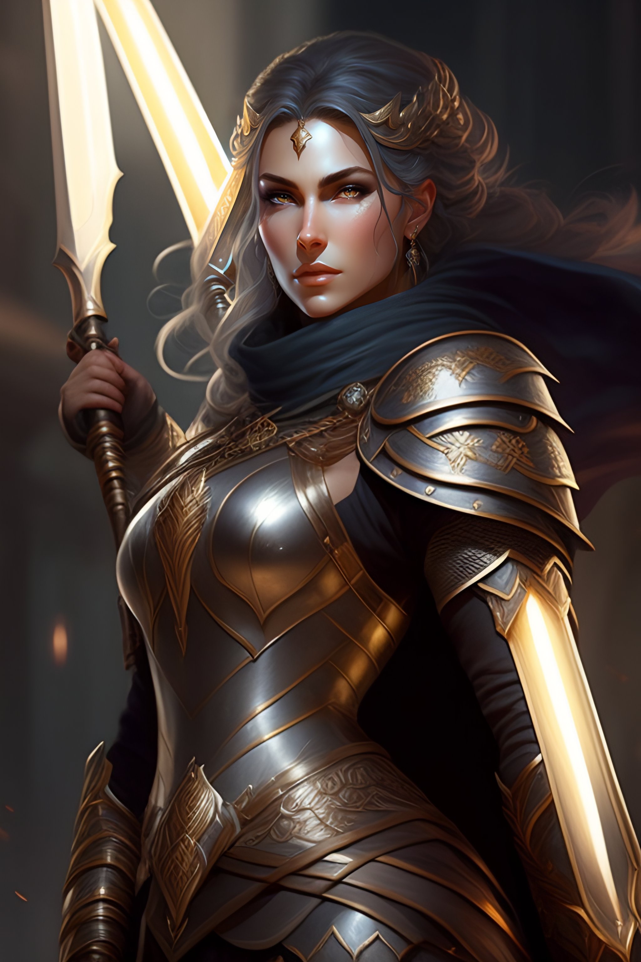Female paladin in center, dnd, fantasy, short gray hair, holding sword, dark light night, intricate, elegant, sharp focus, illustration, highly detailed, dark lighting, full body, digital painting, concept art, matte, art by wlop and artgerm and greg rutkowski and alphonse mucha, masterpiece