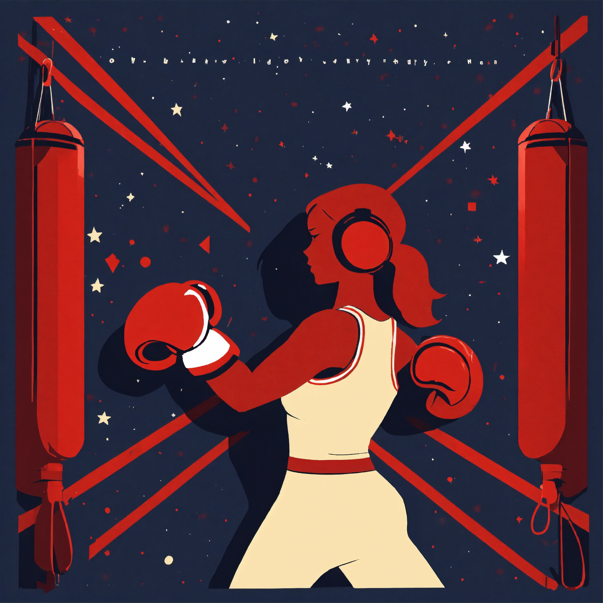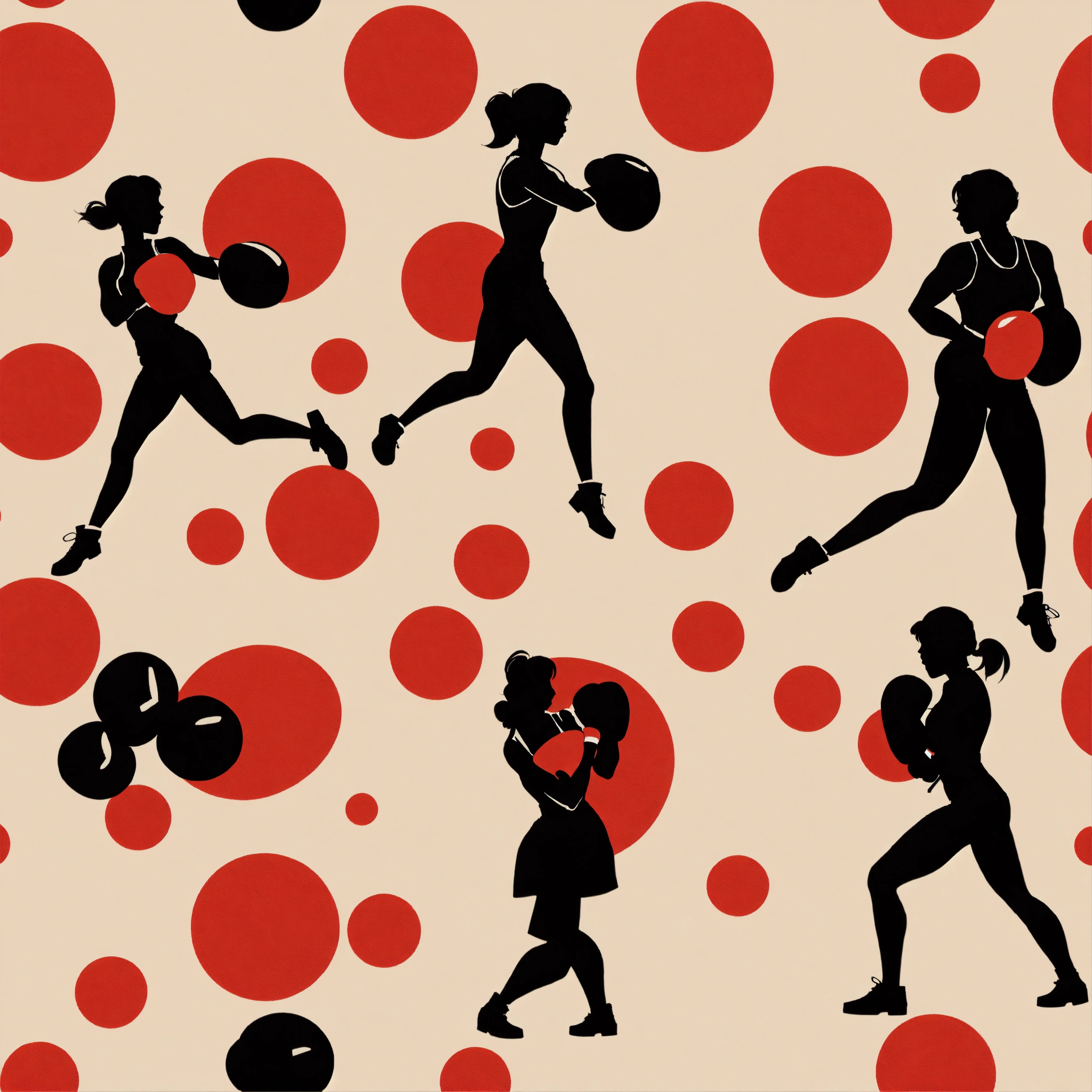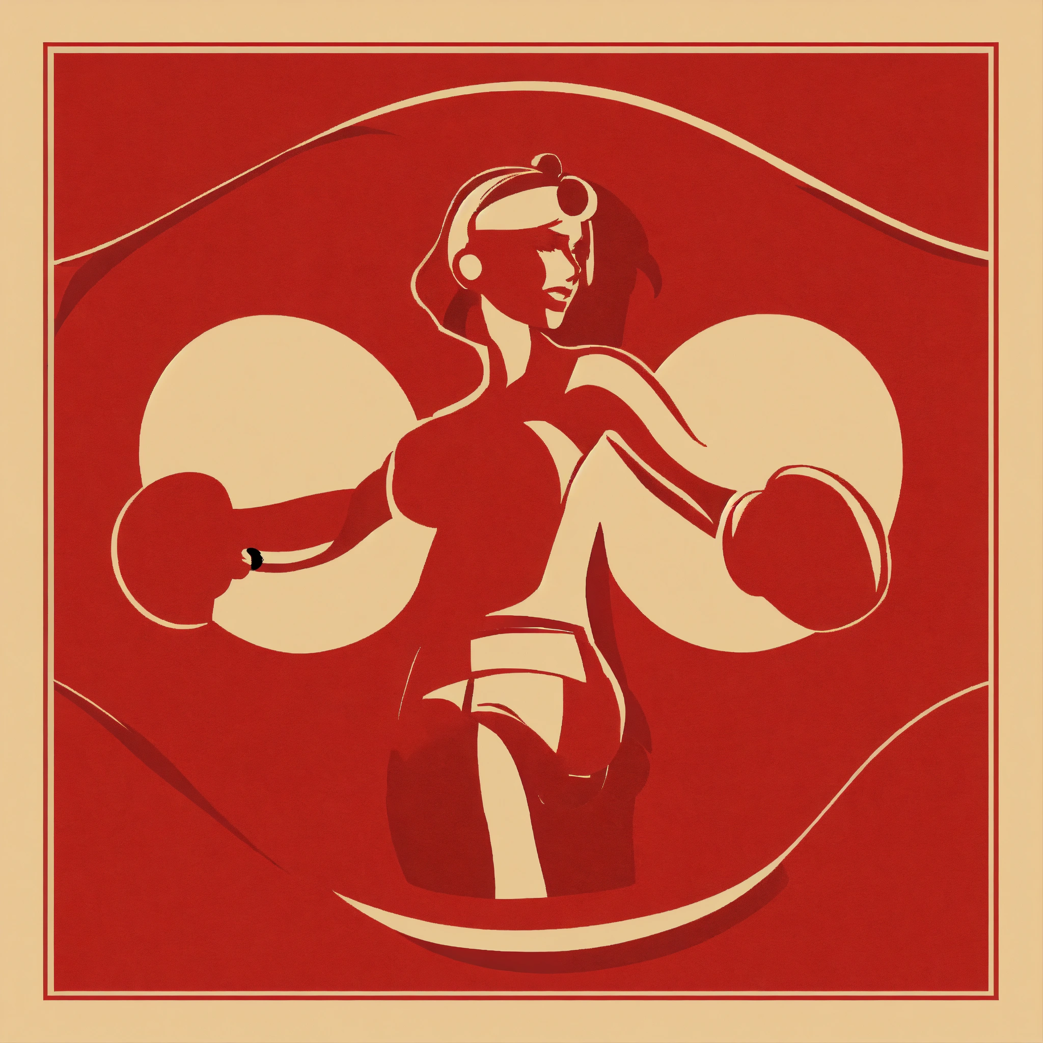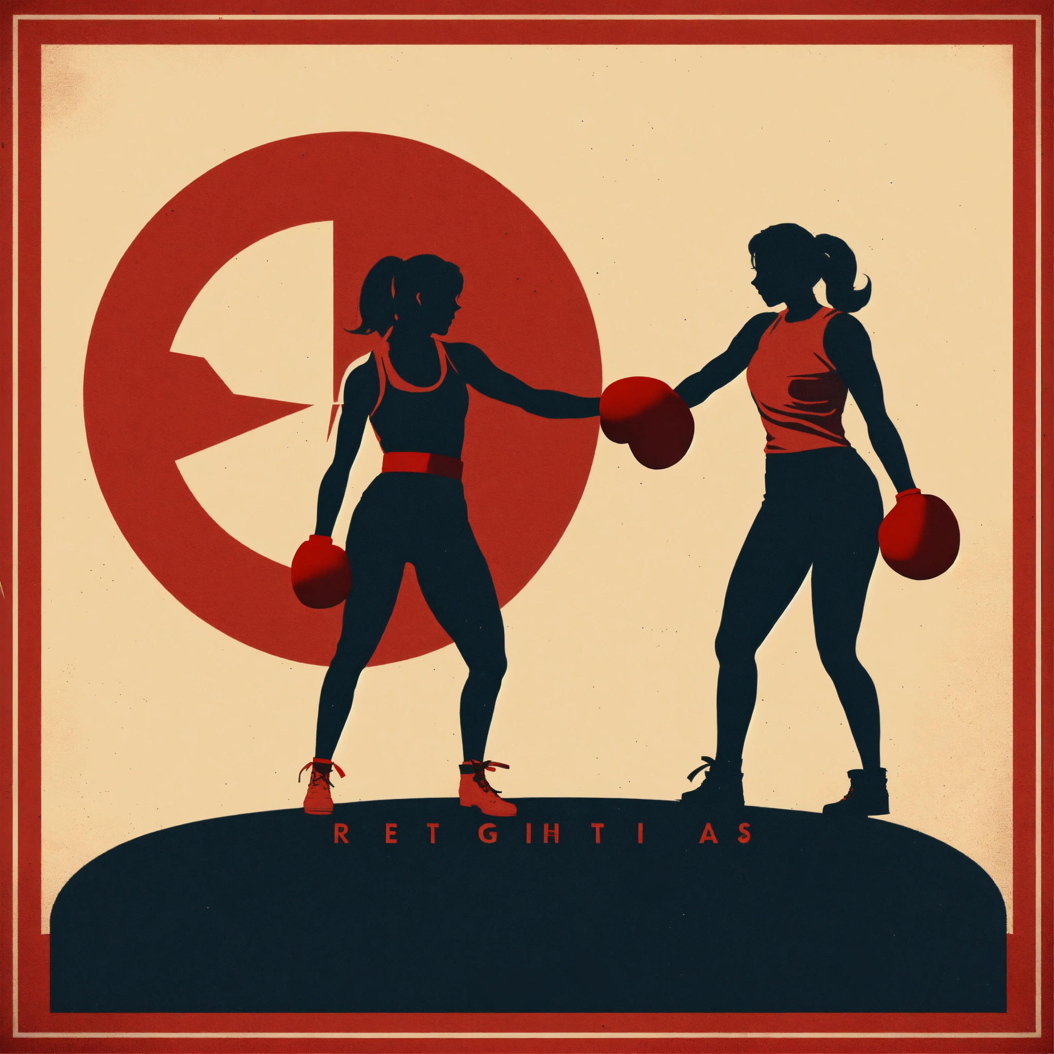 A minimalist symbol for a show about women boxing, called "mighty atoms". set in modern days, with 50s references. silhouettes of women boxing and big red boxing gloves