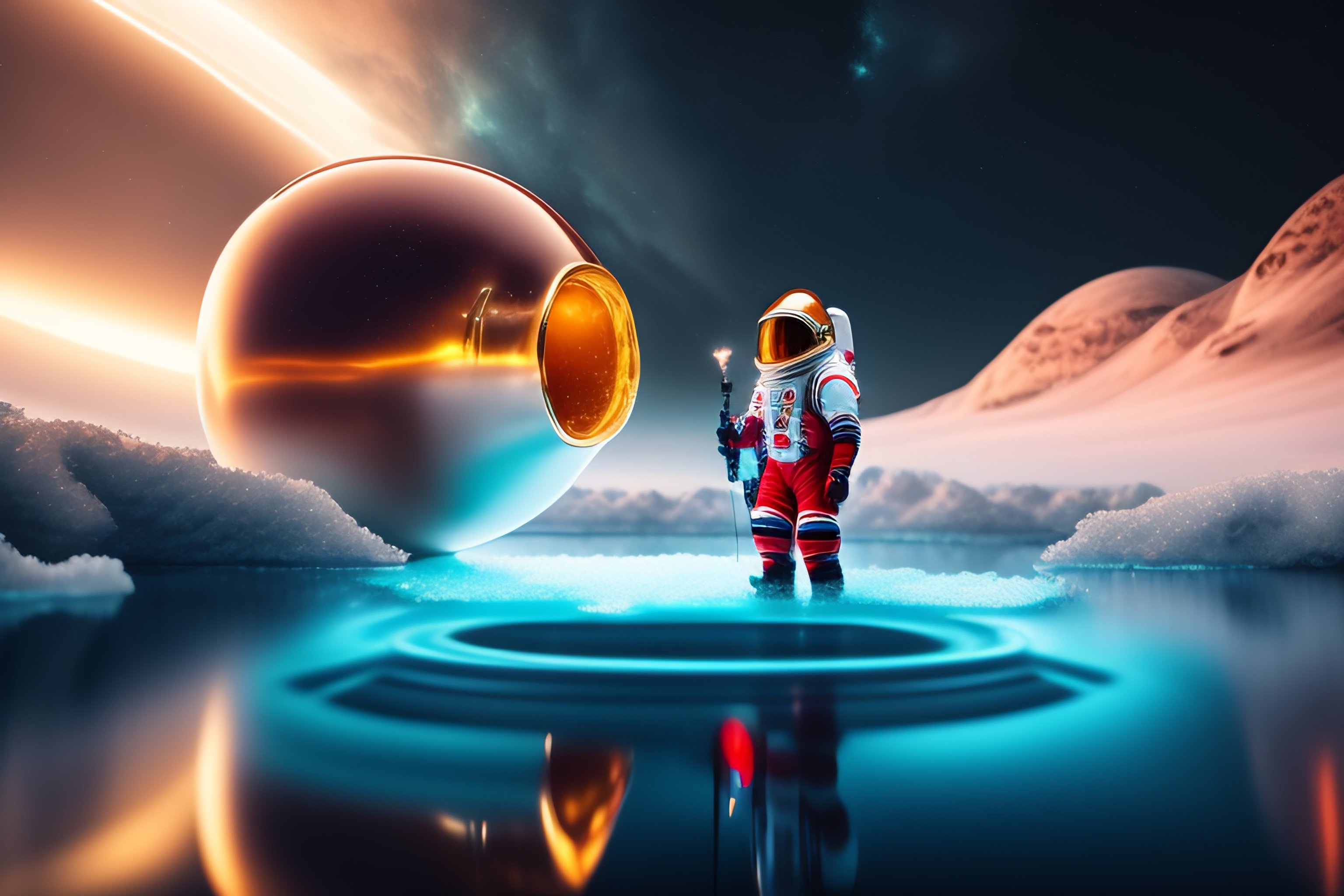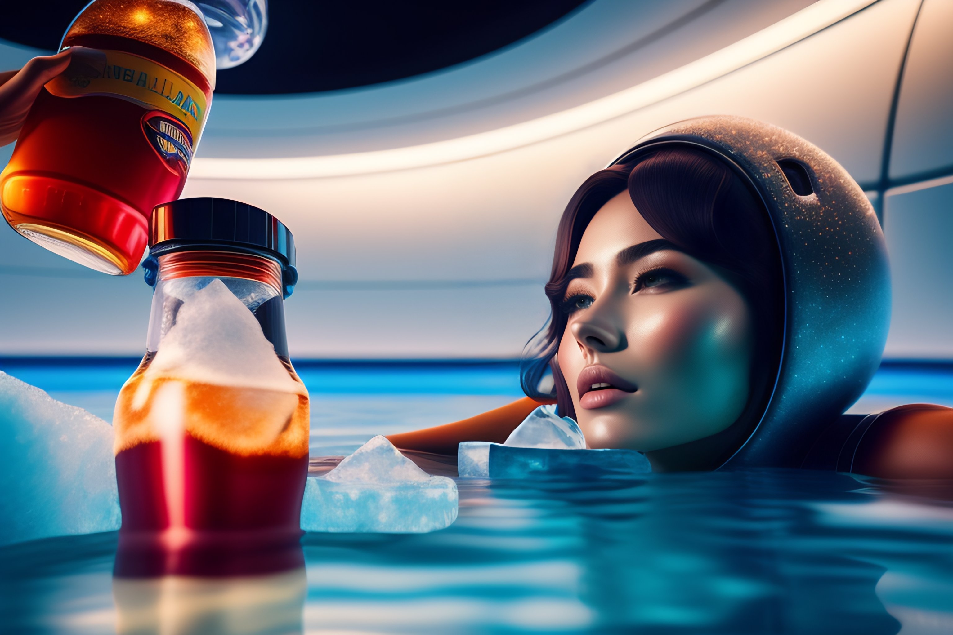 A beautiful girl in an astronaut costume and and an alien drinking coca-cola swims in the ice pool, 8k, ultra realistic, details anatomy, cinematic lighting, photographic