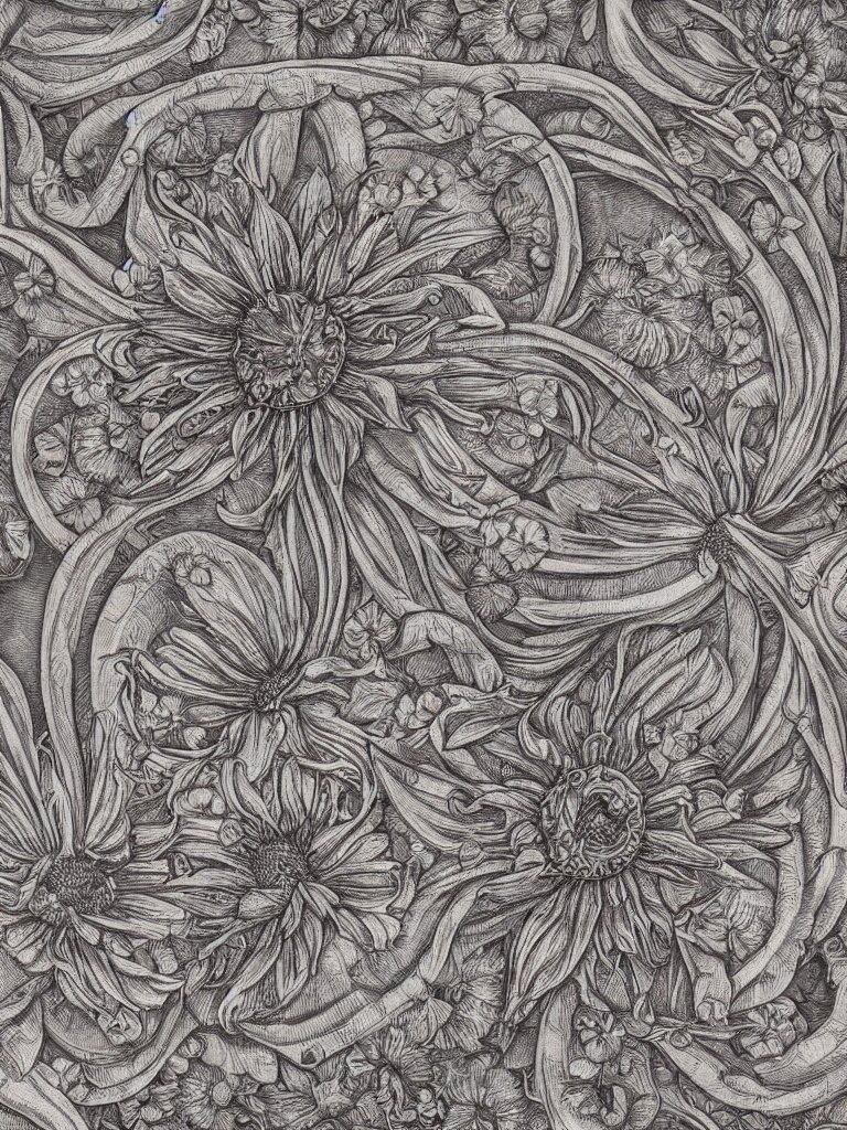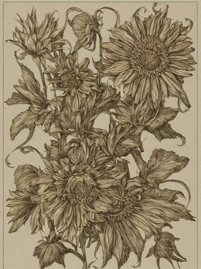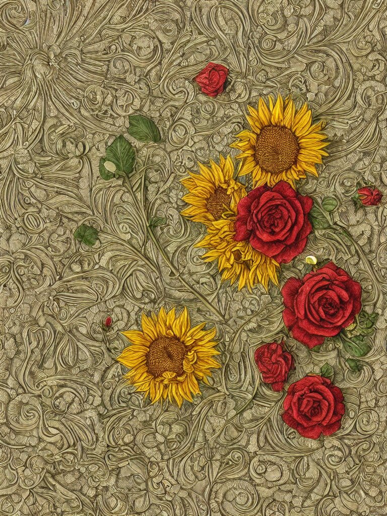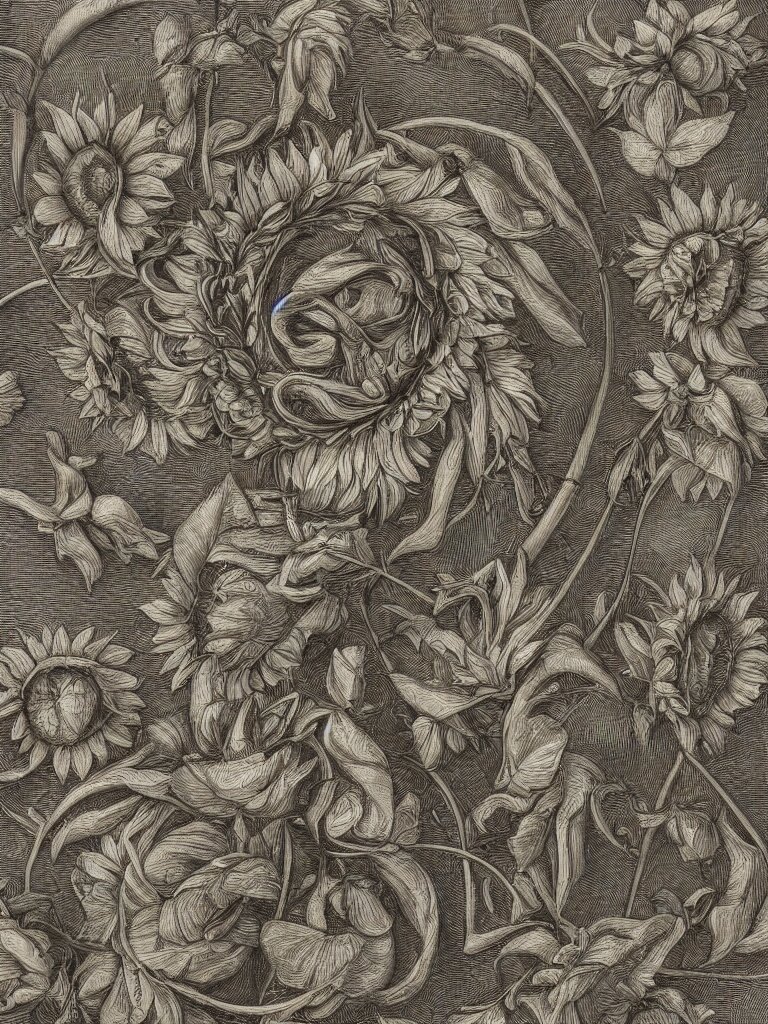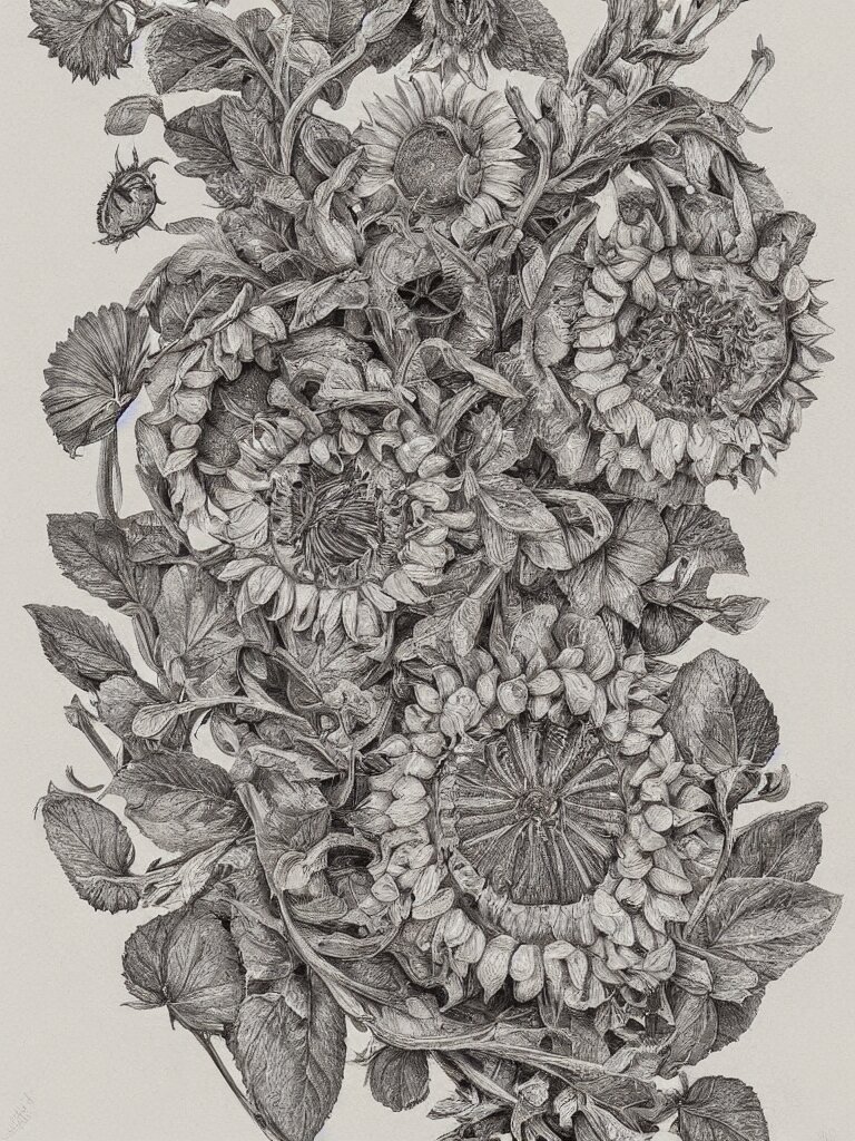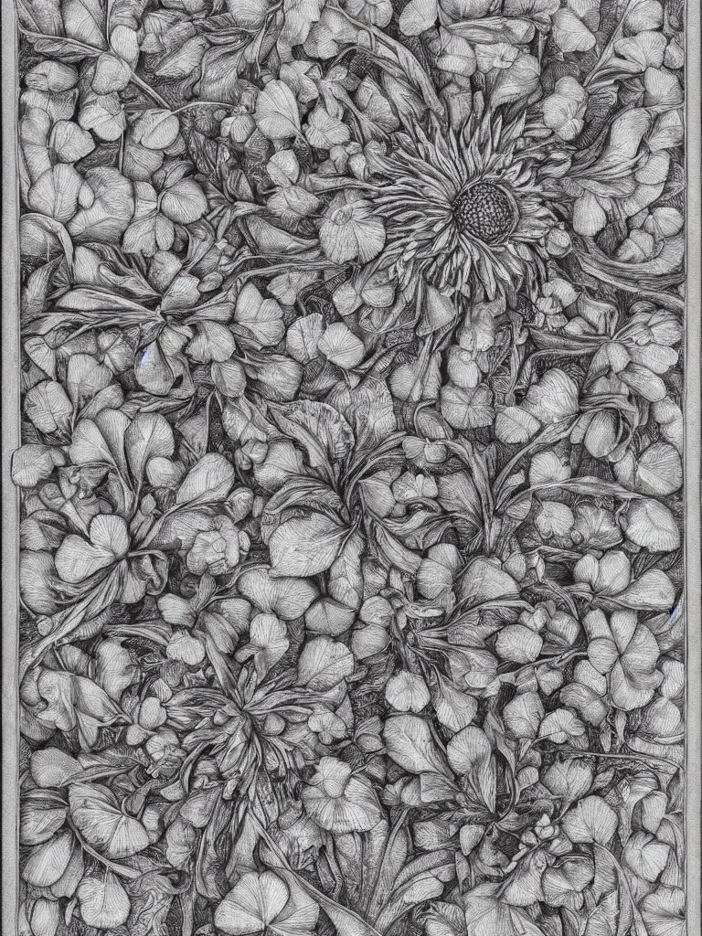 Beautiful decorative classical ornament fibonacci rhythms, sunflowers, strawberries, four leaf clover, rose petals, leaves, stems, highly detailed etching, rendered in octane