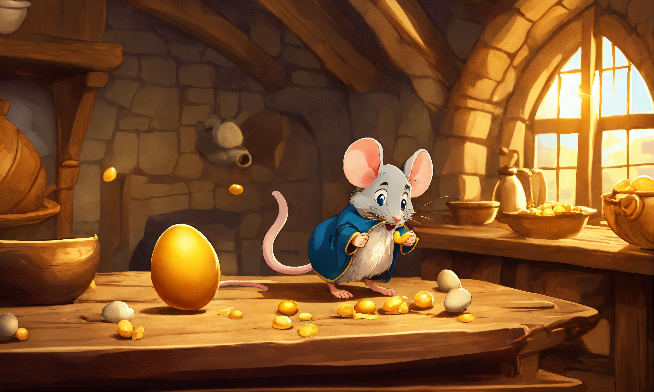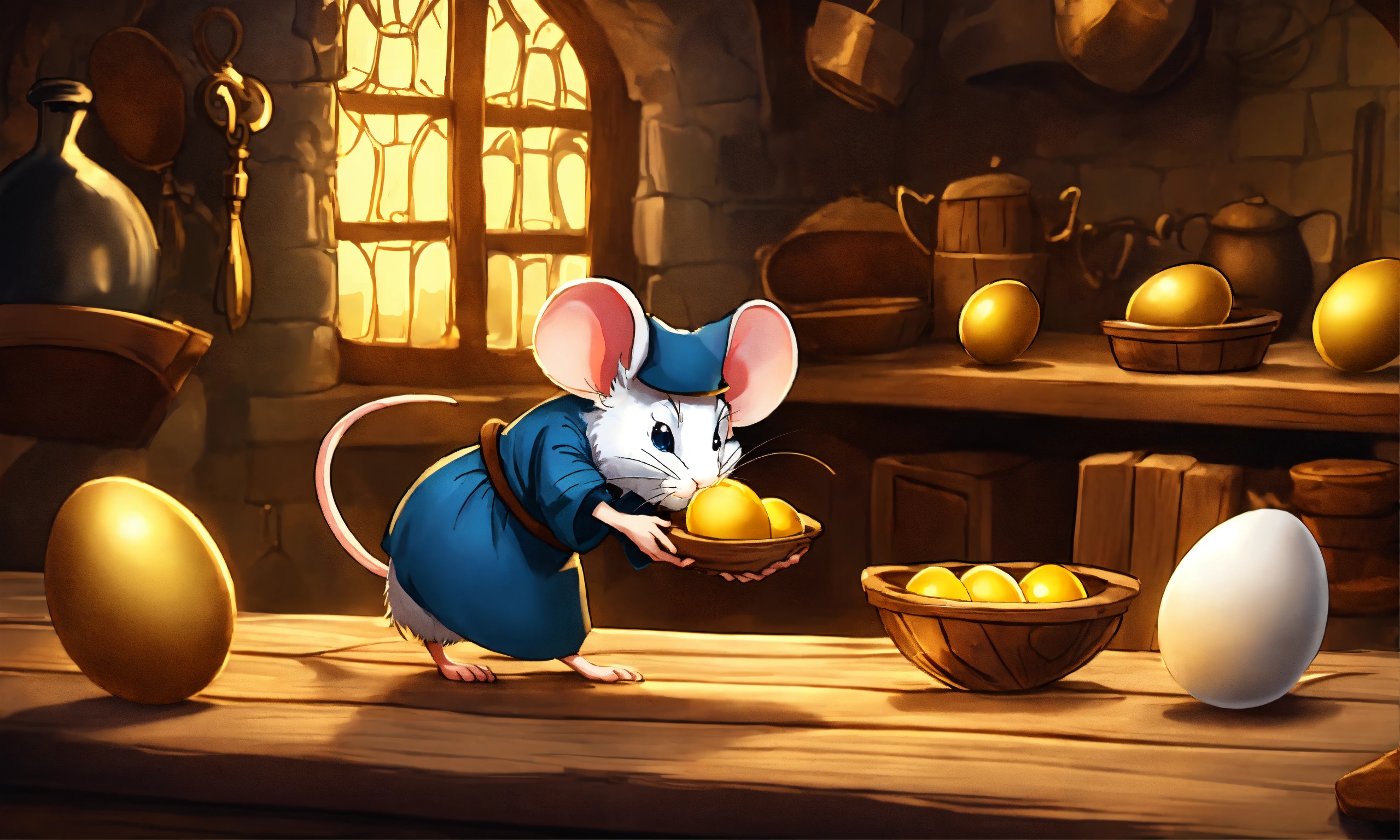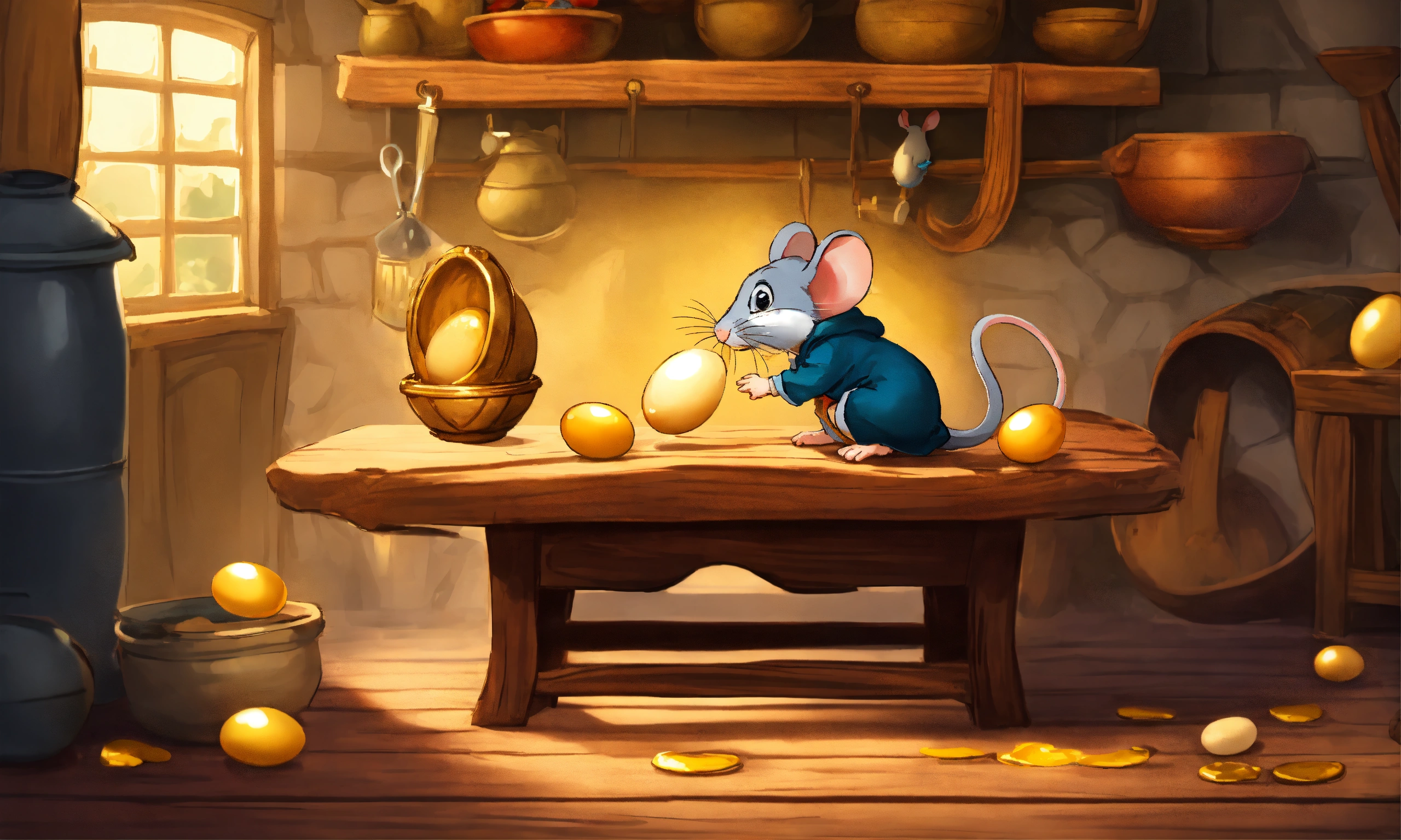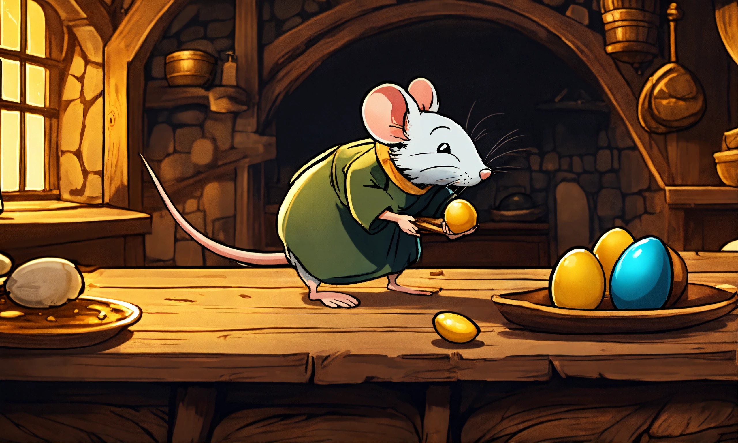 Cartoon style a mouse pushes with its tail one golden egg from a wooden table in a medieval kitchen