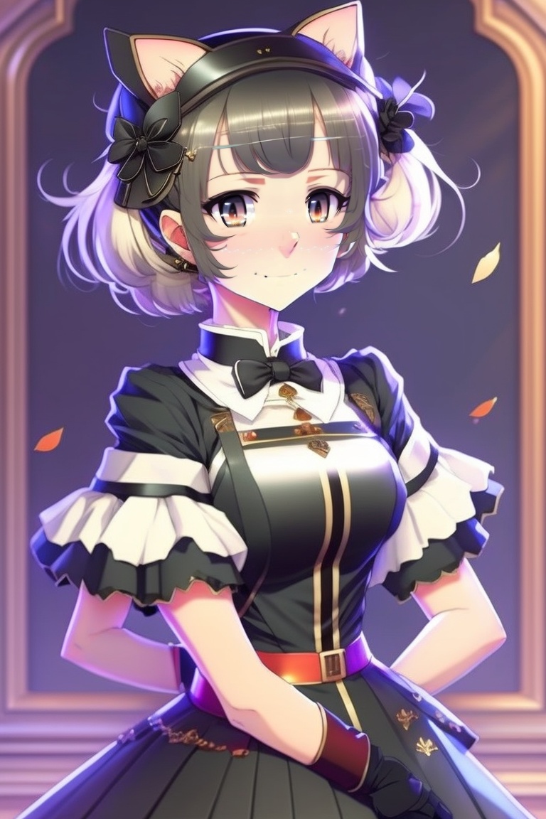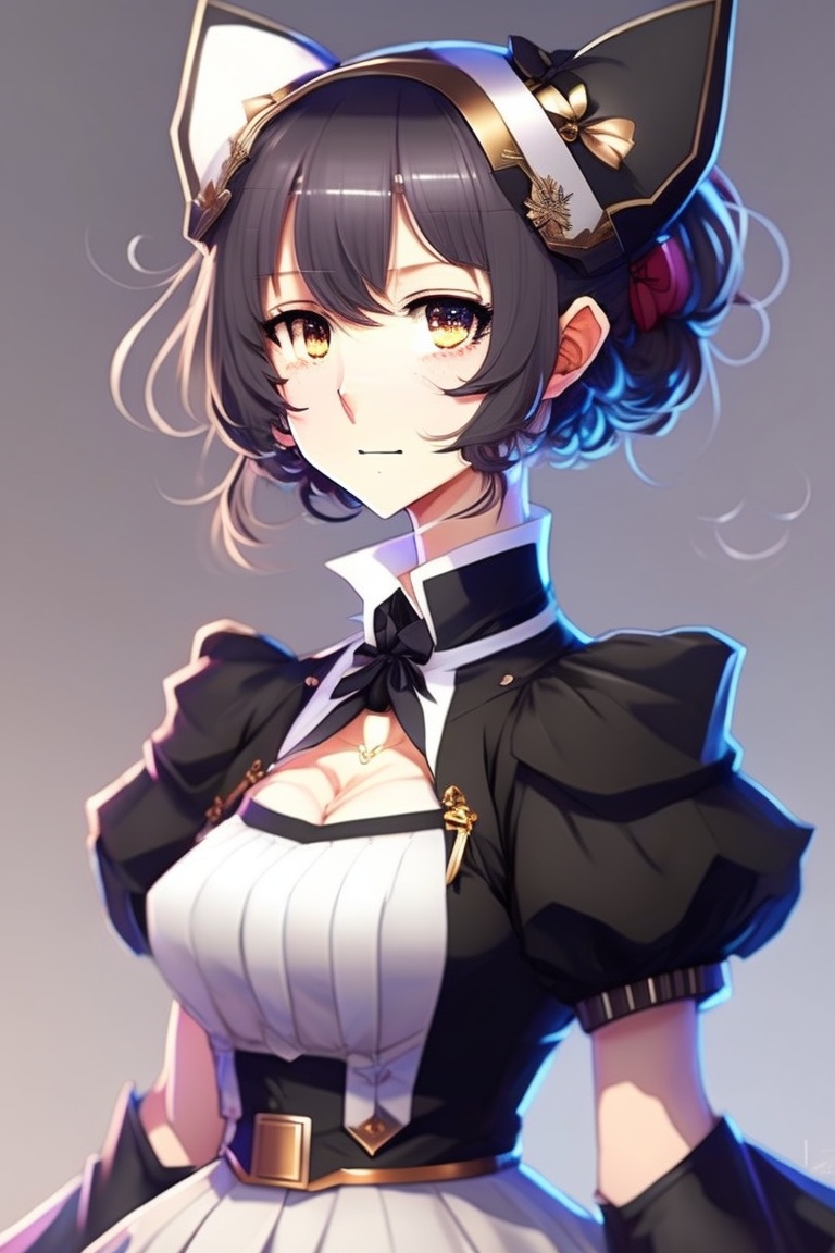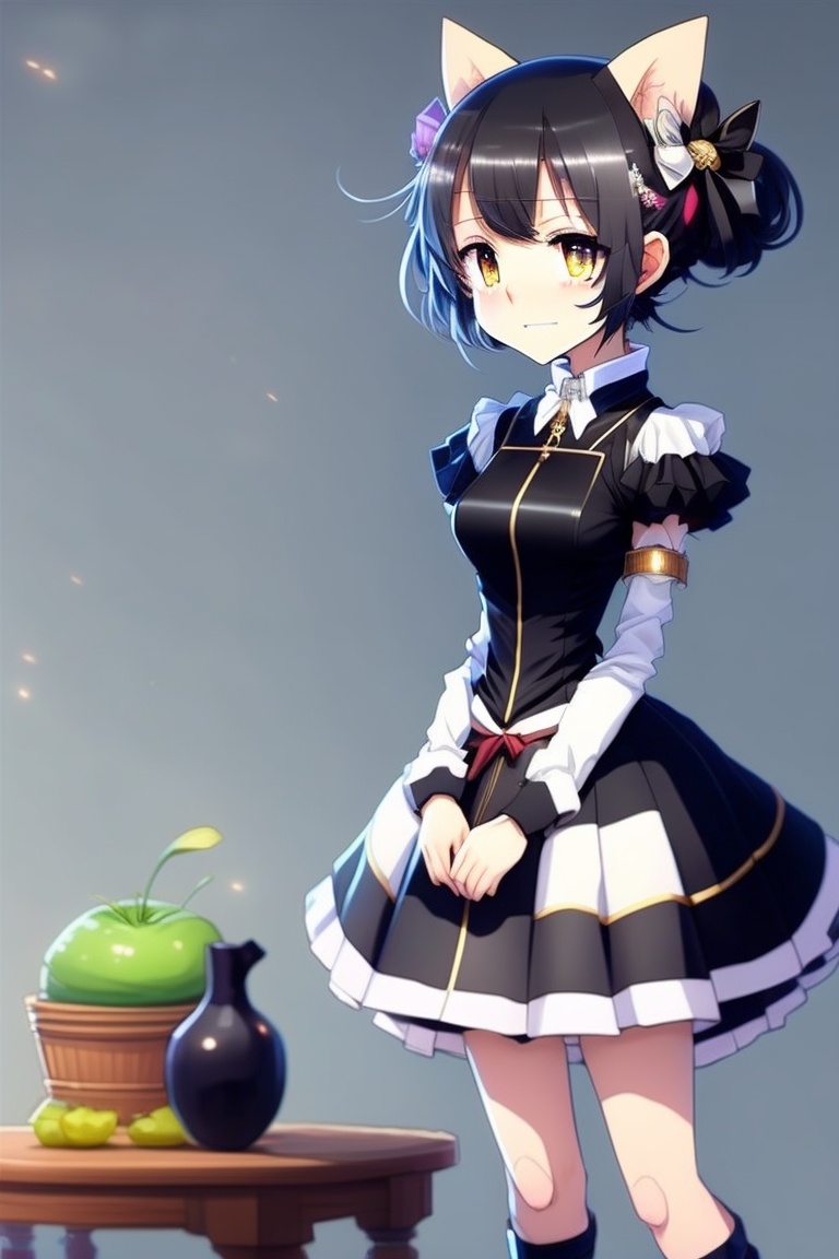 Anime girl, 2d, short black hair, bob cut, black dress, with cat ears, in a maid costume, with a sweet smile