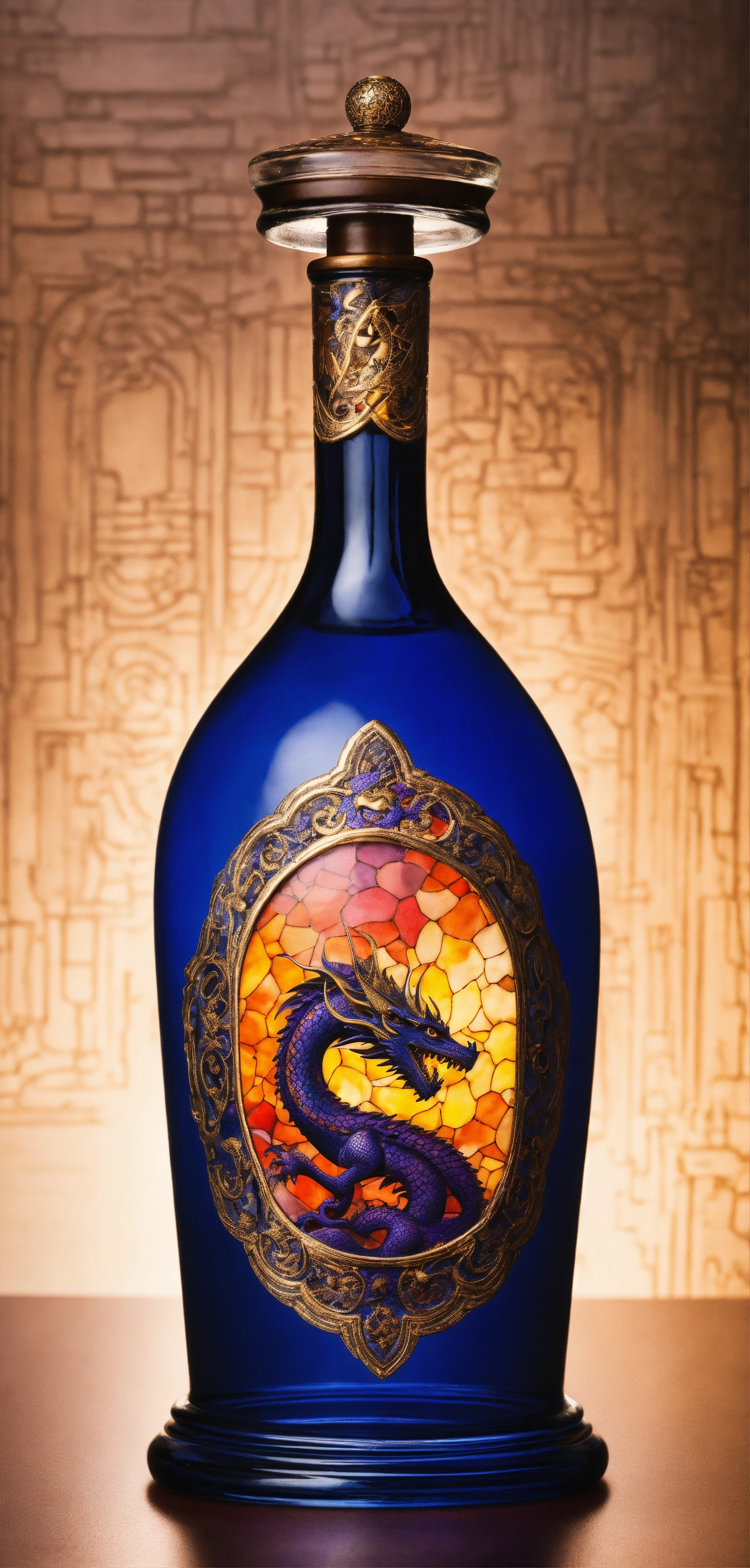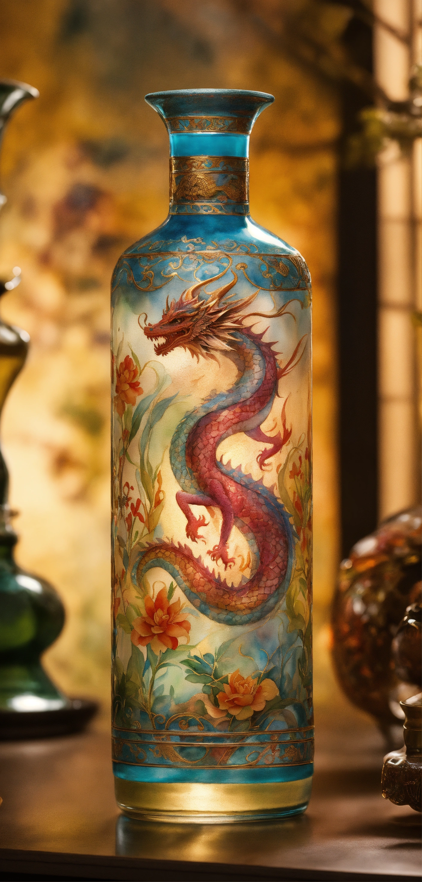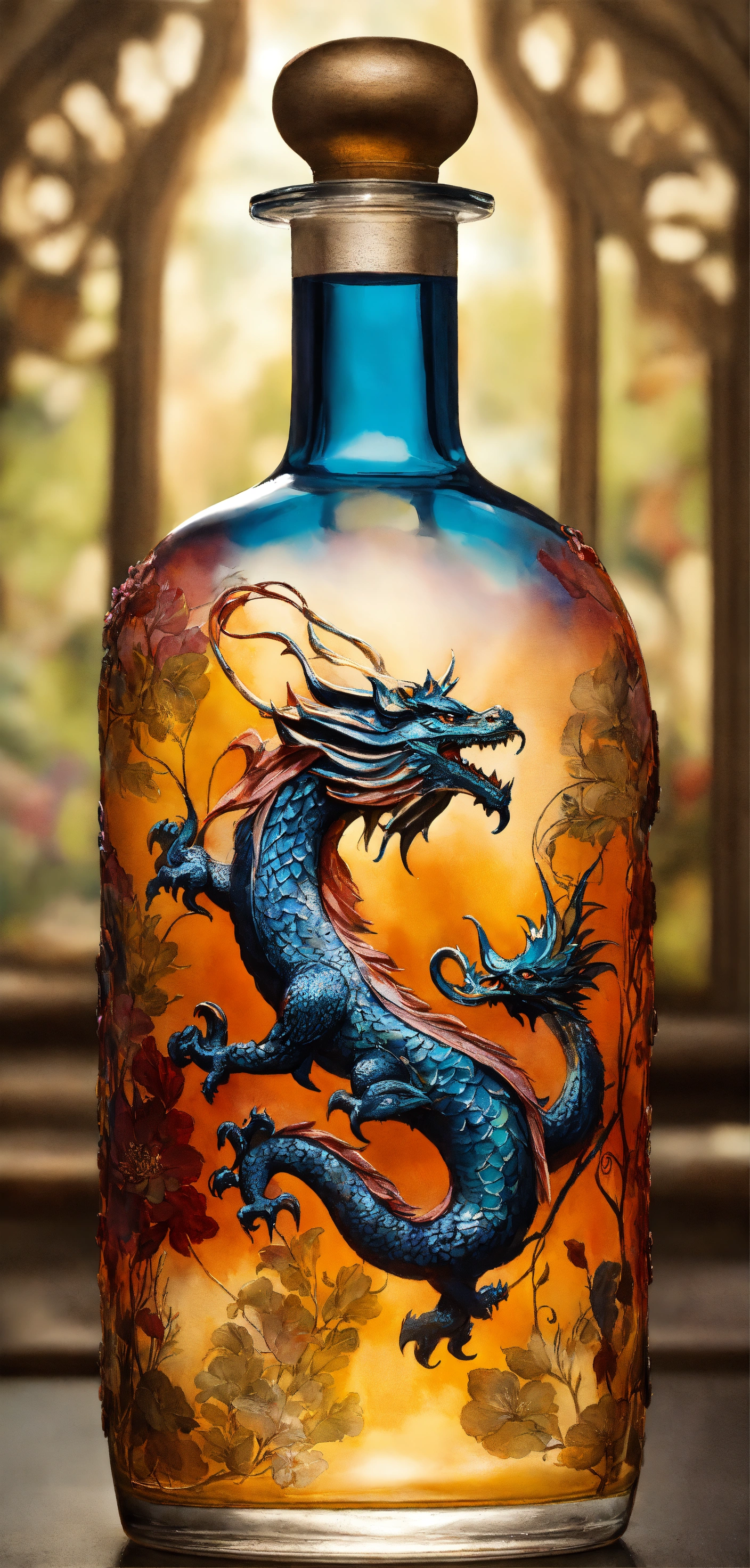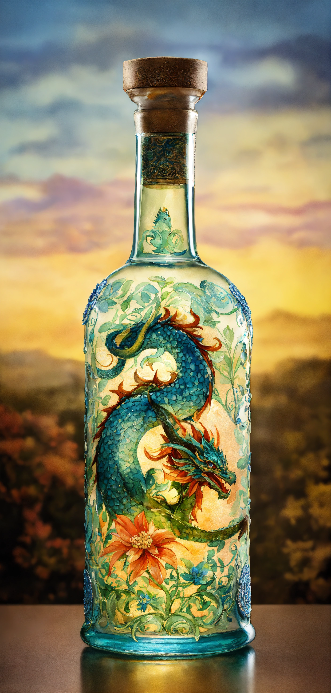 A mesmerizing glass bottle adorned with a delicate mythic theme pattern, reminiscent of ancient times and world folklore. the intricate details of the design are brought to life through a watercolor rendering, adding a touch of whimsy to the piece. the sharp focus of the studio photo captures every nuance of the bottle, making it a true work of art. and to top it off a elegant cap with a dragon figure