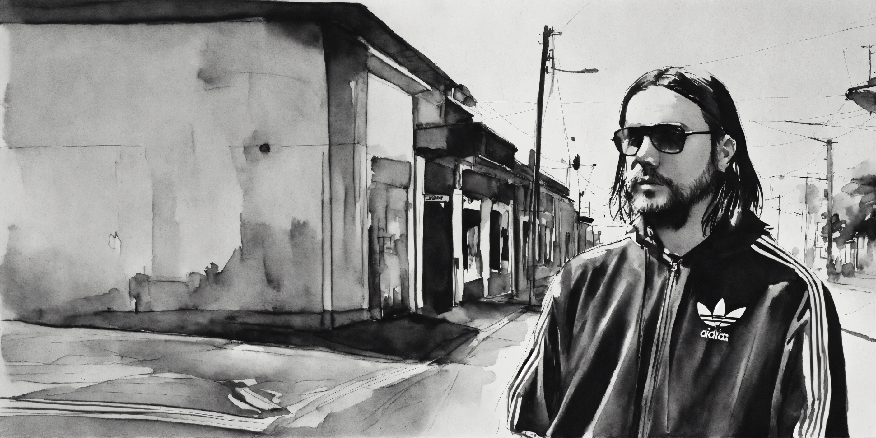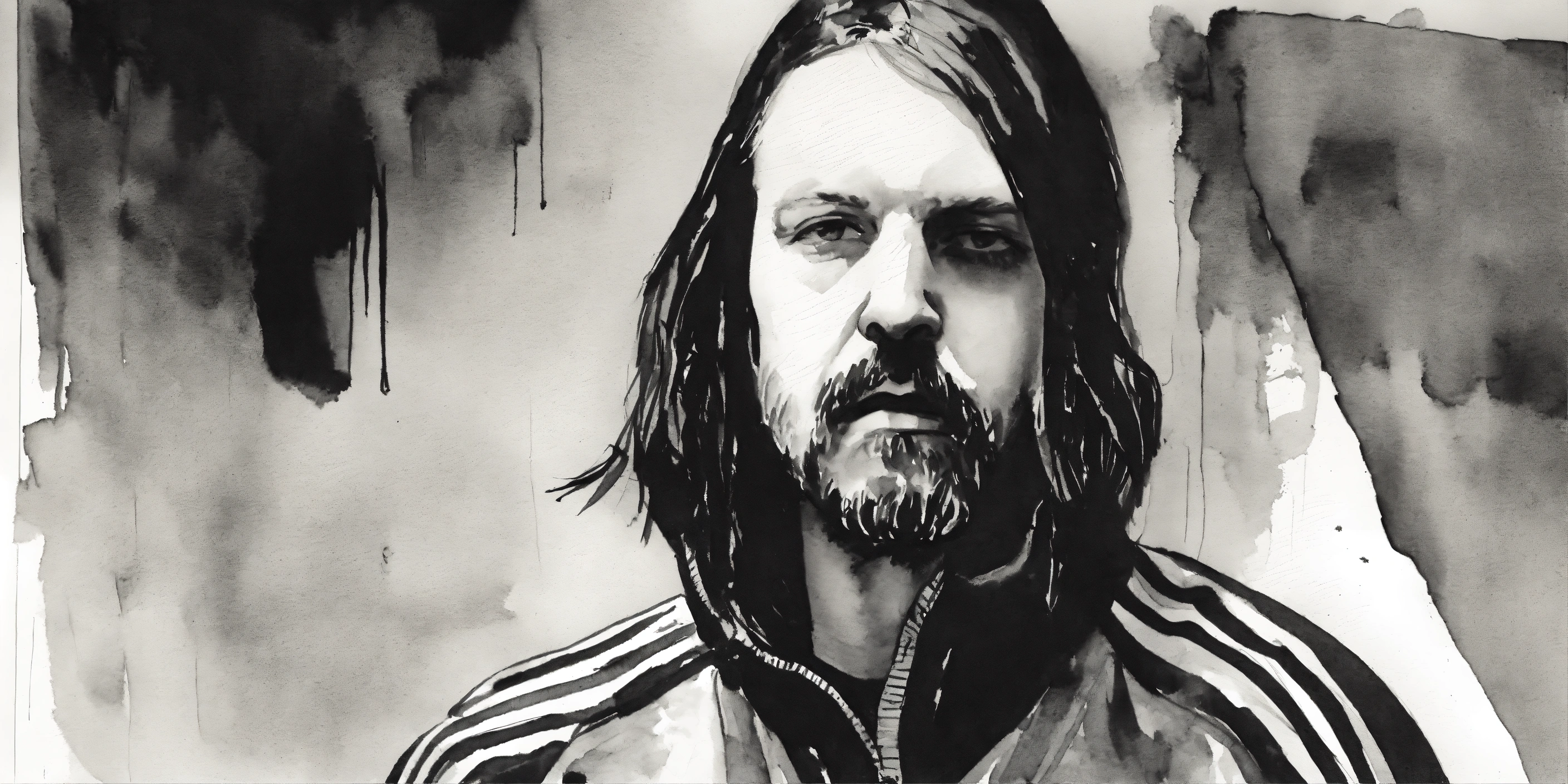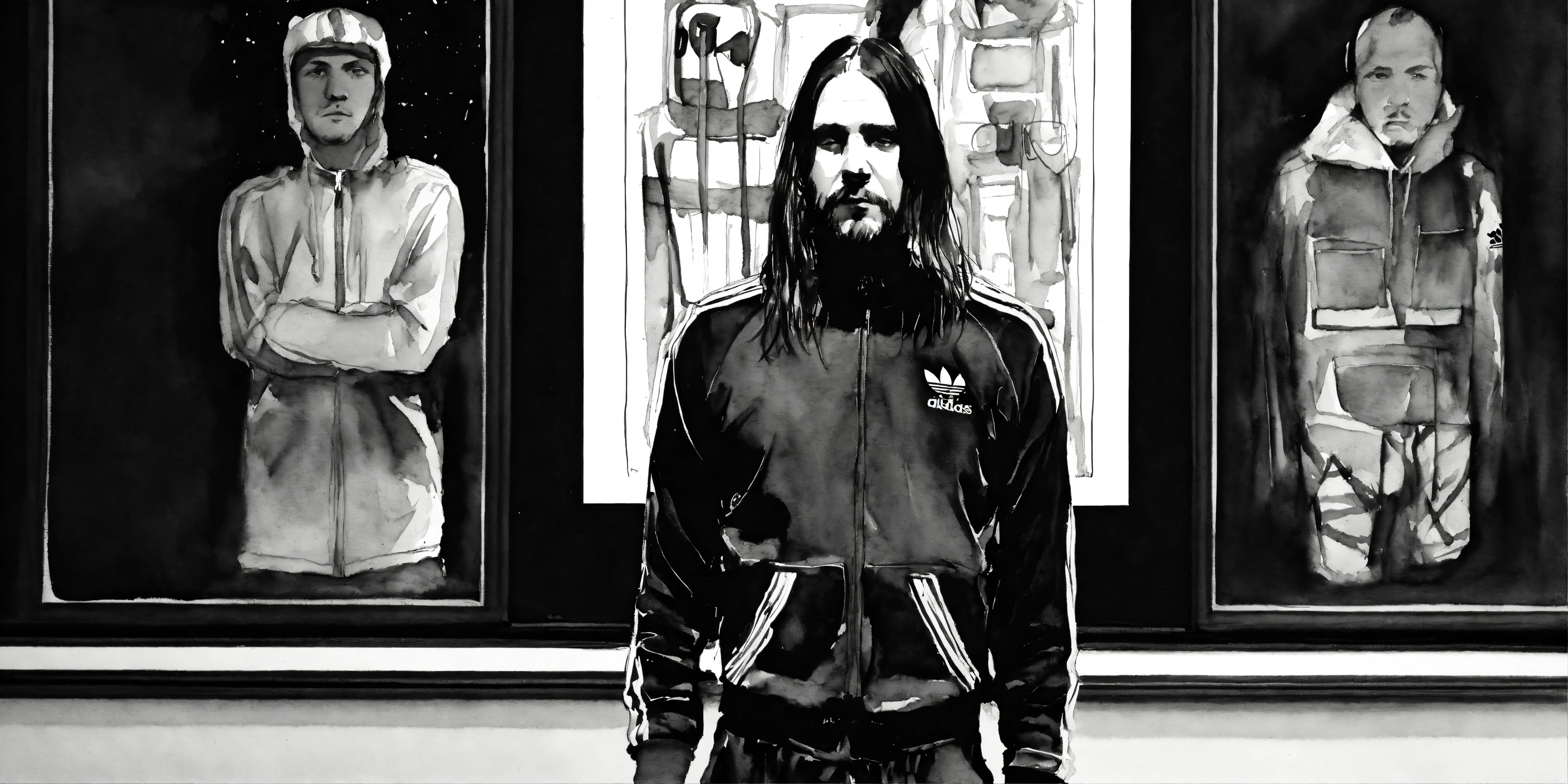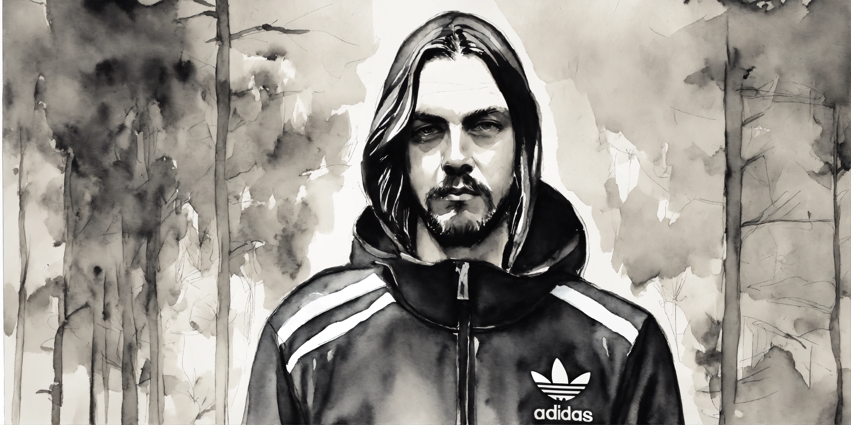 A minimalistic primitive pencil and watercolor drawing in black and white of jonathan meese in an adidas tracksuit