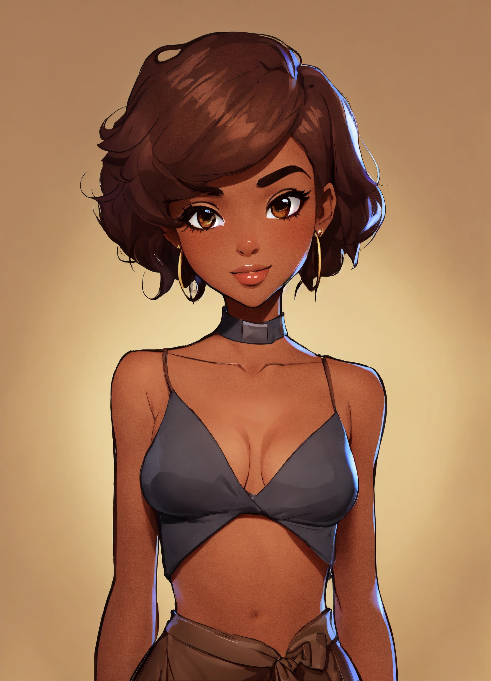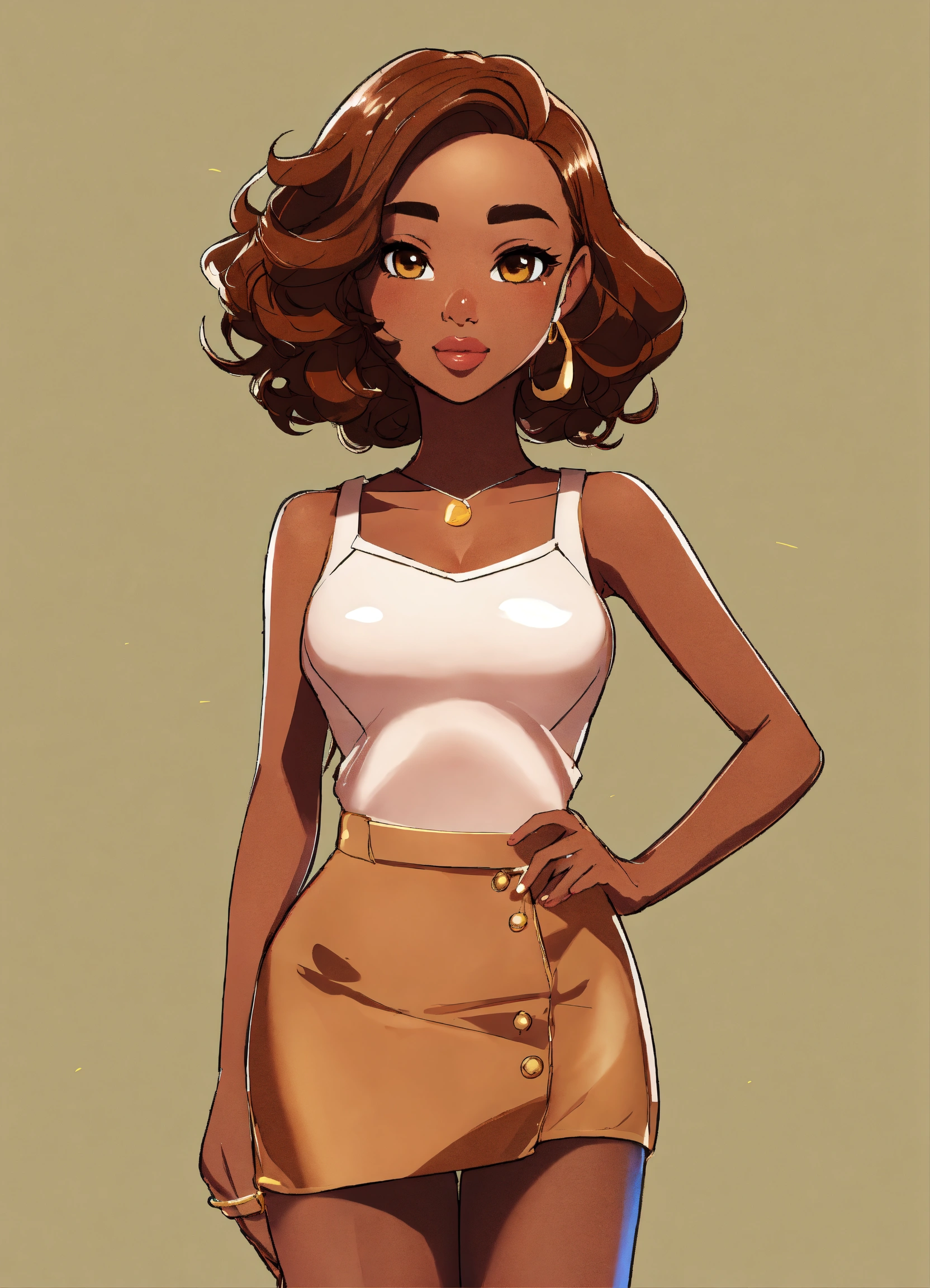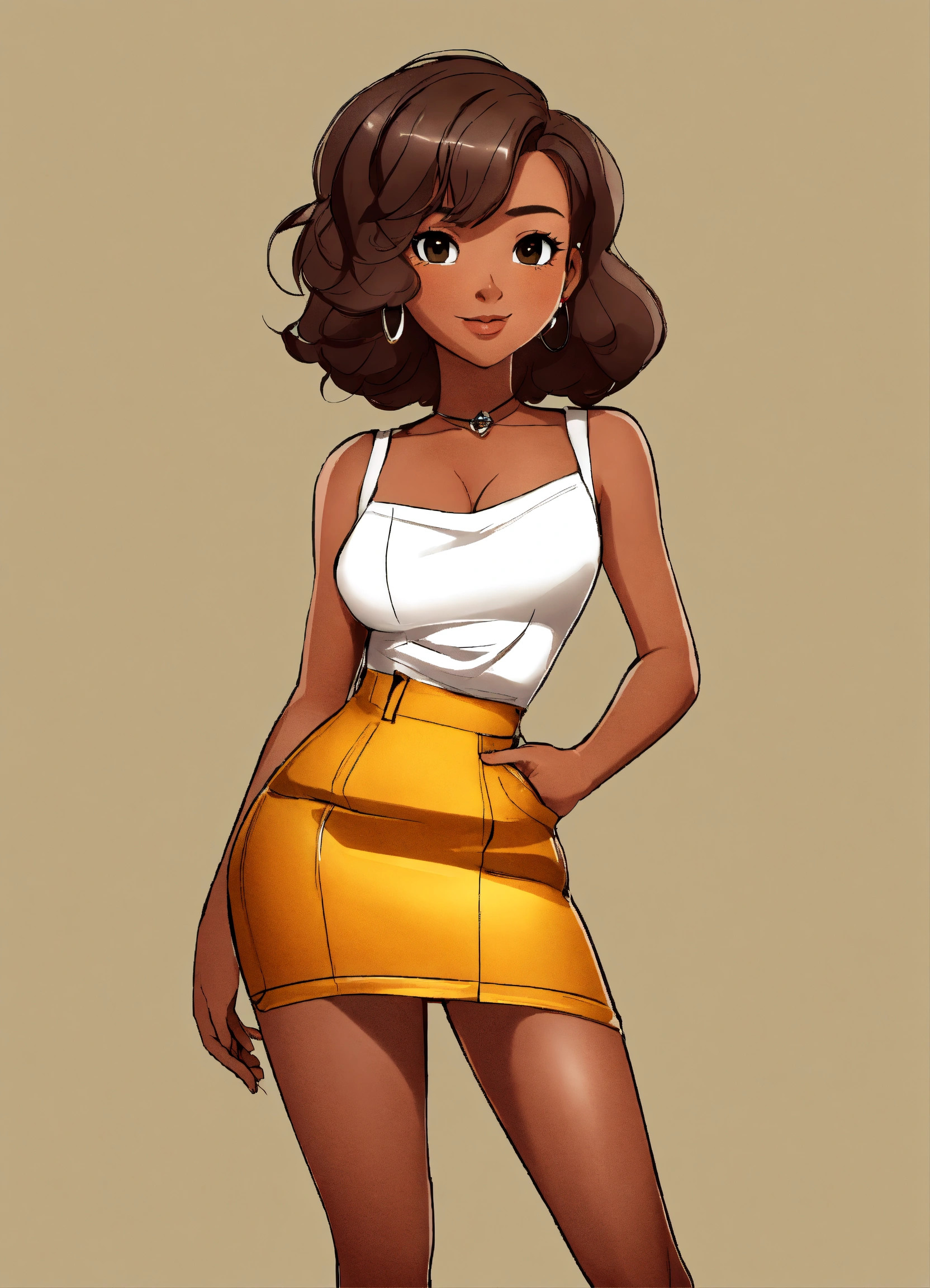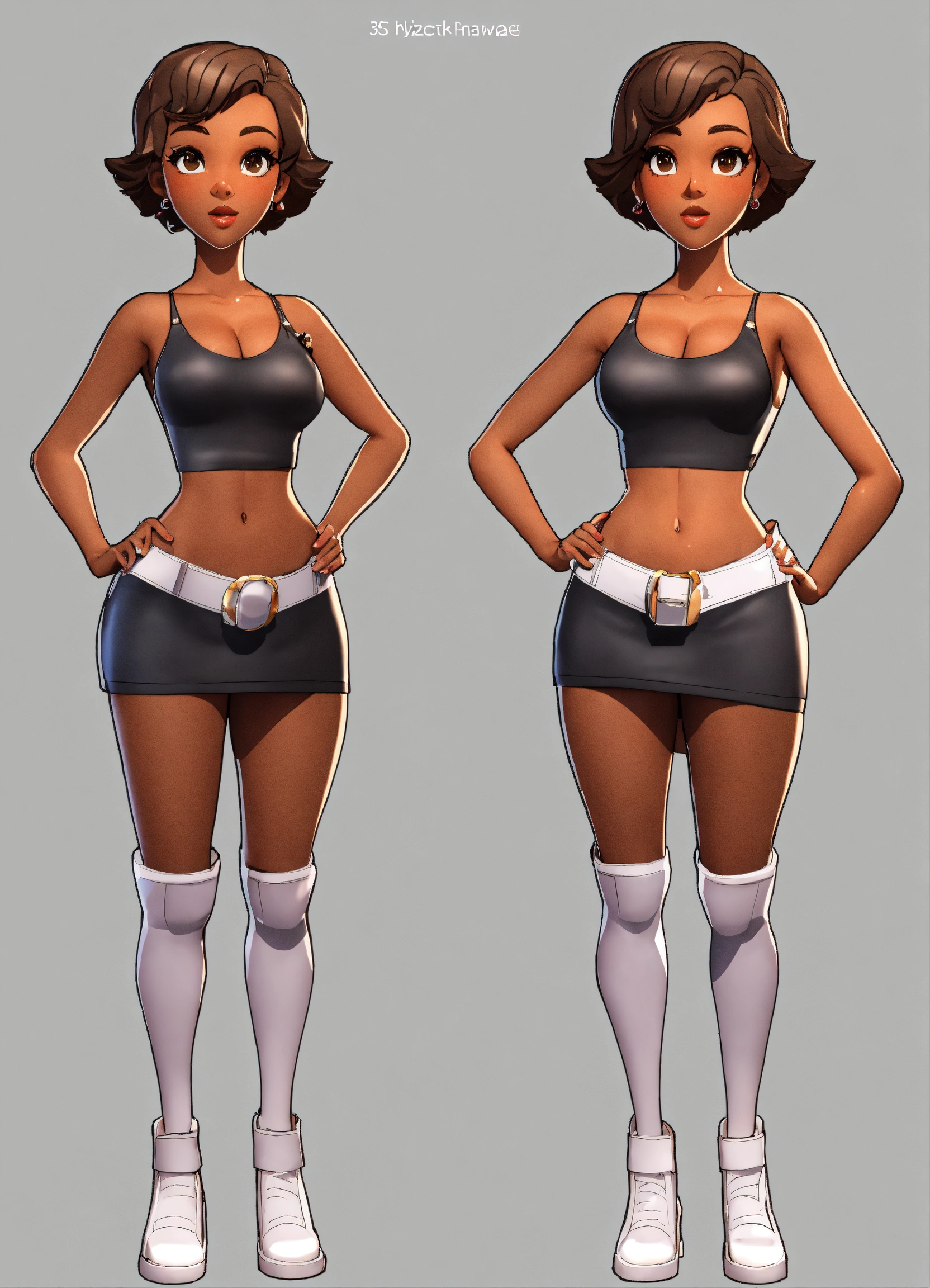 Cartoon brown skin, asymmetrical, no shadows, tan skin, gorgeous woman, white background, short hair, standing, facing front. hd, 3((((((((((((show whole body)))))), no shadows, cartoon, wearing a black mini skirt, full frame of the body 35mm wide angle shot, pin-up styles, make image into 3d, coloring book, vector, normal chest, [[[[[[[make a turnaround sheet of image]]]]]]!, ((((((((((((show whole body)))))), no shadows, cartoon cartoon brown skin, asymmetrical, no shadows, brown skin