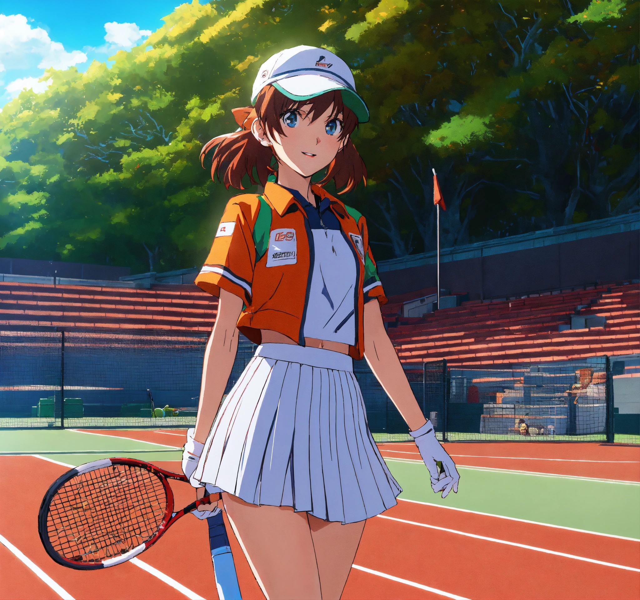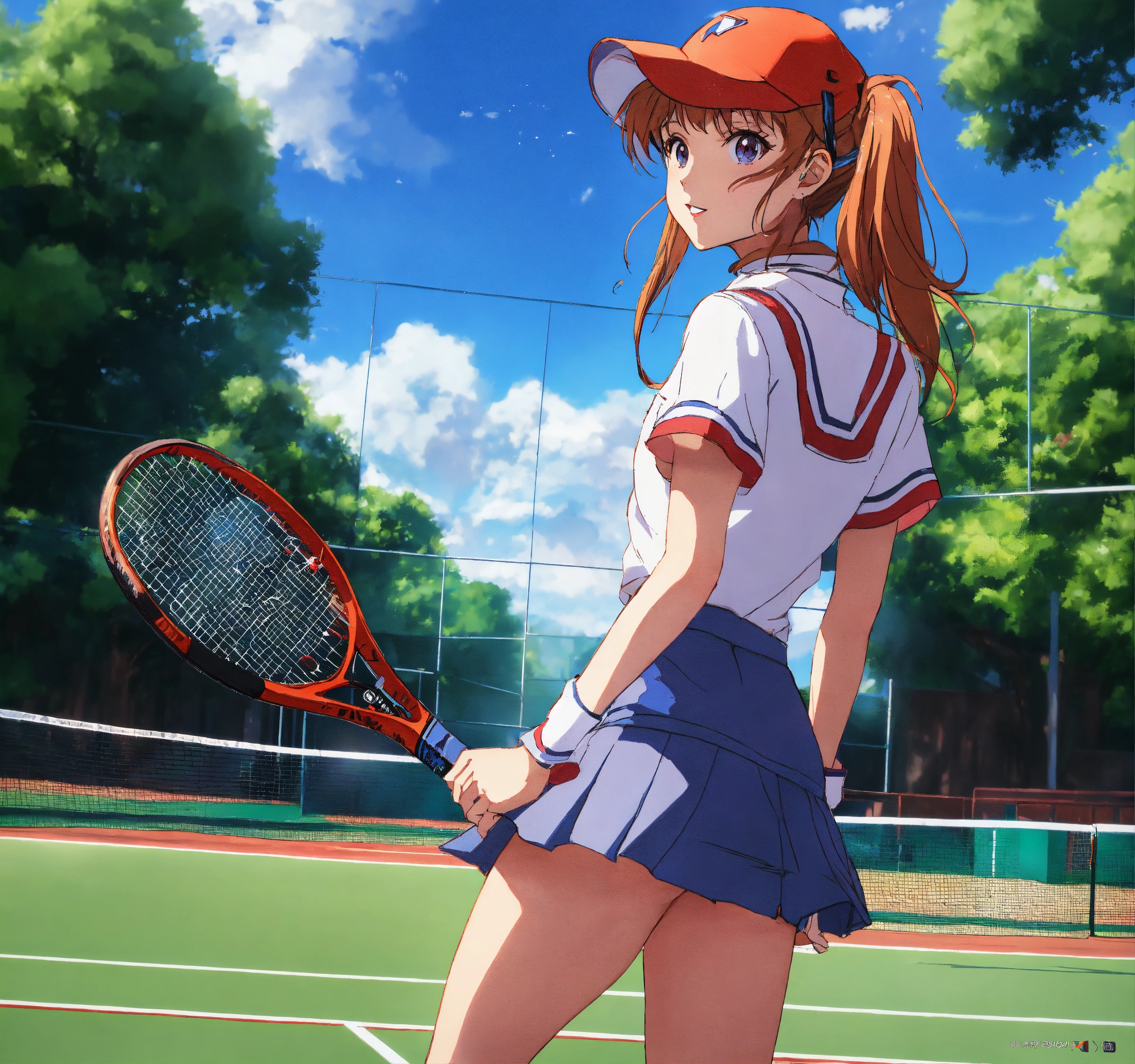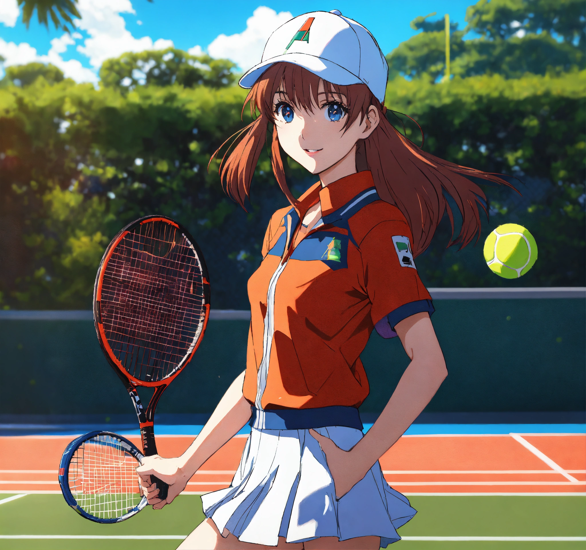 Anime art of asuka from neon genesis evangelion, tennis, tennis girl, tennis skirt, outdoors, sunny, tennis racket, young girl, beautiful girl, happy, stunning detail, detailed environment, trending on artstation, unreal engine render, ray-traced environment, vintage 80’s anime artwork