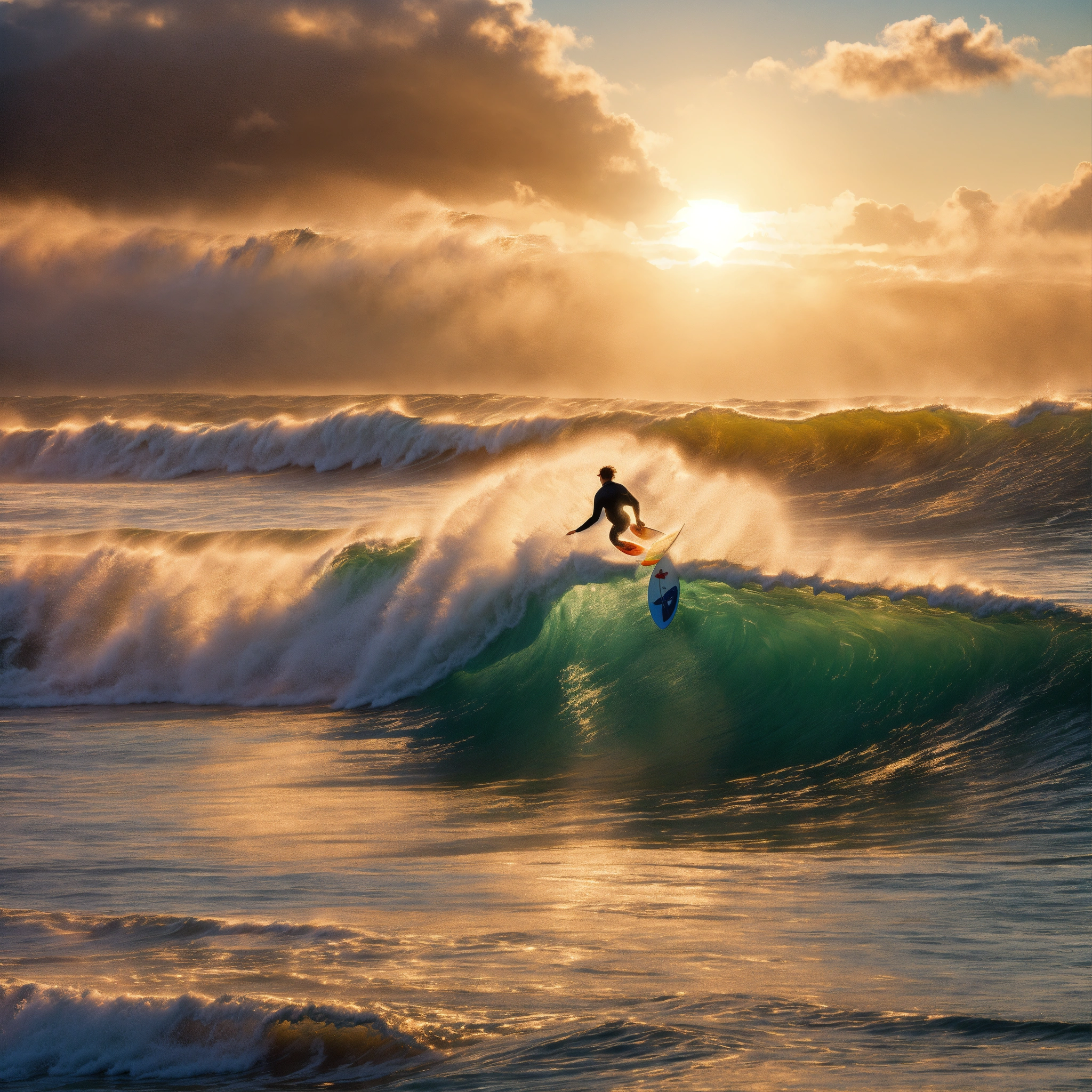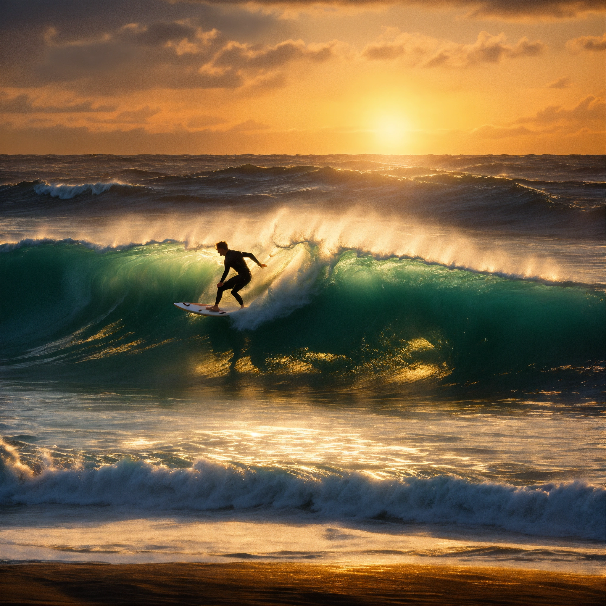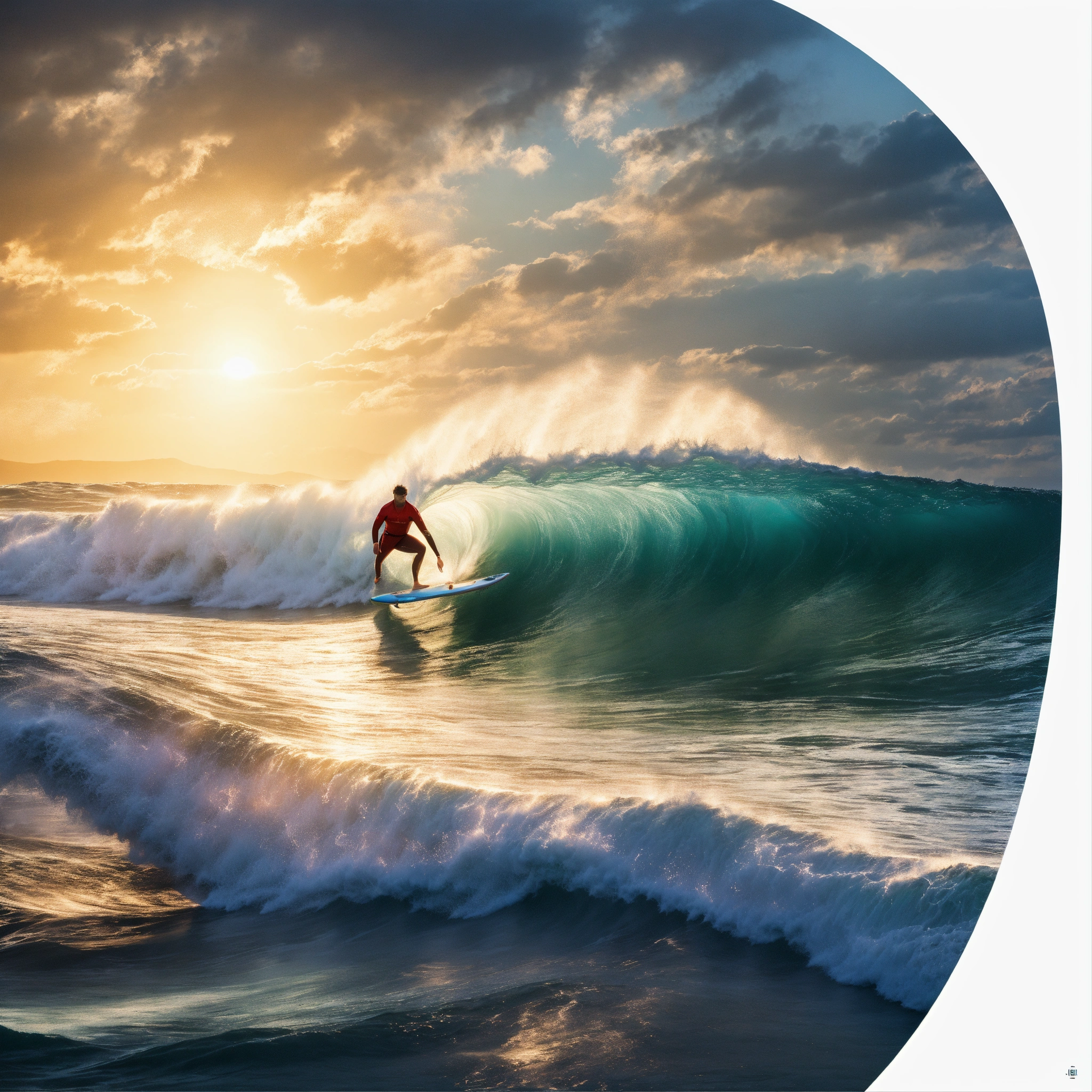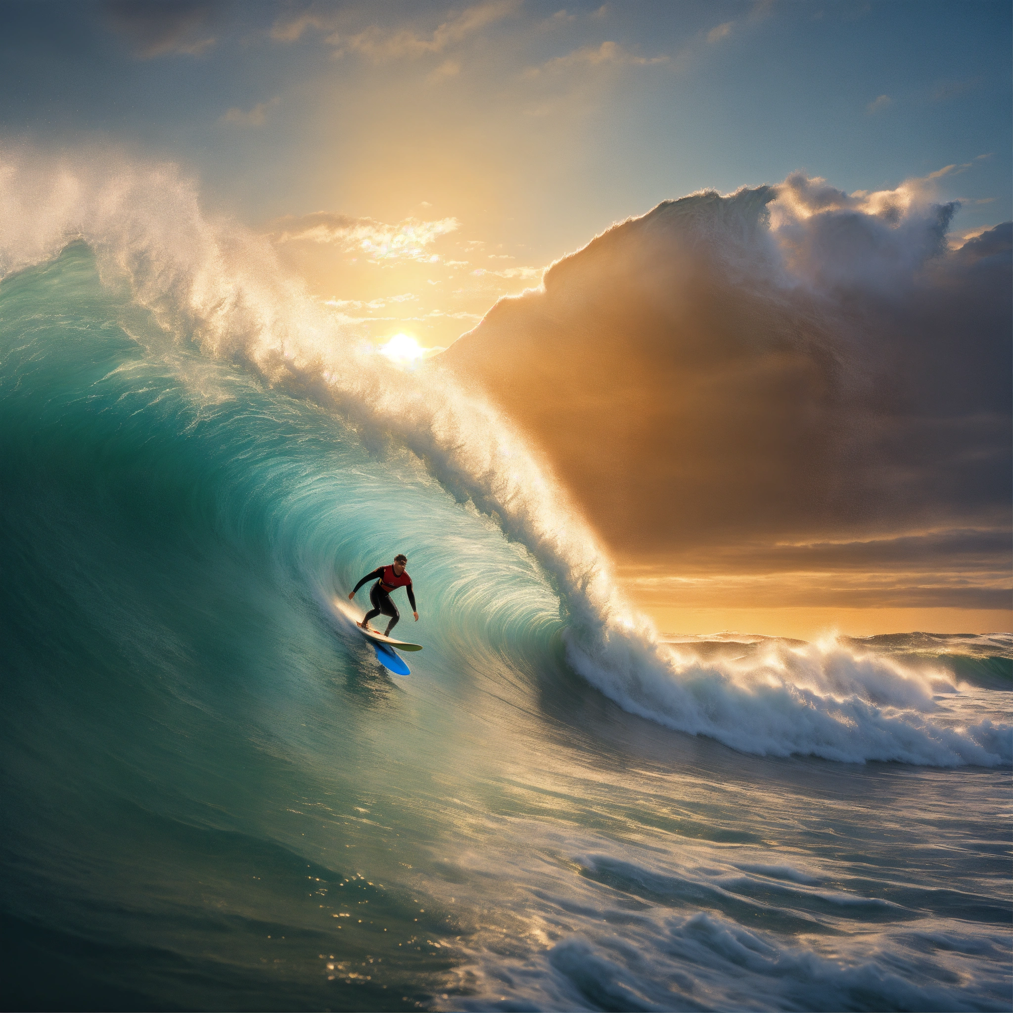 A hyperrealistic image of a surfer riding a huge wave on the ocean bay. there is the sun behind the surfer, its size it two thirds of the whole image.