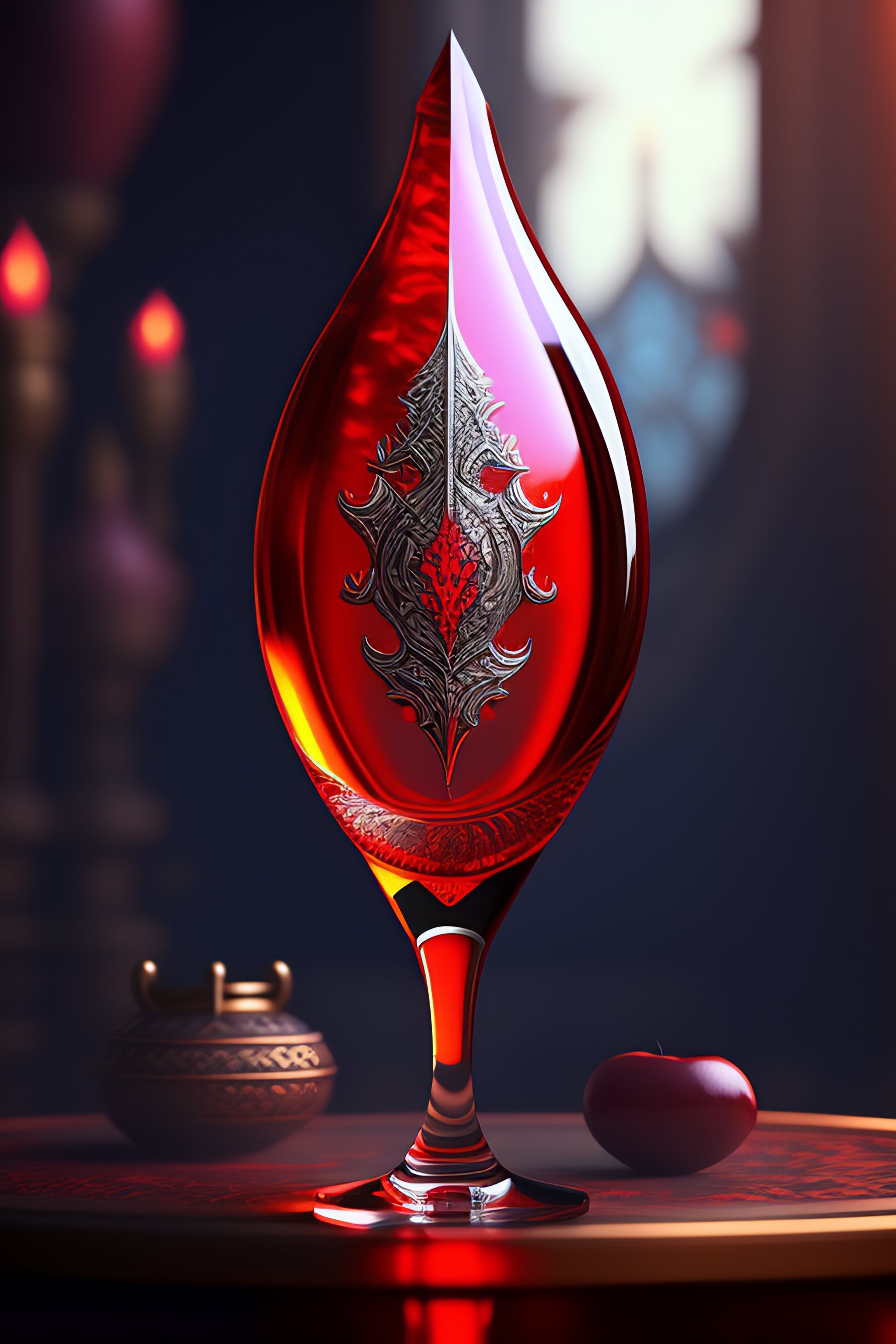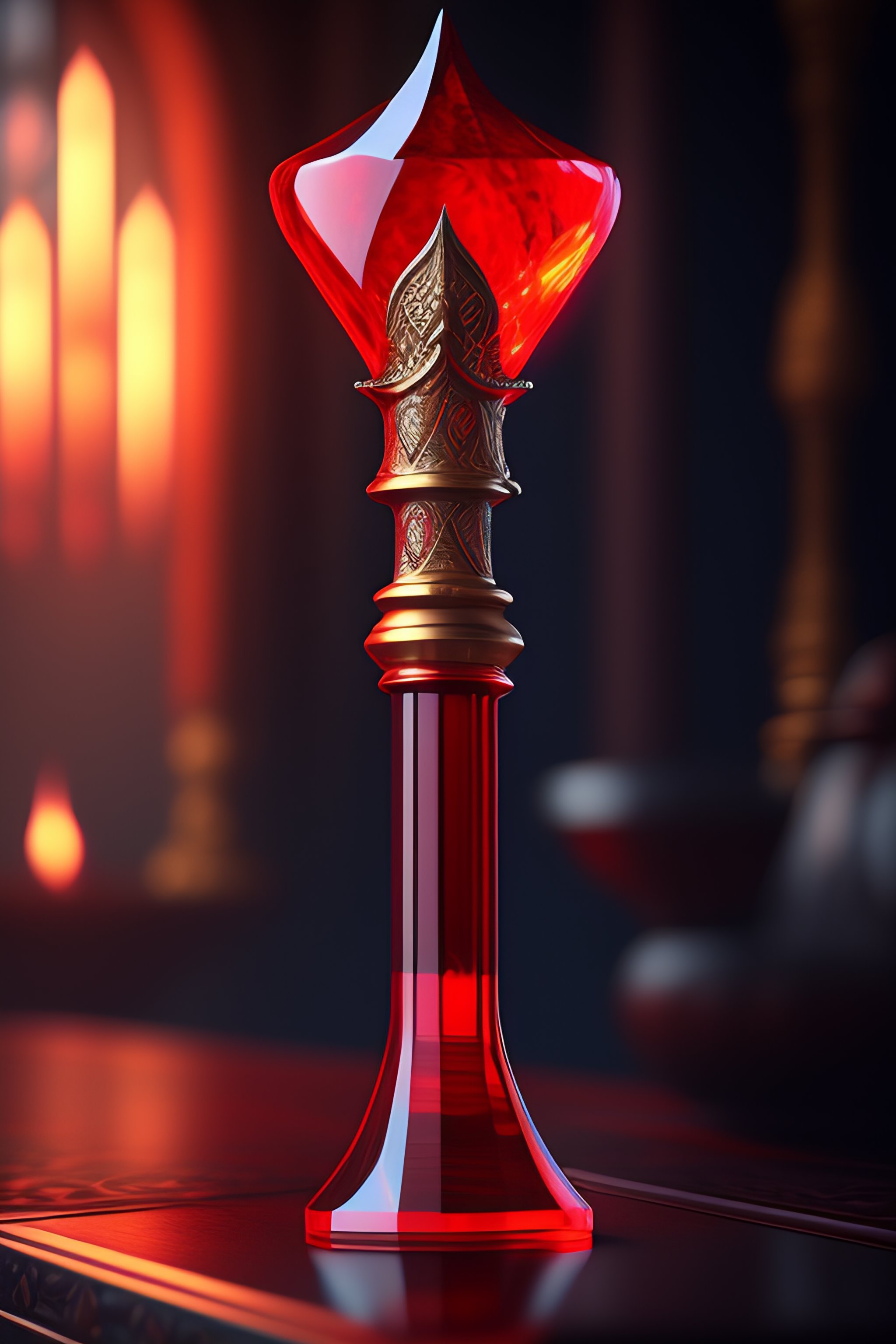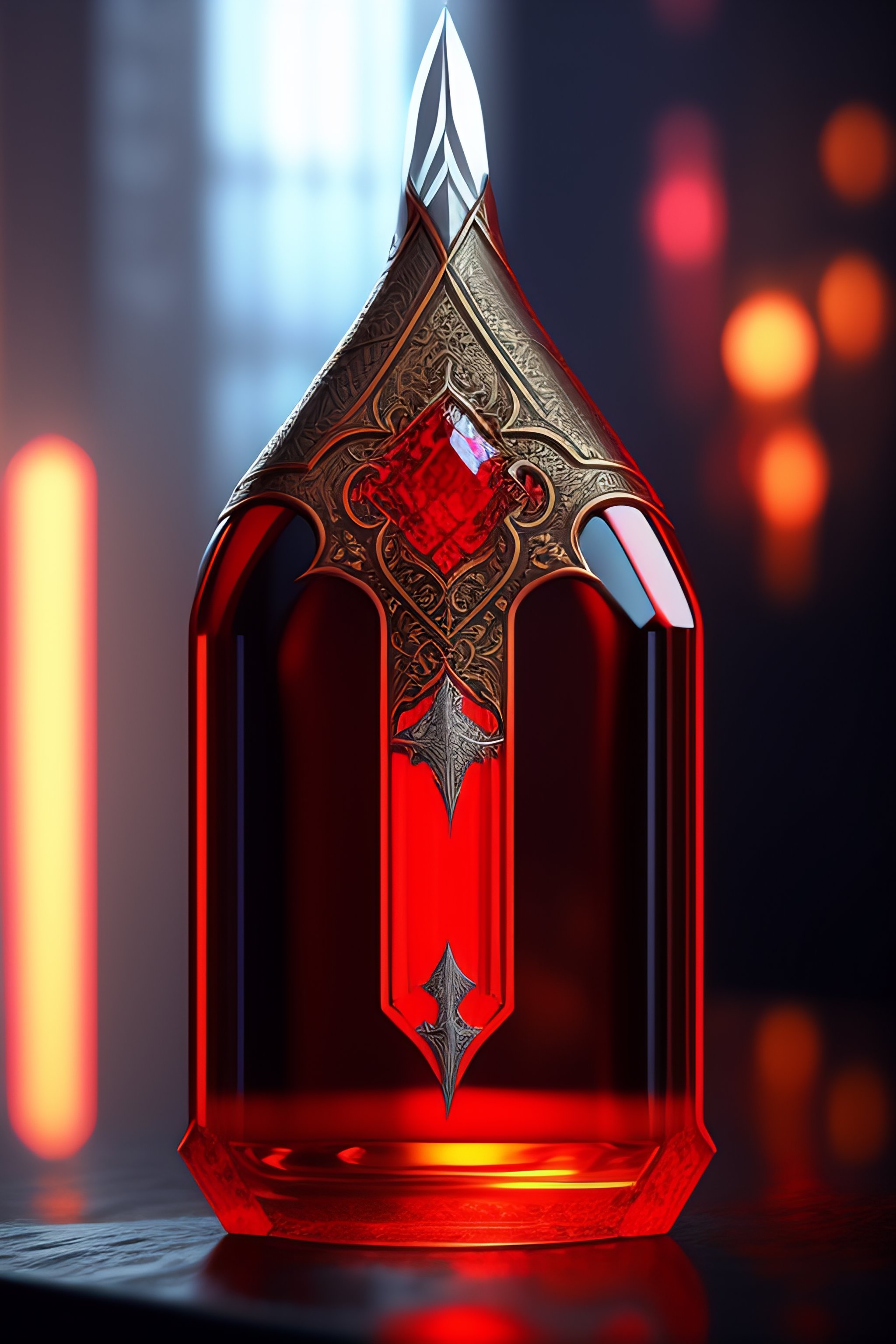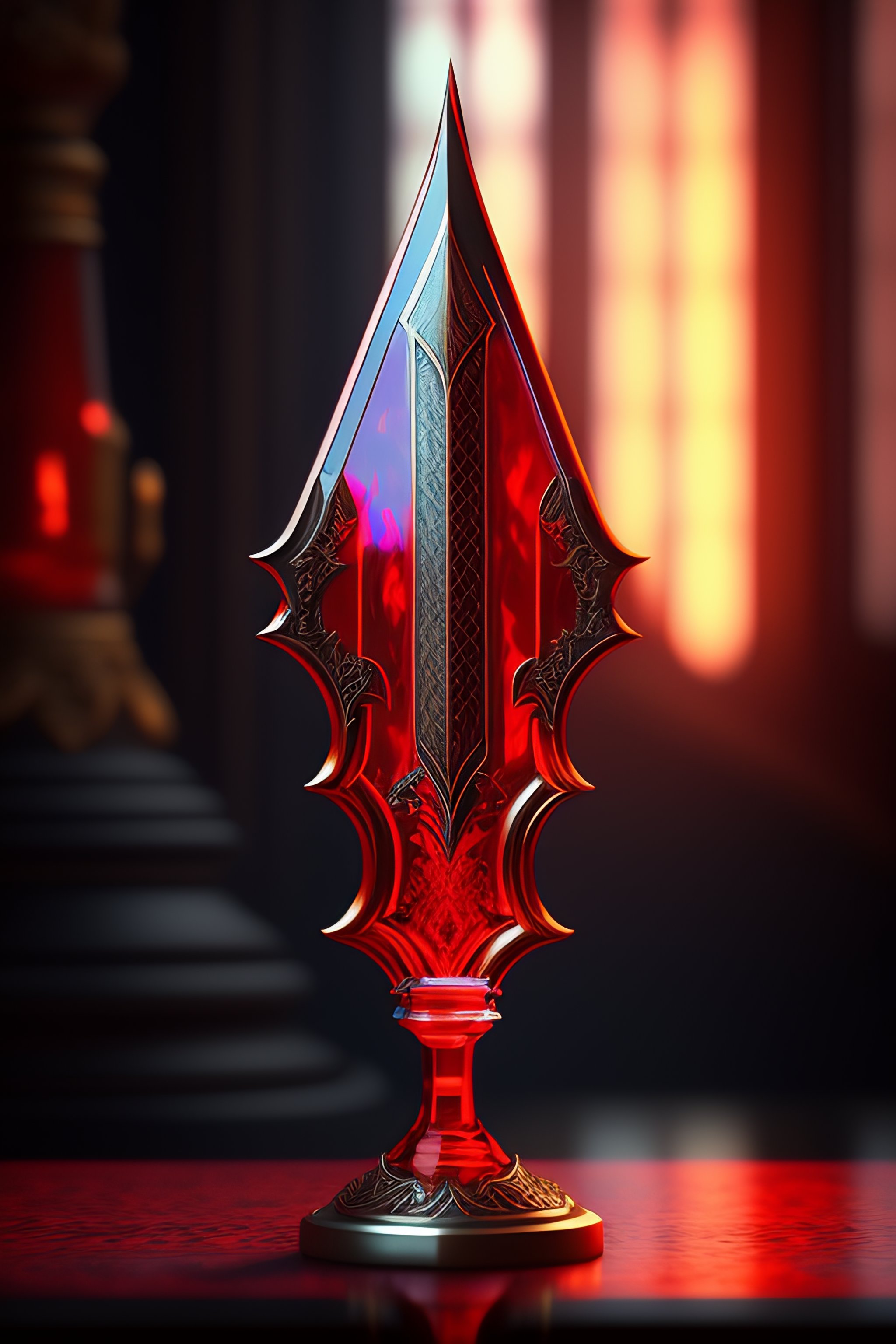 Fantasy longsword made of transparent red glass, evil magic weapon on stone table, detailed digital concept art, deep color, grim, intricate detail, art by deviant art, splash screen, complementary selective colors, 8k resolution unreal engine 5
