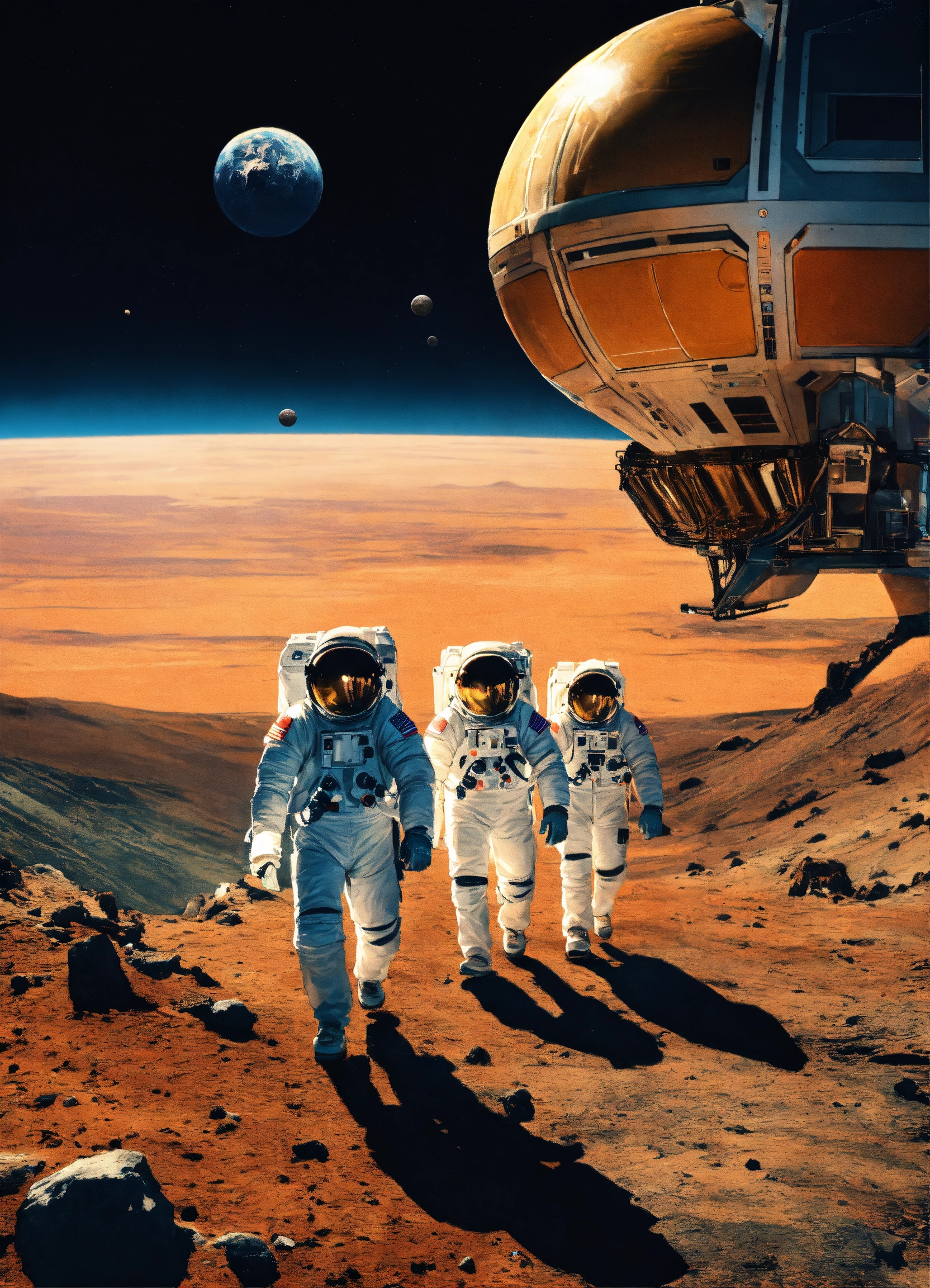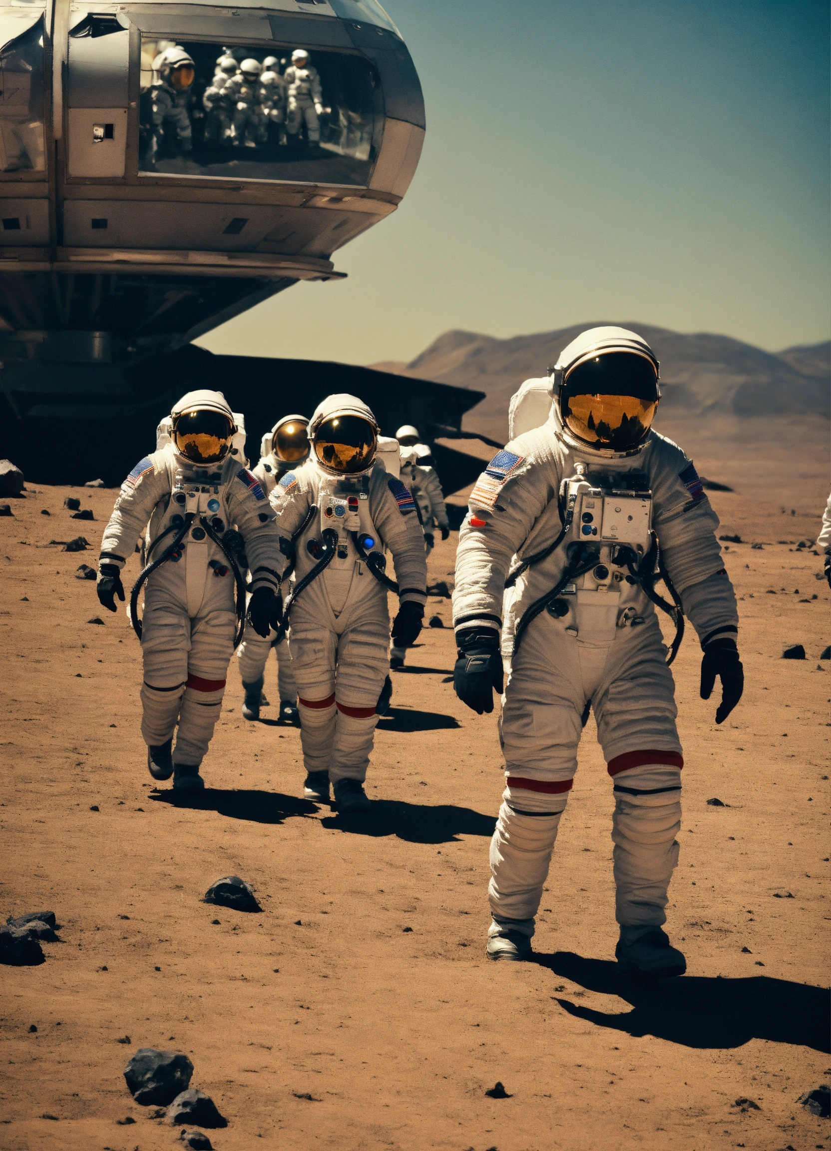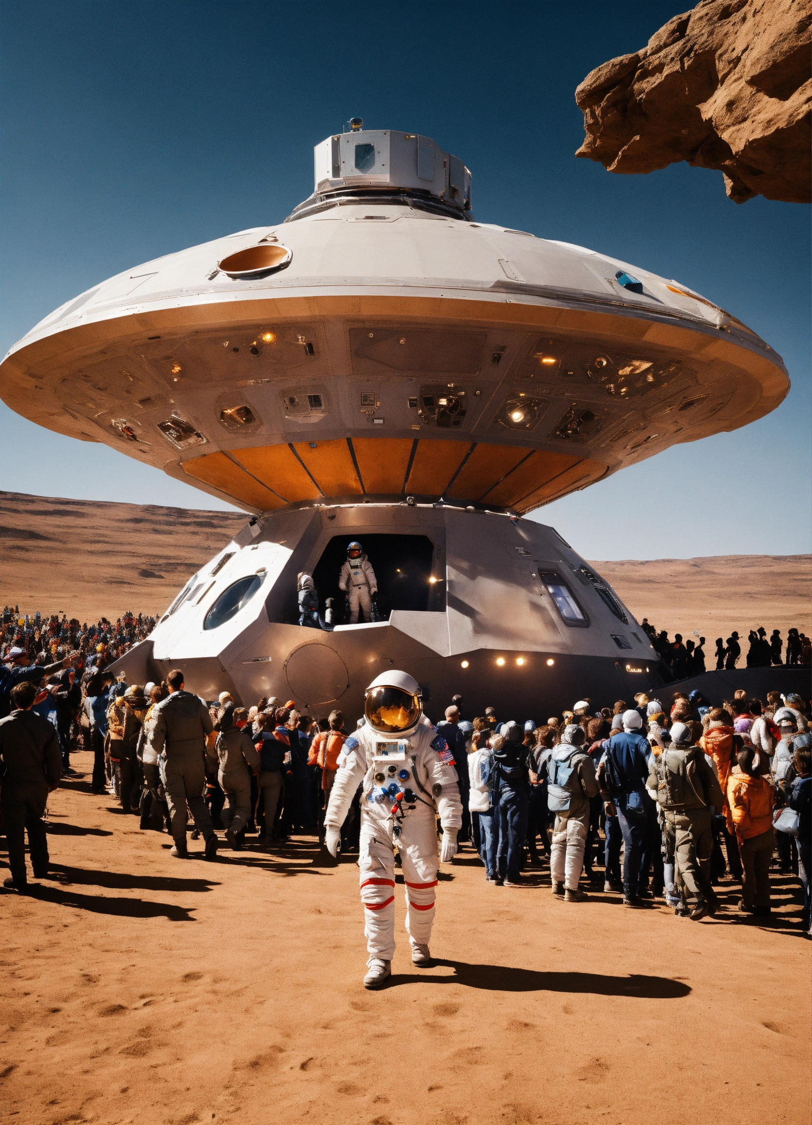 A group of humans with spacesuit walking out of a spaceship in front of a crowd