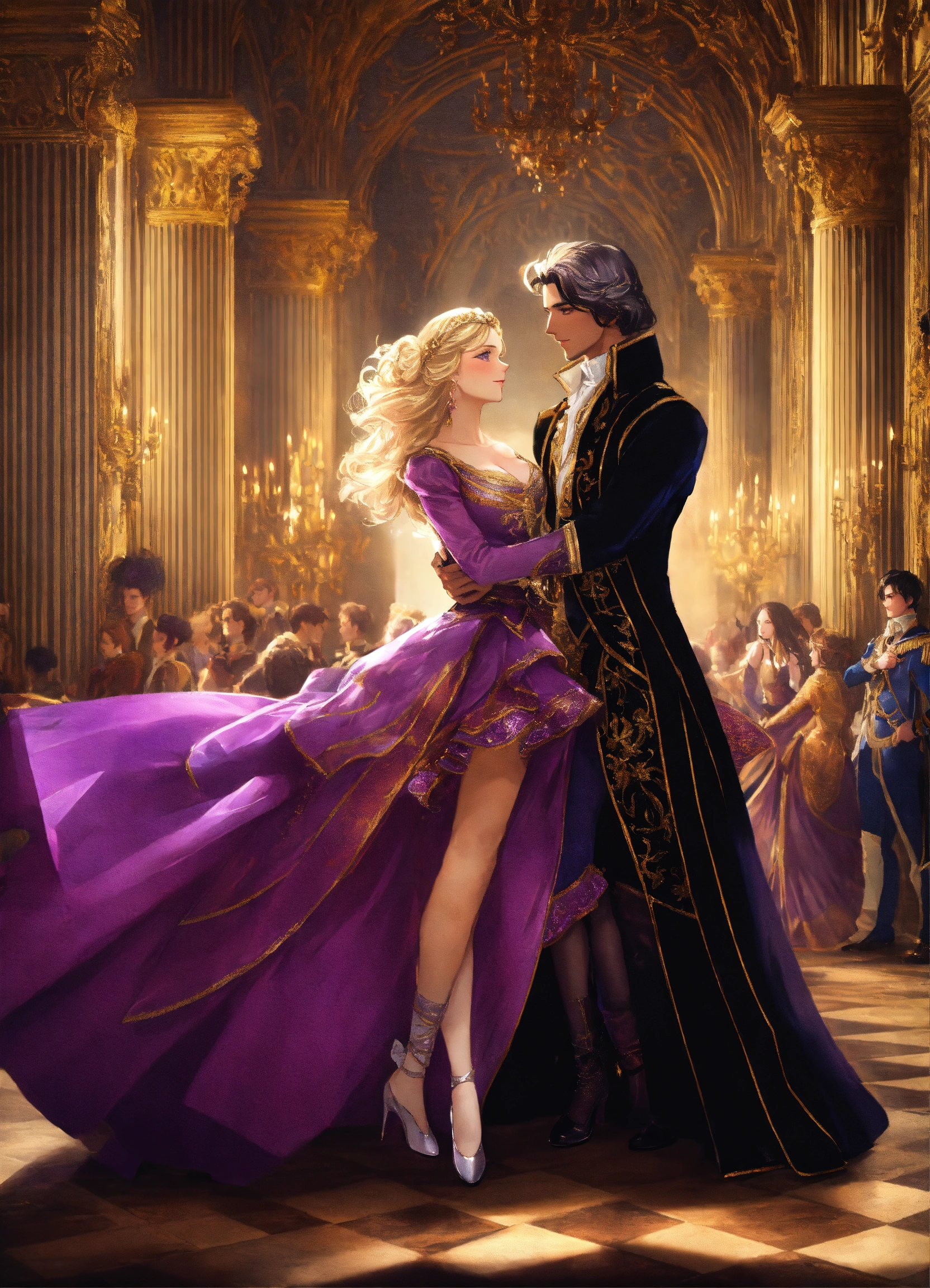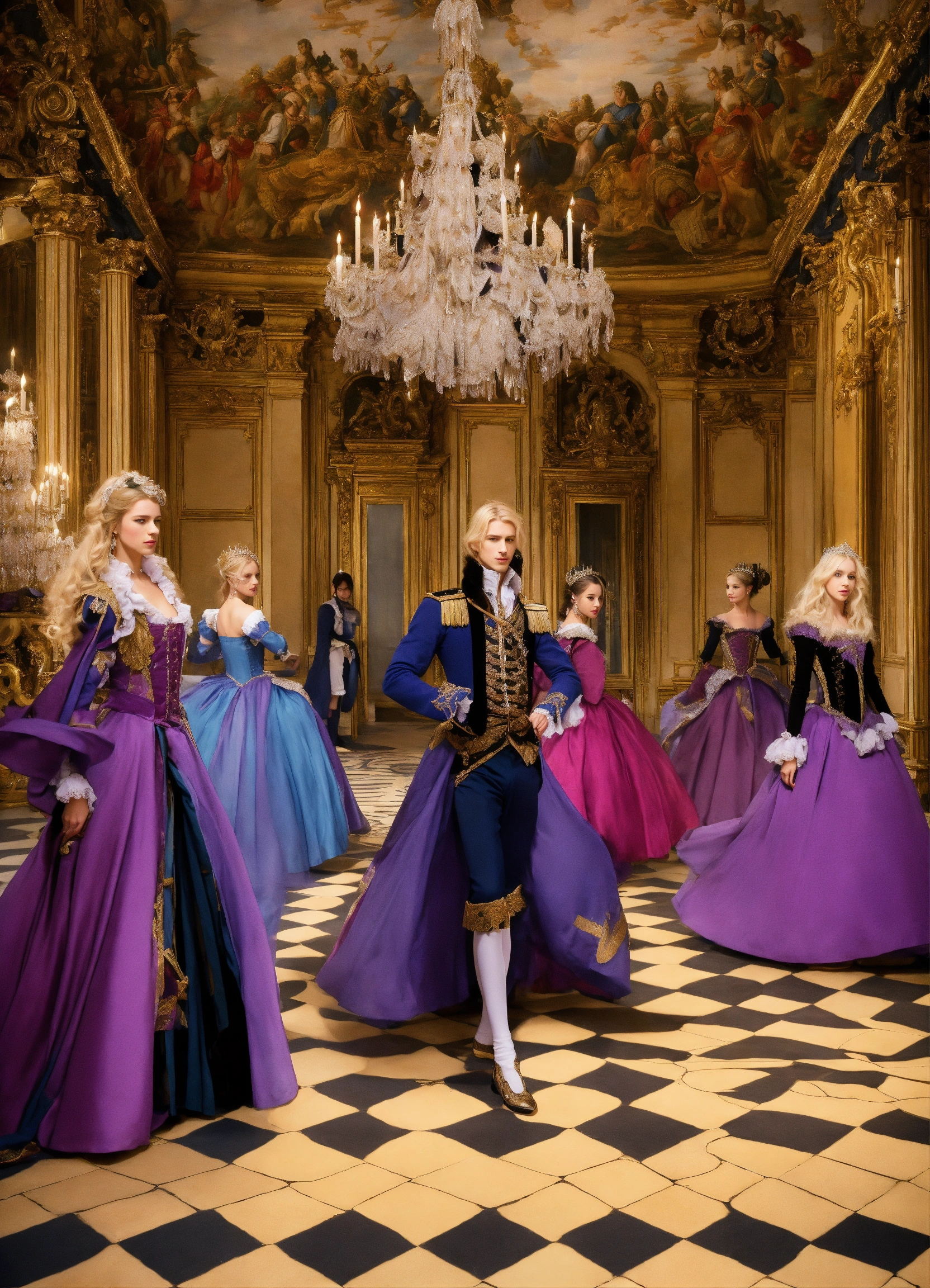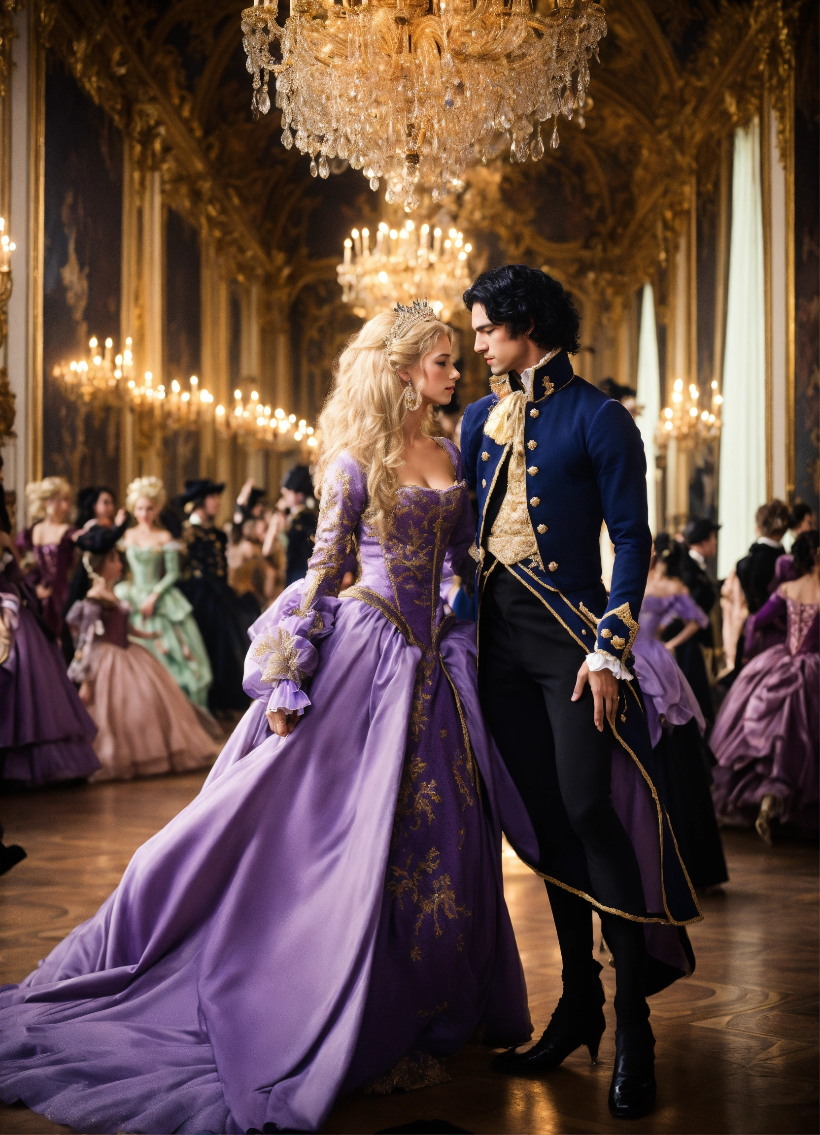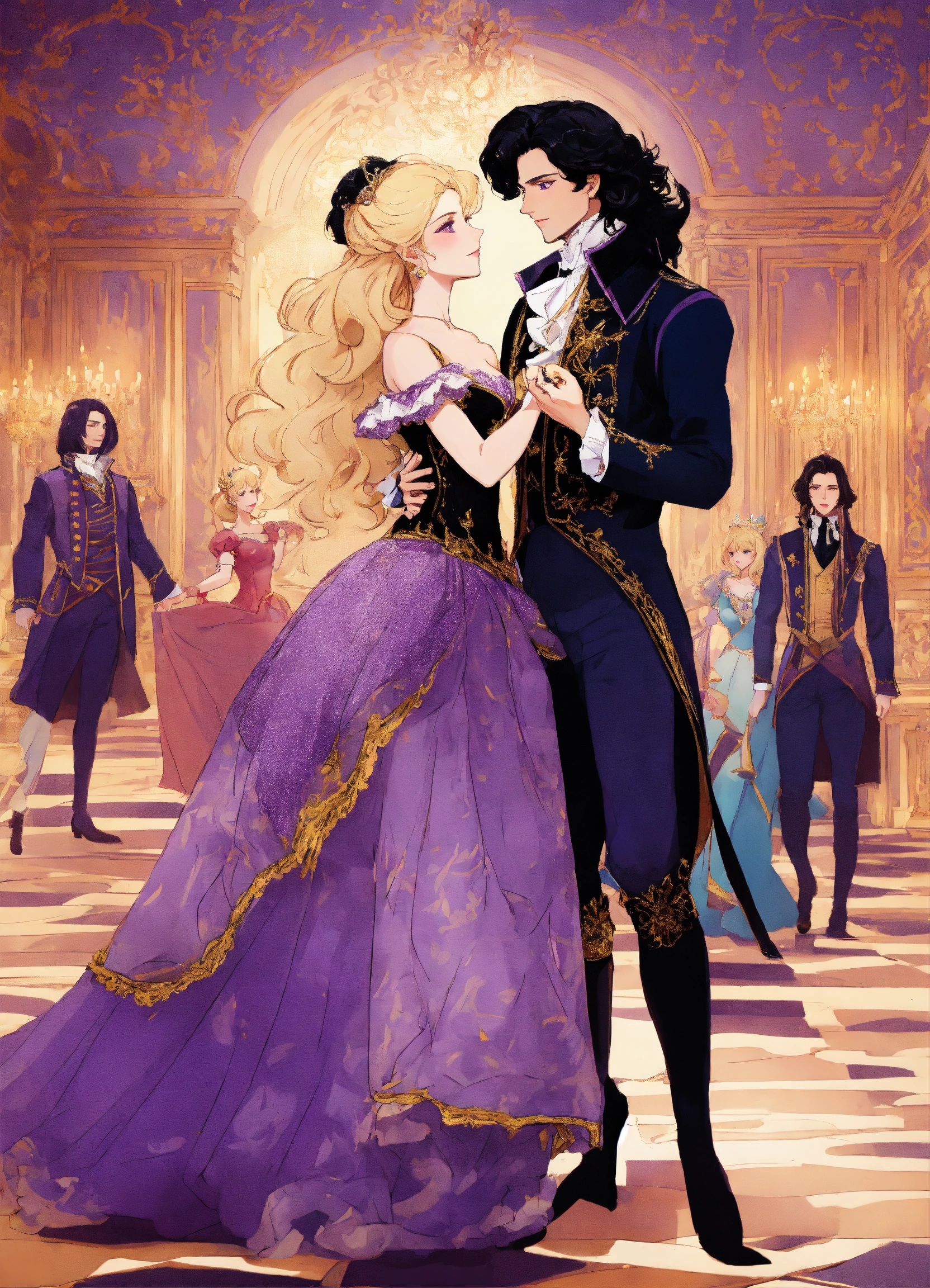 Dance of versailles with dancers and princess with blond hair and prince with cut black hair and costums black and purple