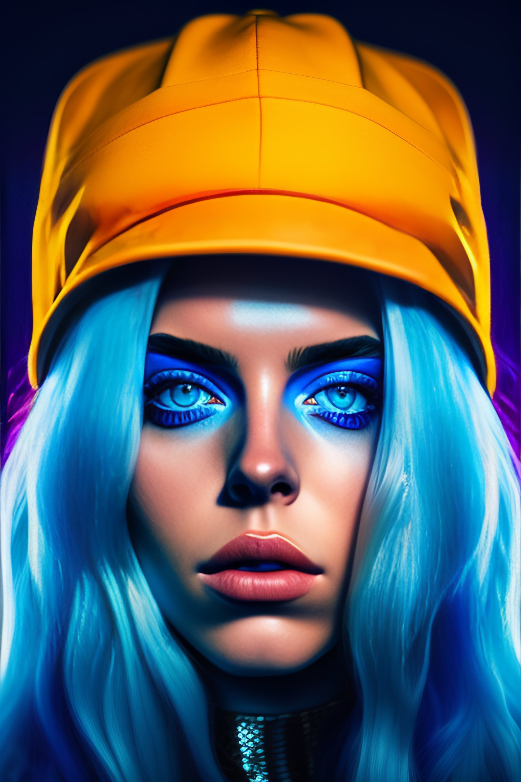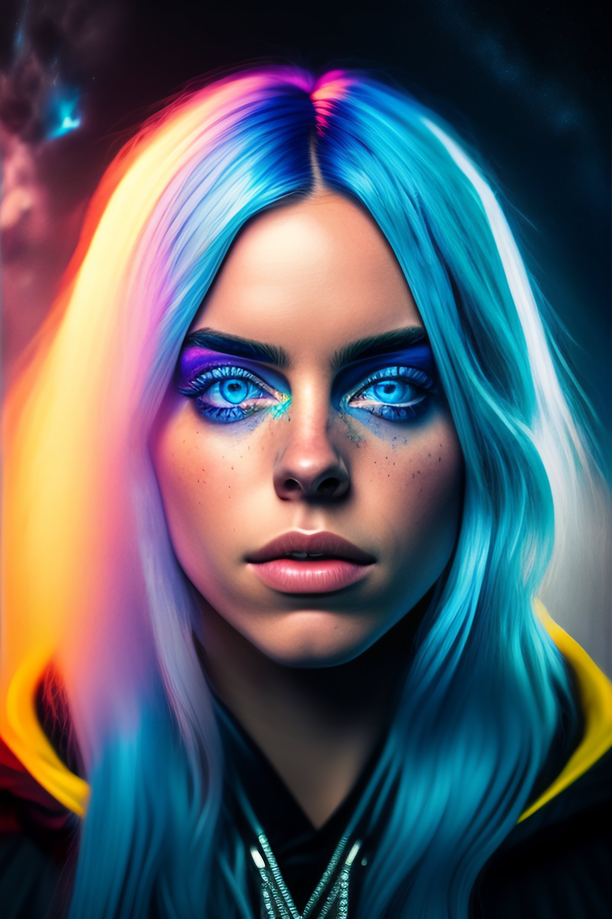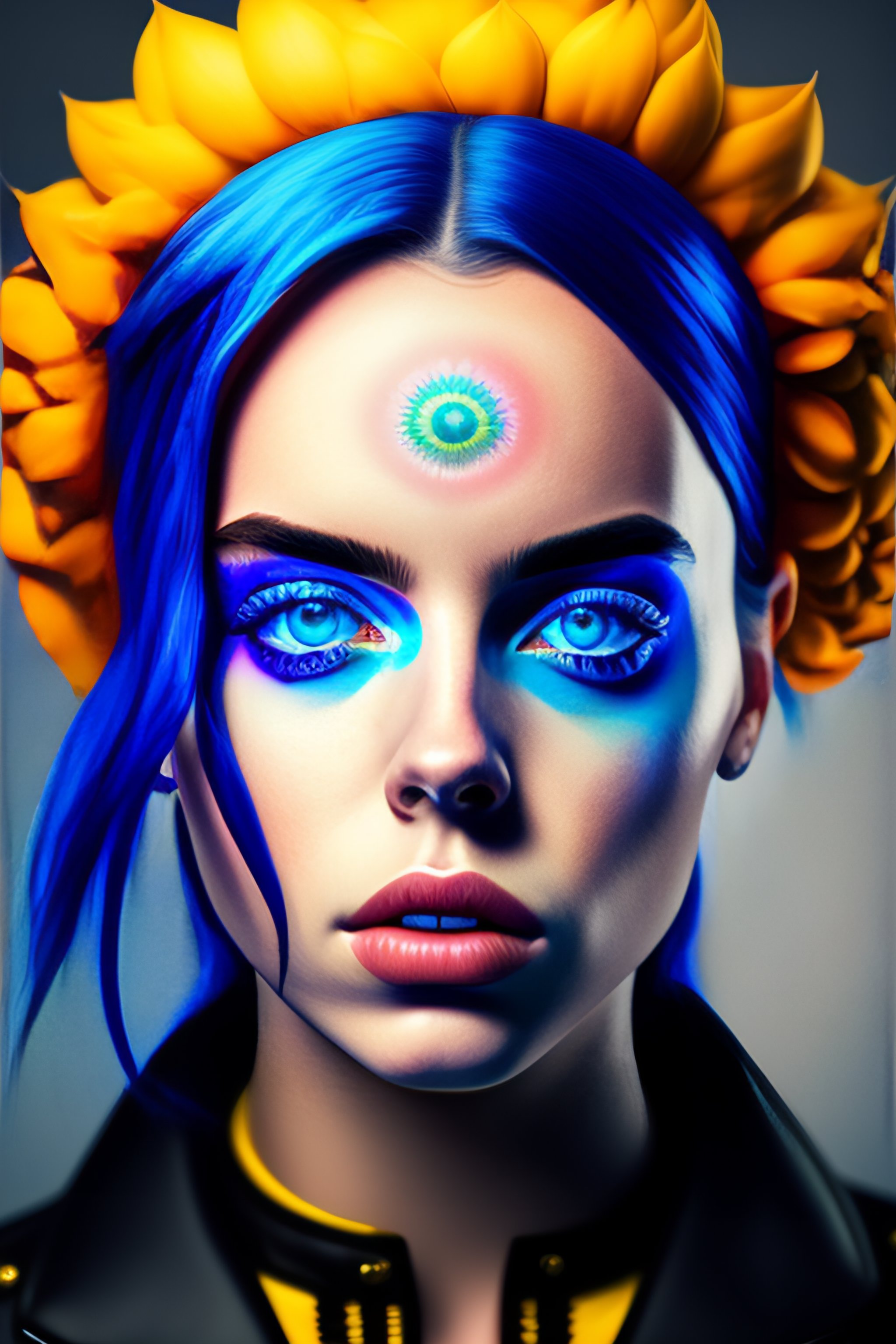 Billie eilish portrait, third eye on forehead, apocalypse background, blue eyes, ultra realistic, 8k, clean image
