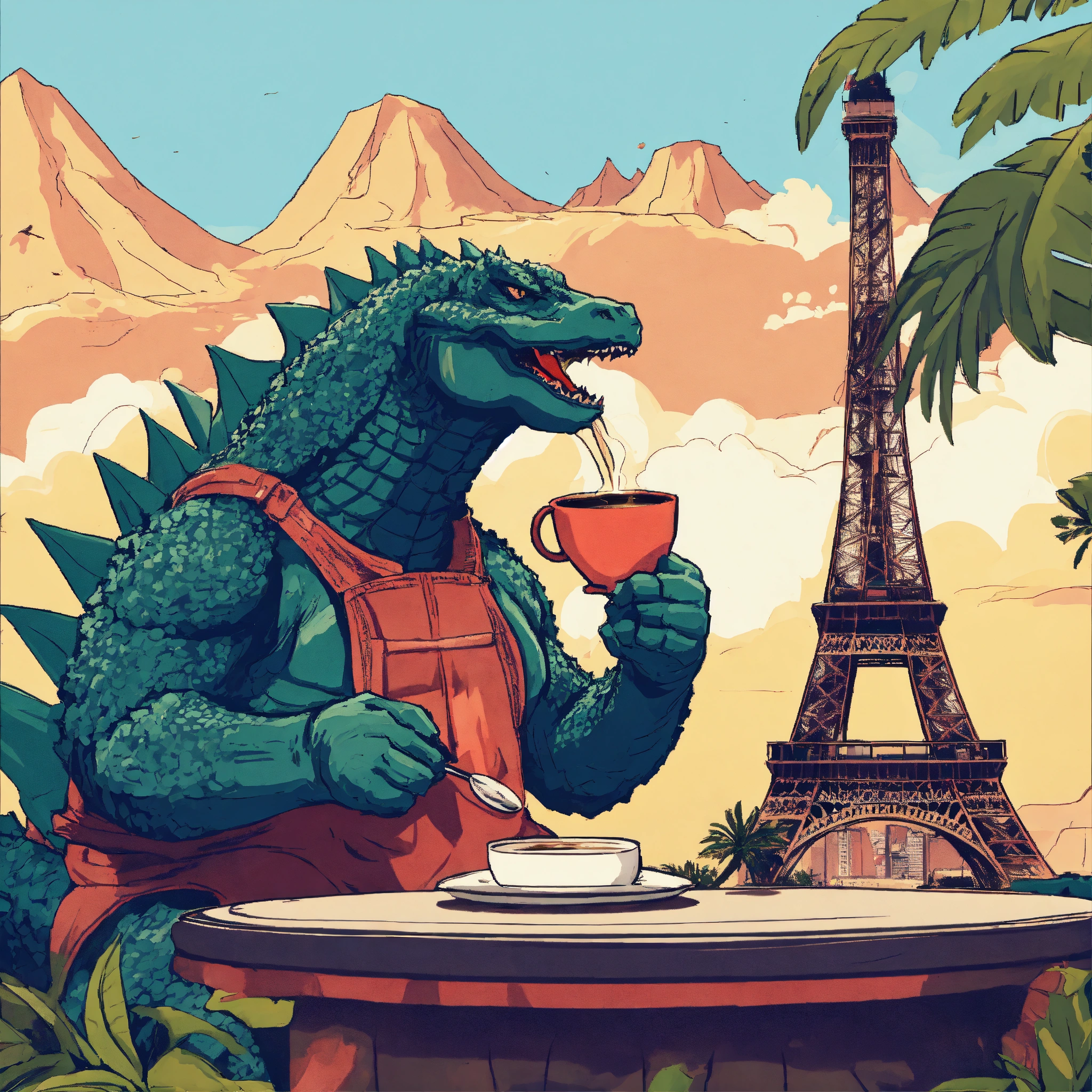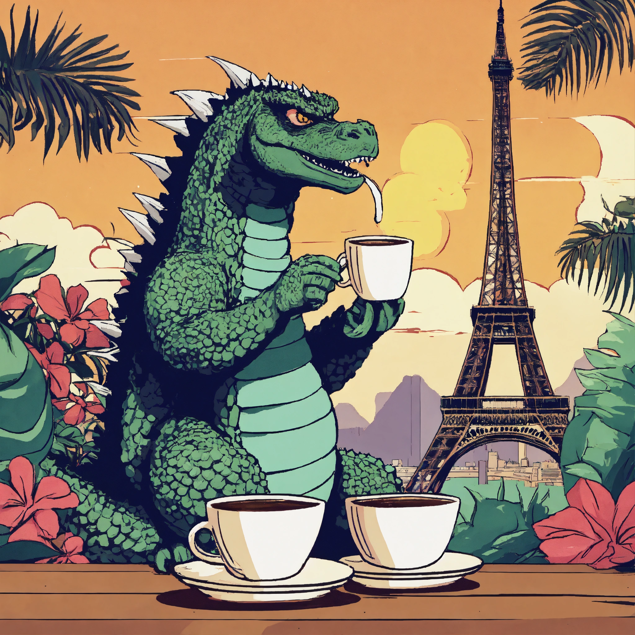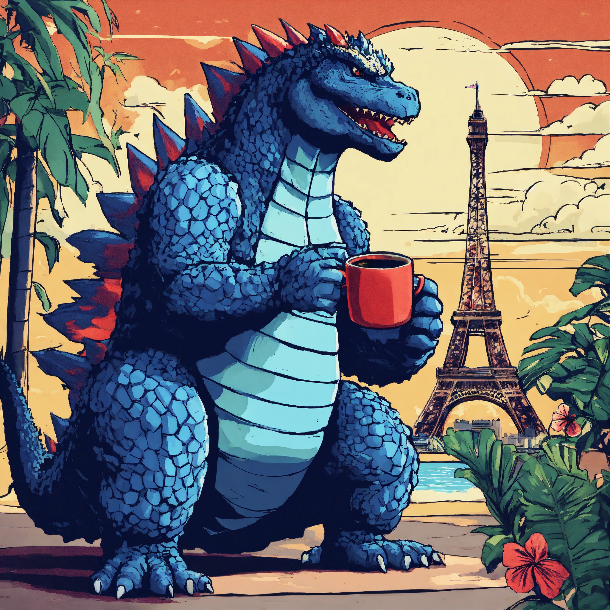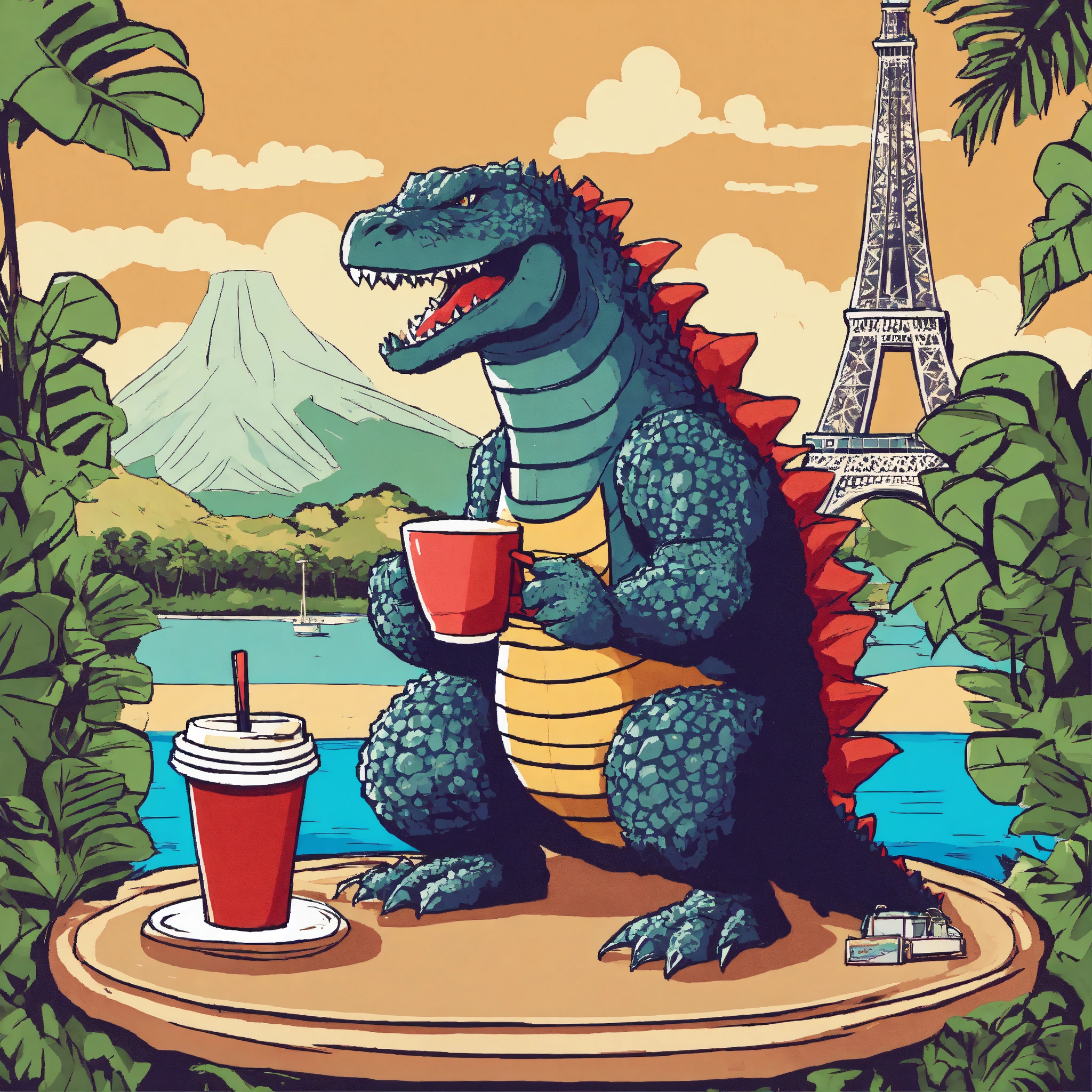 Godzilla in hawaiian style drinking a coffee in front of the effeil tower