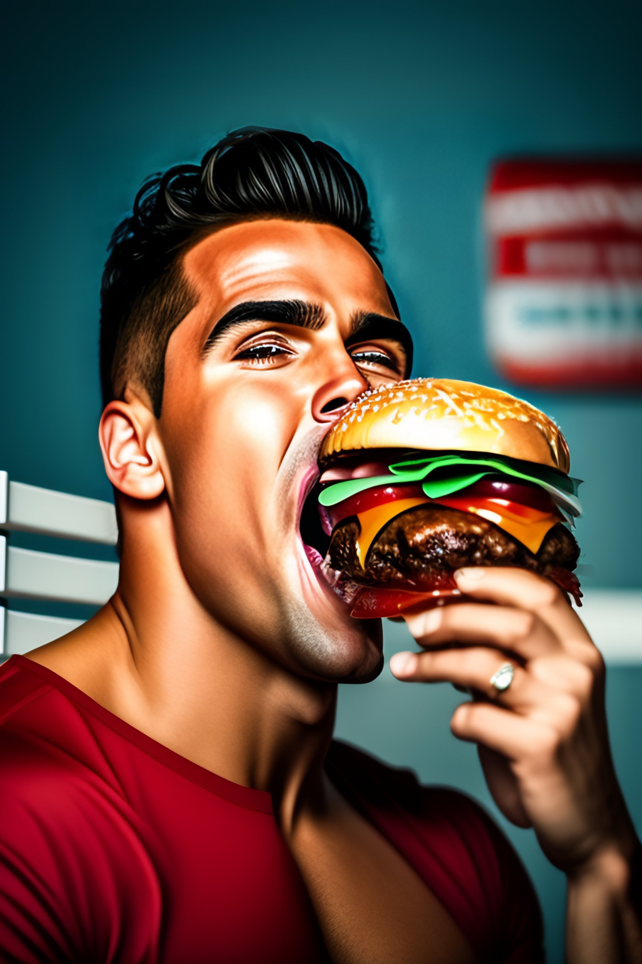 He is eating a burger, he is eating it with his hands, he is eating it with his mouth, he is eating it with his teeth, he is eating it with his tongue, he is eating it with his lips, he is eating it with his cheeks