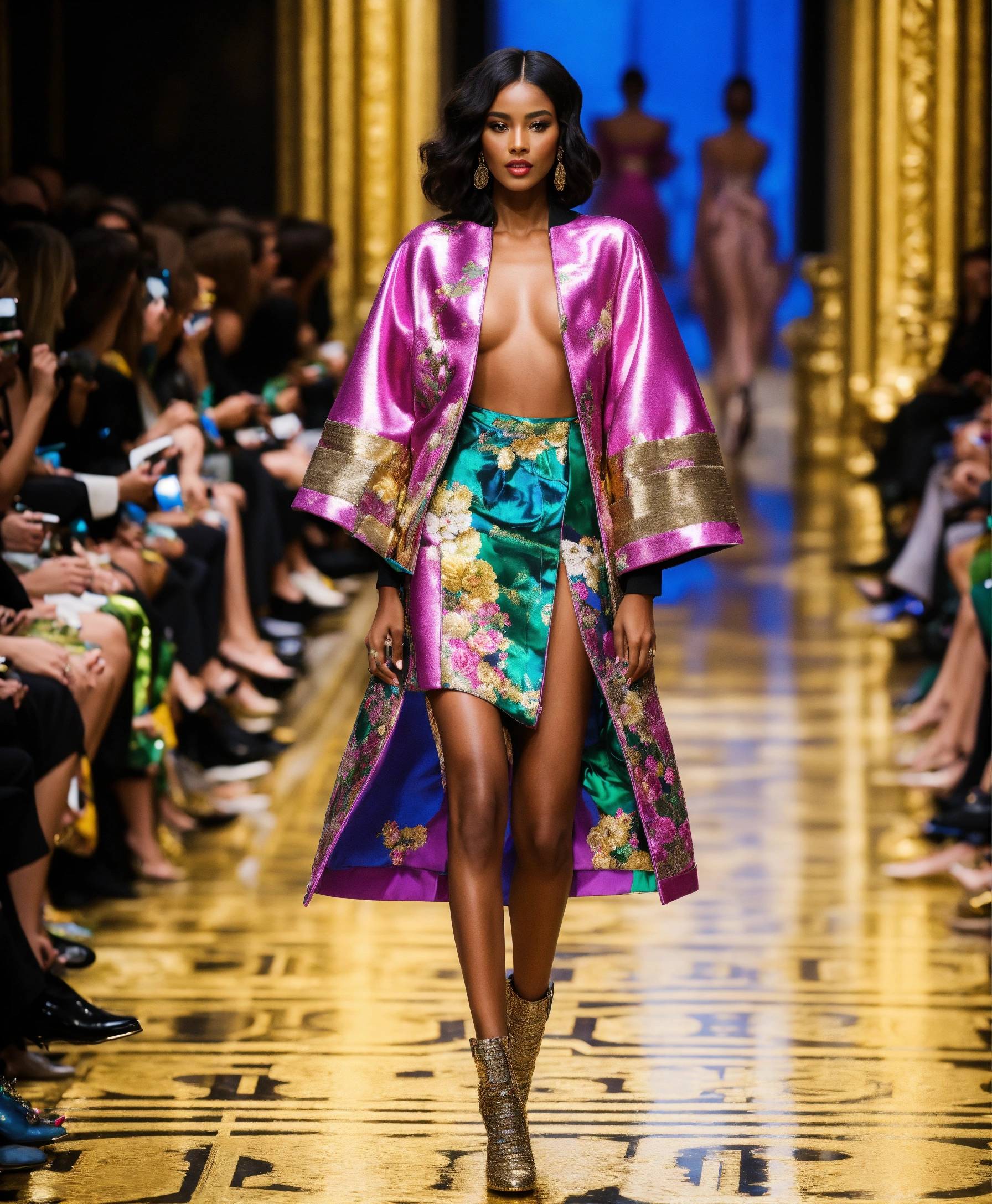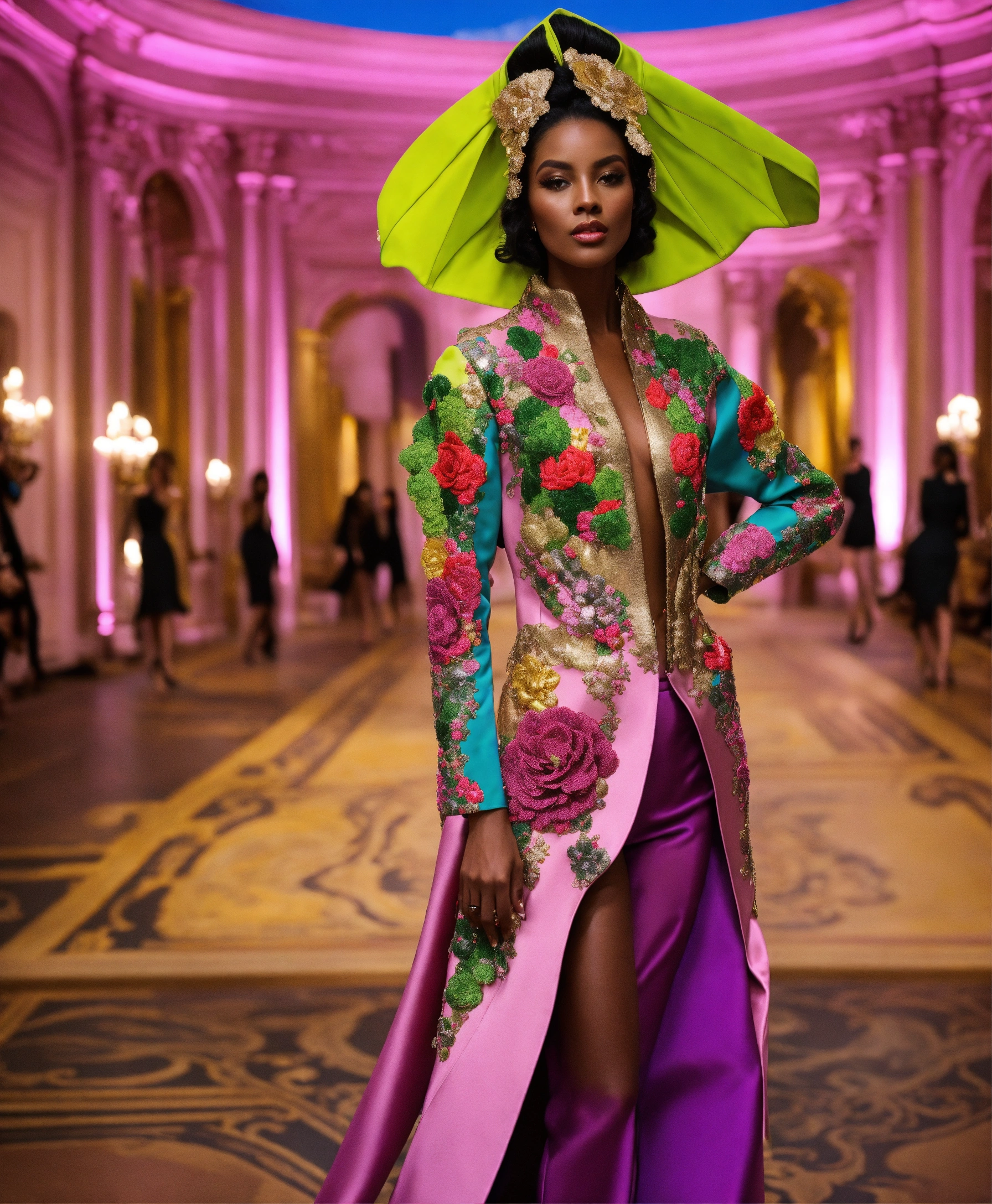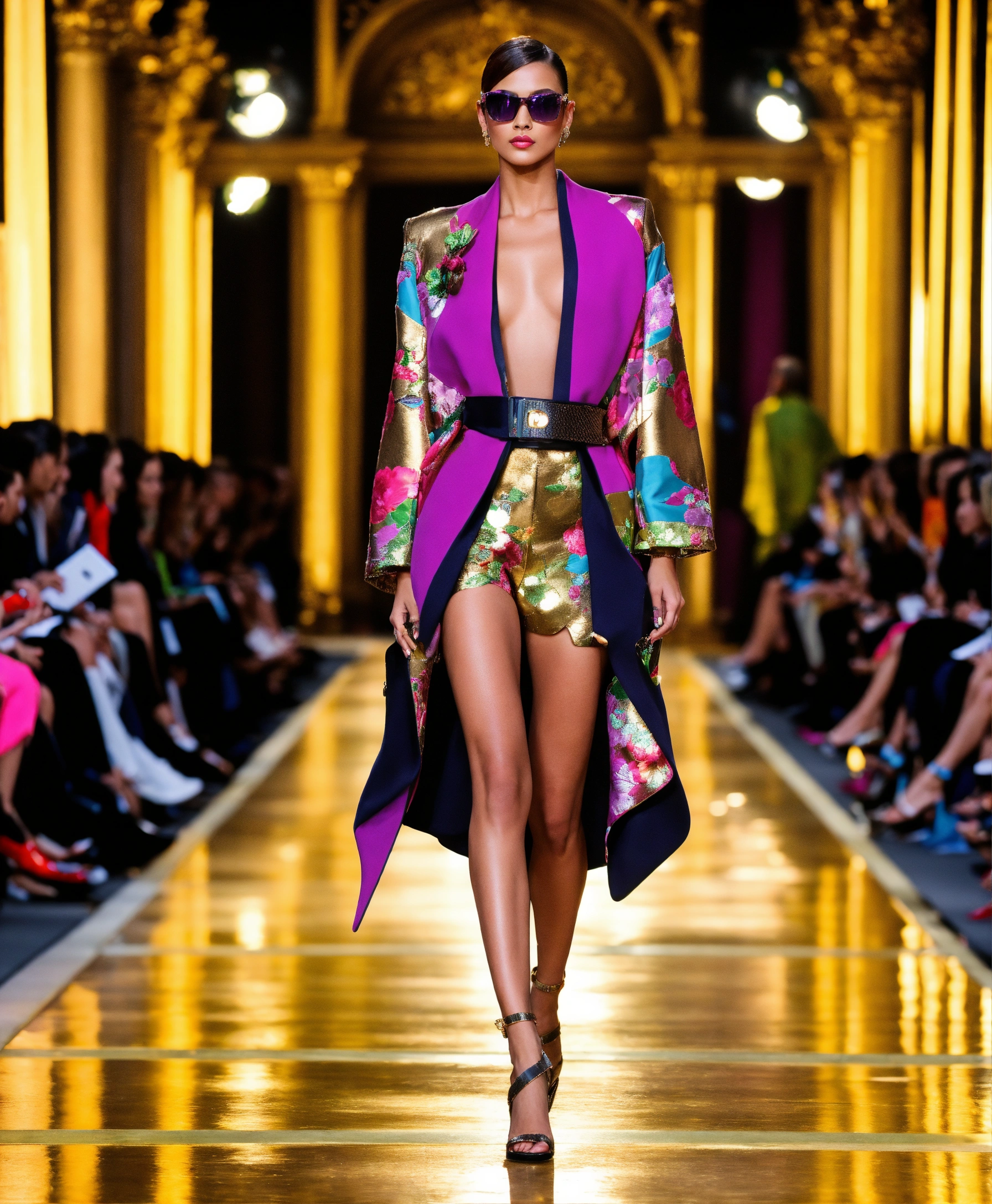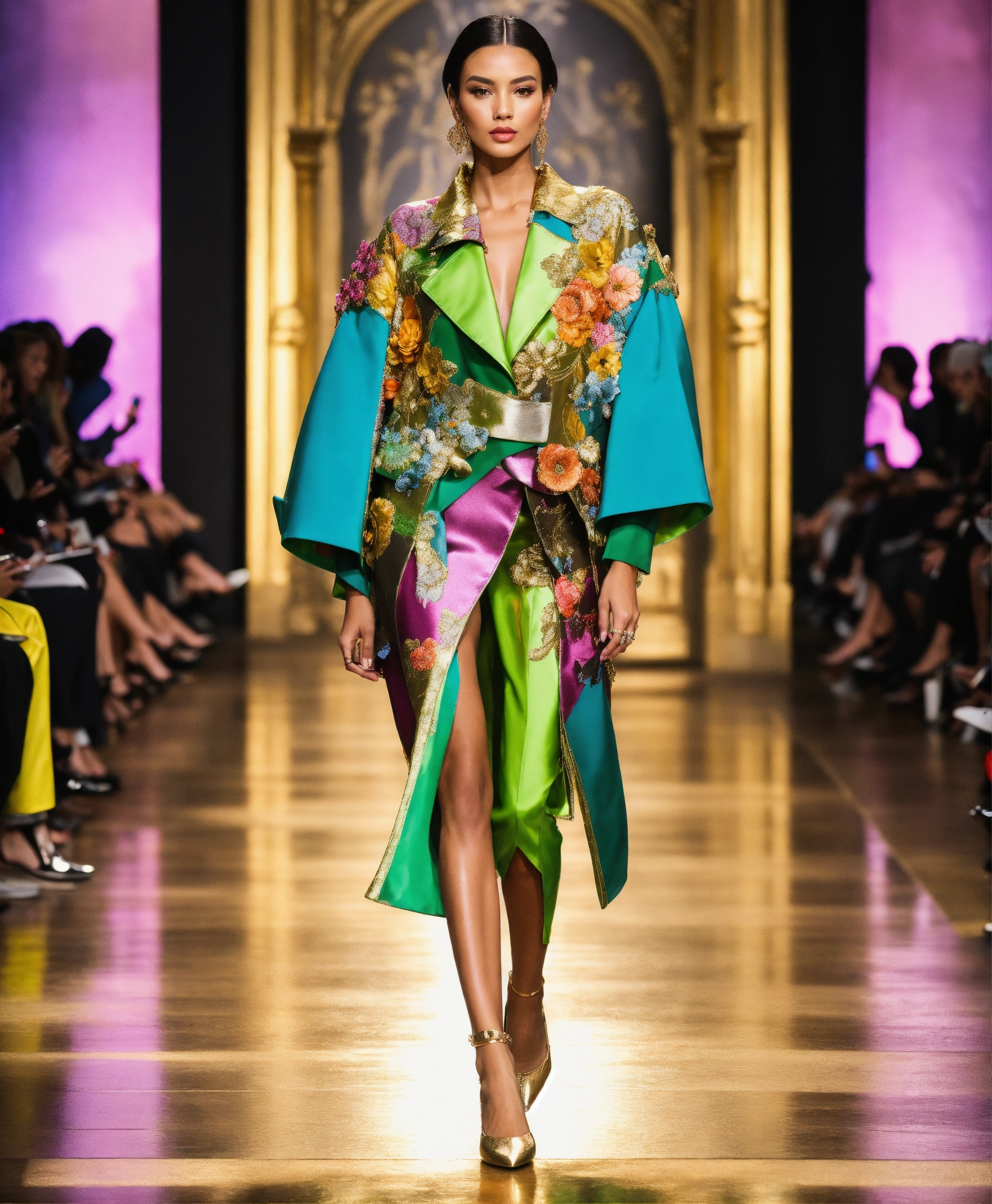 Ultra realistic full body photo of a stylish edgy american model walking the runway modeling summer designer novelty interesting complex unusual street sporty classy modern dolman sleeve outfit brave, paris versailles details cutouts and and gold geometric pattern floral structured tailored jacket pink gold green lilac peridot silver magenta lime fuchsia yellow blue black gray copper mauve bronze haute couture ultimate elegance beautiful luxurious awesome appliques haute couture wealthy billionaire opulent majestic cutouts novelty resplendent magnificent sublime 12k