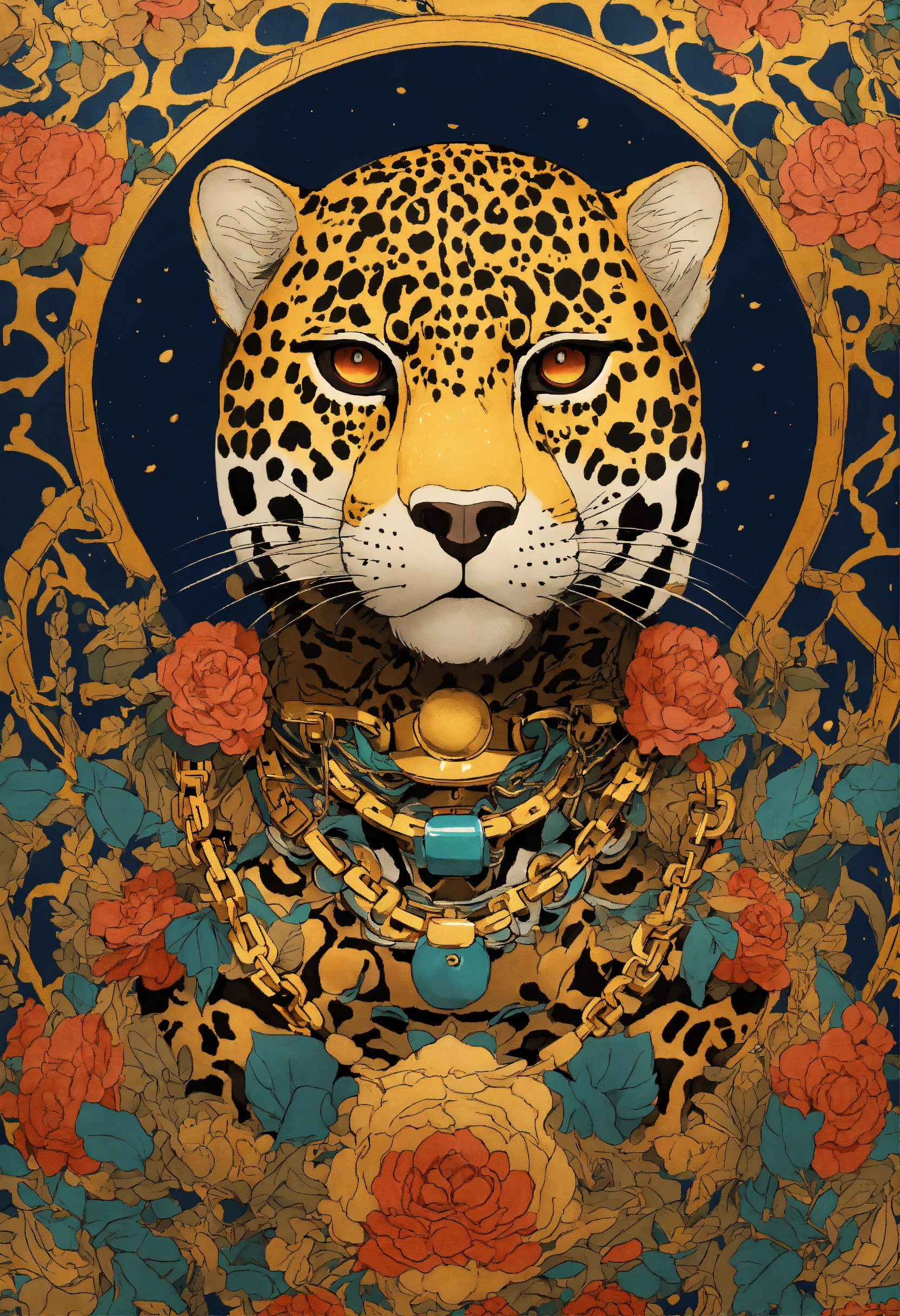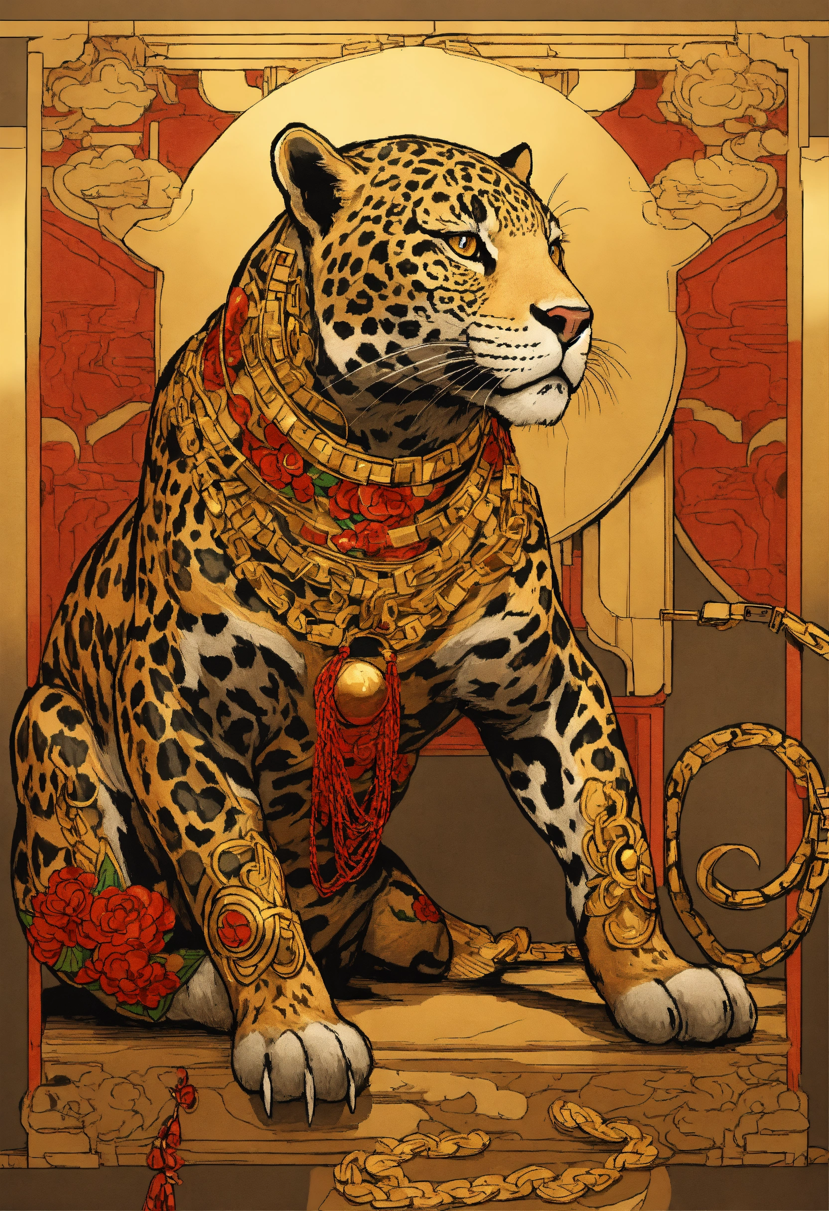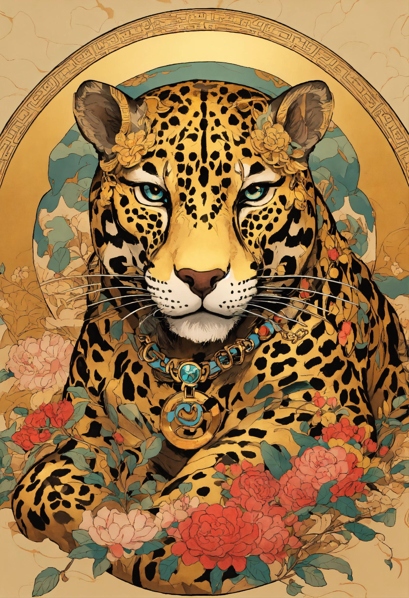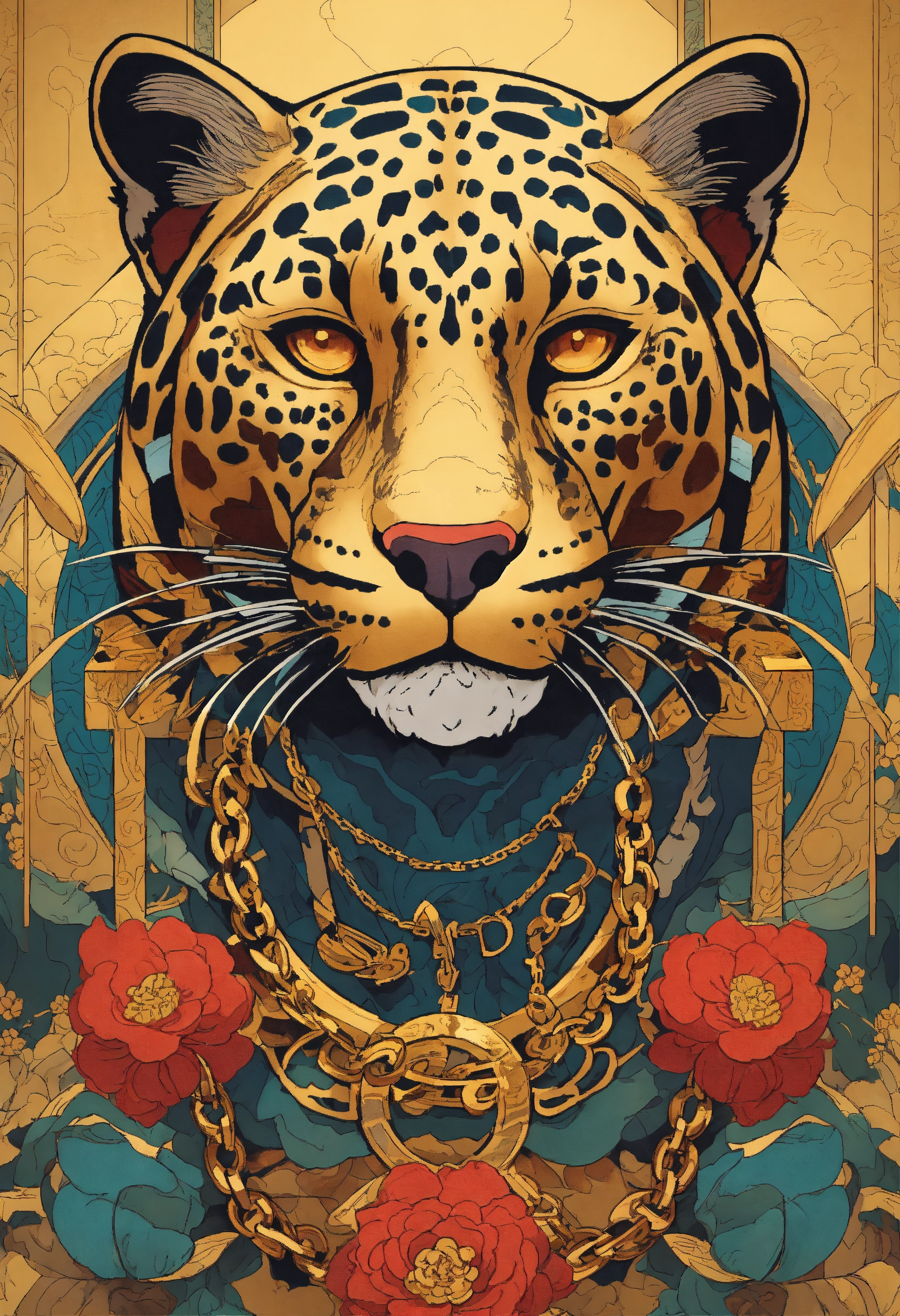 There is a jaguar with a gold chain around its, jaguar design, jaguar detailed, anime manga robot!! jaguar tattoo, japanese art style, colored illustration for tattoo, by kanō tan'yū, ukiyoe style, japanese illustration, by shiba kōkan, line art illustration