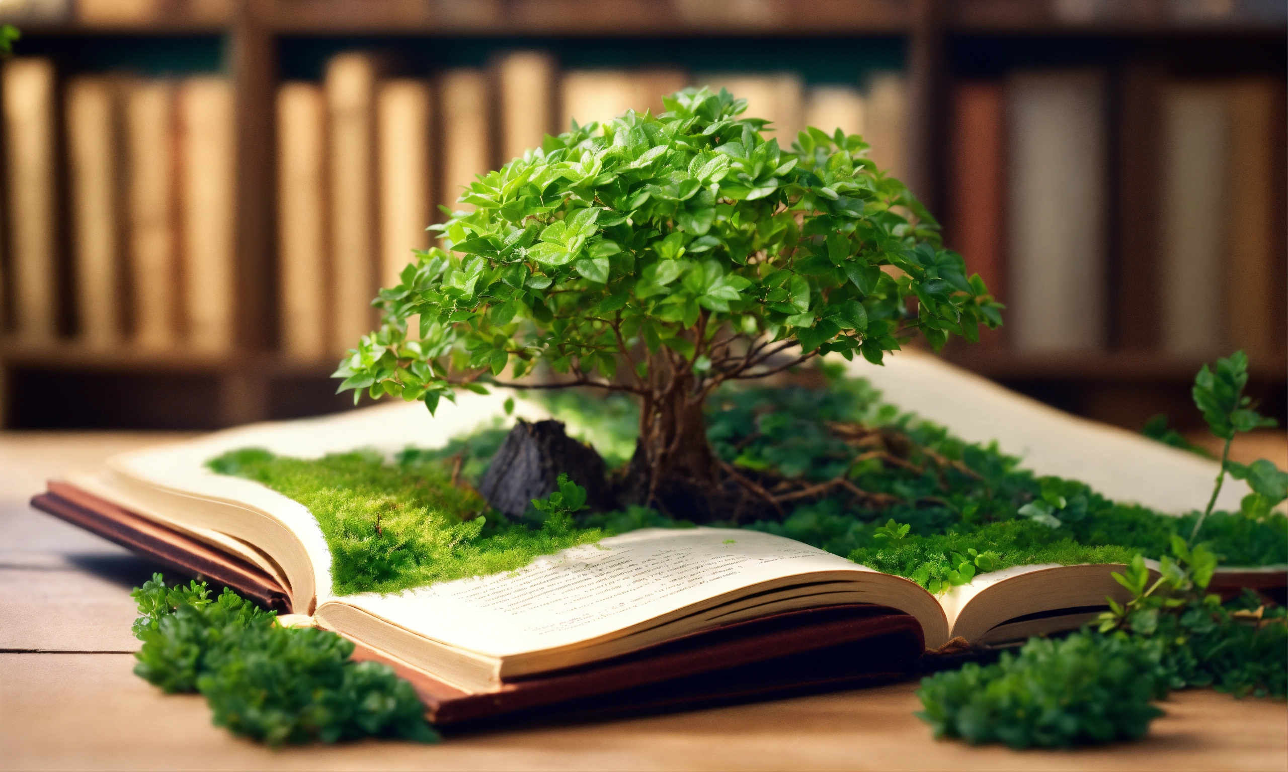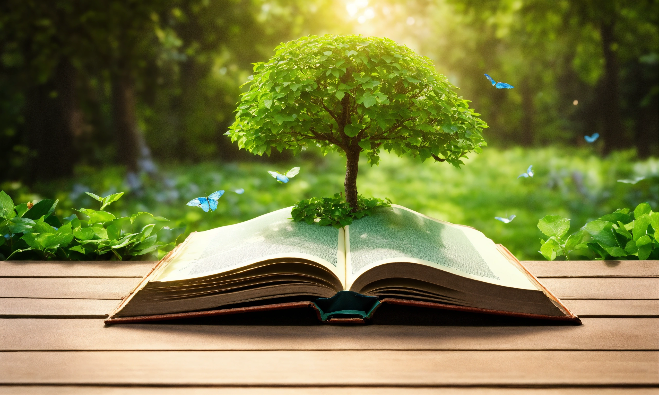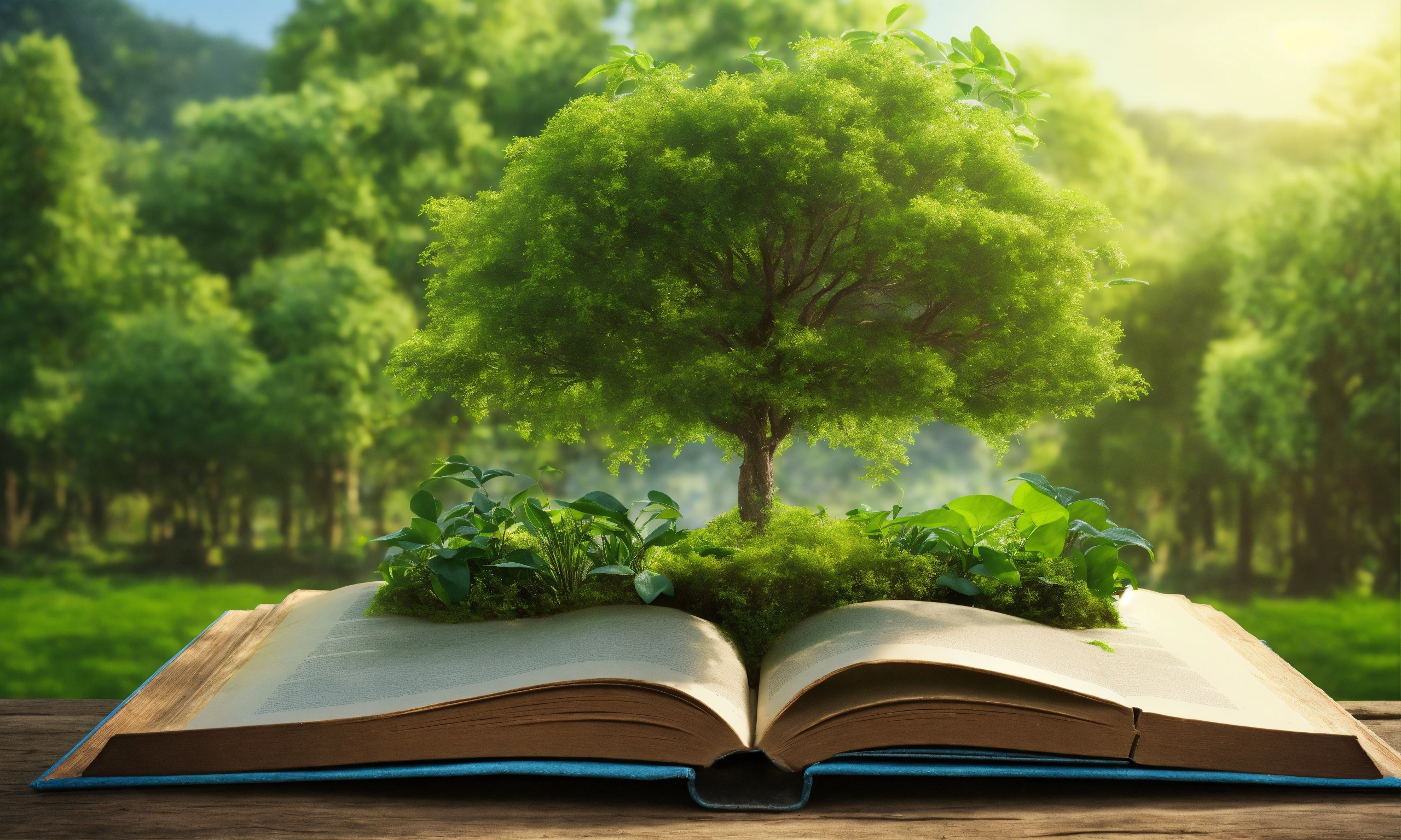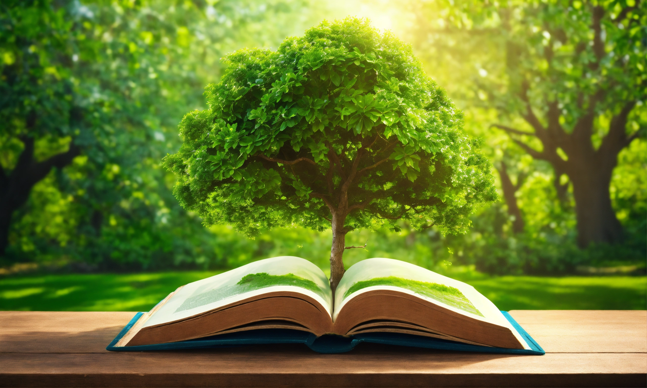 A realistic photo of an opened book from which emerges a lot of plants and a big green tree
