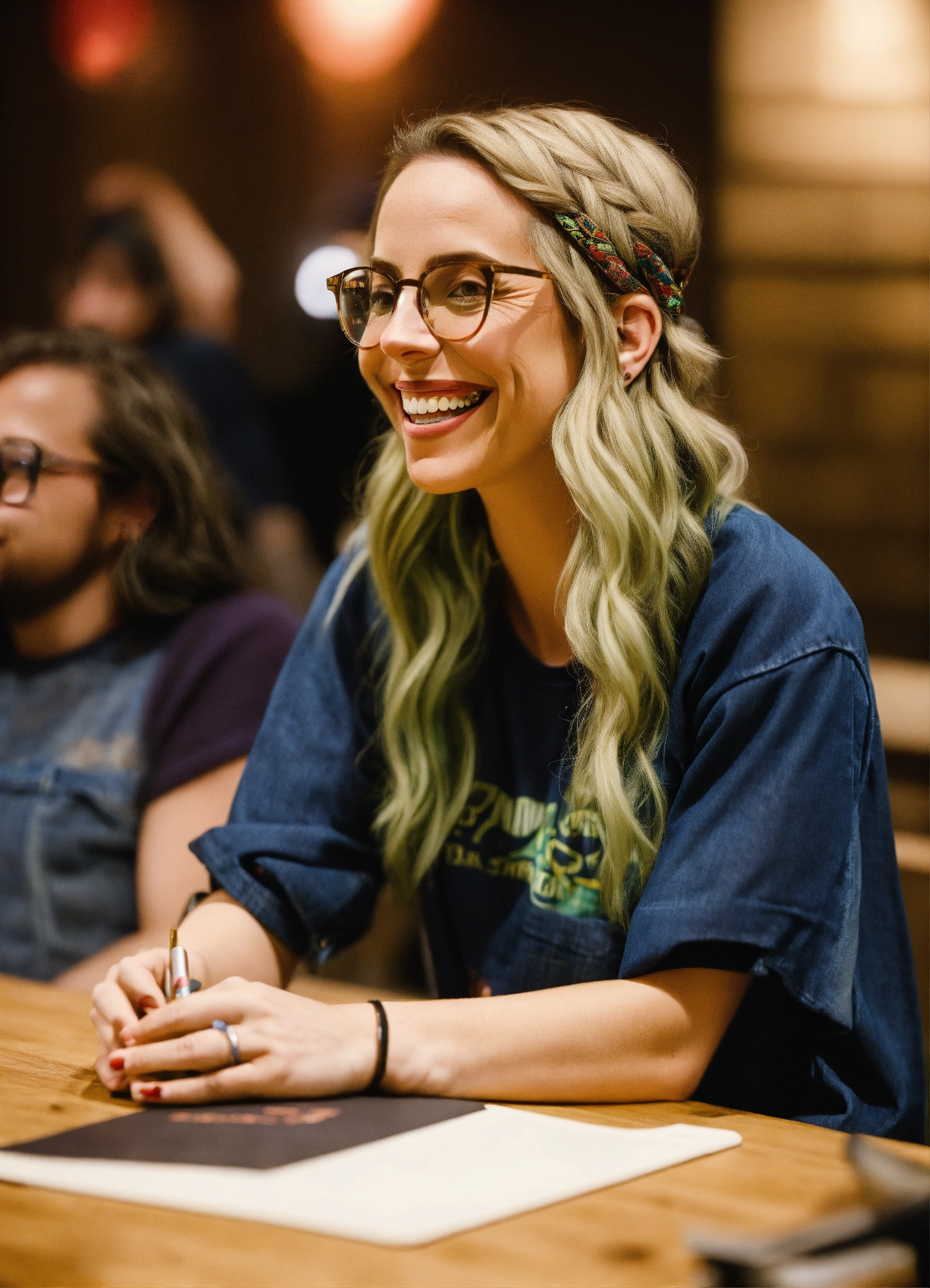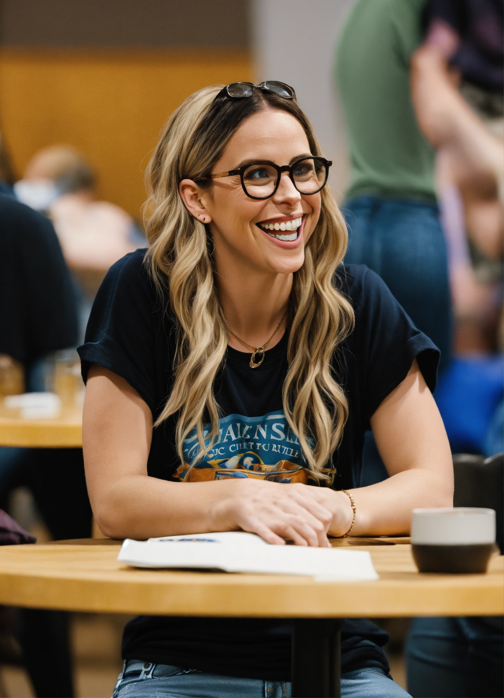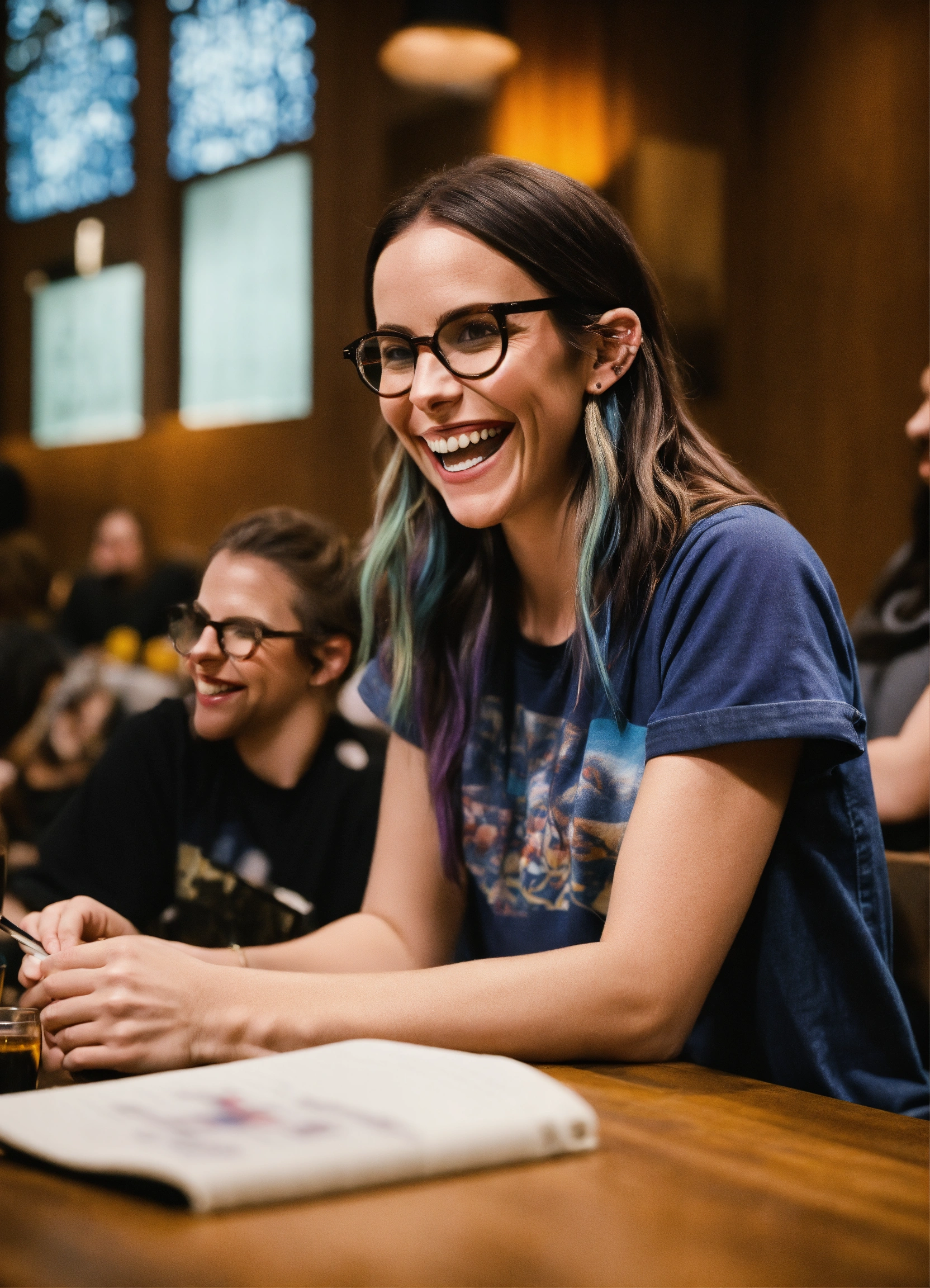 Laura bailey of critical role laughing at a table reading for critical role wearing a t-shirt and jeans and glasses