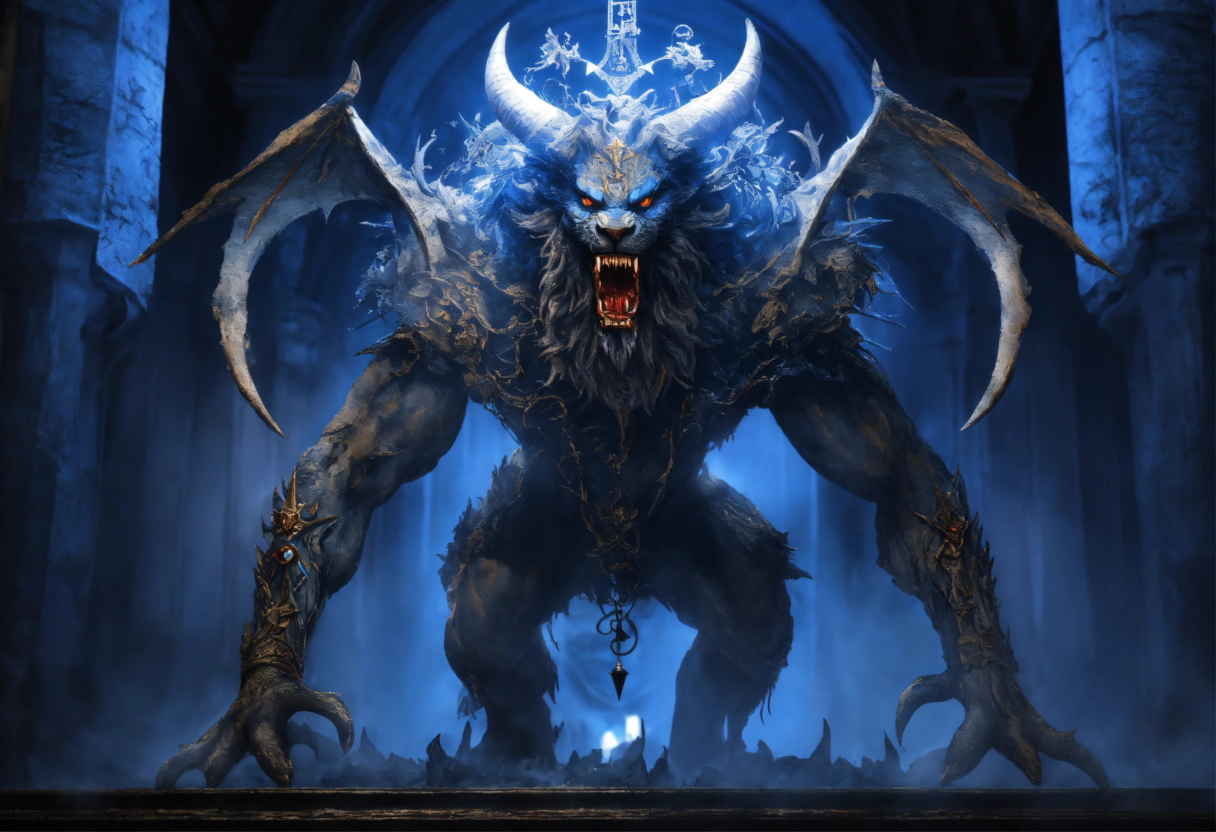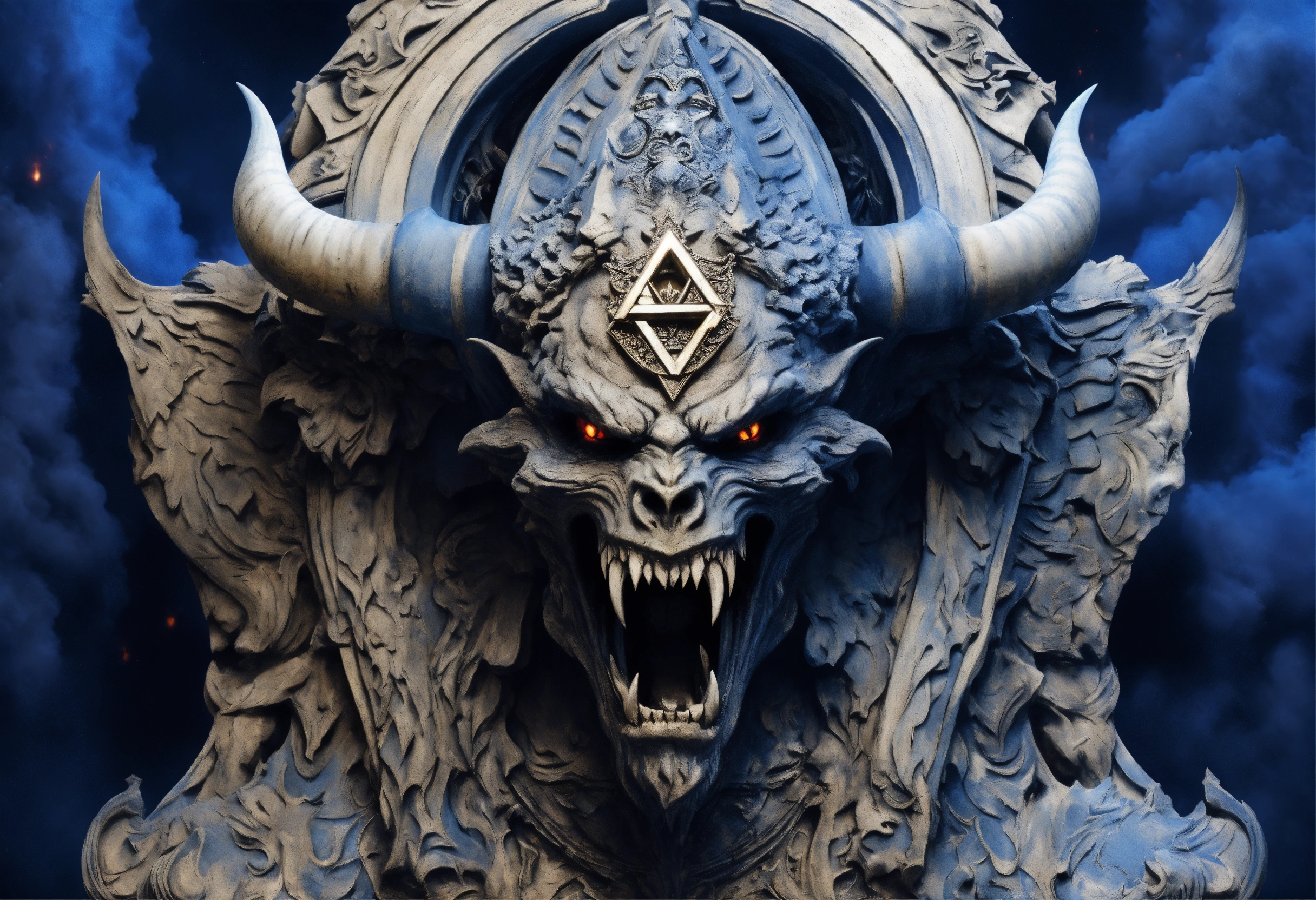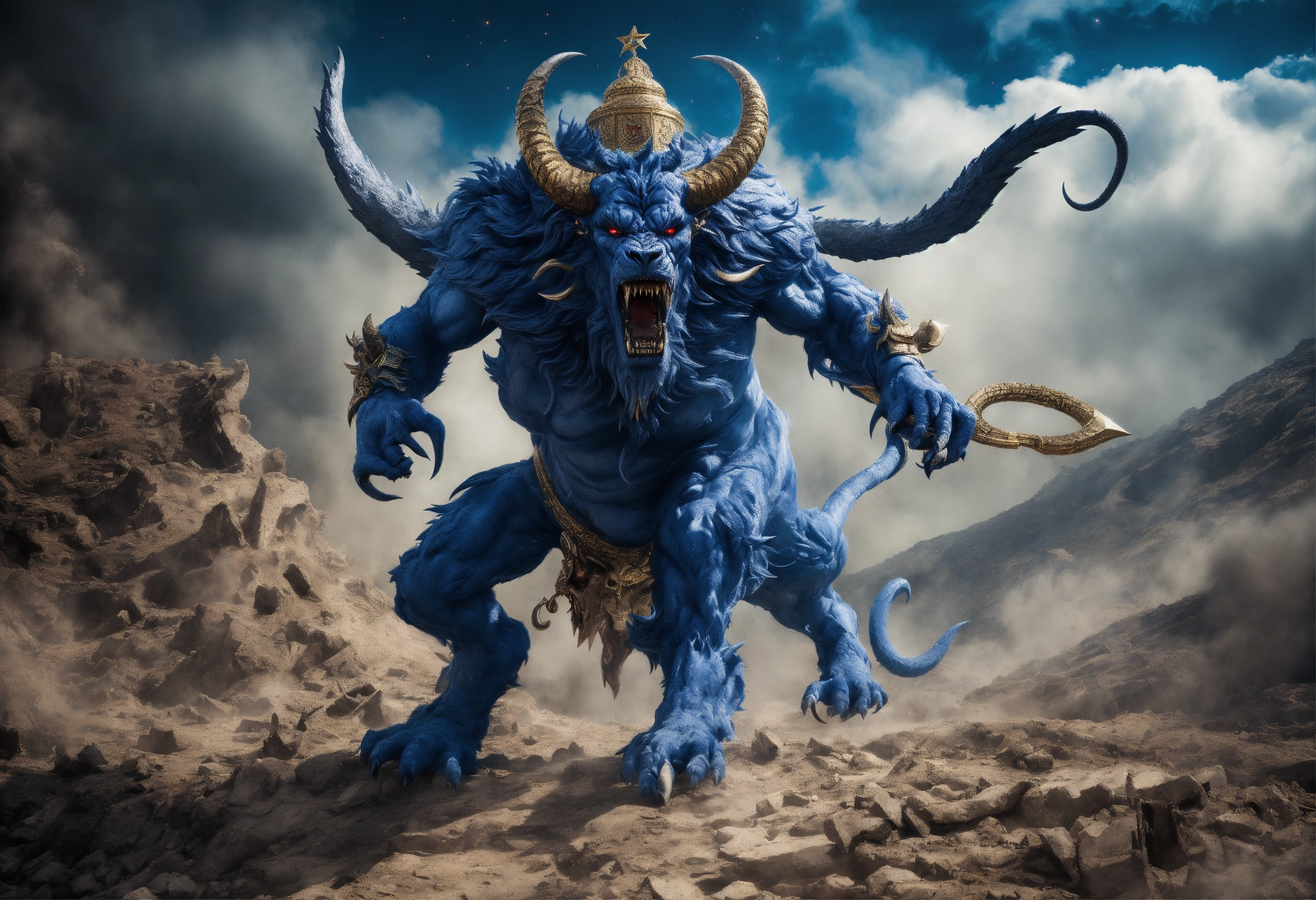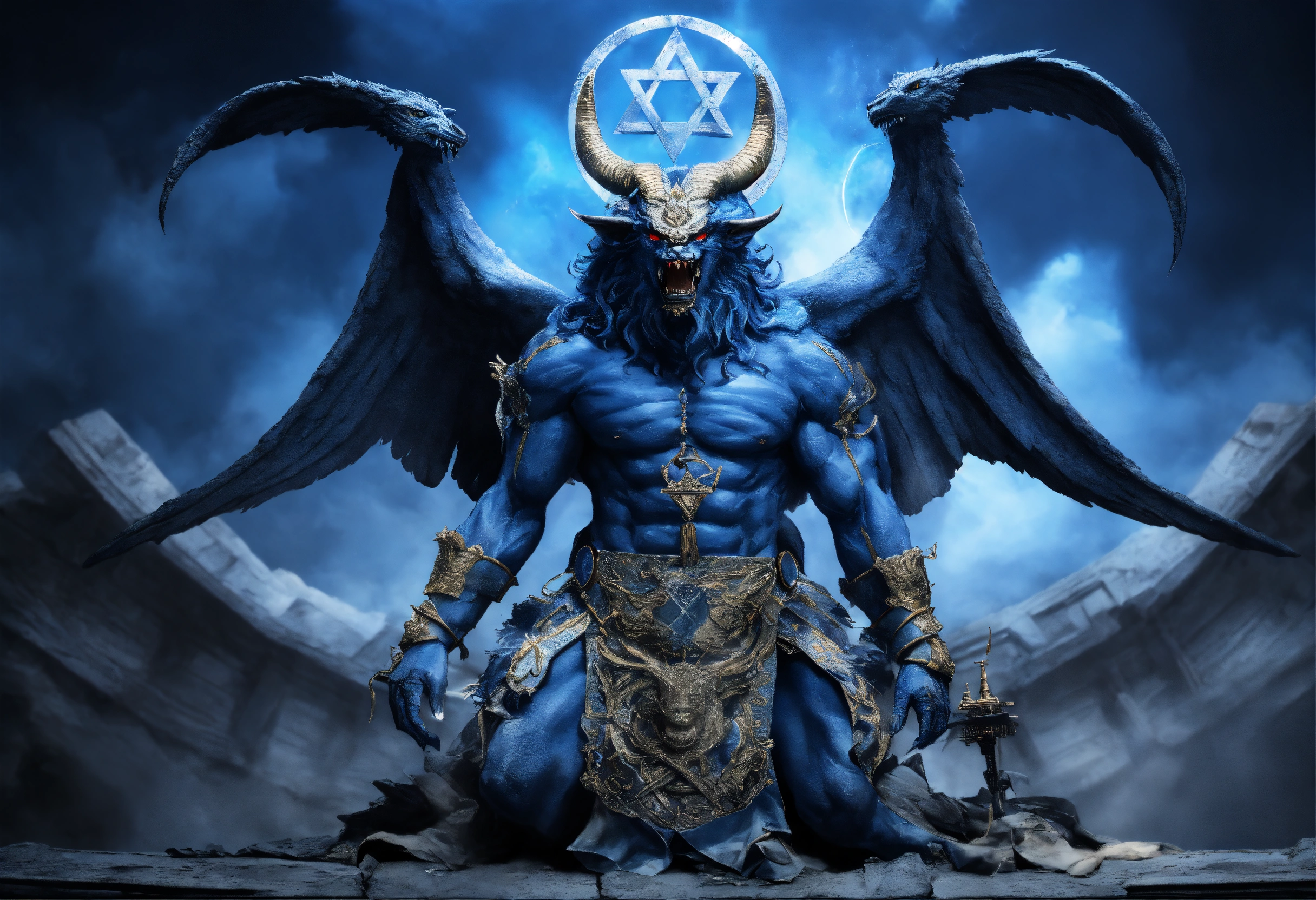 Evil demonic israel demon with an israeli flag beast with an armageddon demon, ominous, inspired by apollyon, highly detailed and realistic, extremely creative and unique, israel flag, star of david, divine inspiration, synagogue of satan, cast in blue and white and destruction, incredibly imaginative