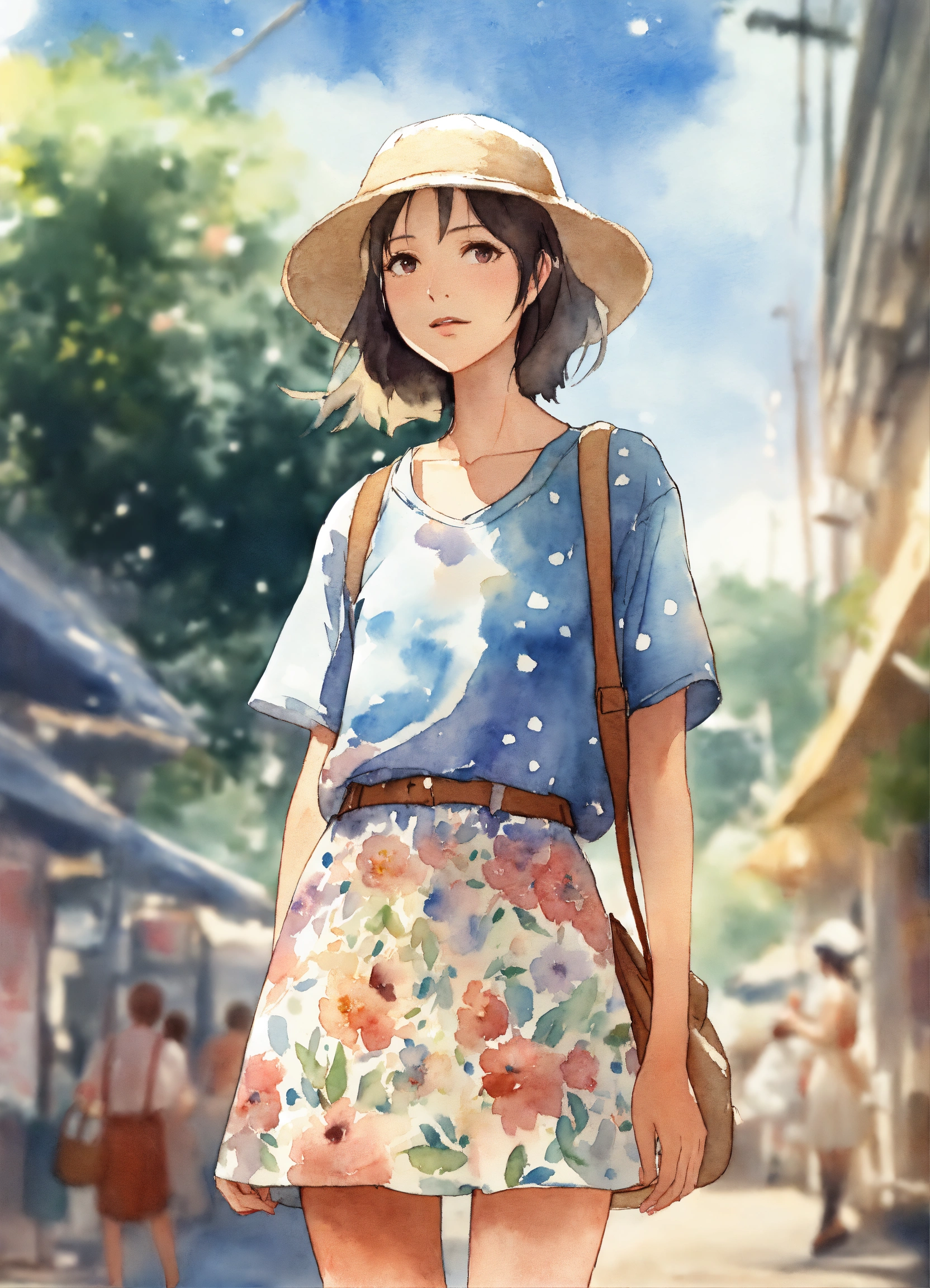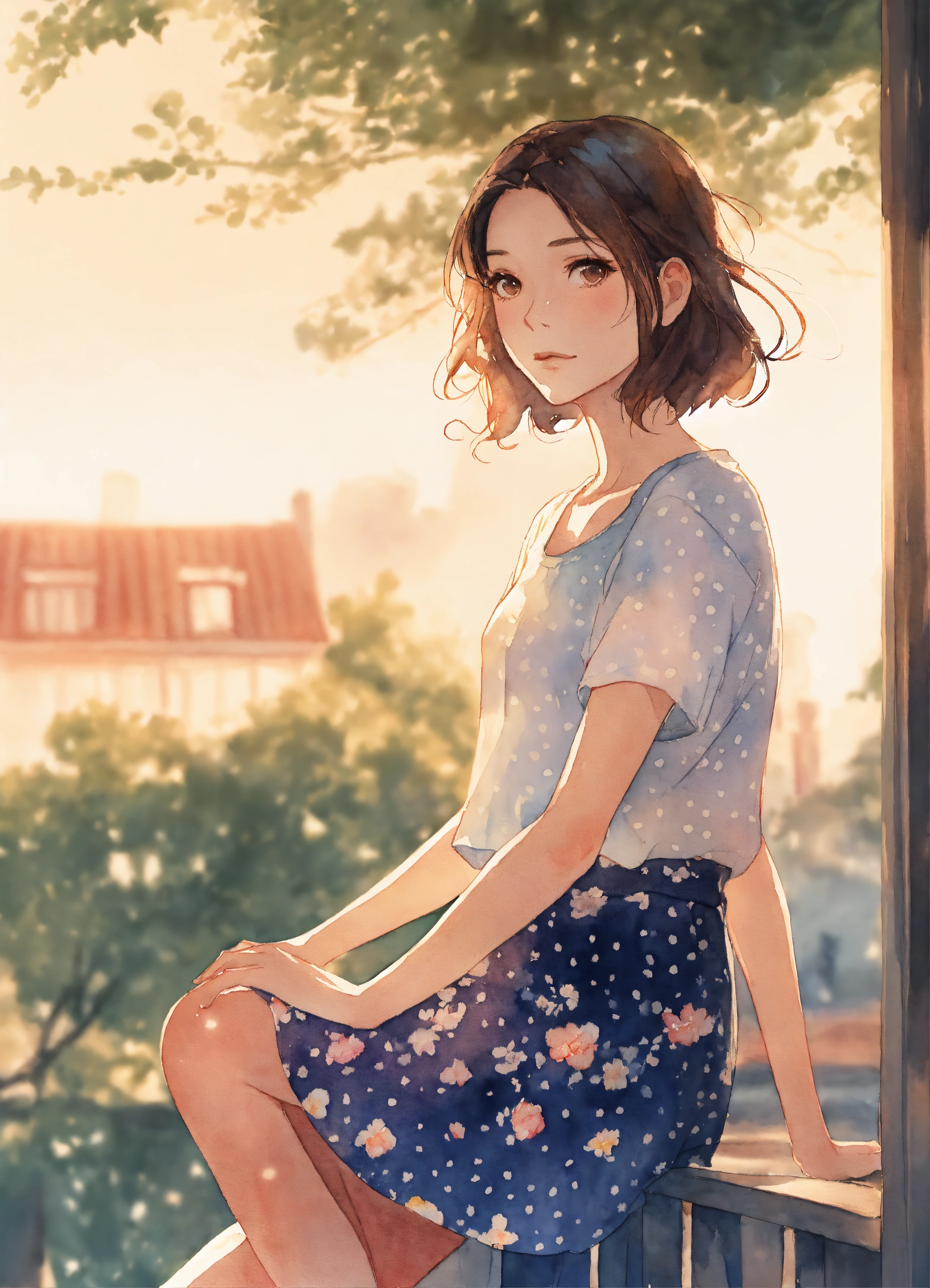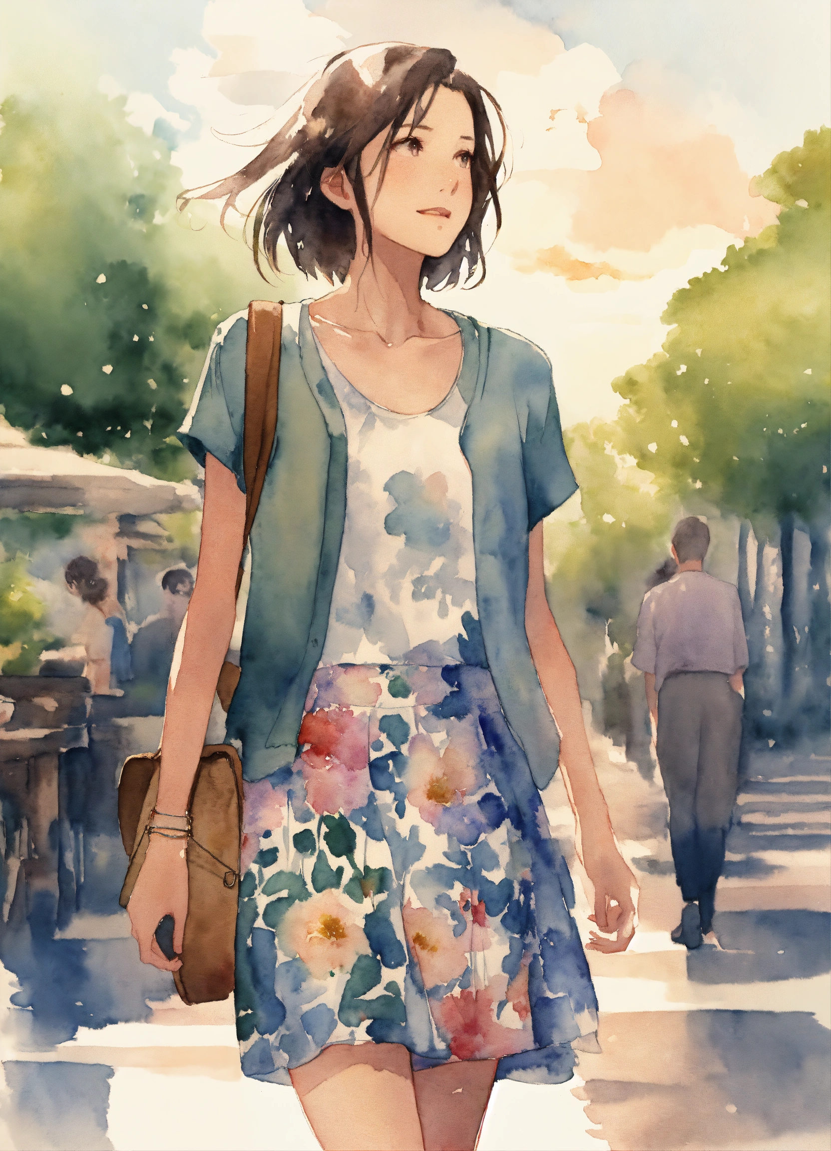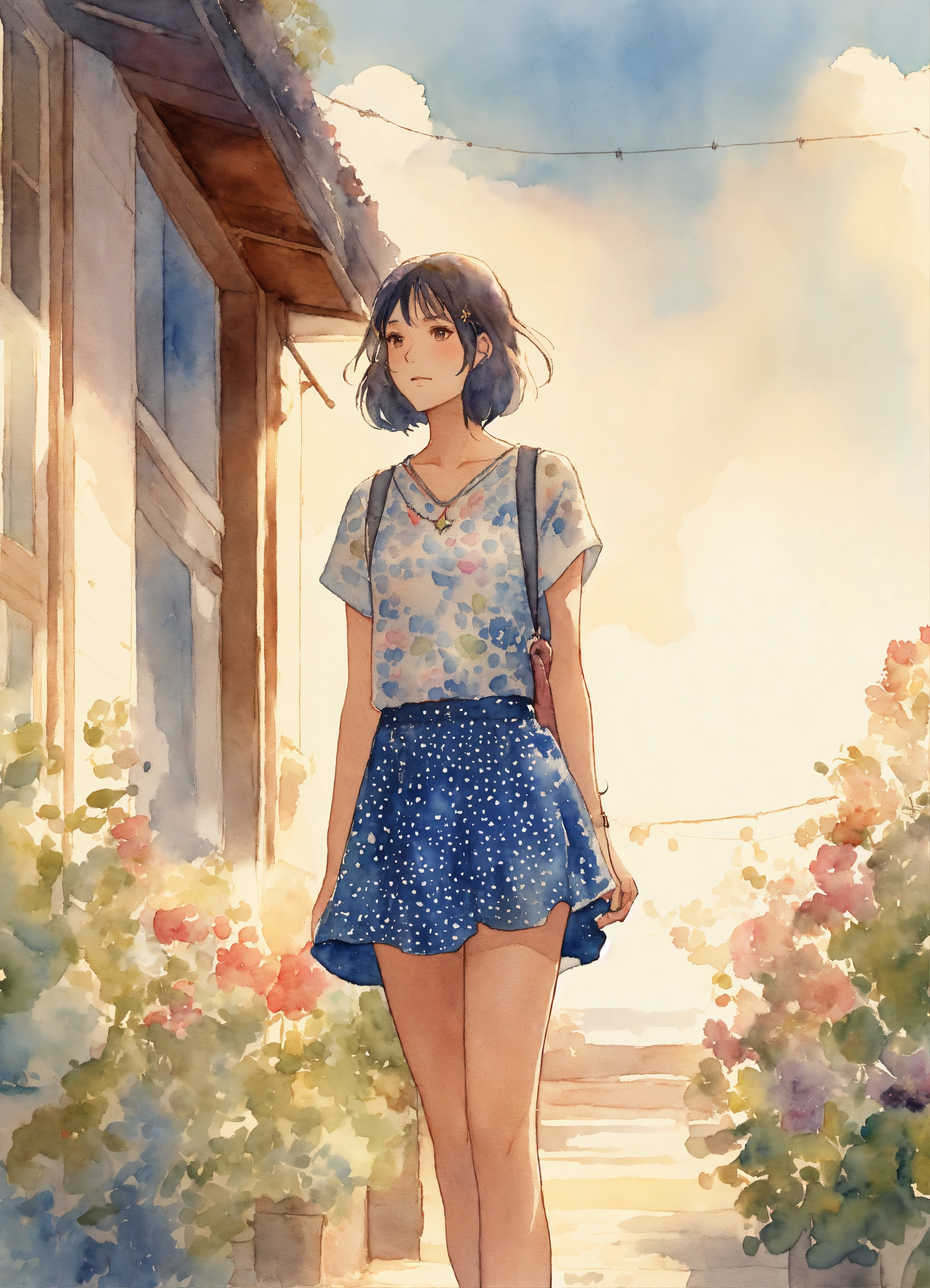Half body watercolor illustration of an 42 year woman looking to the front, wearing a boho floral short skirt and a polka dots t-shirt, comfortable, stylish, chic, no makeup, effortless, relaxed, casual, laid-back, frontal facing, beautiful light sky, low saturation, muted colors, animation, fantasy art, by makoto shinkai
