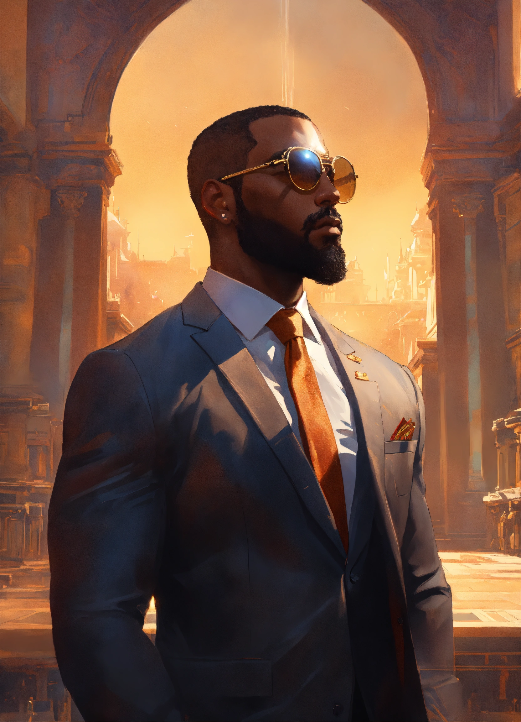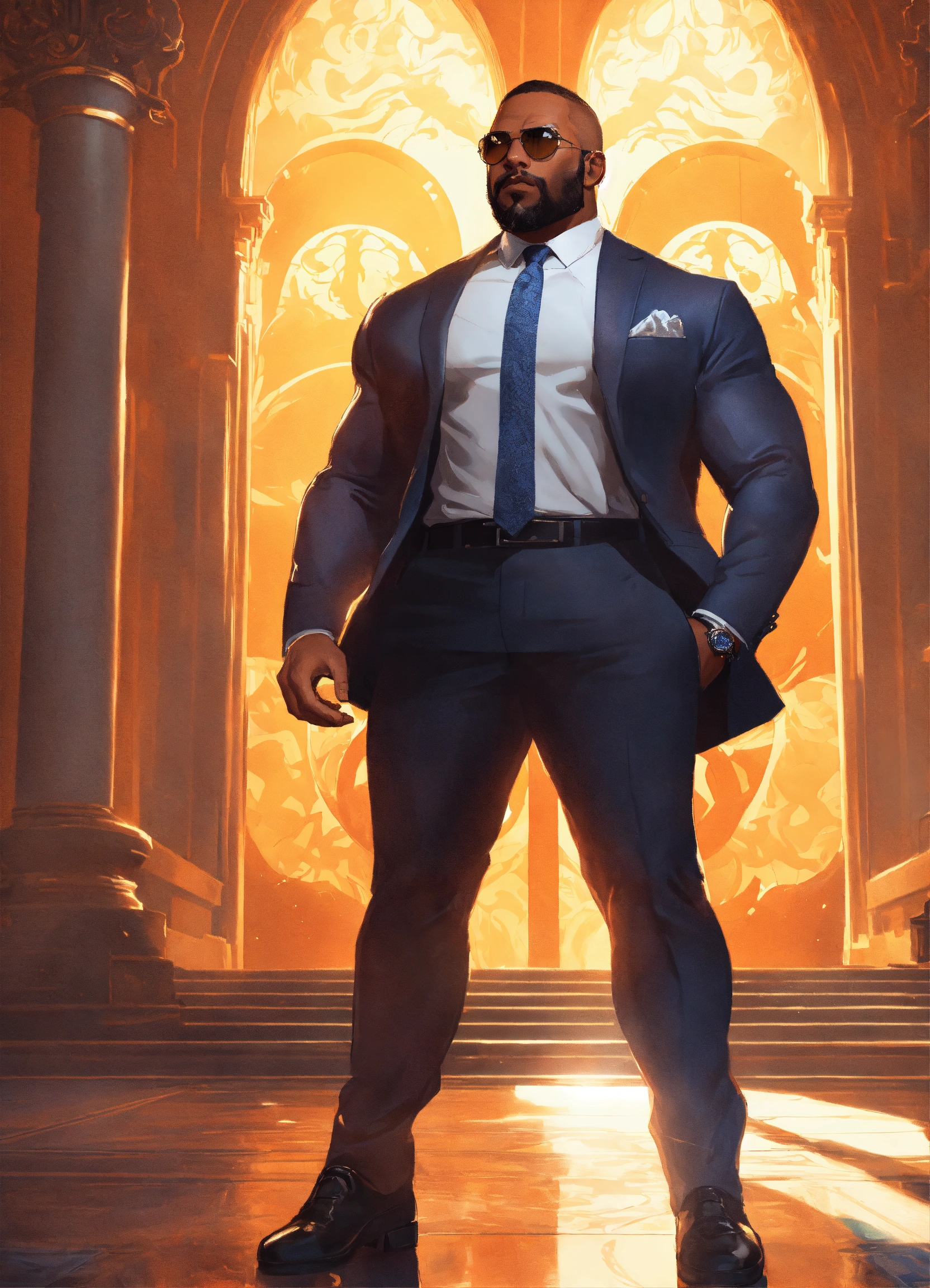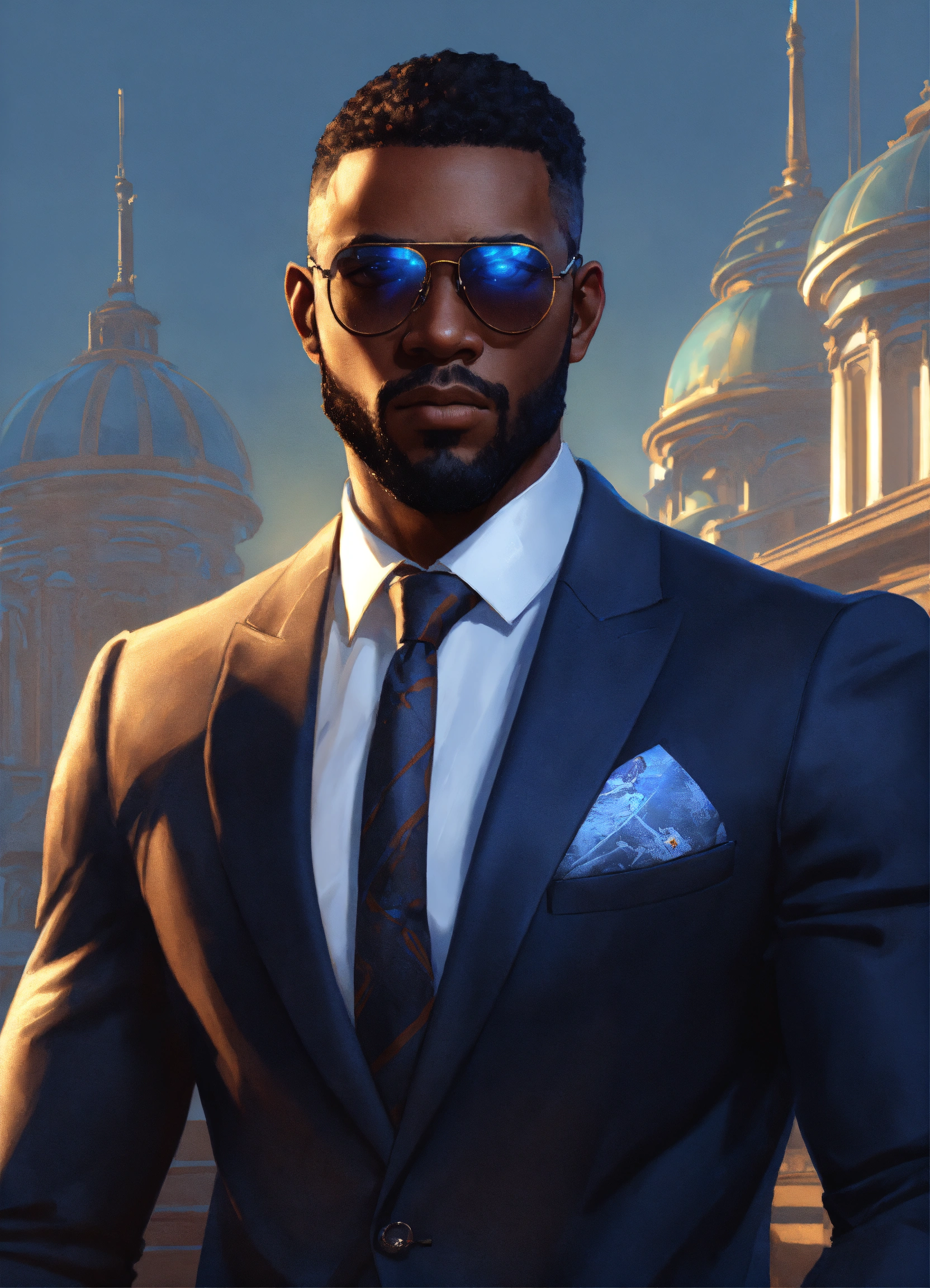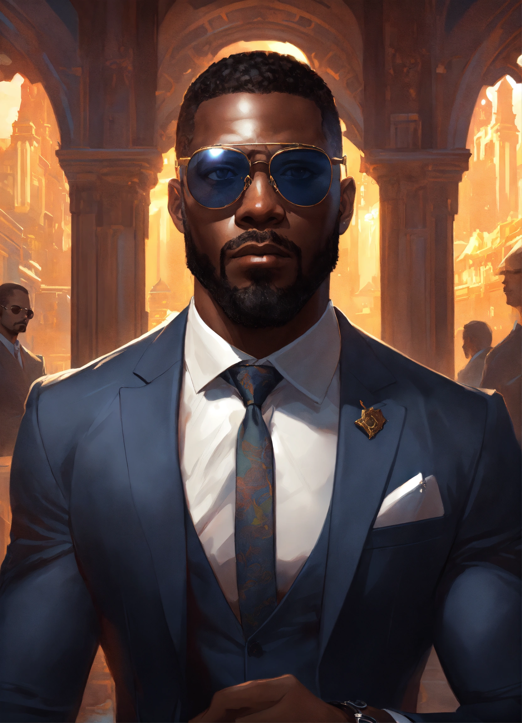 Tough black man with low hair, shadow beard, sun glasses, in suit, facing forward in a symmetrical pose, 8k resolution concept art portrait by greg rutkowski, artgerm, wlop, alphonse mucha dynamic lighting hyperdetailed intricately detailed splash art trending on artstation unreal engine 5 volumetric lighting, with castle background