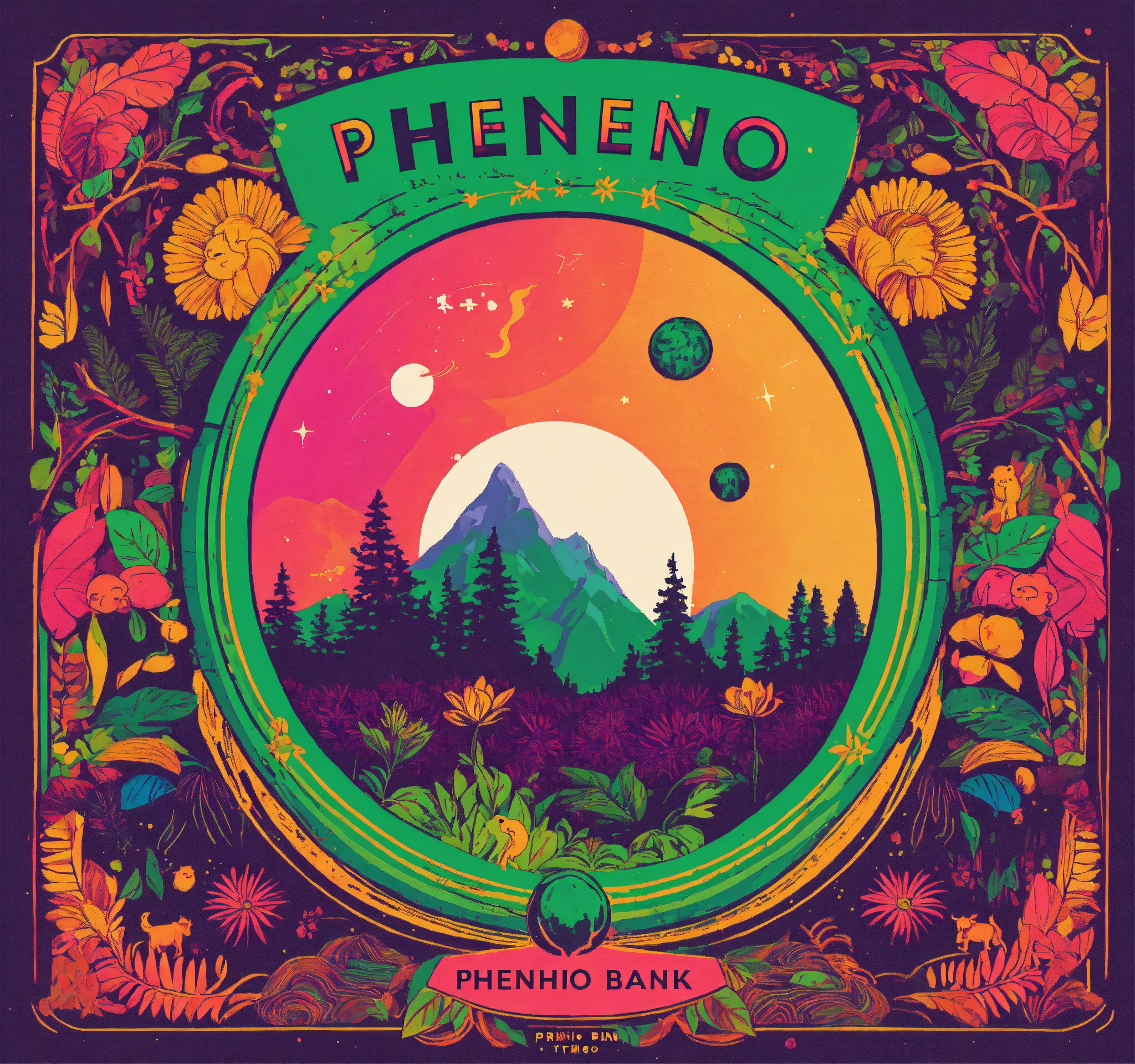 Logo of a seed store with the name pheno bank. minimalist, psychedelic, stylized according to modern logo design trends. tporical forests, monkeys, rabbits, space stars, rainforest, mandala designs.