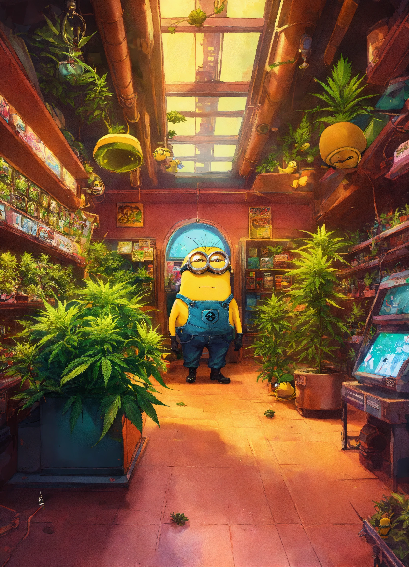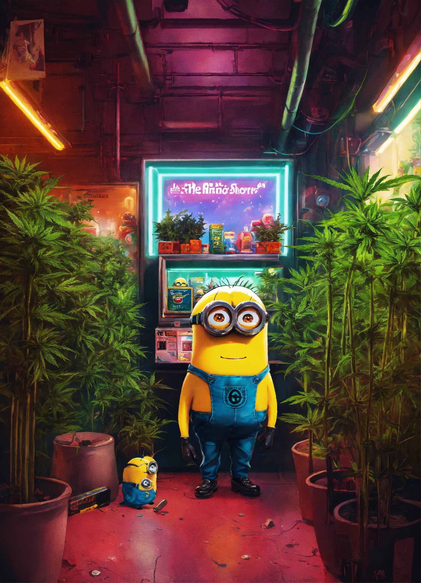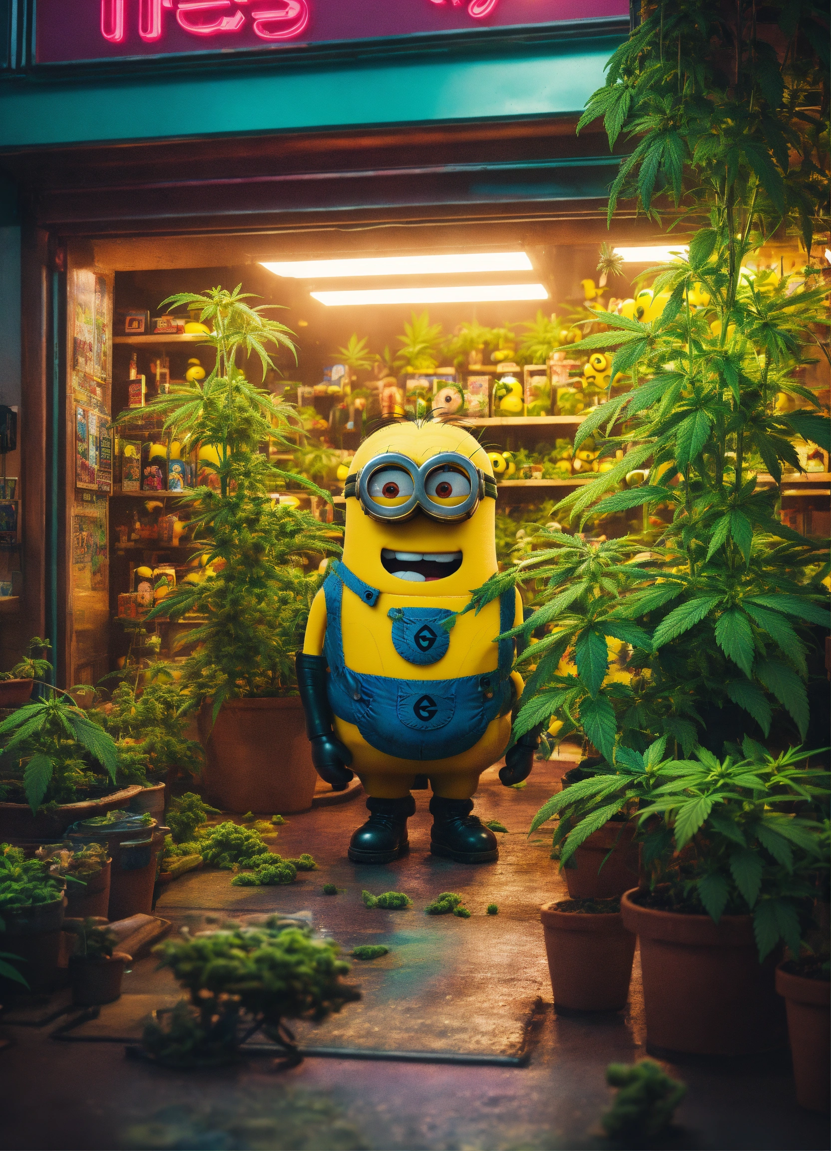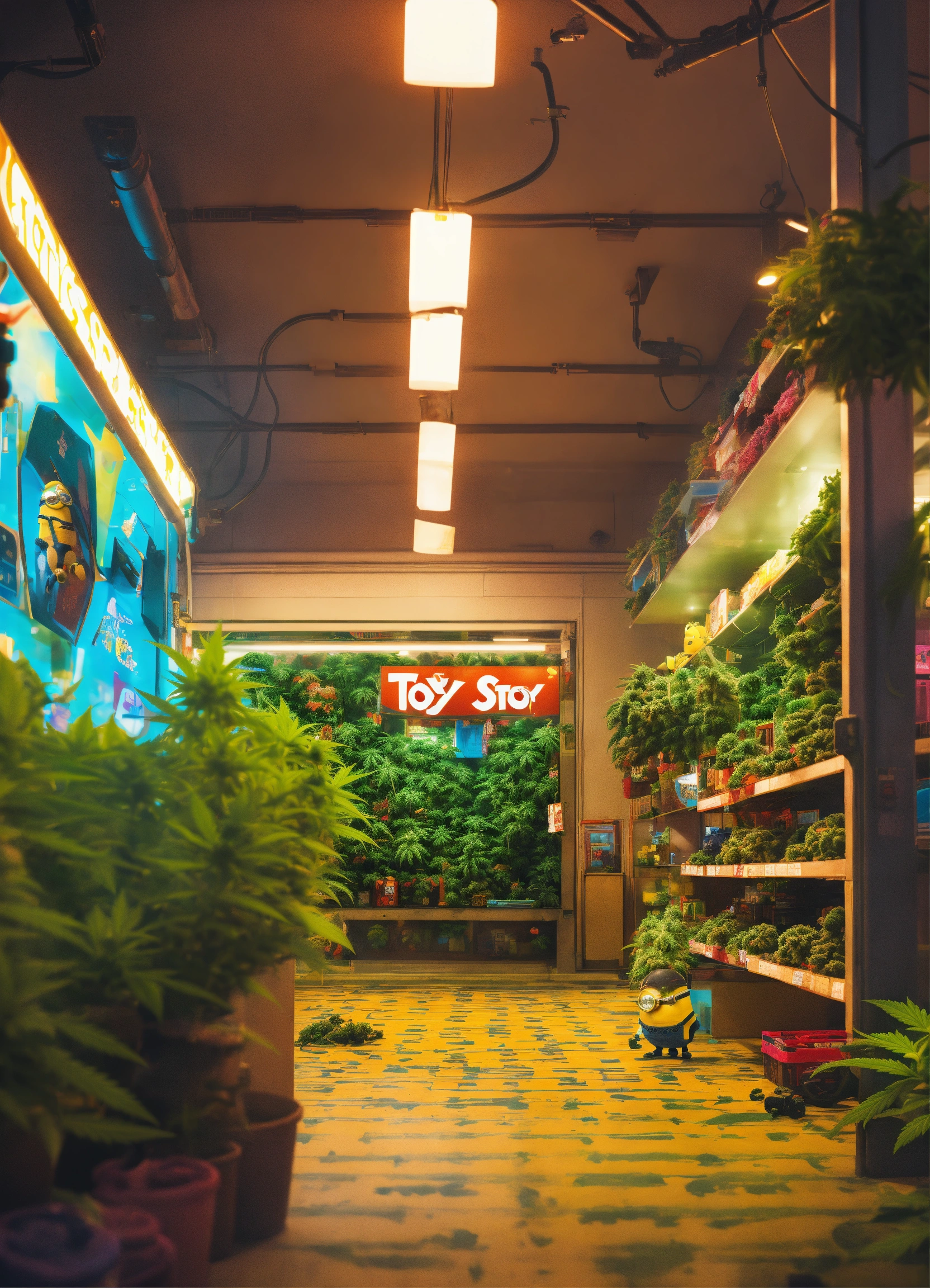 Cyberpunk advertising poster of "the toy store" surrounded by cannabis plants and minion inside