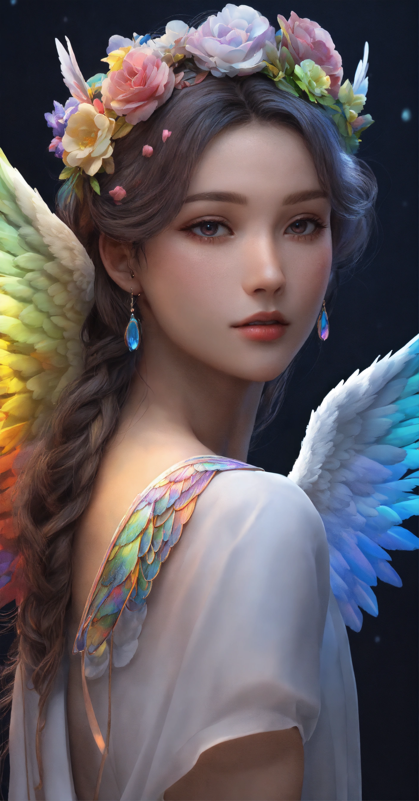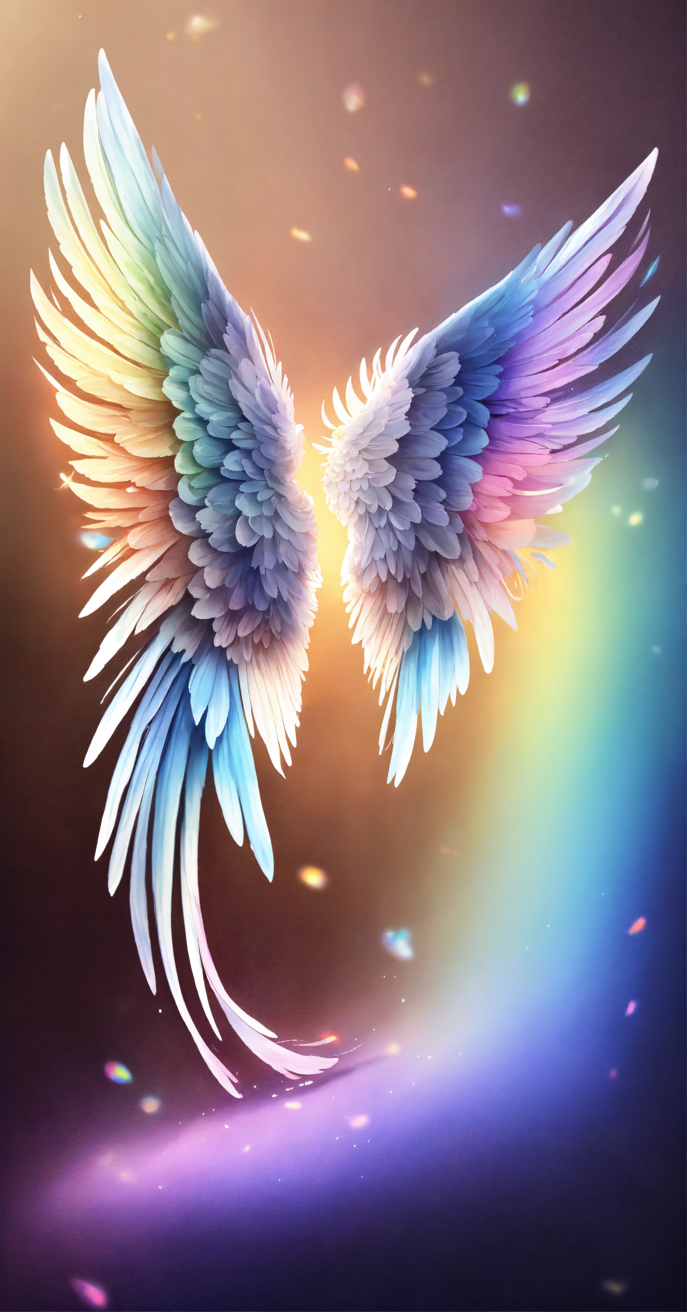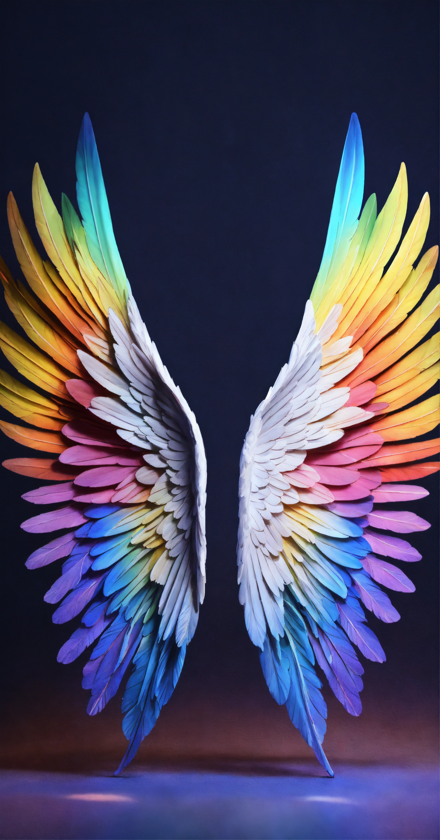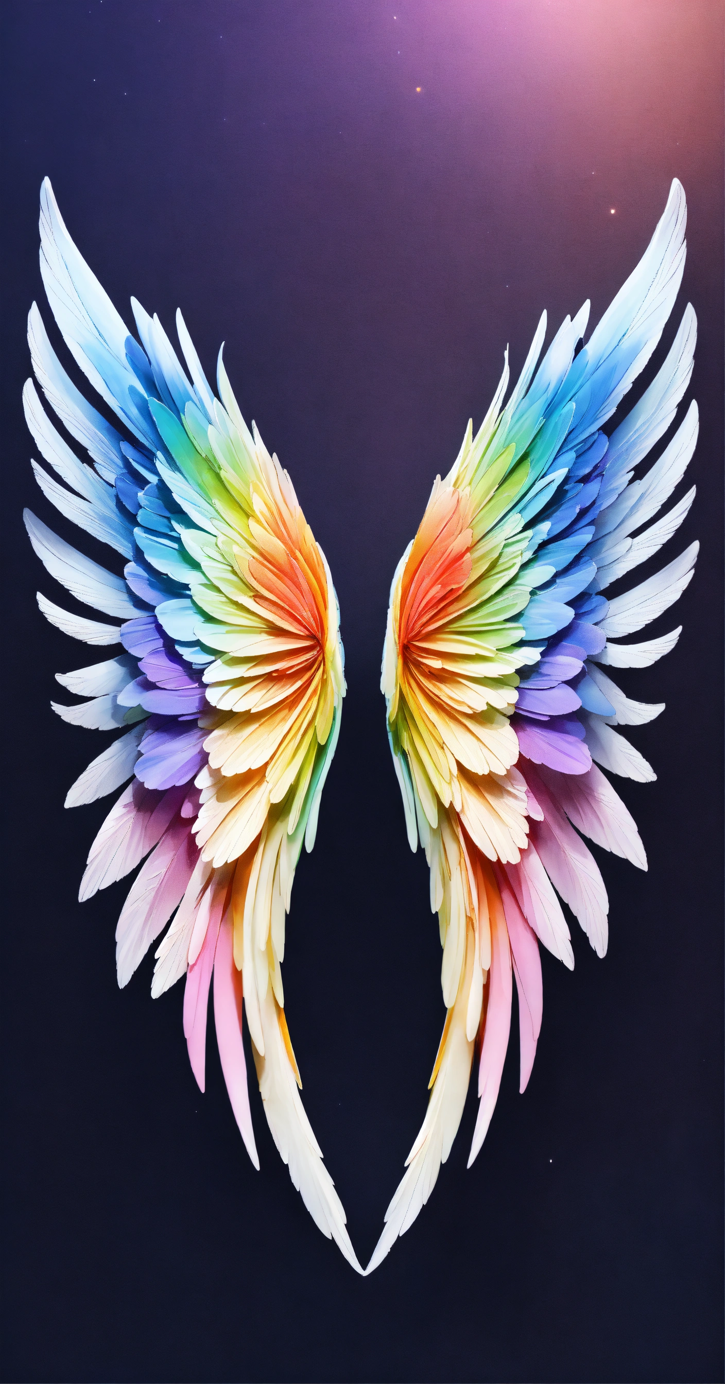 Beautiful and perfect small angel wings in soft rainbow colors, detailed and defined and at the same time some white details. just a pair of small full soft rainbow colored wings and some white details. hyper-detailed and hyper-realistic wings. small wings with slight decoration in soft rainbow tones and white details. small wings complete both the right wing and the left wing, the background is dark blue, 3d, masterpiece. hd. realism. high resolution. high quality. digital art. 8k
