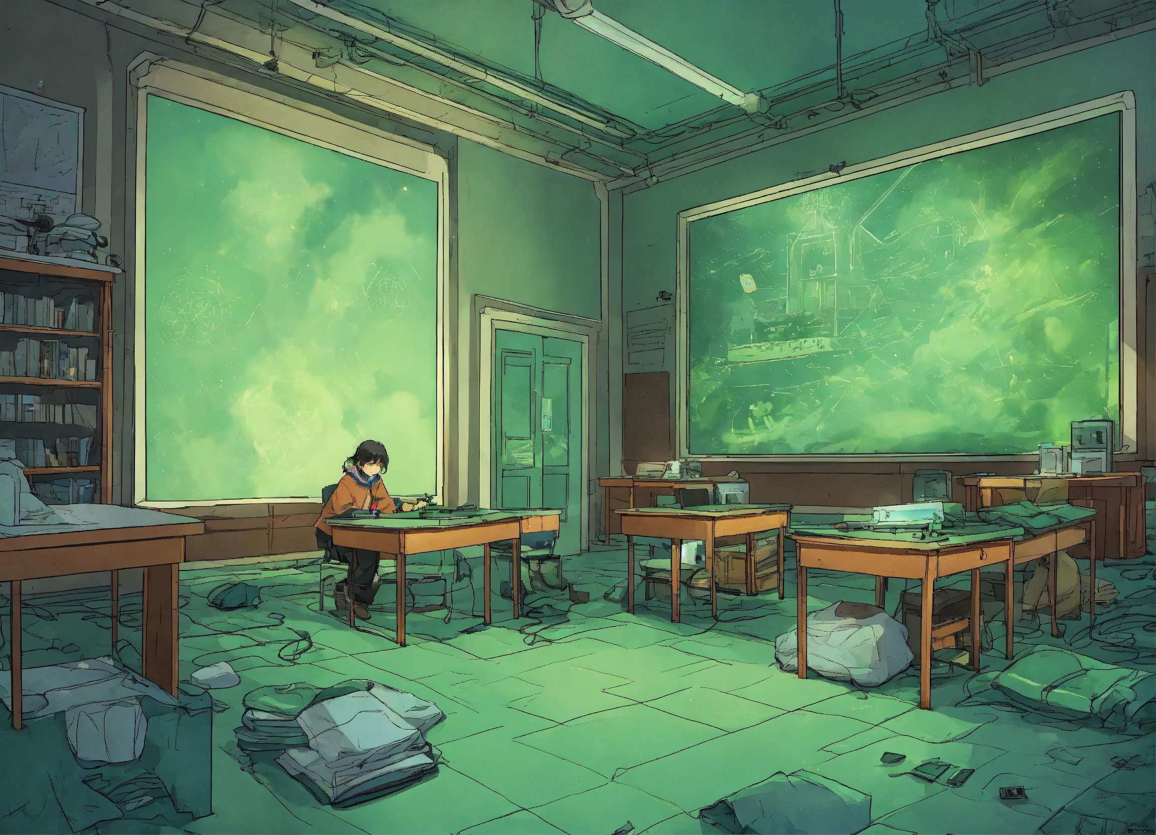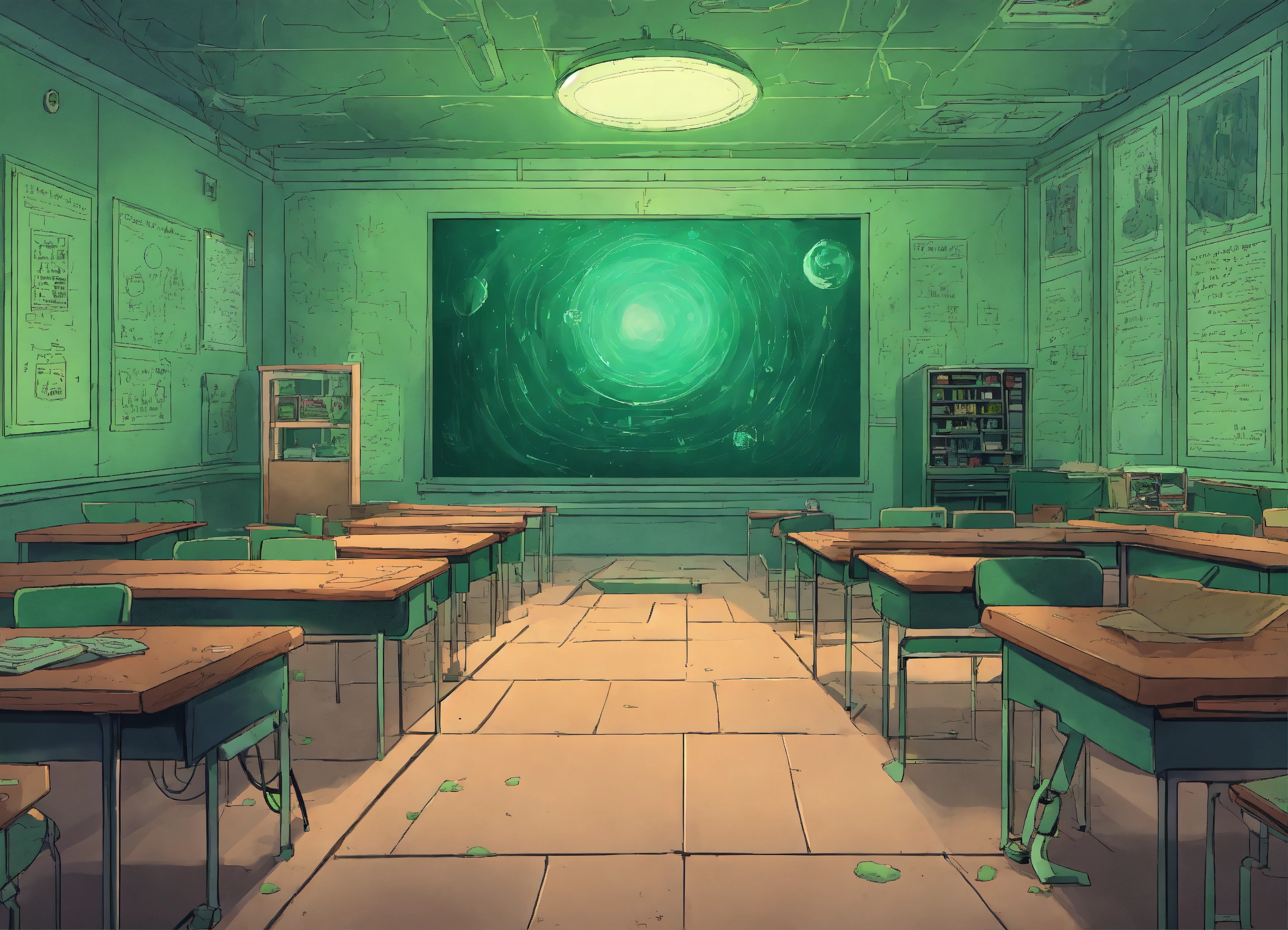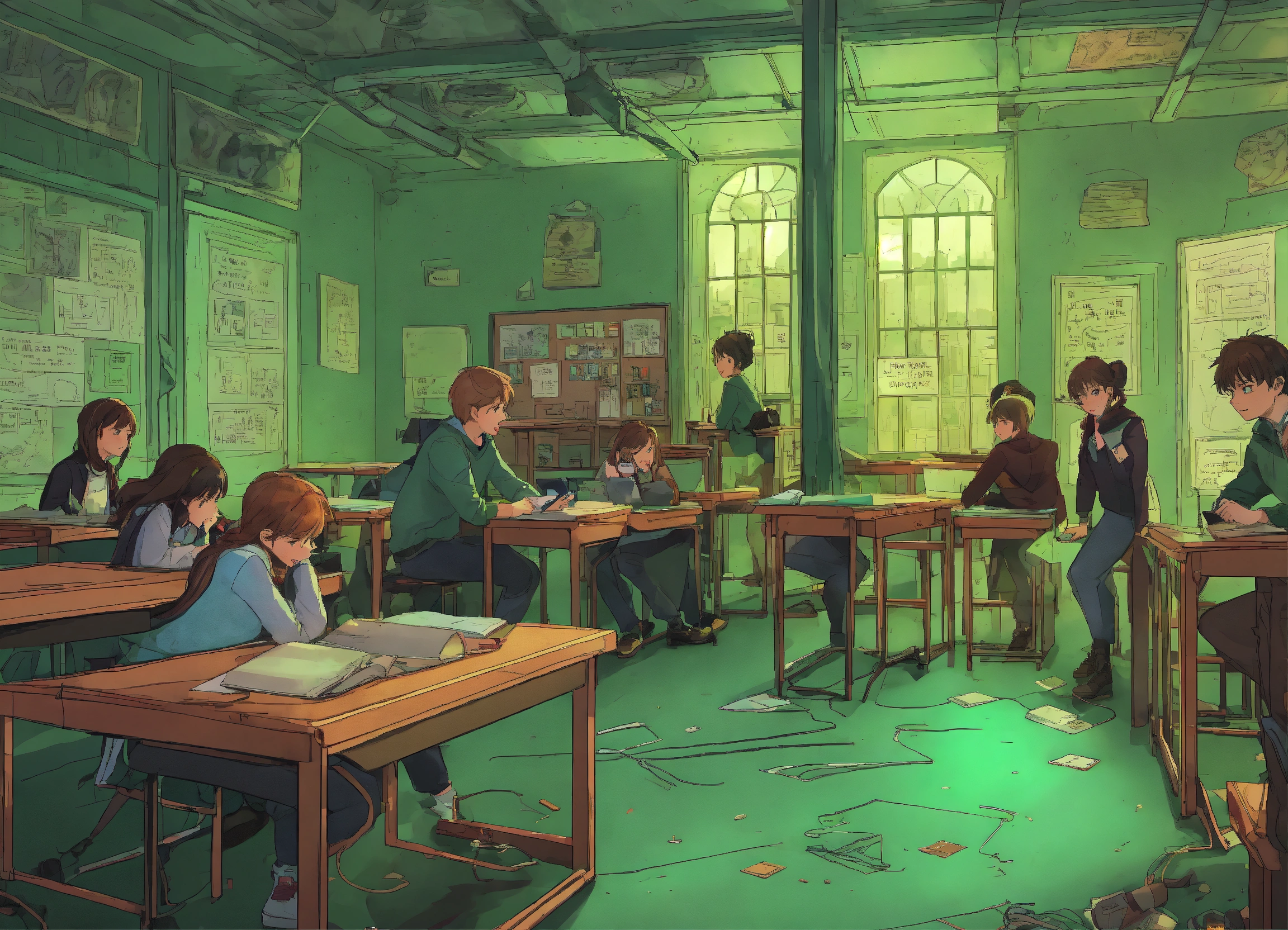 Craft a comic cartoon poster that illustrates a classroom frozen in time, where students are stuck in a loop, their movements slow and robotic as they interact with their phones. the atmosphere is heavy with a green haze, the blackened classroom a tomb of lost interactions and mindless scrolling