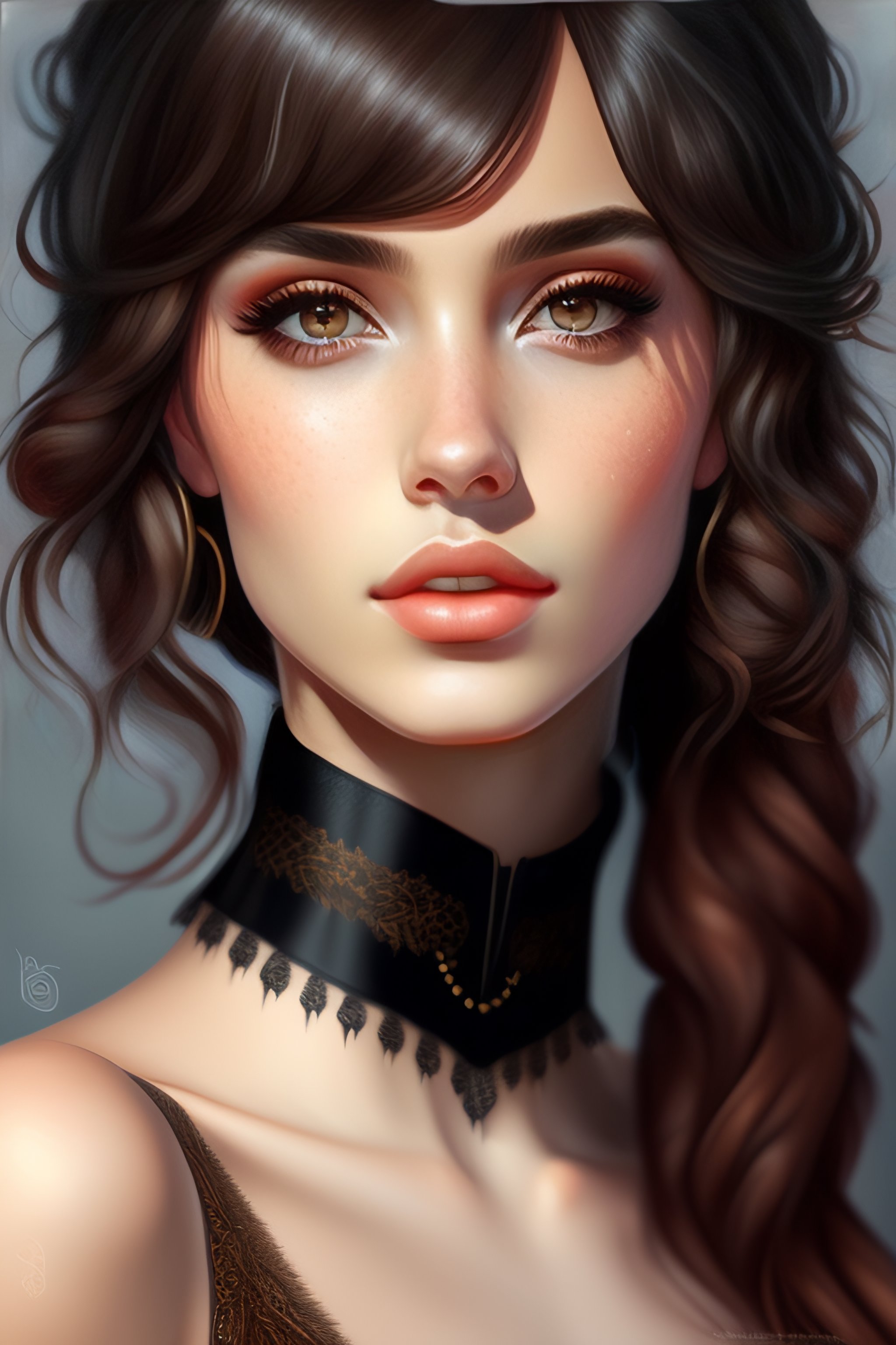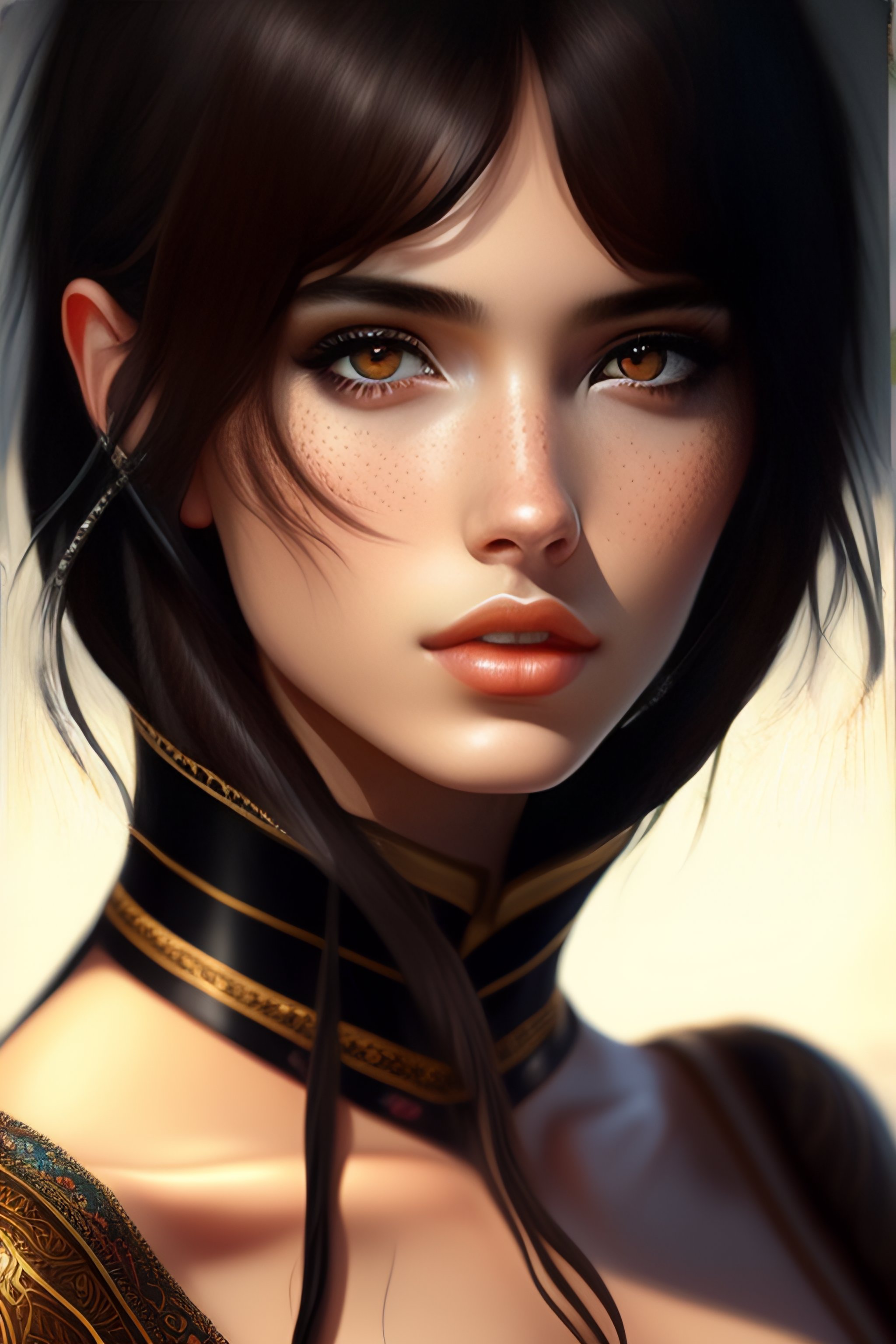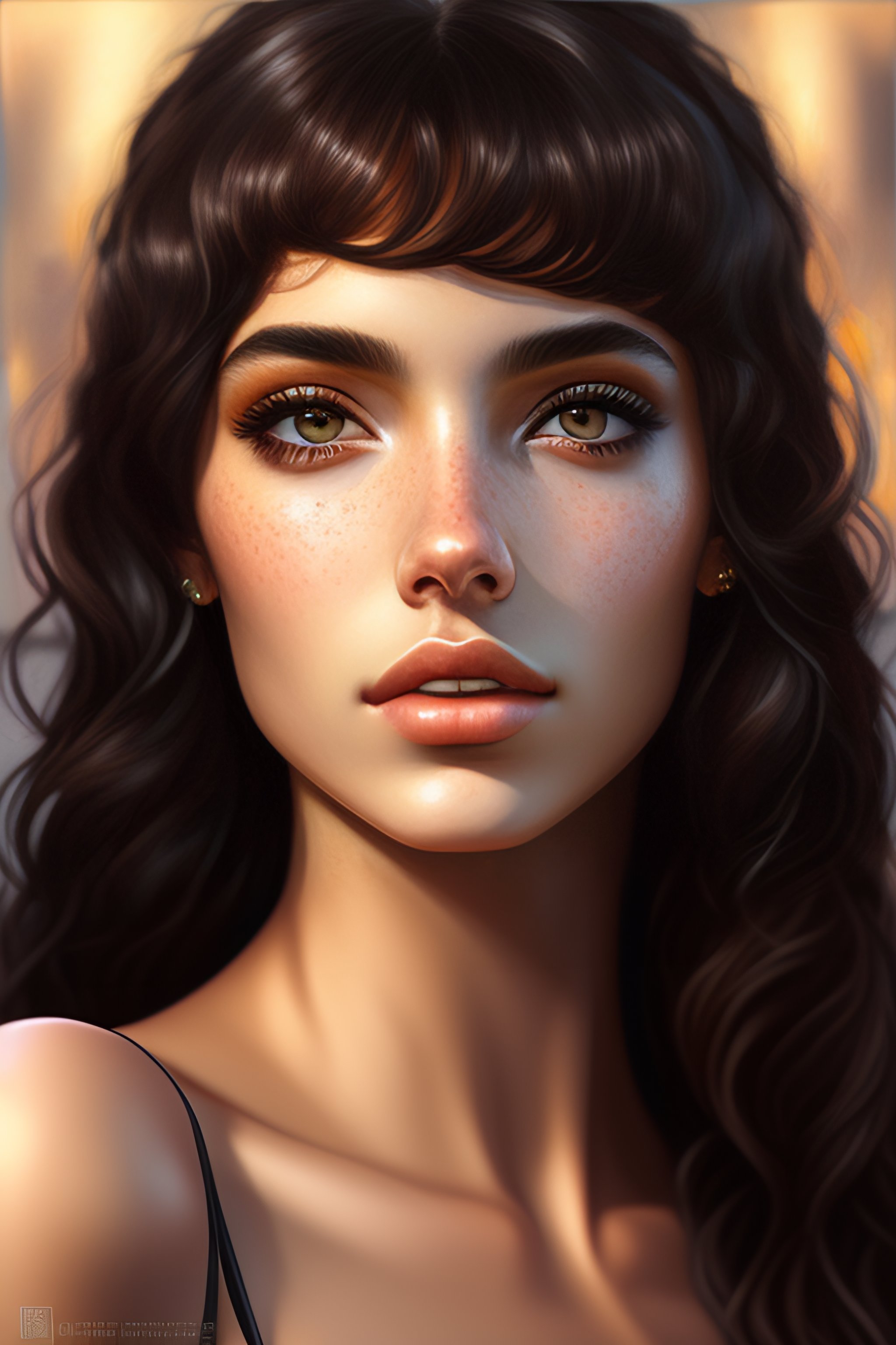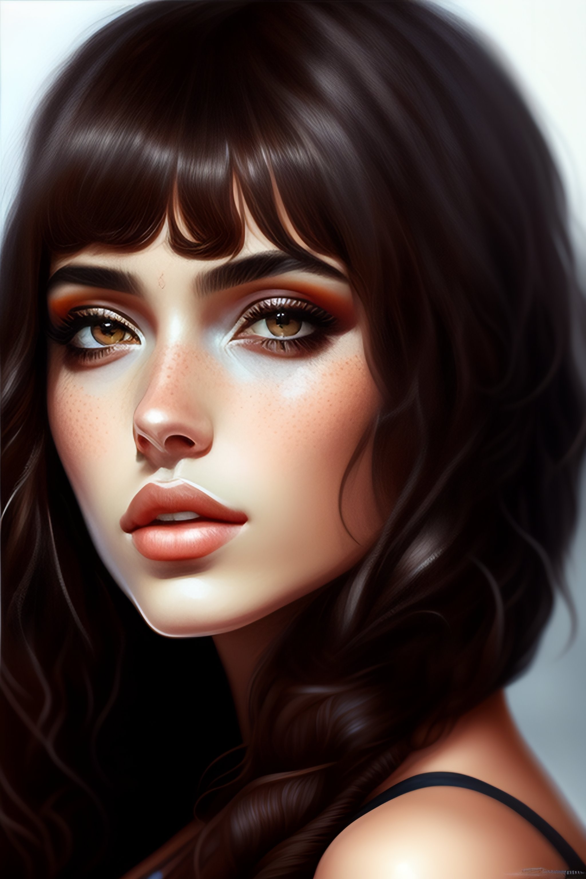 Spanish, e-girl, bangs, black hair, brown eyes, beautiful eyes, beautiful lips, gothic, slim, freckles, 8k, high detail, highly detailed, digital painting