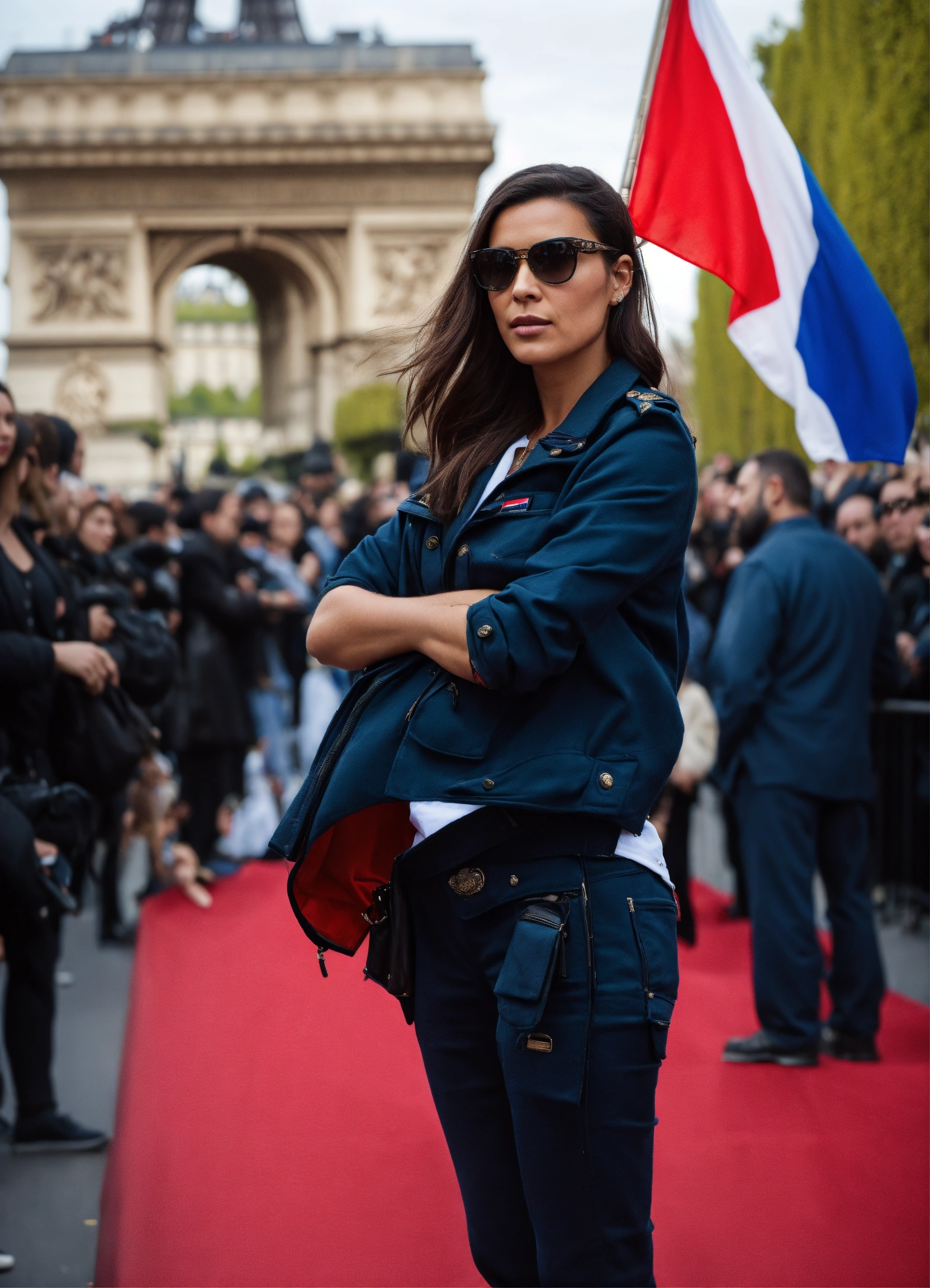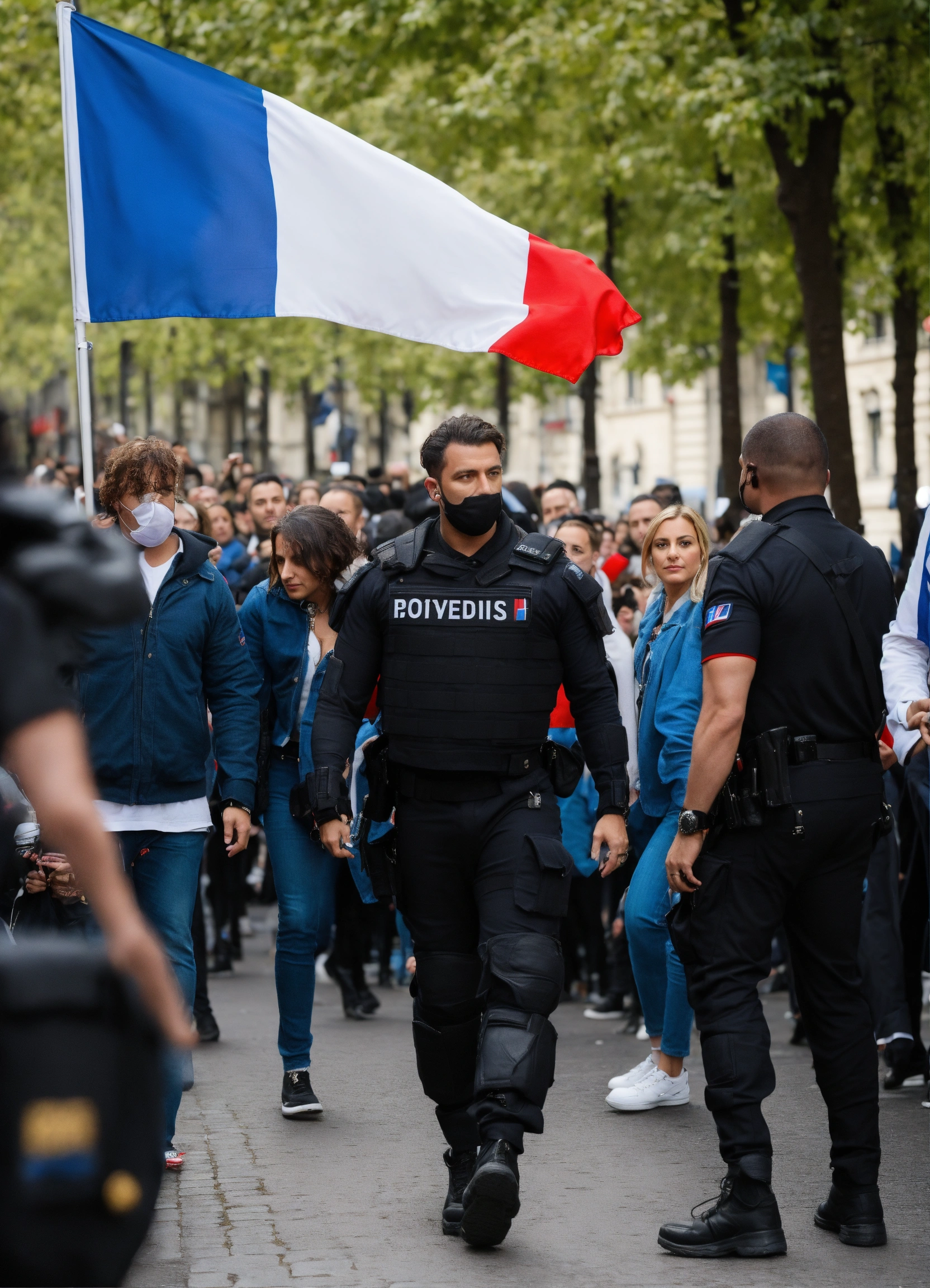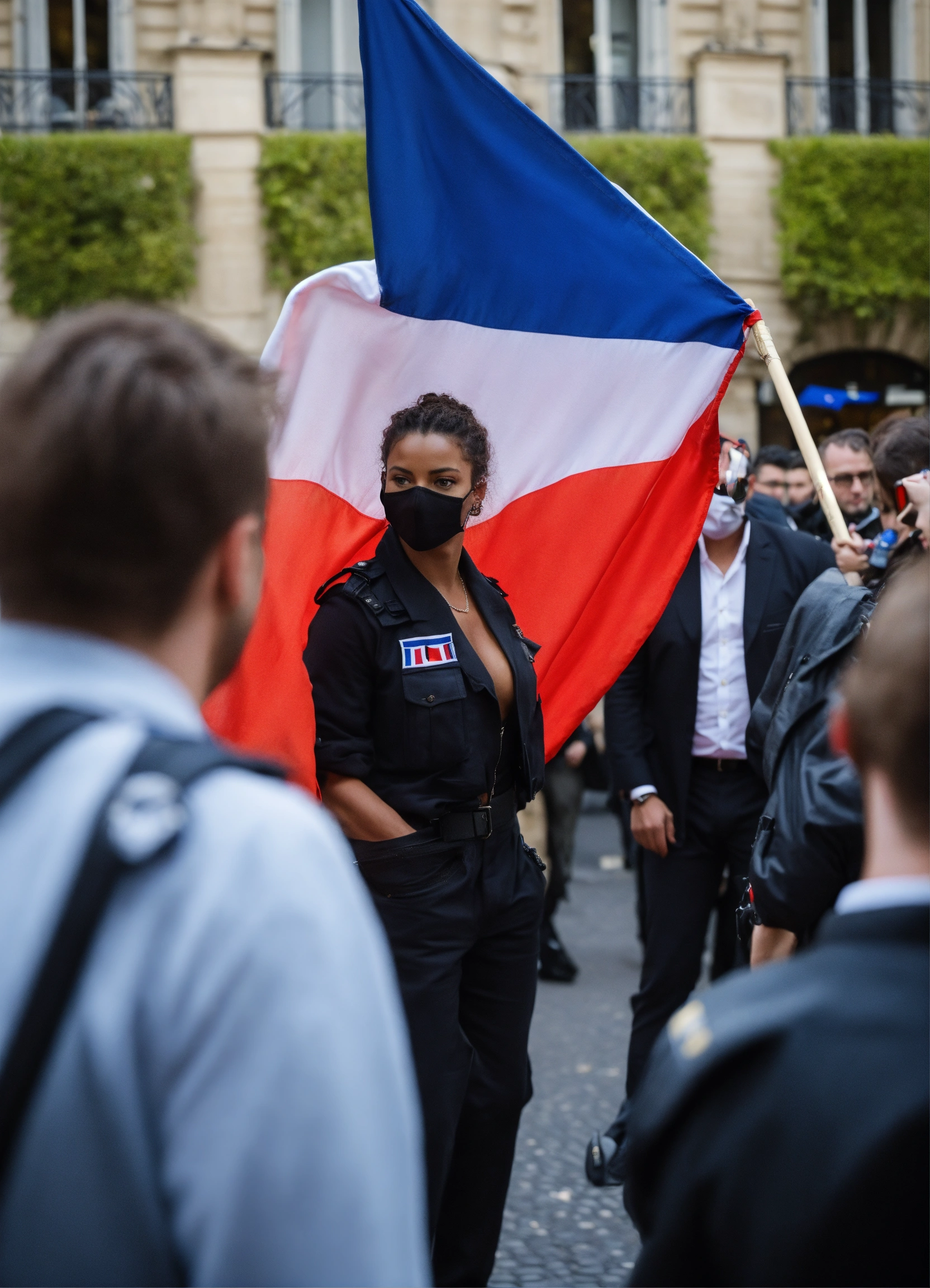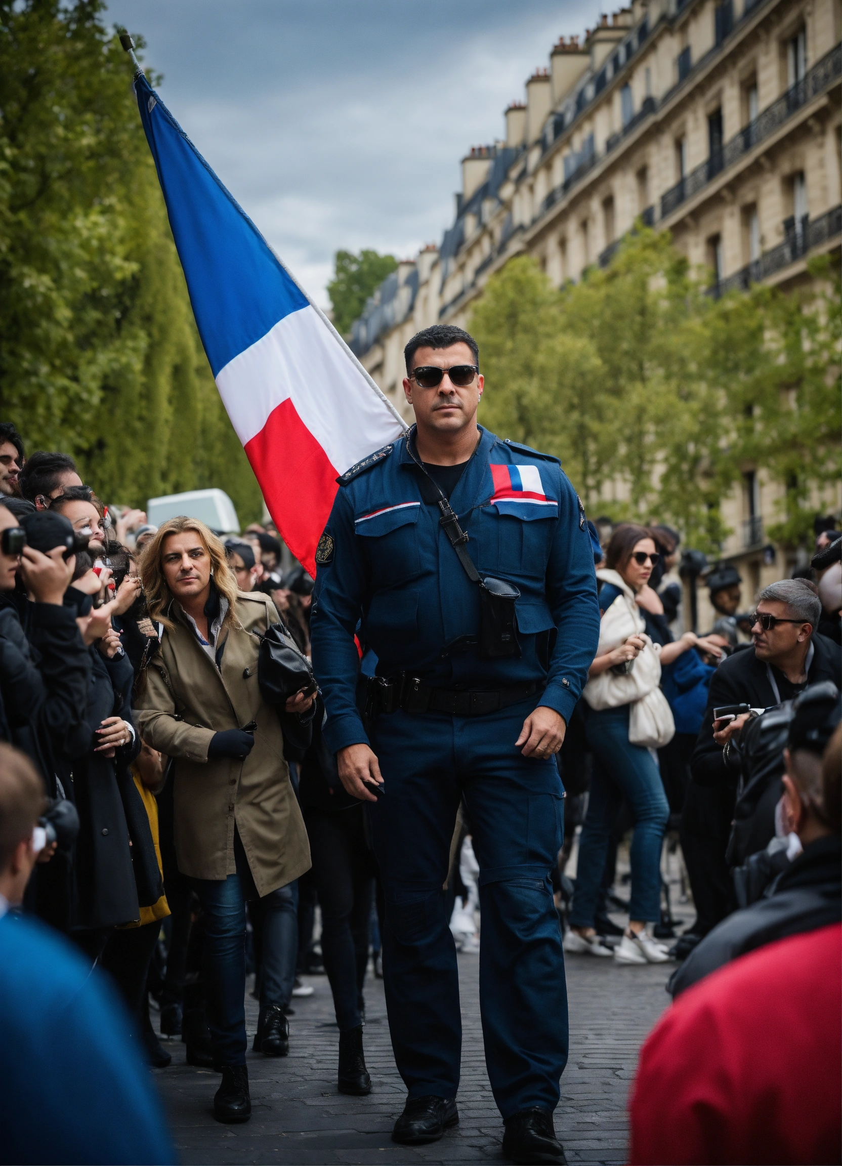 Bodyguard who looks after a celebrity in the middle of fans to protect her, in paris, with the french flag;