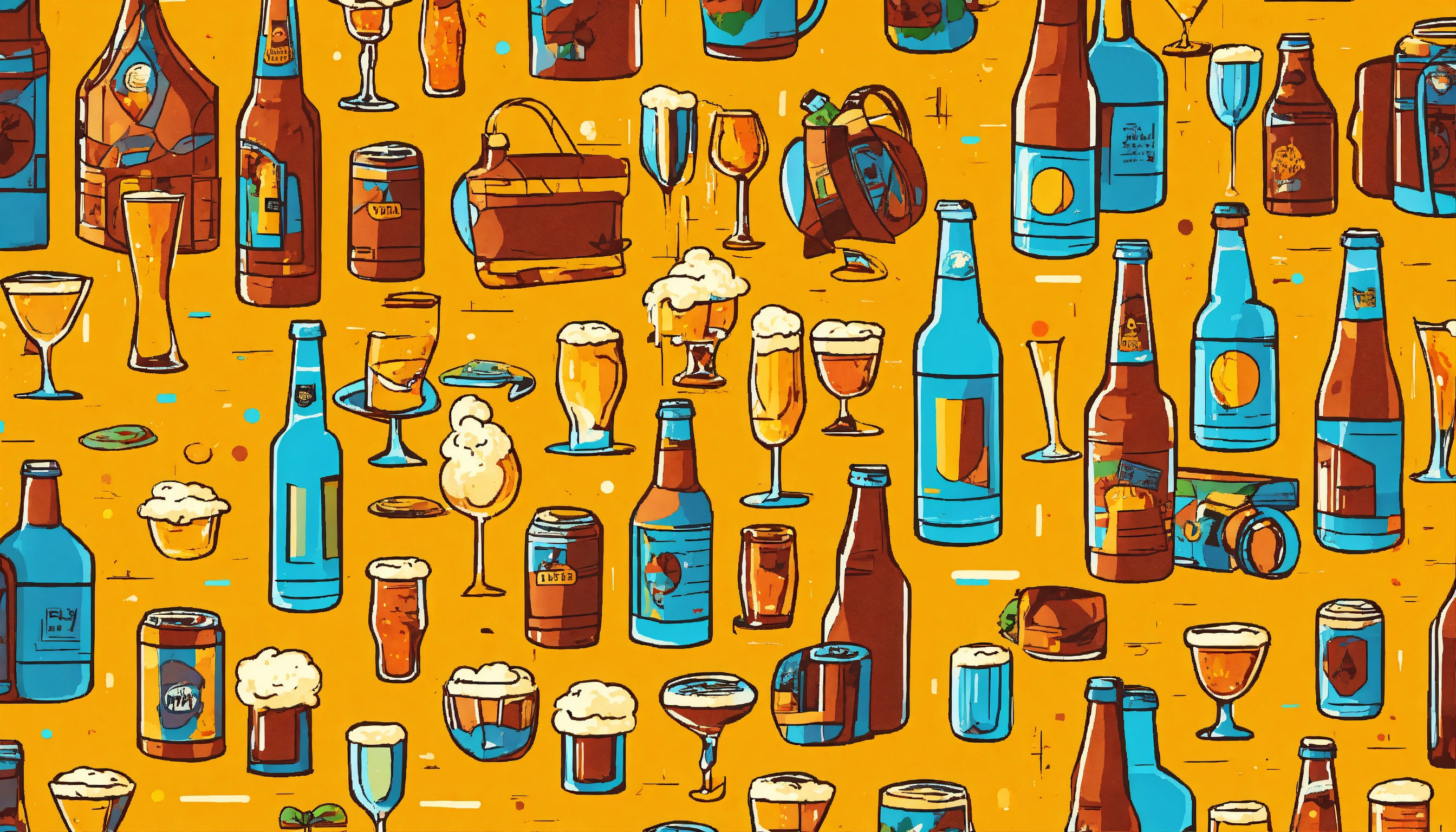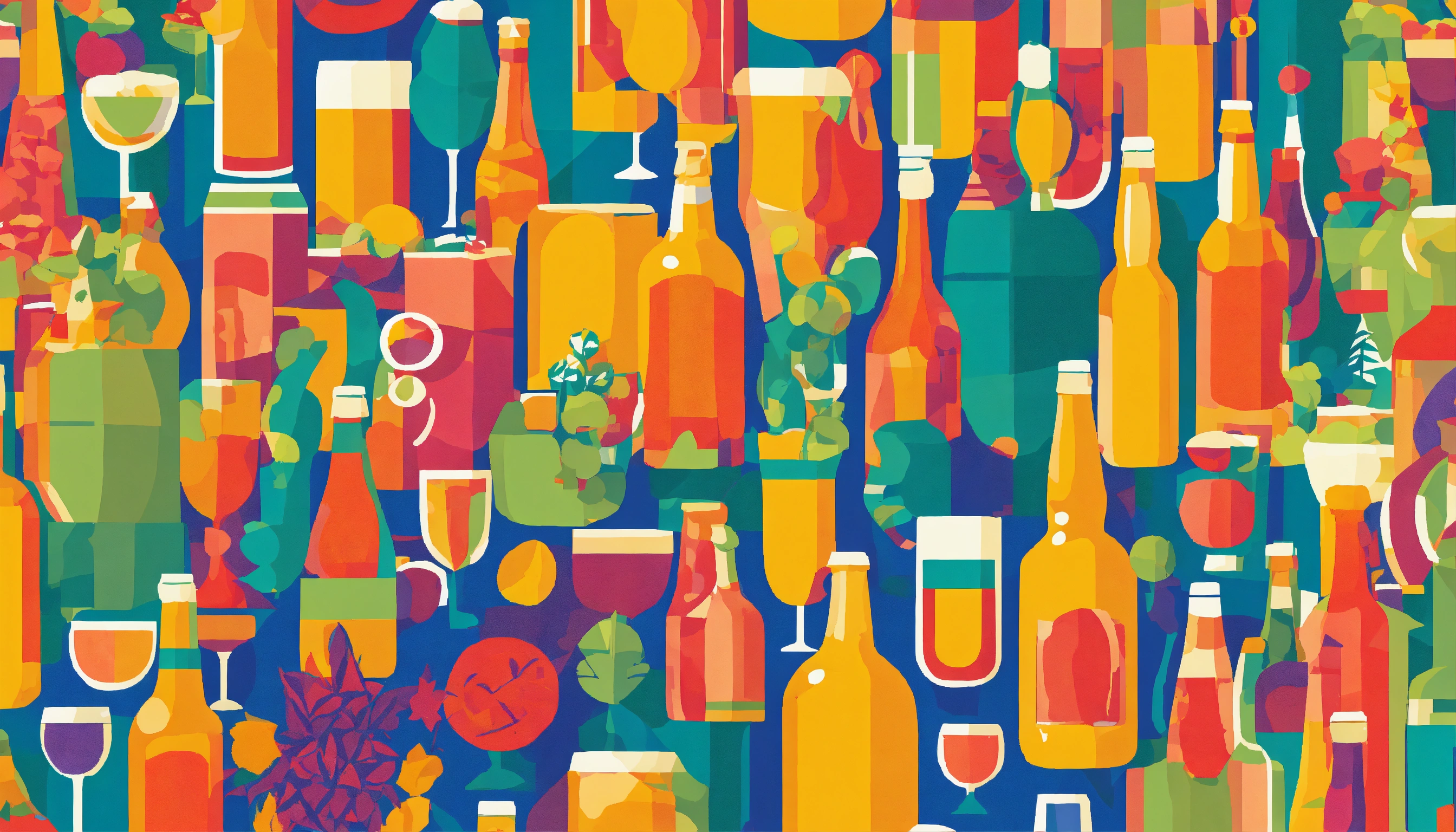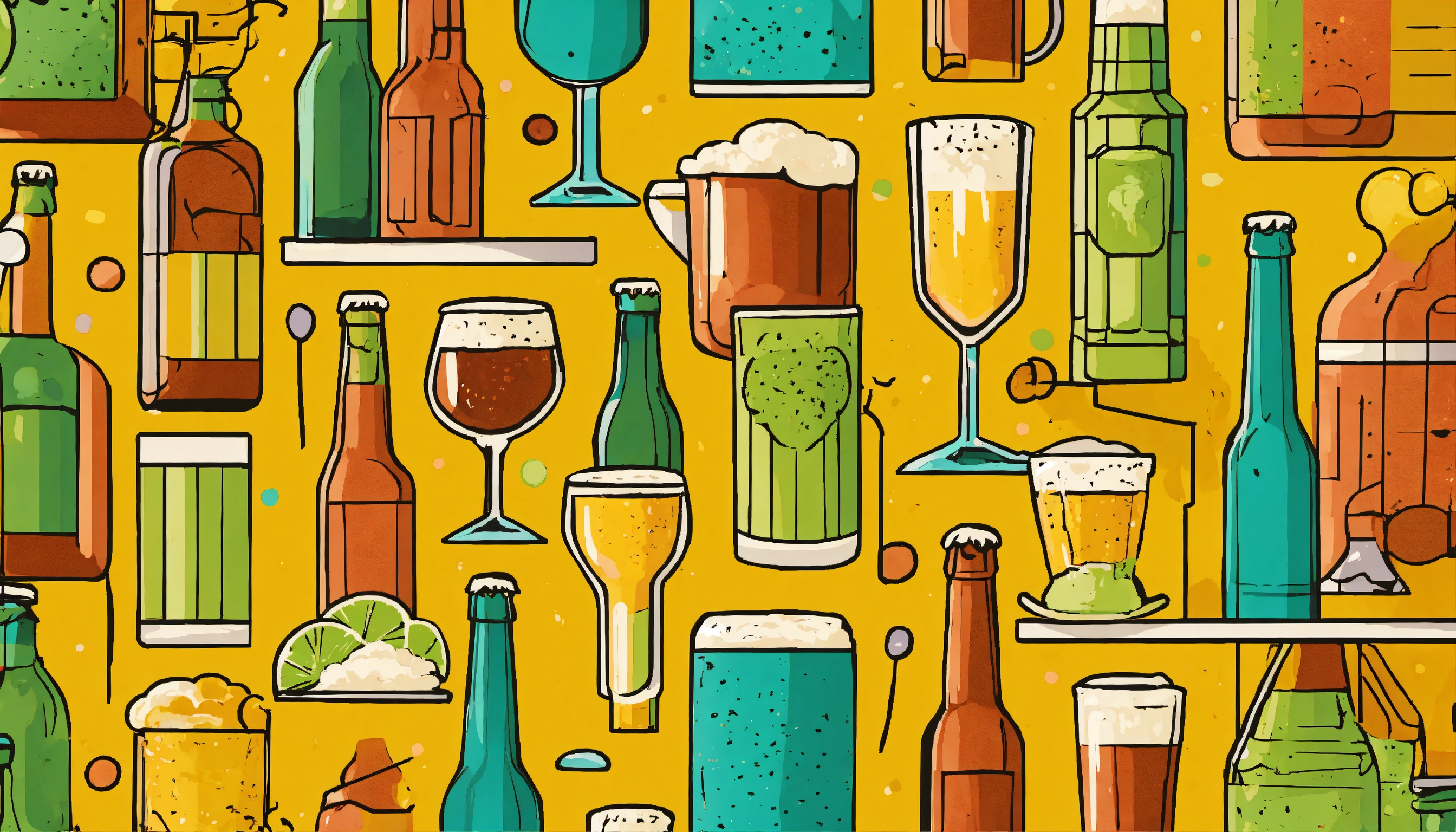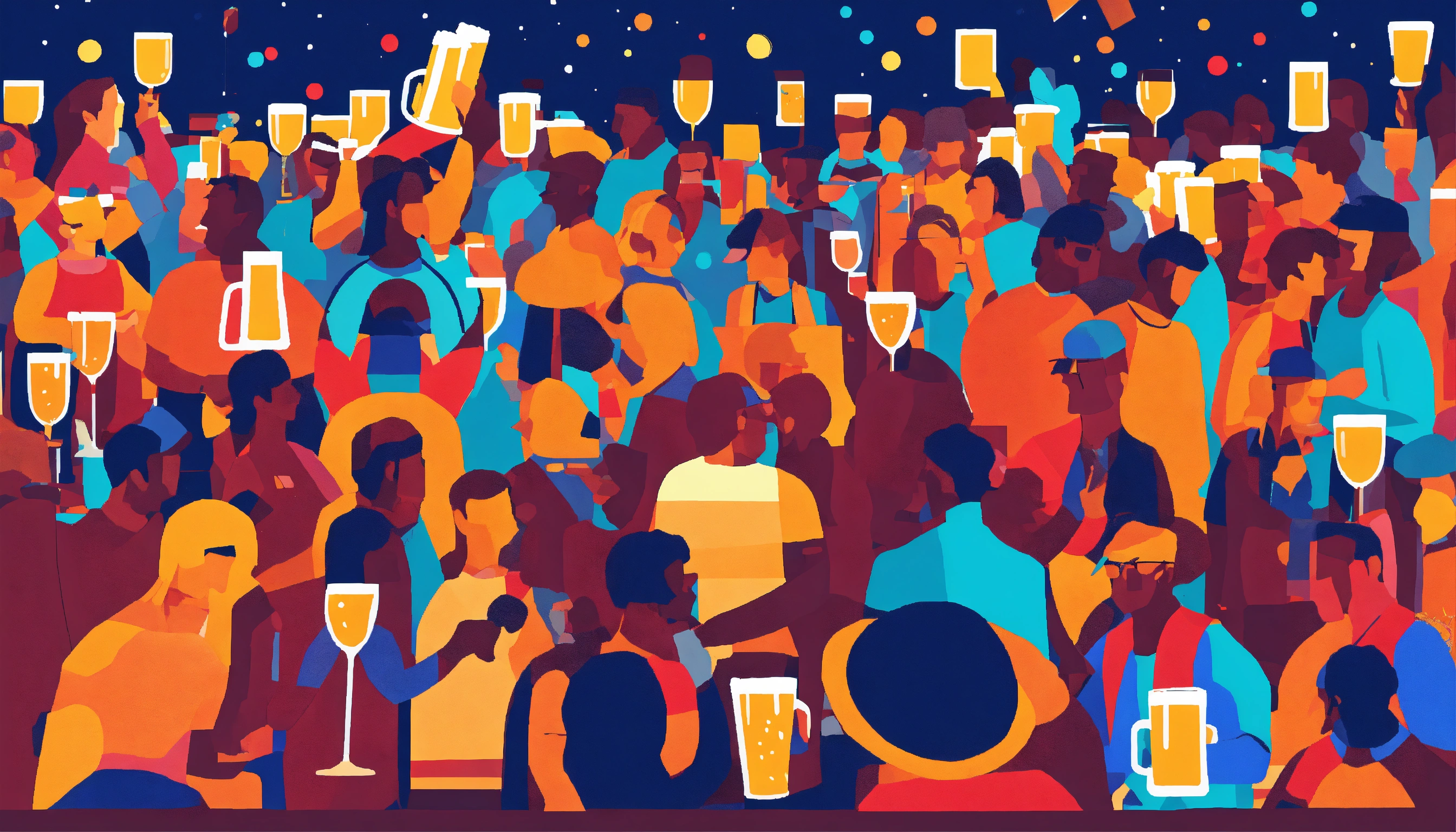 A beer party motif, flat colors, many colors, beer glasses, happy people, flat and clean illustration, minimalist, geometric, pop art, many people, party, festival, pattern iconic illustration style