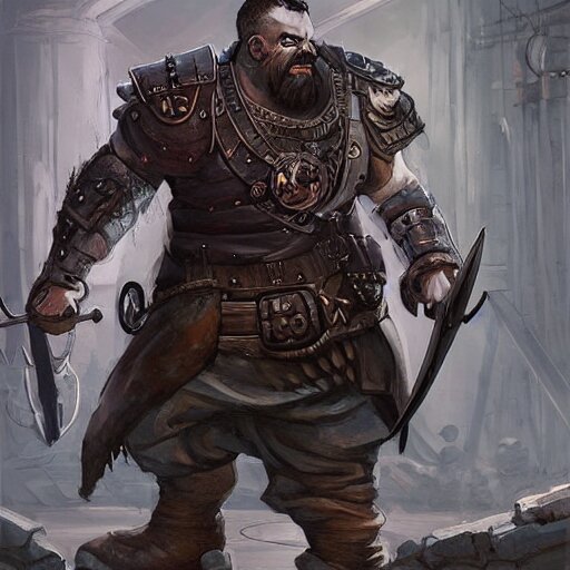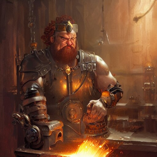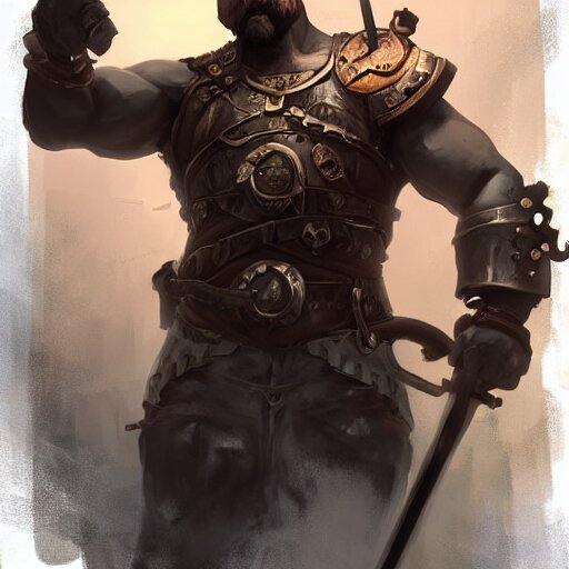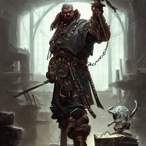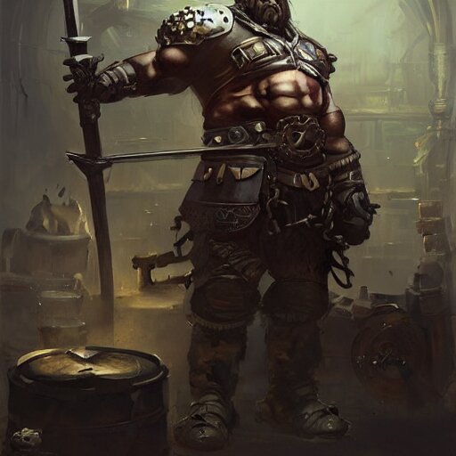 Artwork of a dark fantasy blacksmith strongman in his sword workshop, steampunk style, concept art, super detailed, 4 k hd, trending on artstation, digital painted, low contrast, made by greg rutkowski and viktoria gavrilenko