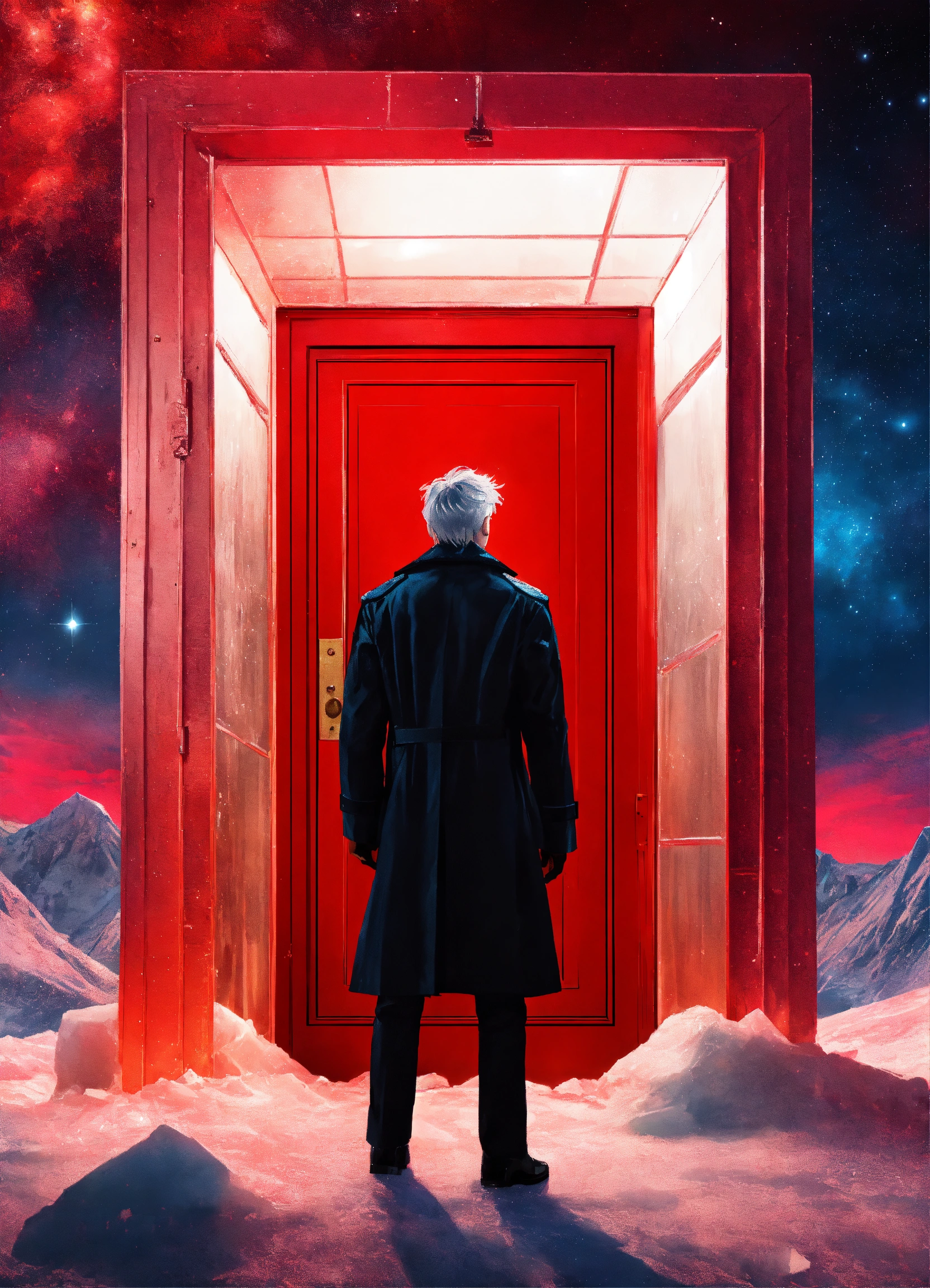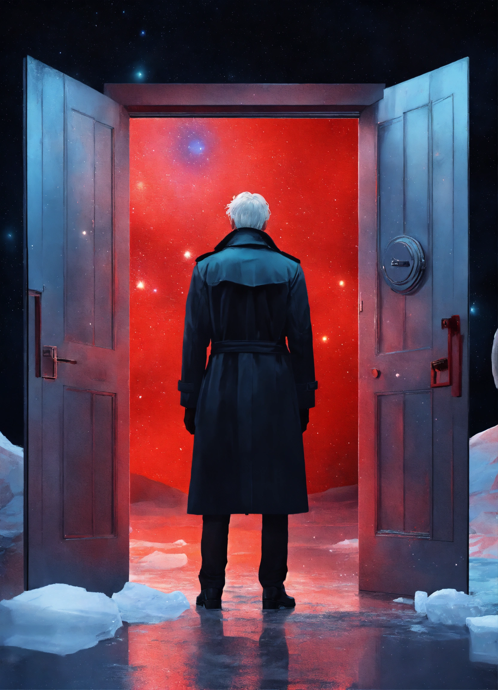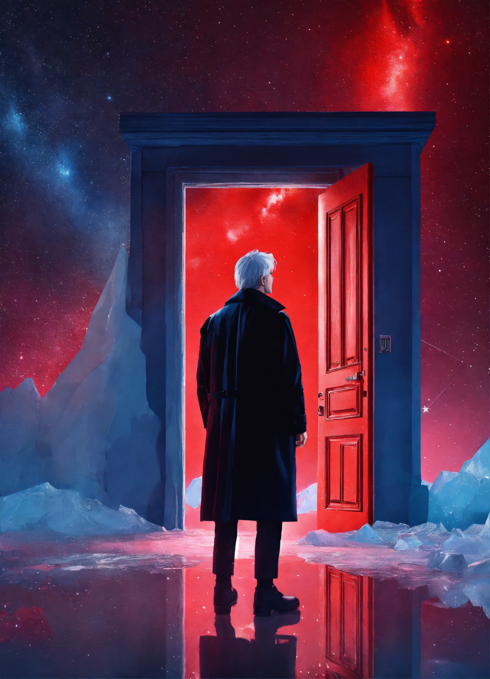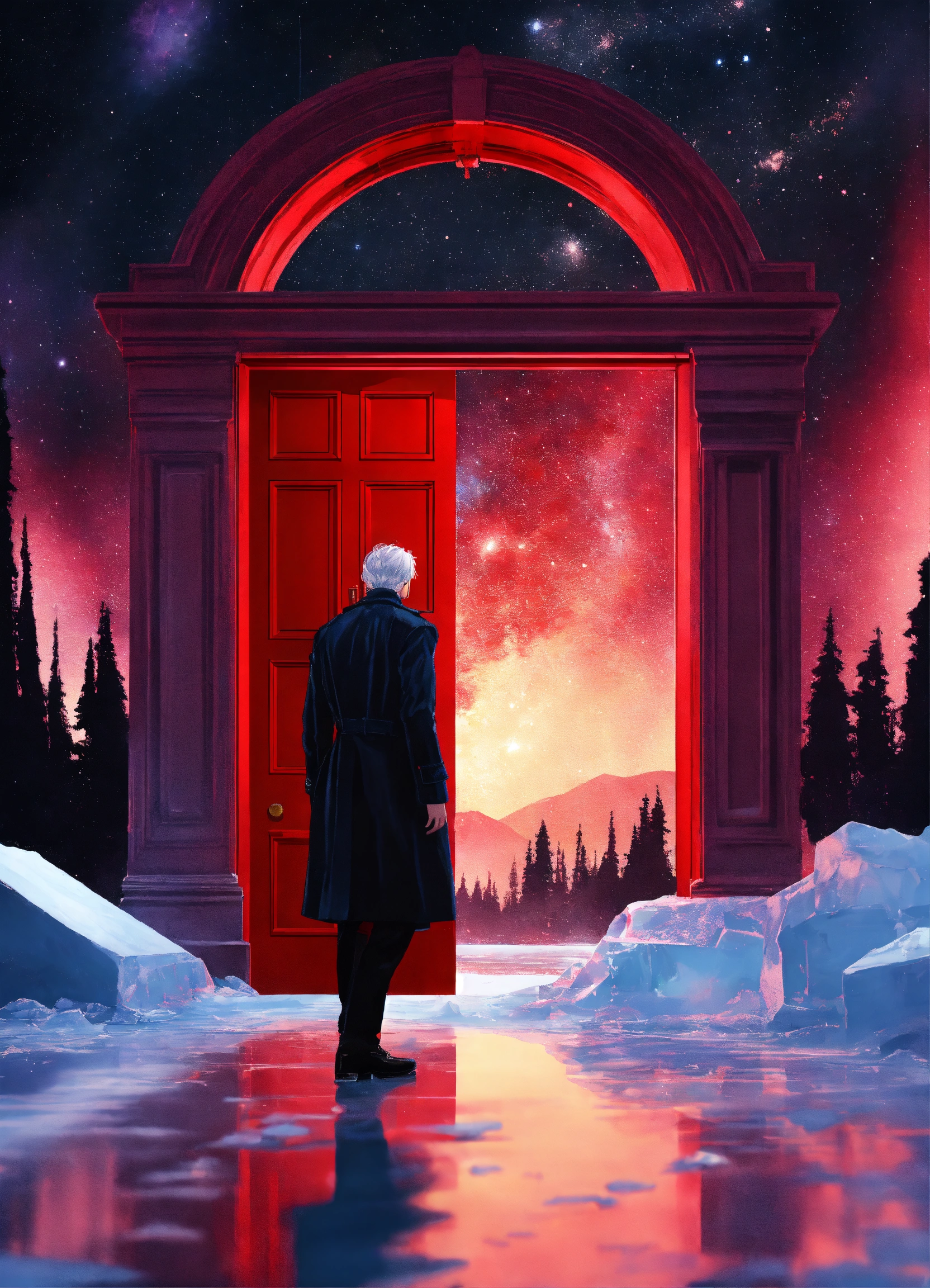 Red door in center of ice space, warm forest behind the doorway, full of stars sky at night, silver-haired man in black trenchcoat, icepunk, retrowave, abstract composition, wallpaper