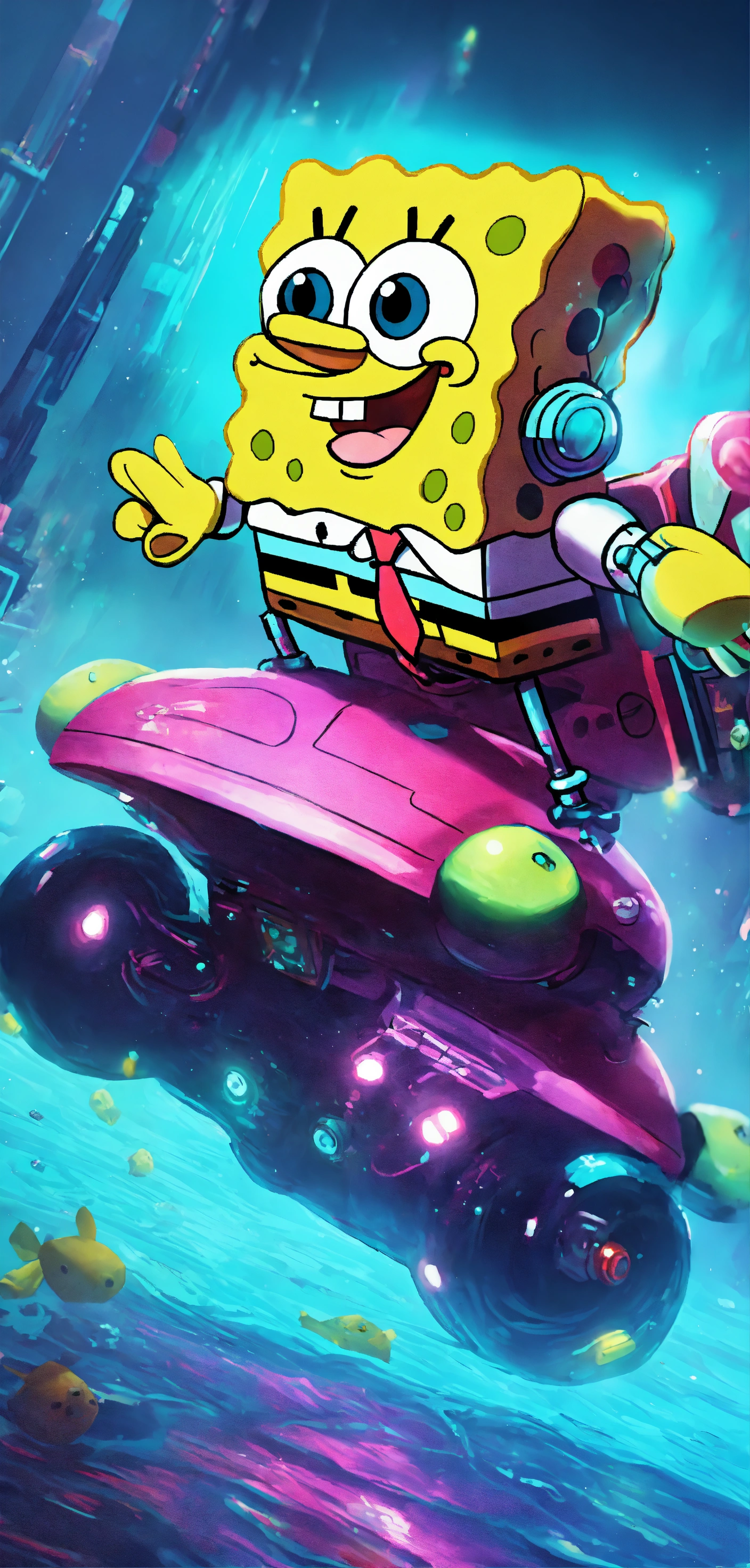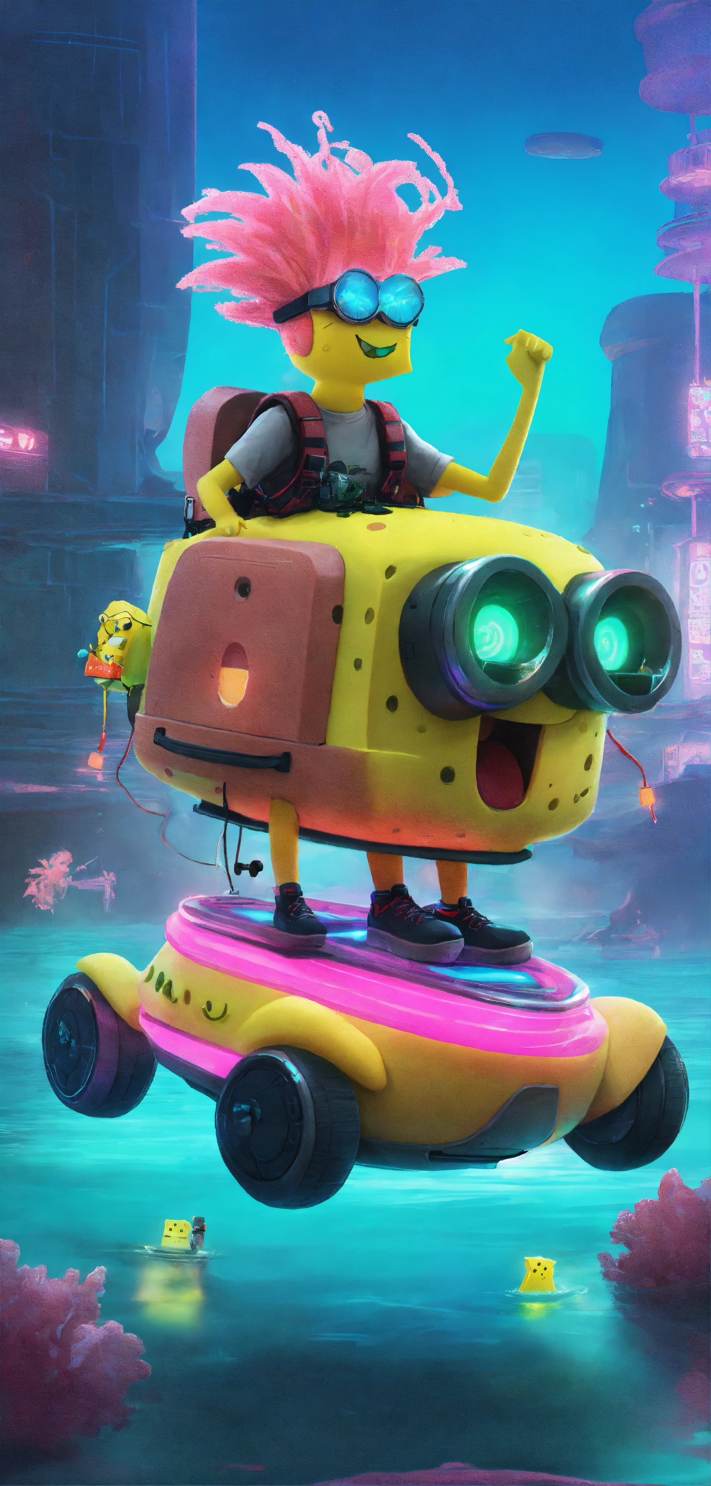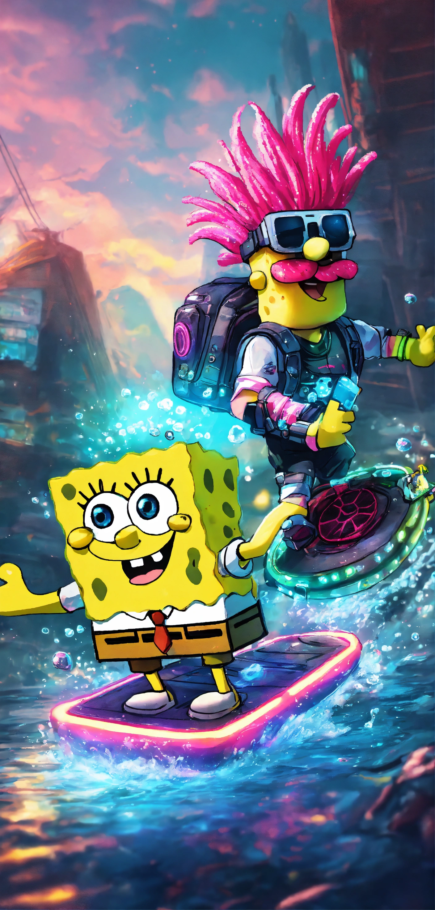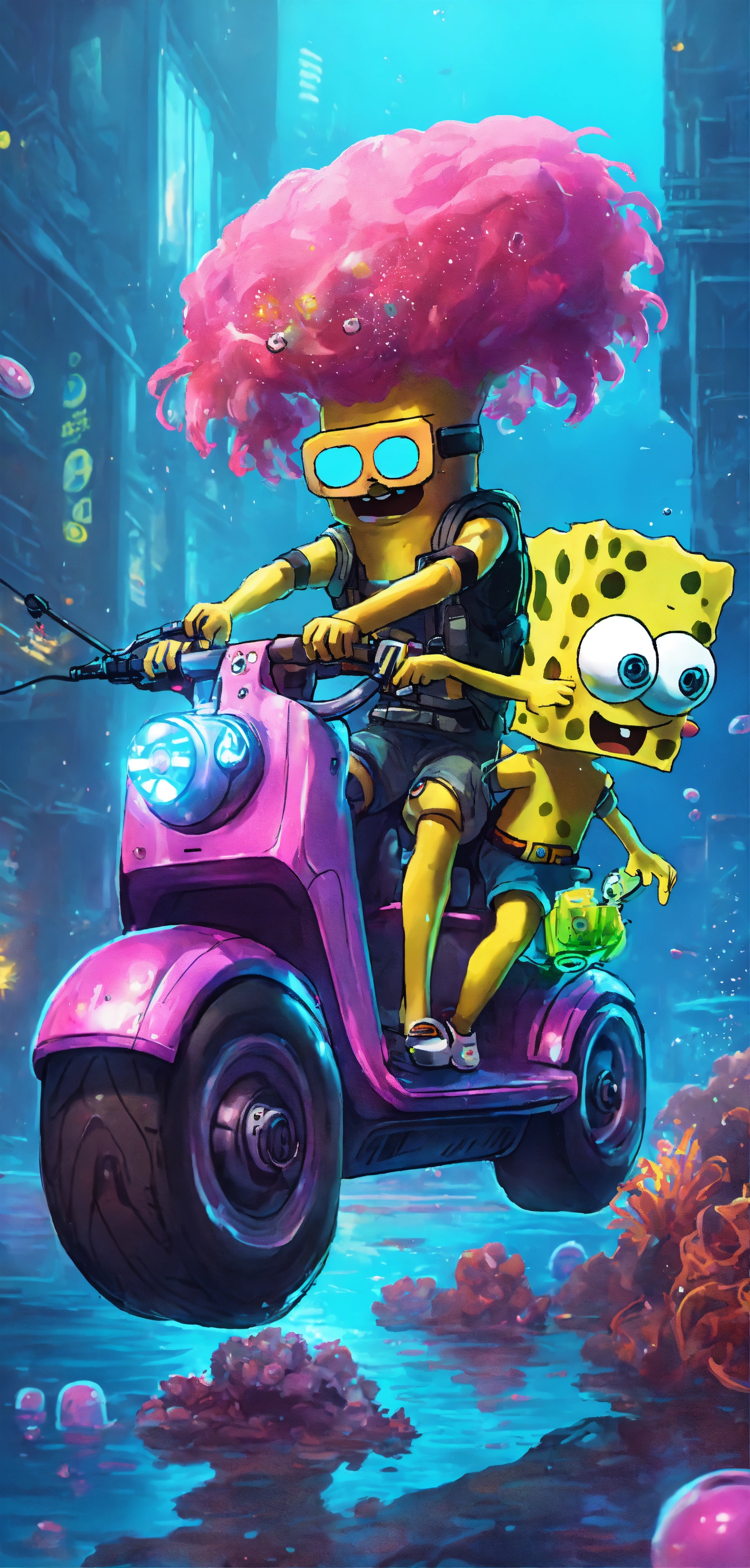 Cyberpunk spongebob and patrick with neon hair riding a futuristic hoverboard underwater
