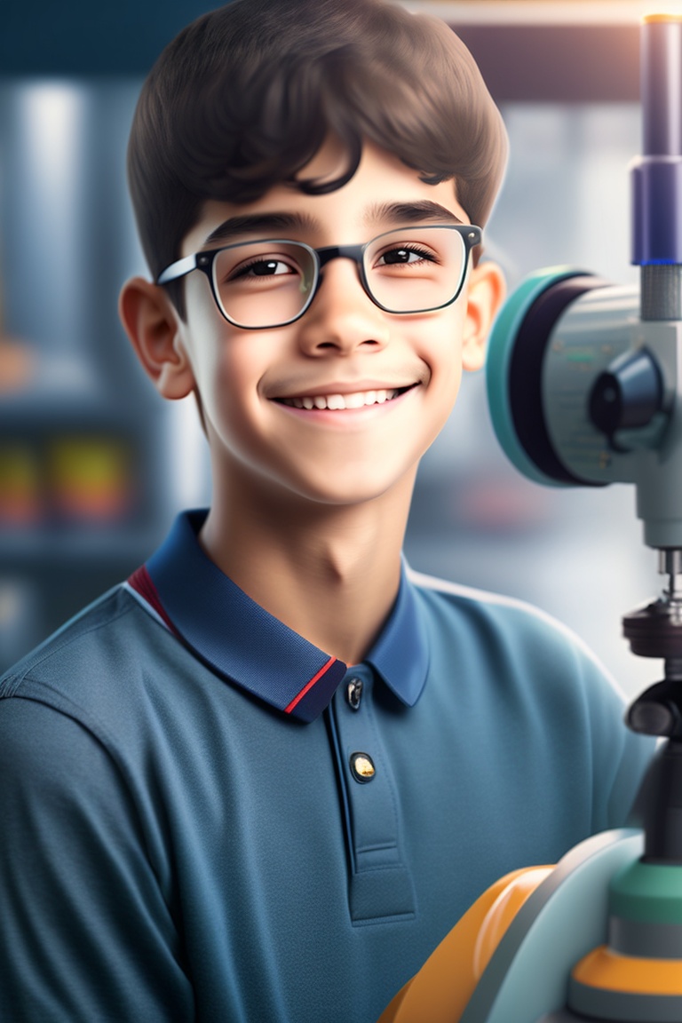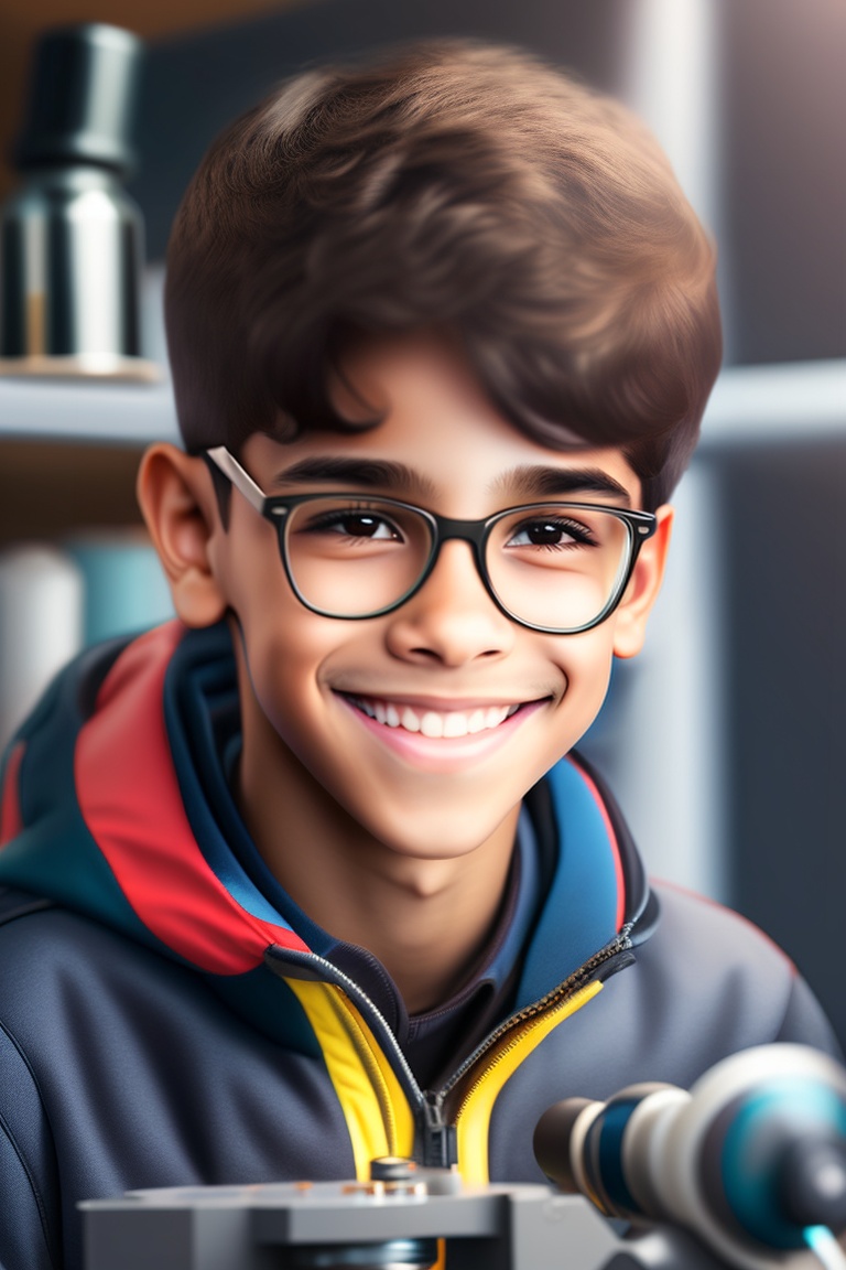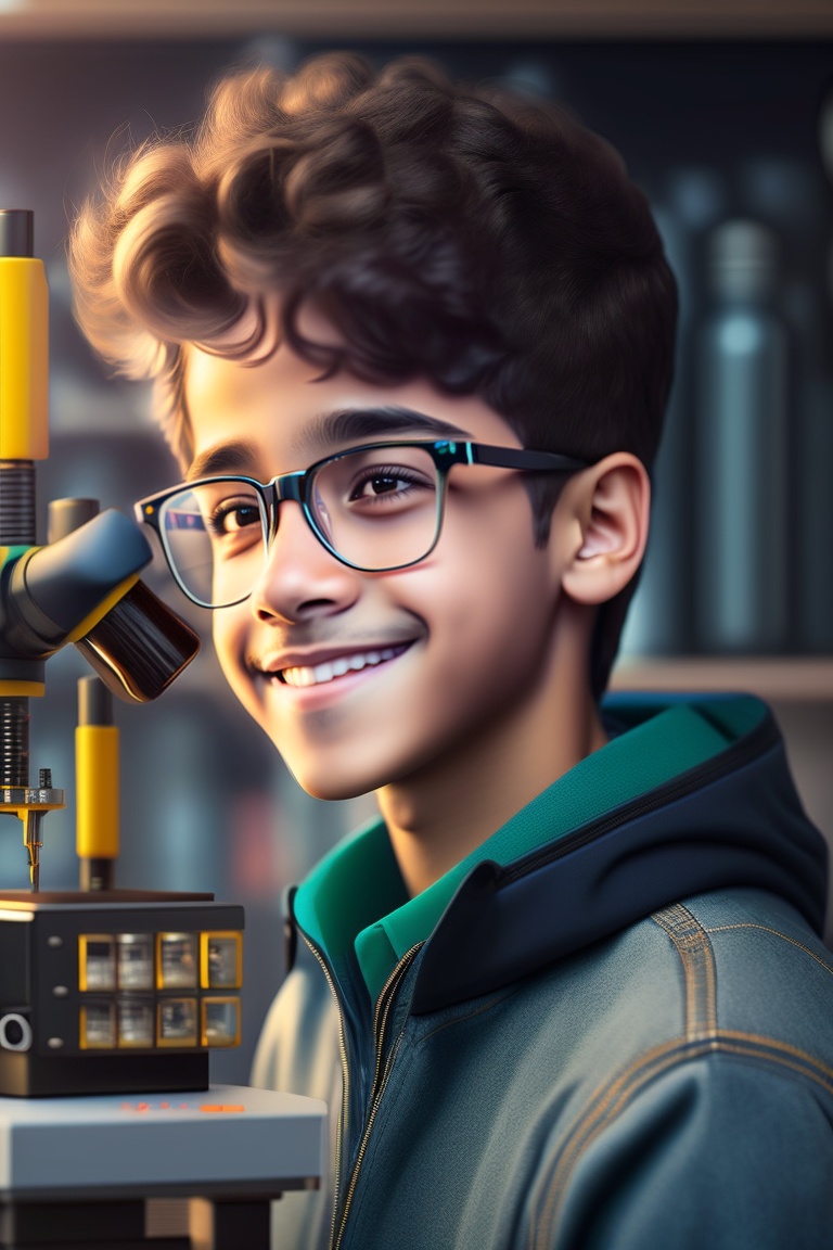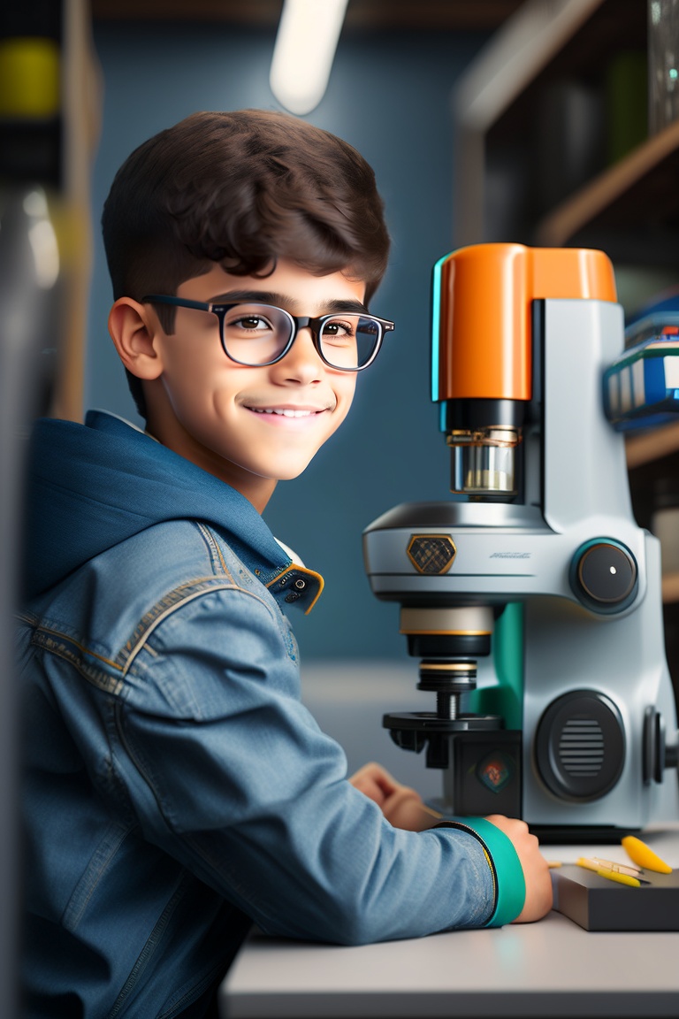 Natural photo of shapely handsome arab 14 years old boy with short black hair, and glasses, garage lab, looking into a microscope, smiling