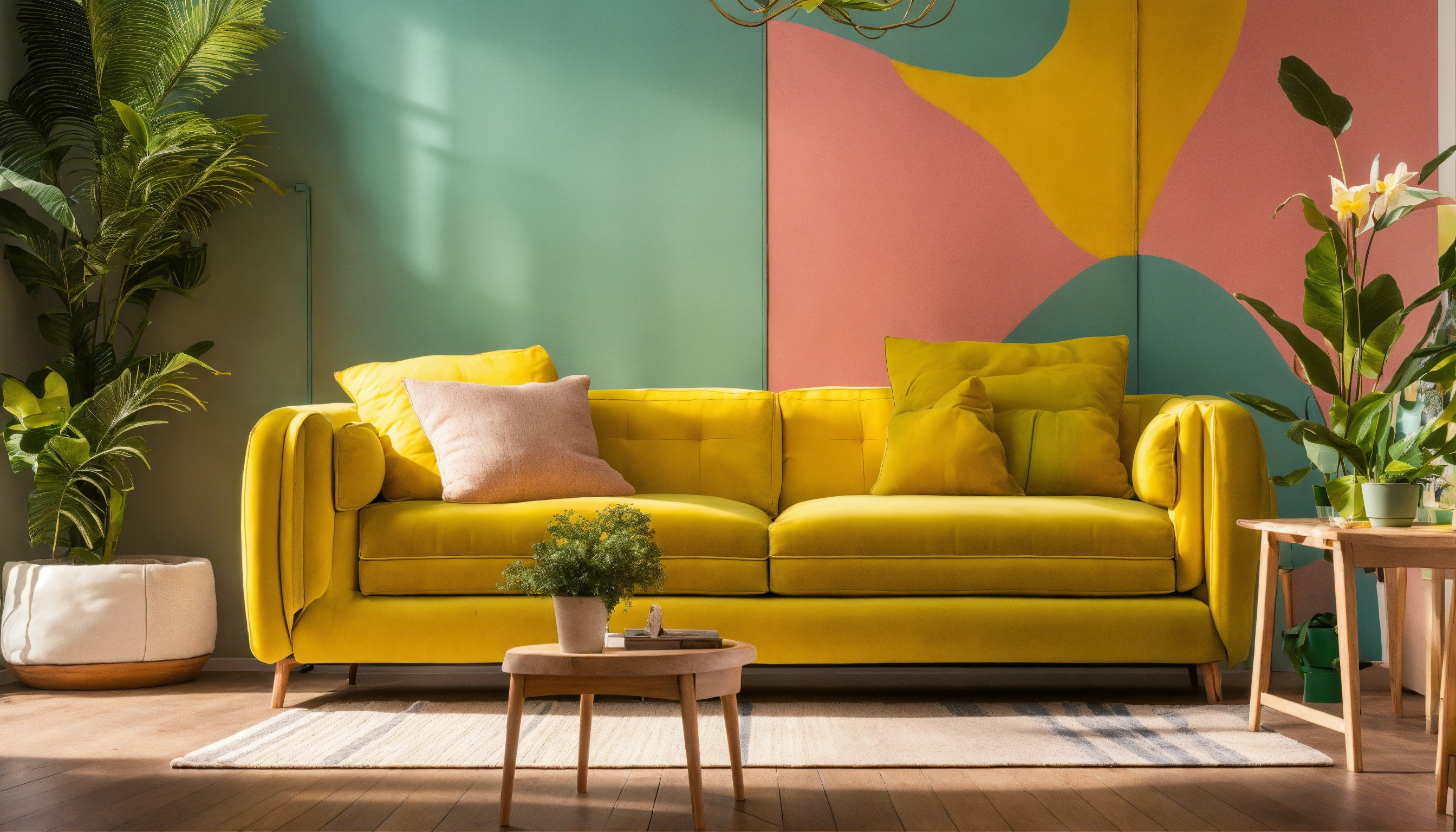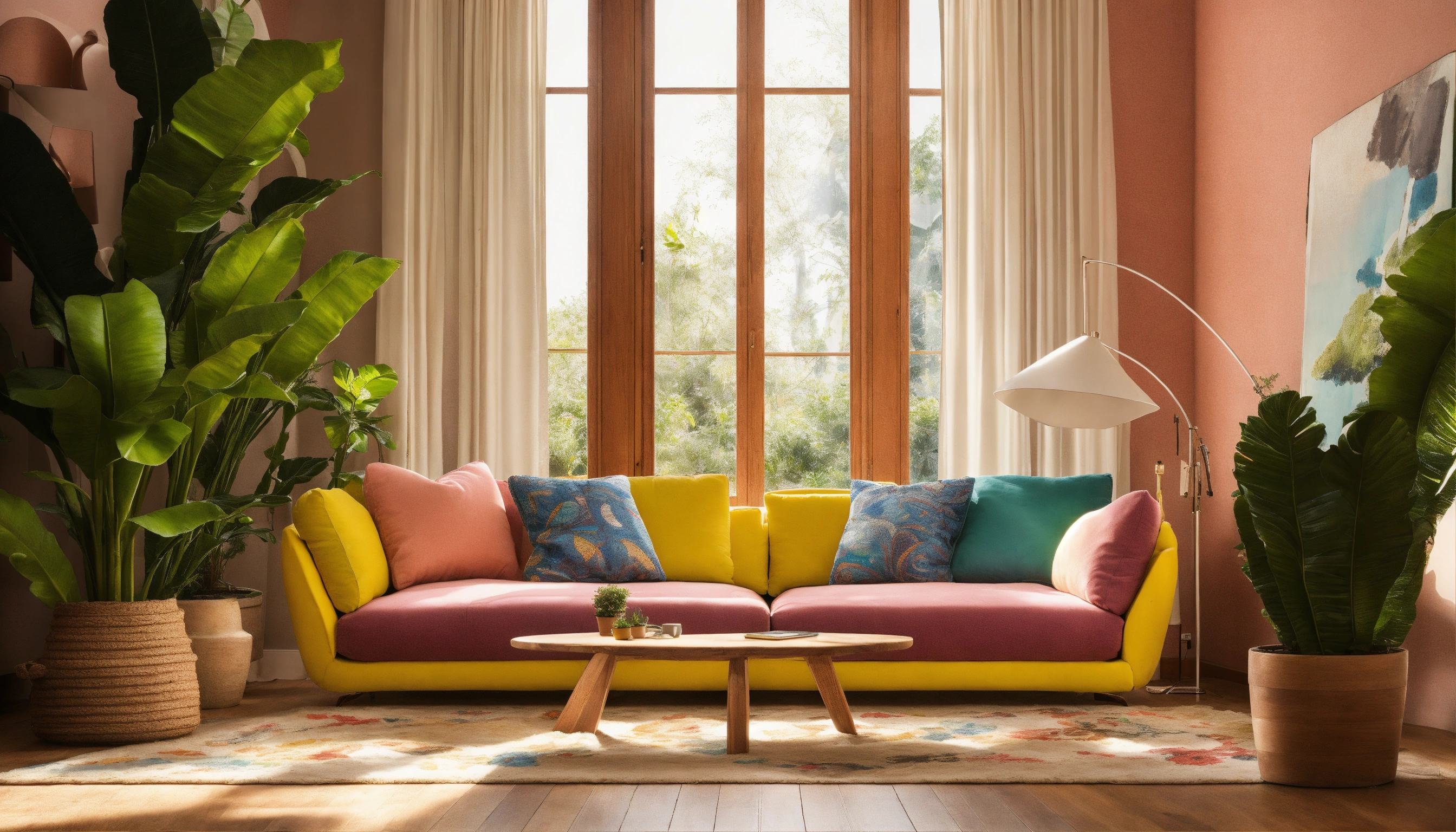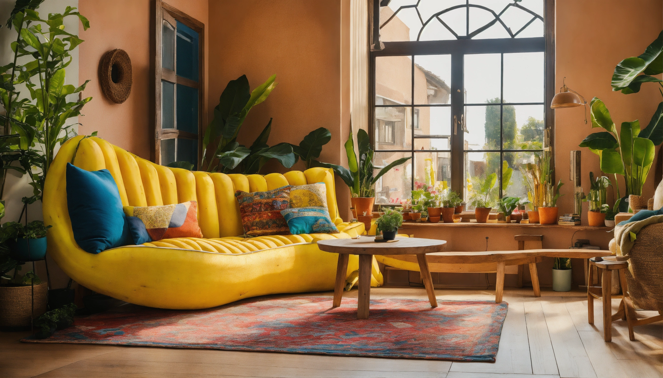 A banana-shaped couch in a cozy living room, colorful cushions on top, wooden floor with a patterned, potted plant in the corner, natural sunlight from window