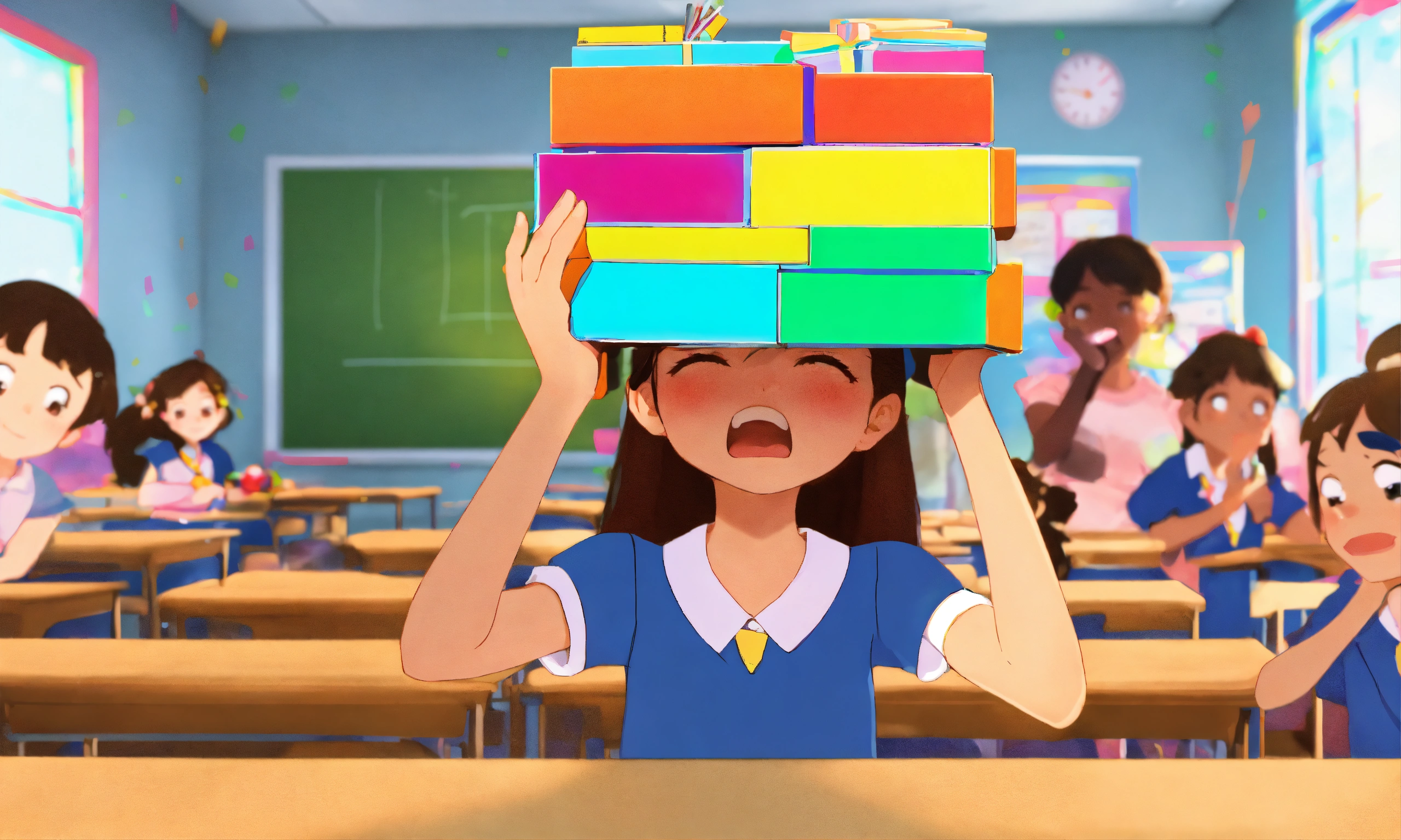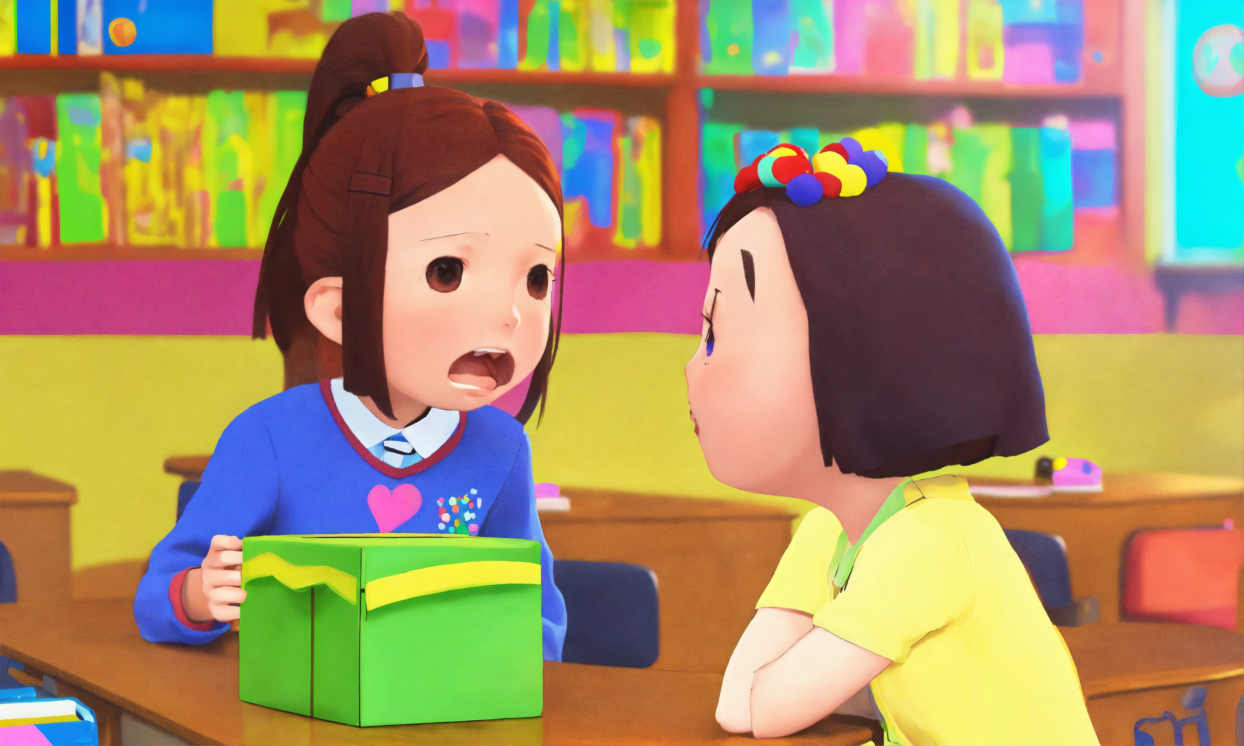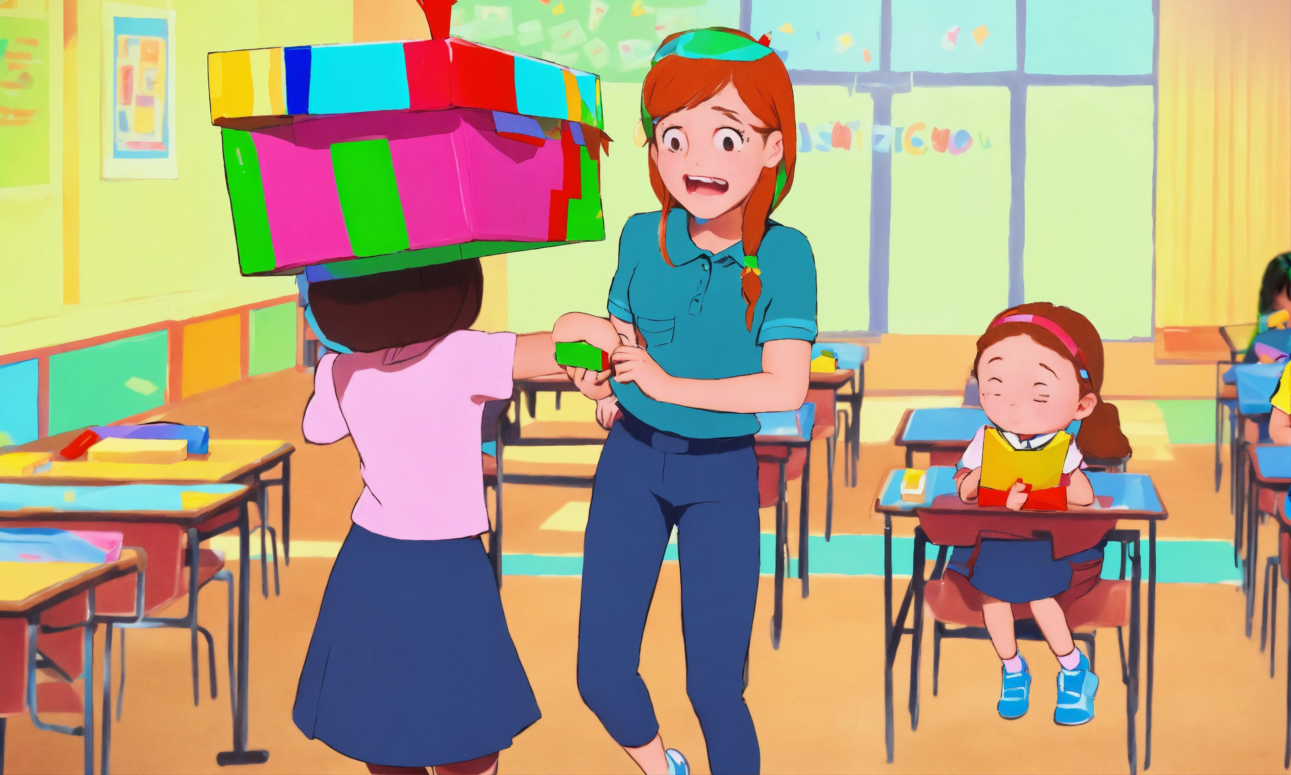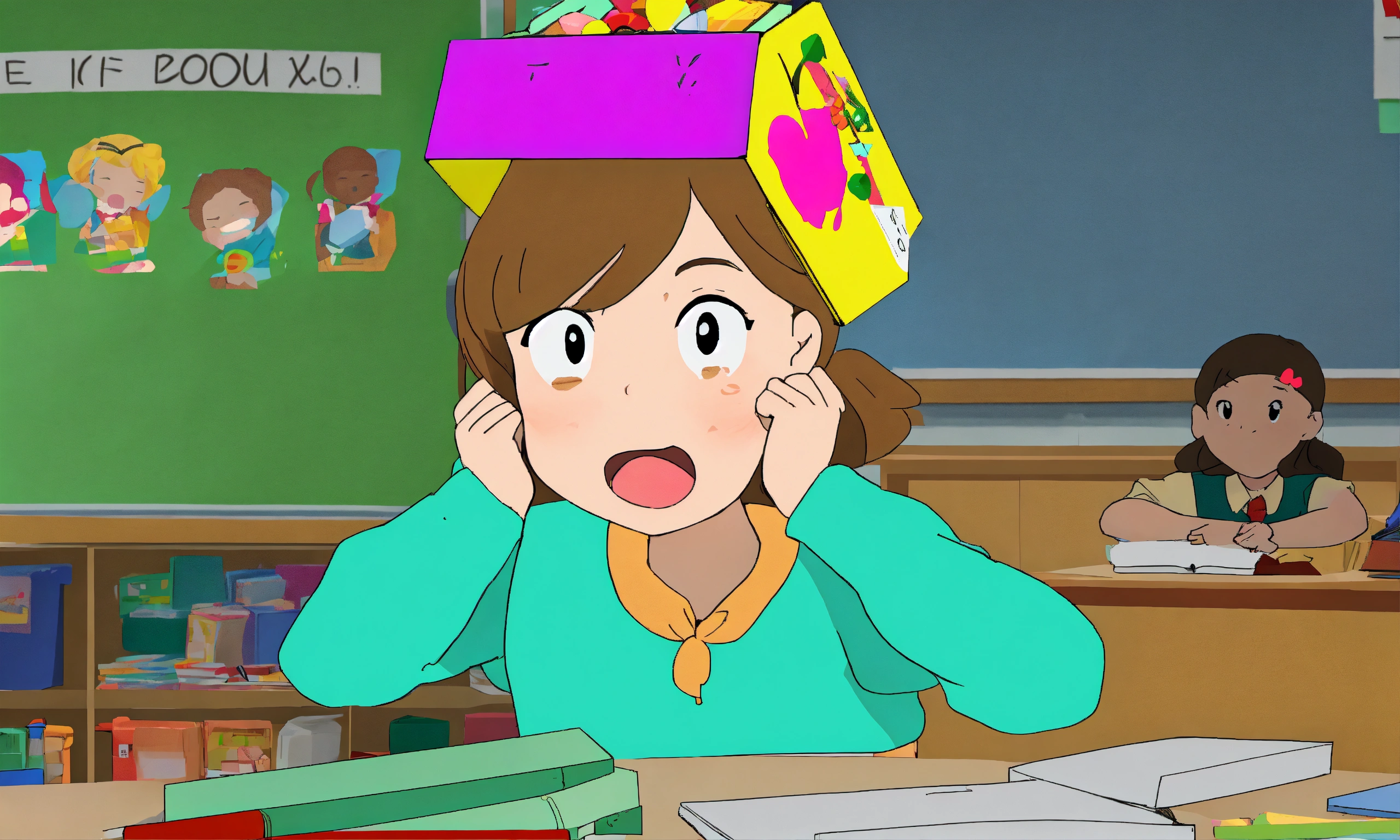 Girl hide her face with a colorful box on her head; in classroom being bullied; with a teacher beside; animated