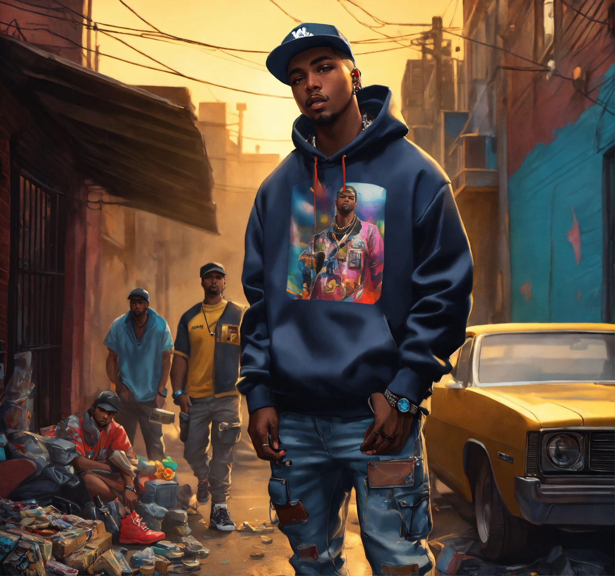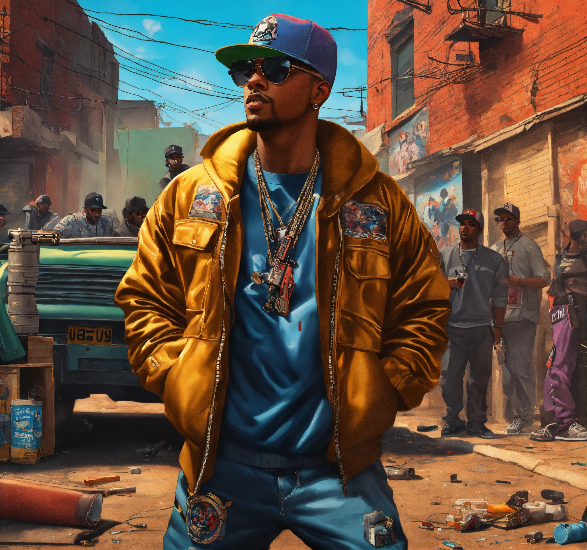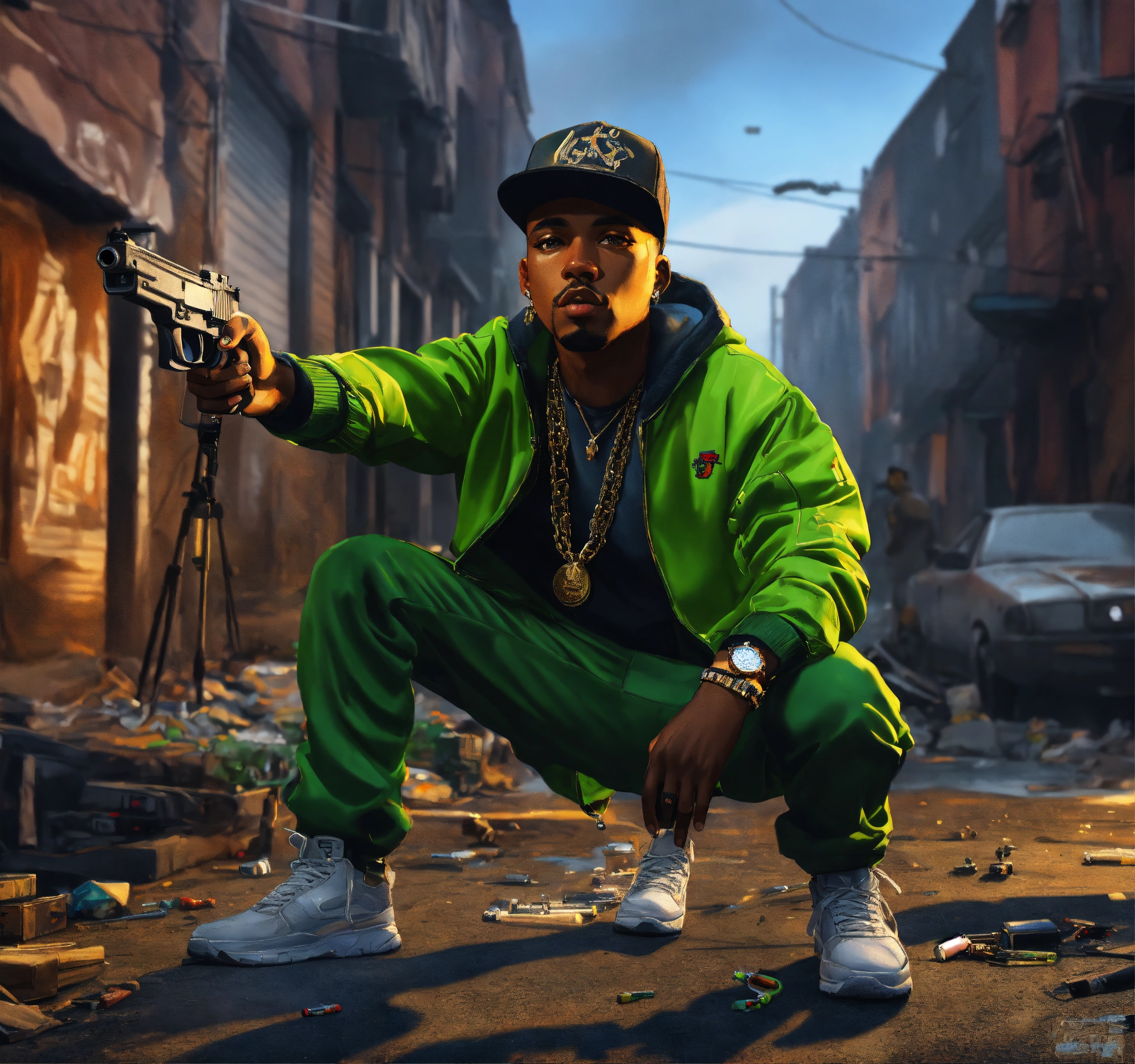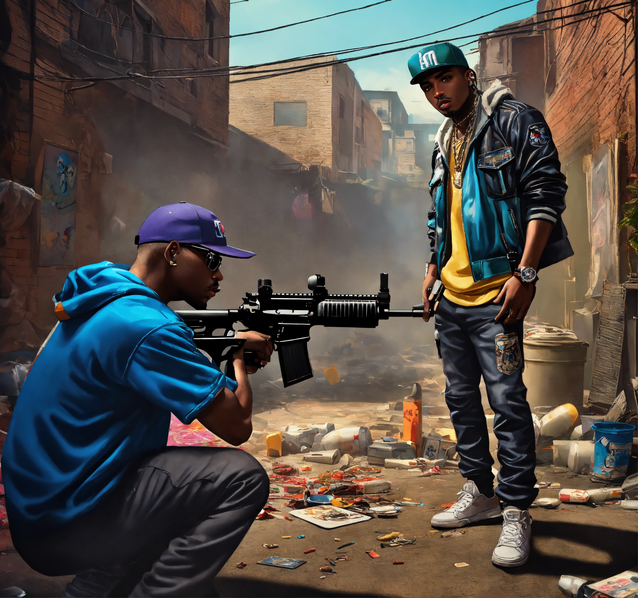 Full body pop art, hyperrealist portrait of rapper "cassidy" in a shooting gun out on a slum block with black gang in street fantasy art, photo realistic, dynamic lighting, artstation, poster, volumetric lighting, very detailed faces, 4 k, award winning