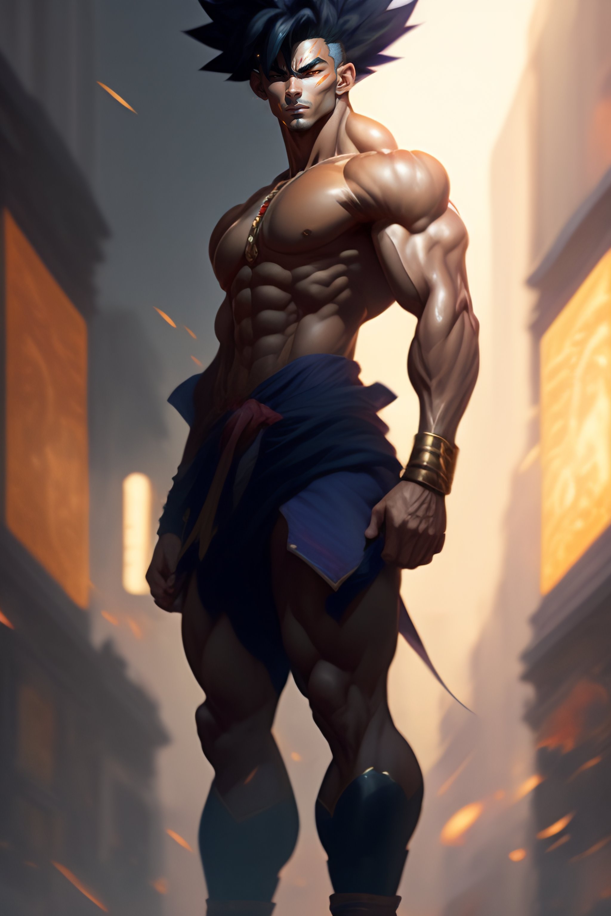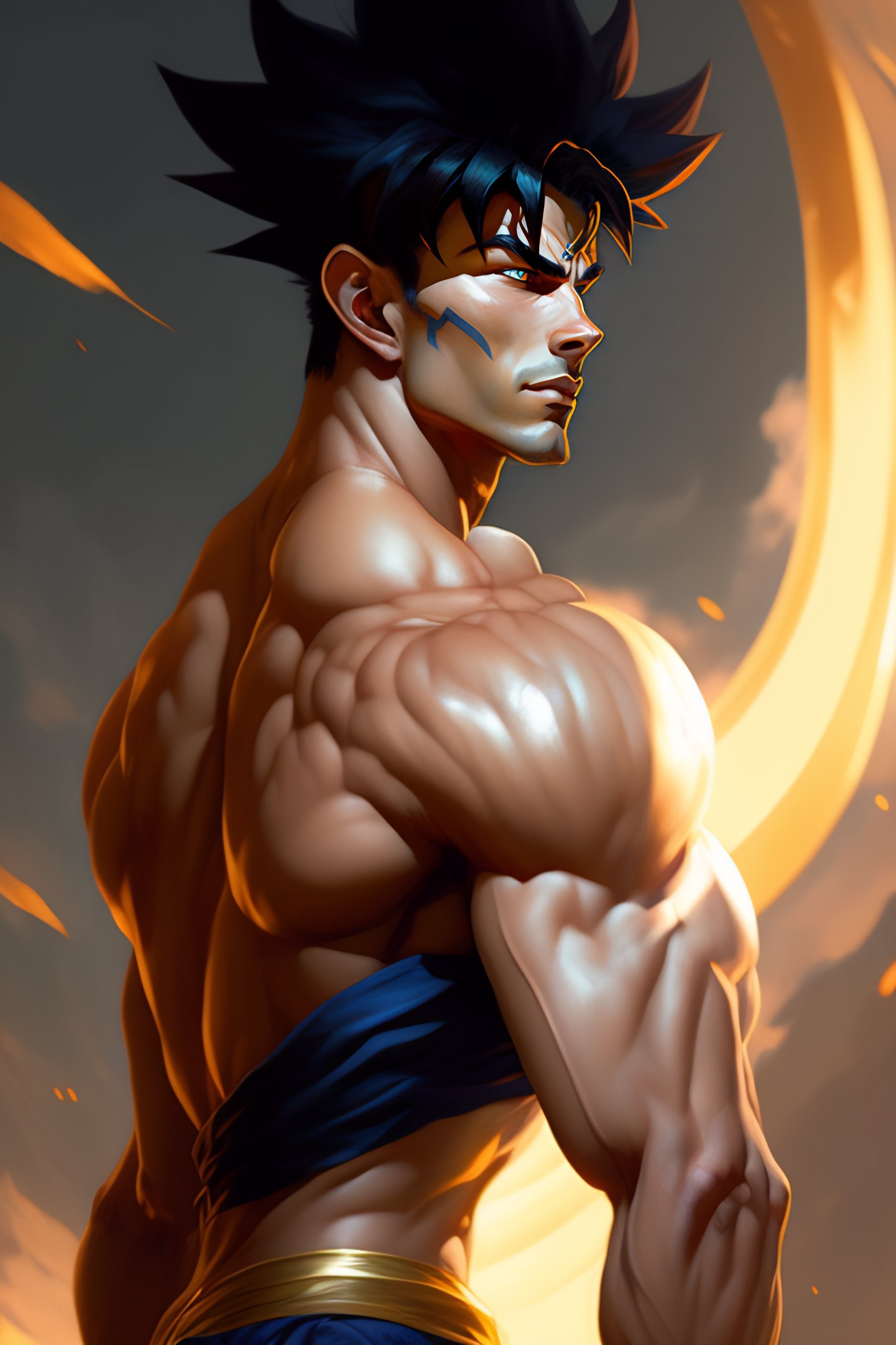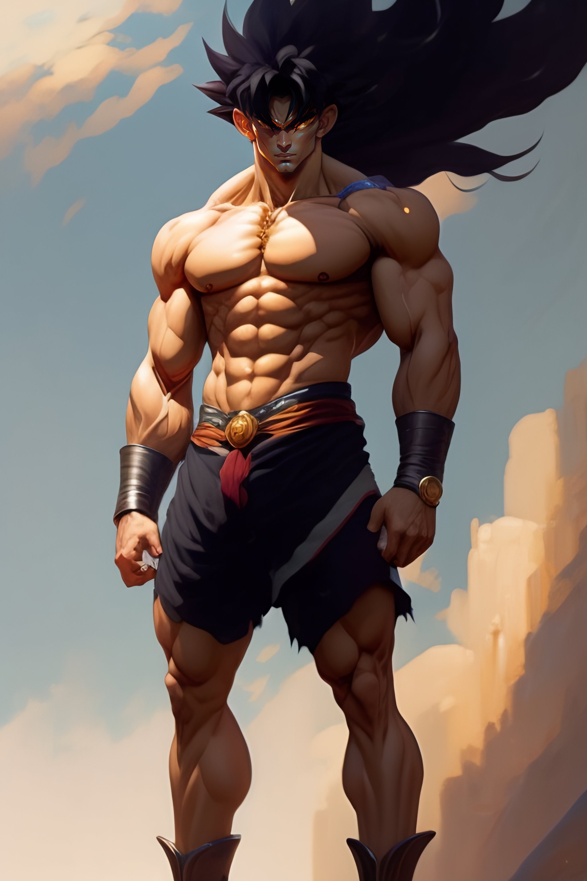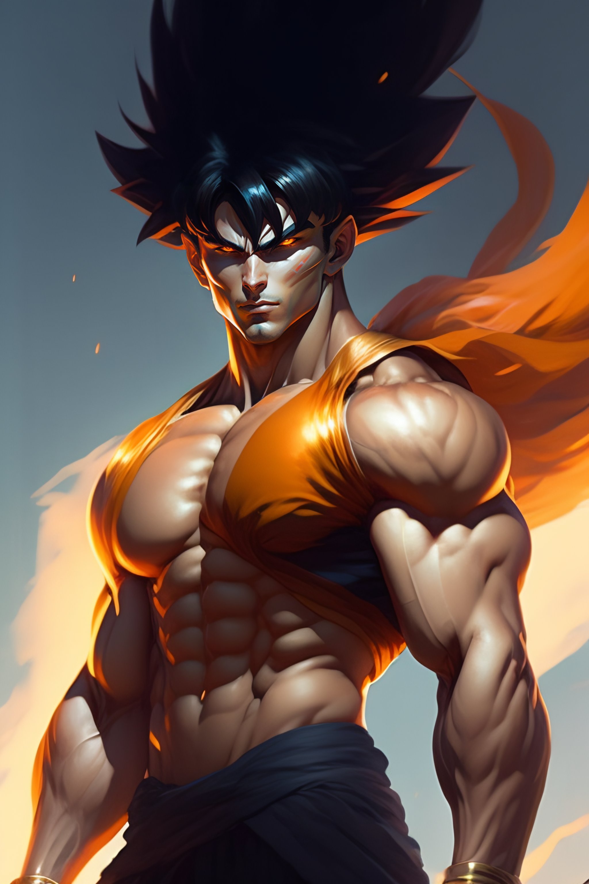 Full body potrait thin muscular goku standing with a confident, nonchalant expression on his face anime version, his unassuming appearance belying his incredible strength art by greg rutkowski and alphonse mucha