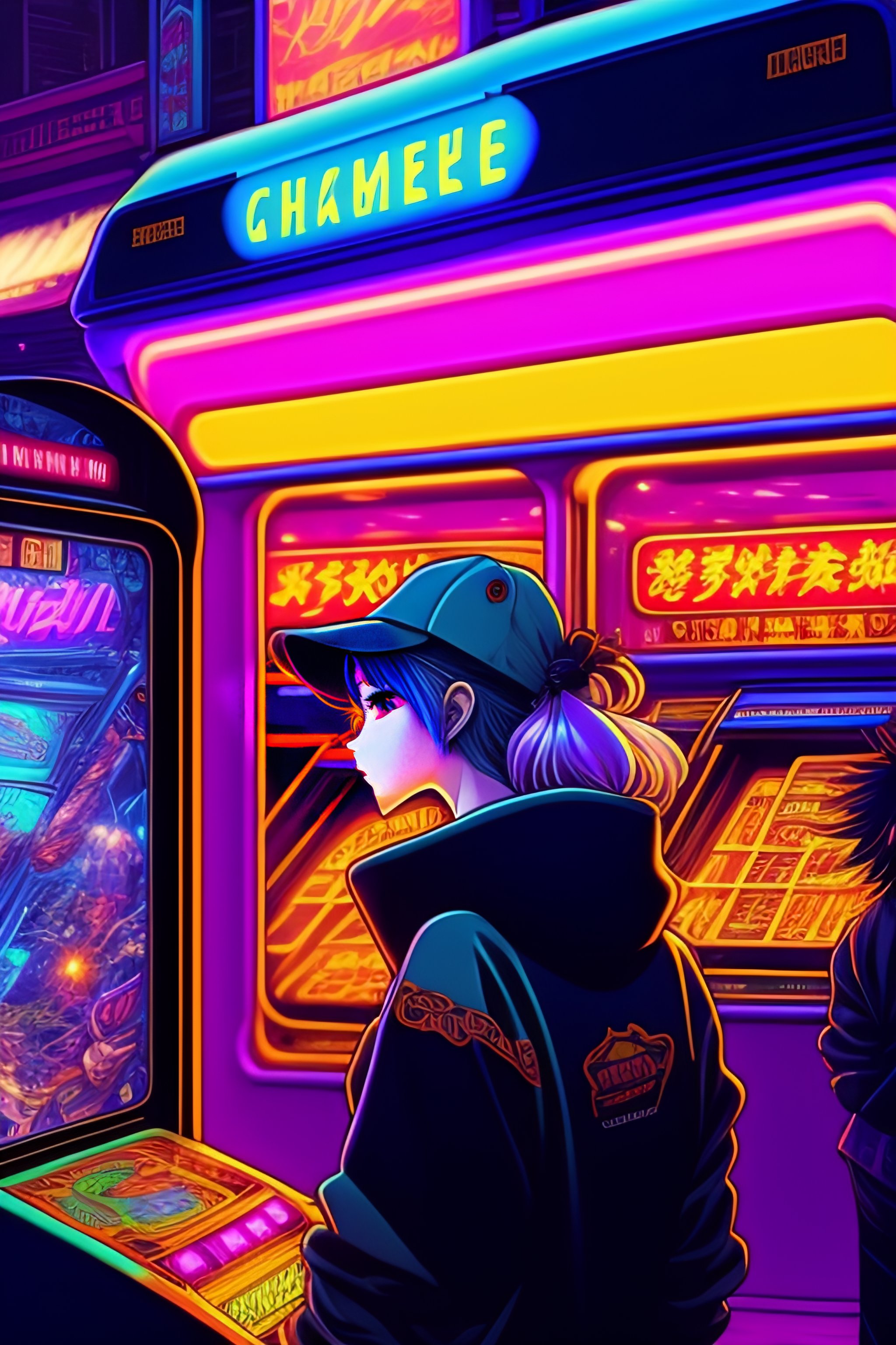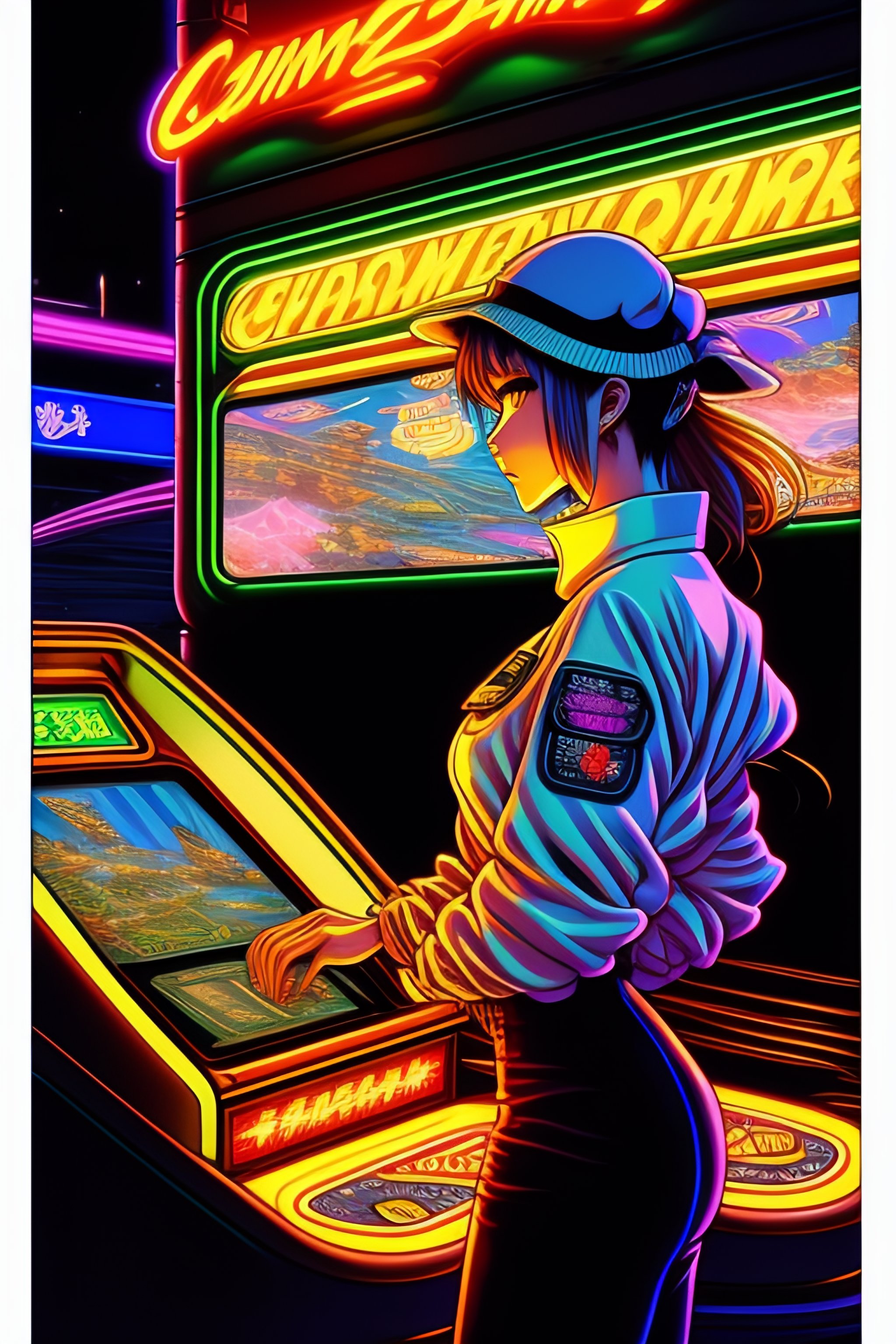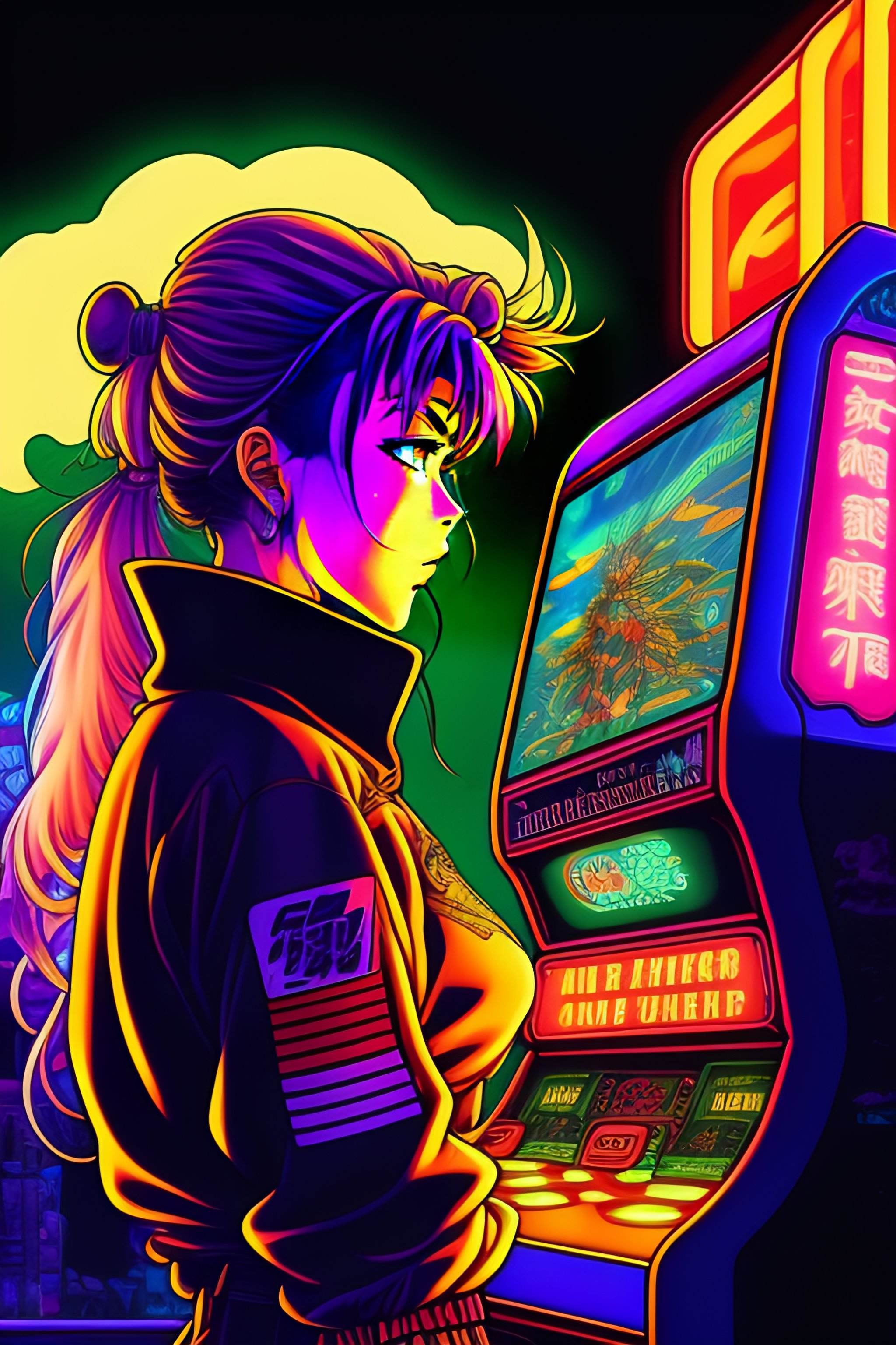Vintage 90's anime style environmental wide shot of a chaotic arcade at night; a woman wearing streetwear playing an arcade game; by hajime sorayama, greg tocchini, virgil finlay, sci-fi. line art. environmental arcade art.