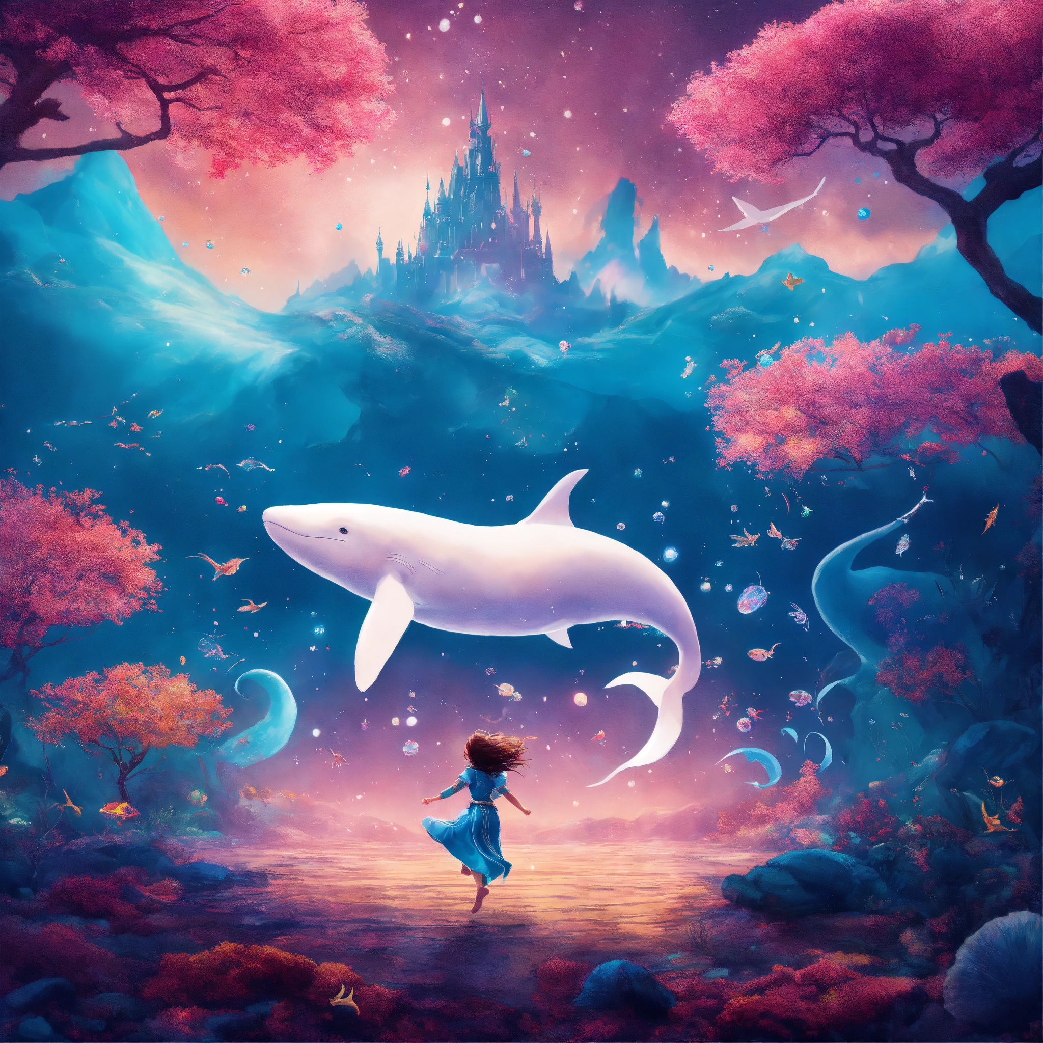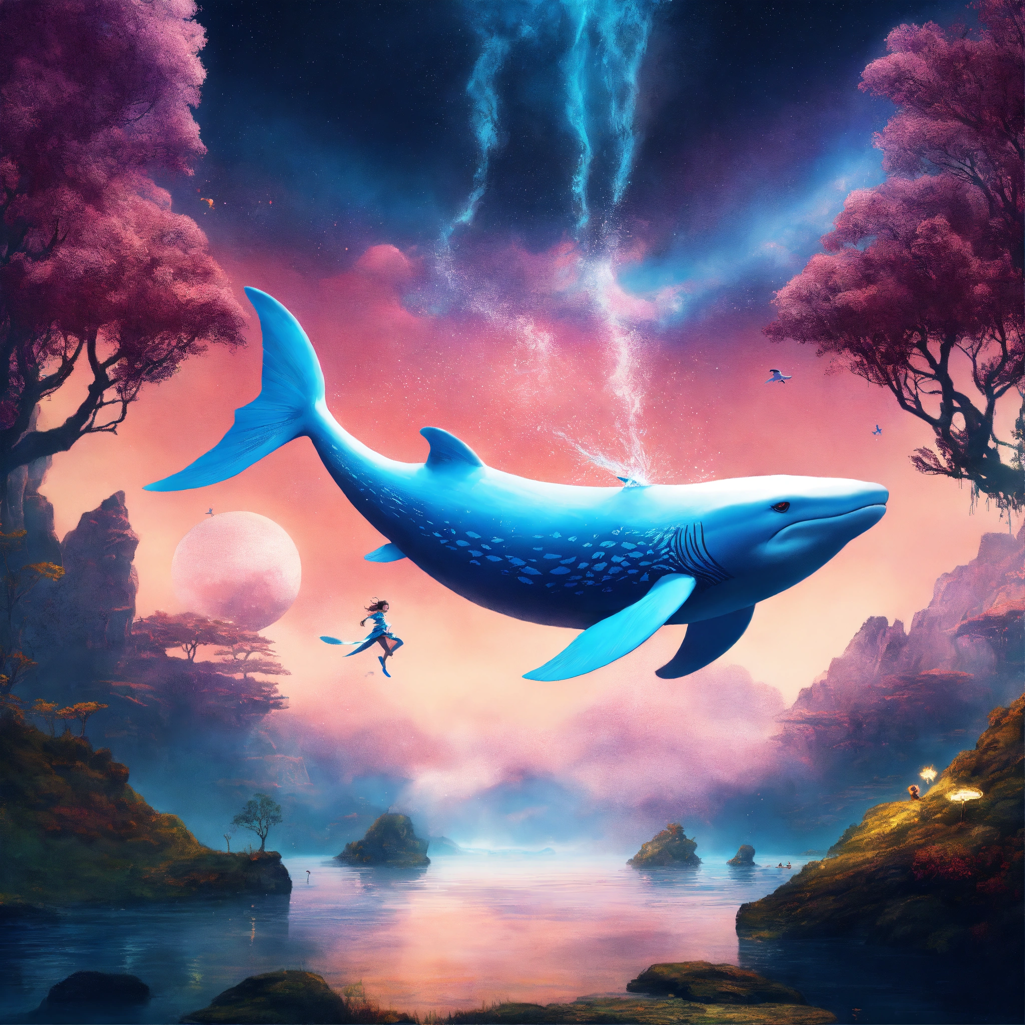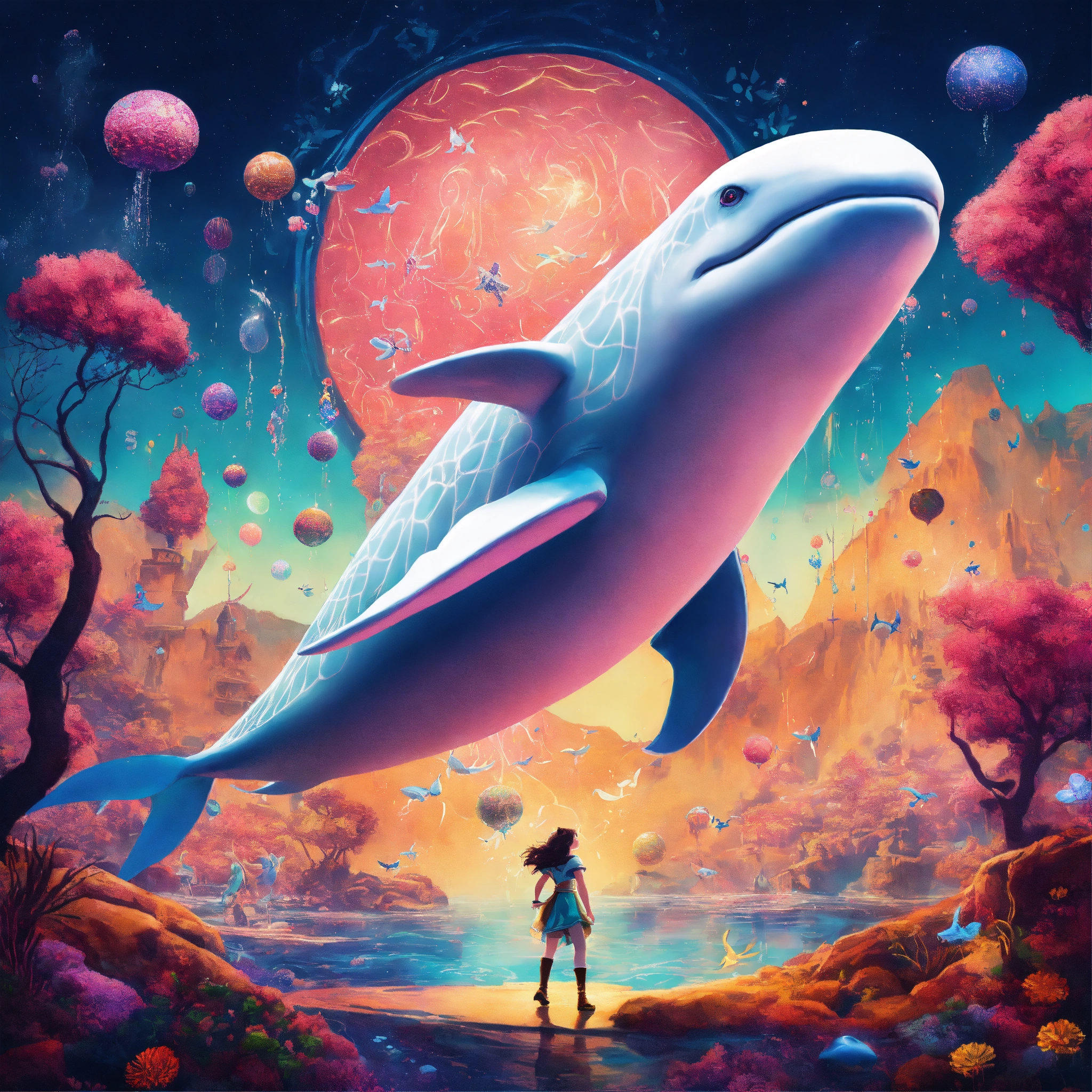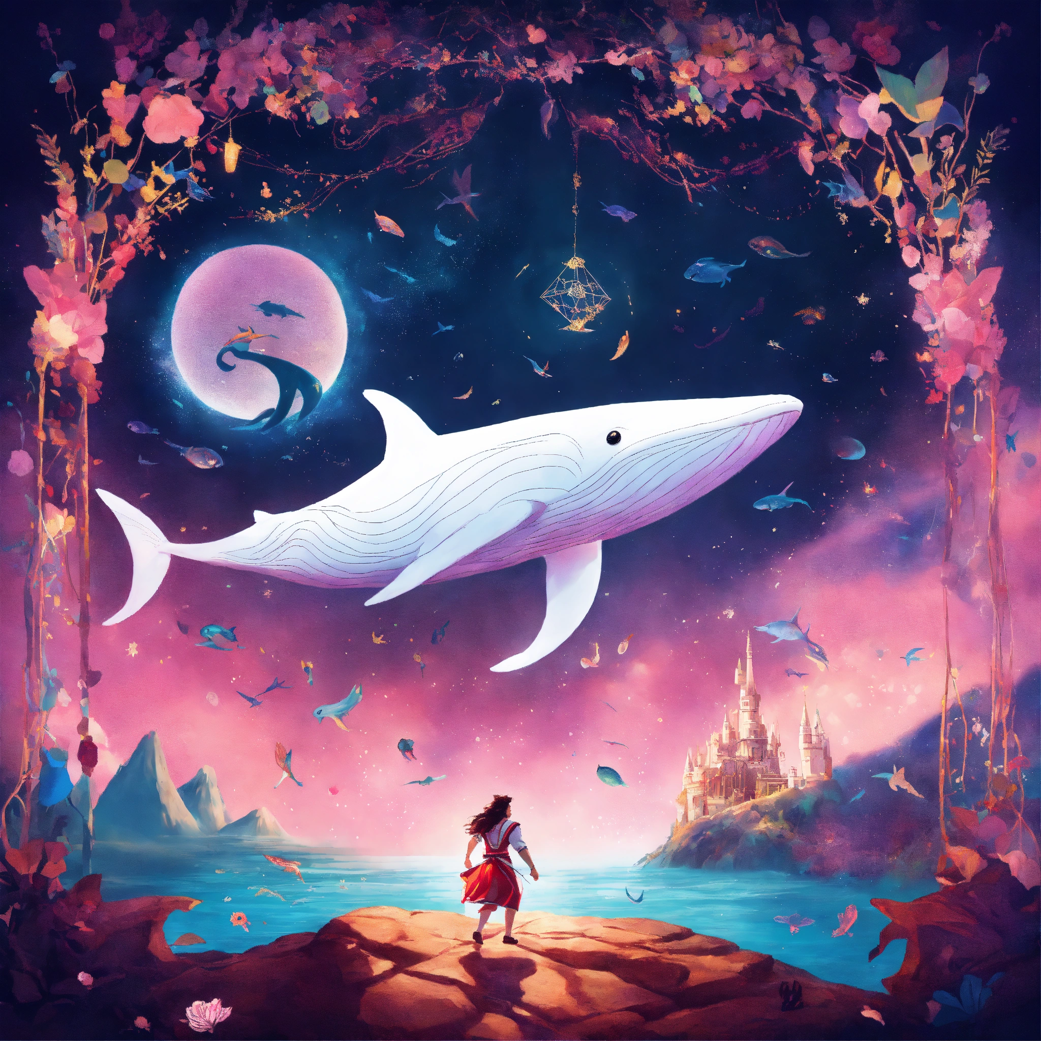 Underwater long exposure photography style, cartoon style, white giant whale circus flying in the cosmos, x-ray style, jumping in martial arts posture, in the style of tim burton, lion king, the chronicles of narnia, beauty and the beast, and peter pan. with native american and sacred geometric patterns on the body. enchanting aura. the chronicles of narnia, wizard of oz, and alice in wonderland background with snow mountains, and trees with pink leaves.