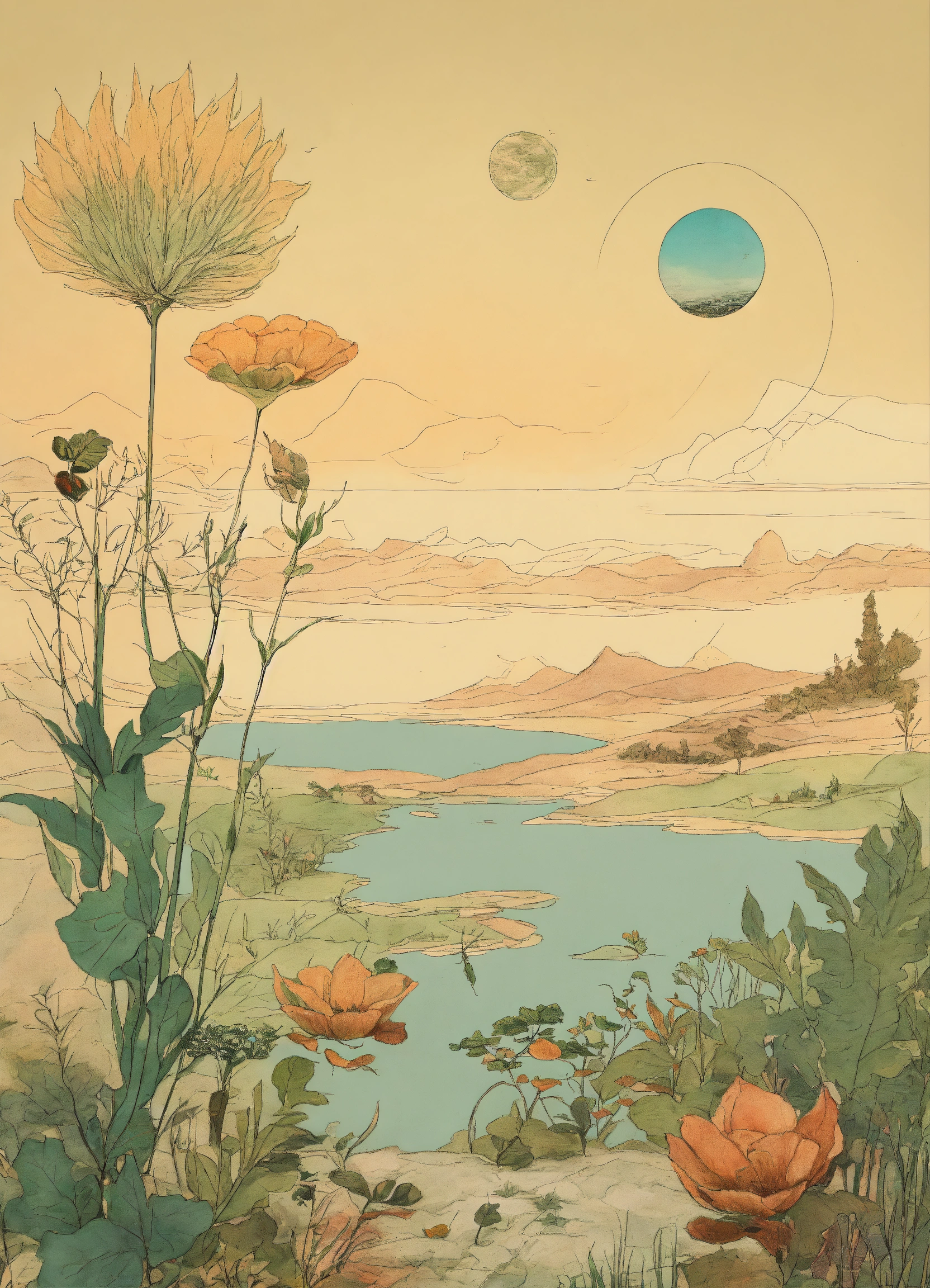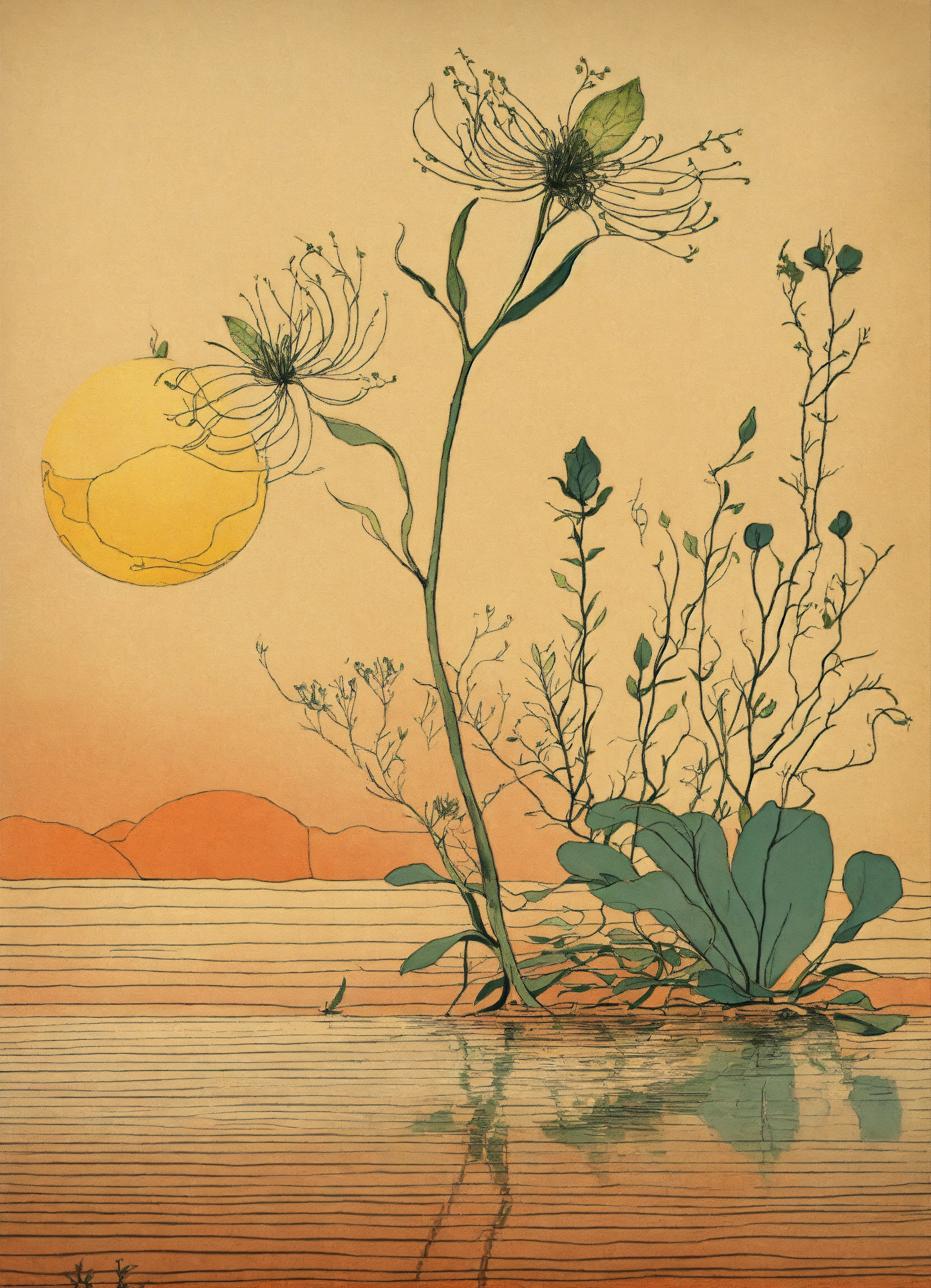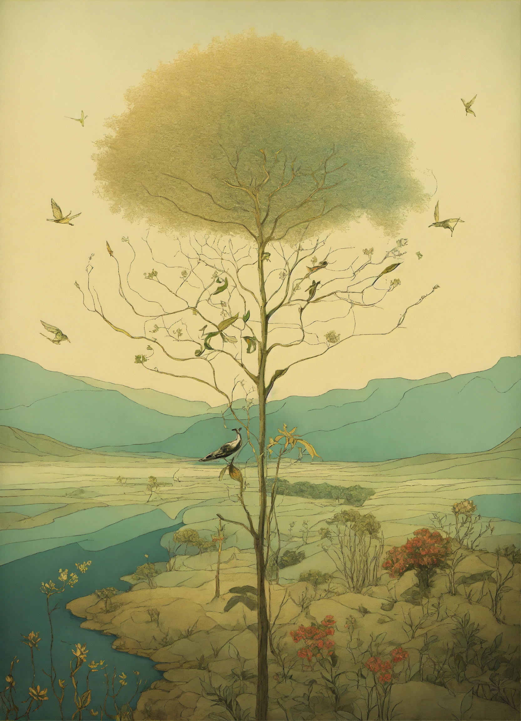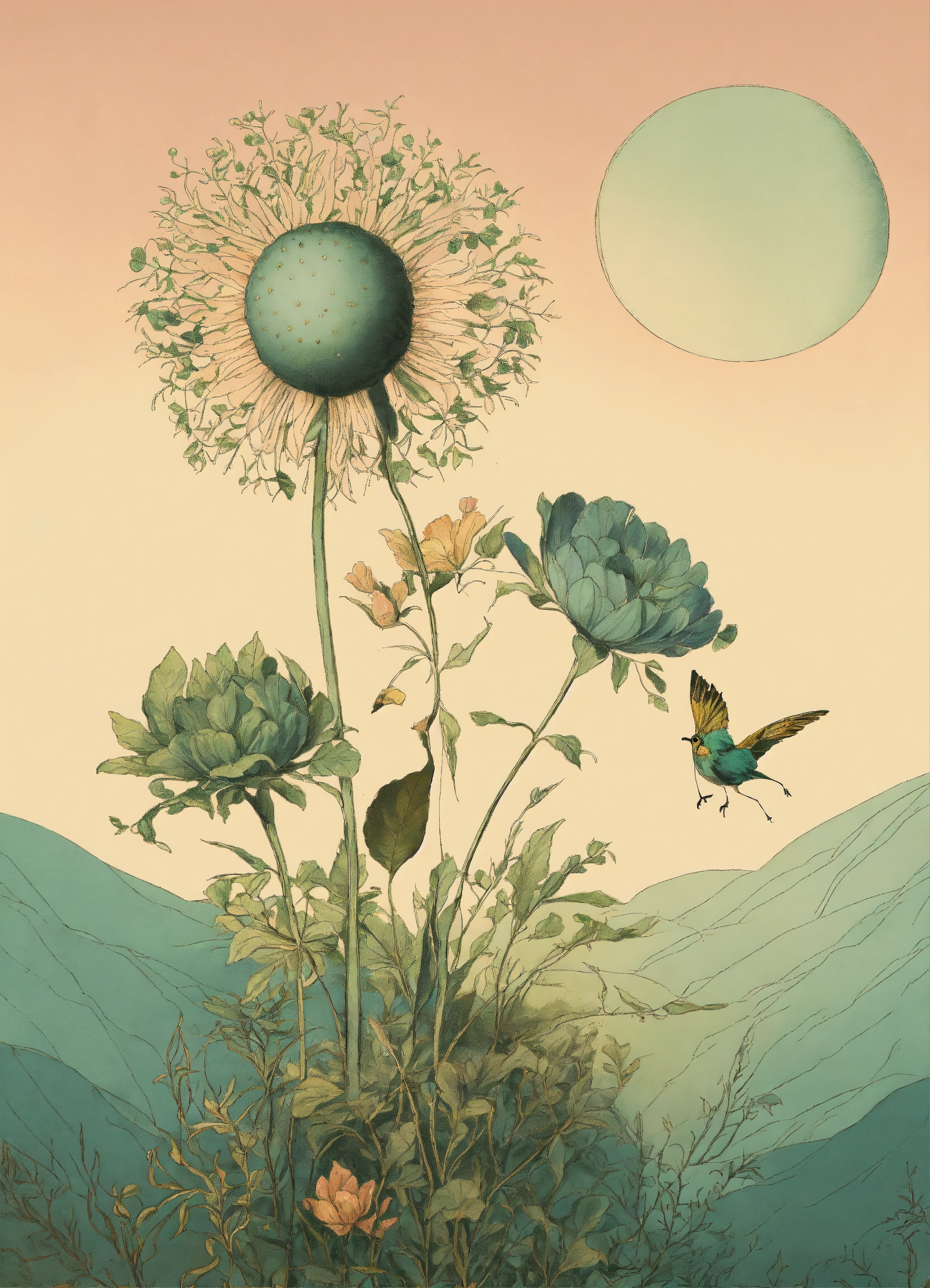 Minimalist botanical surreal vintage drawing, serene muted colors, european mythology style, add animals, ultra high definition 8k, simplistic design by salvador dali