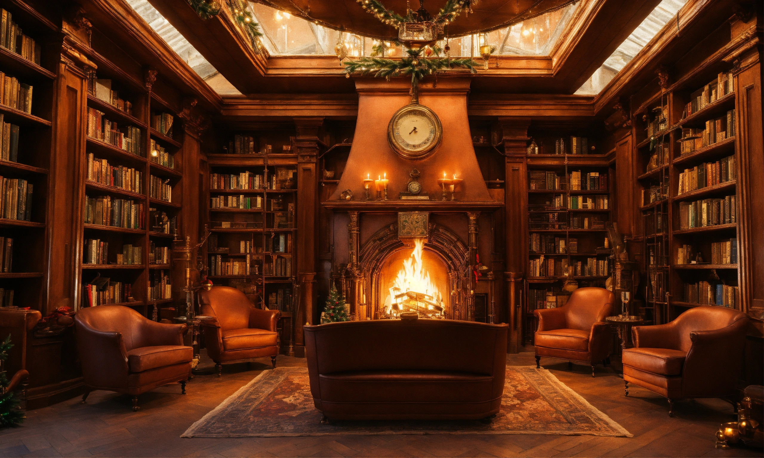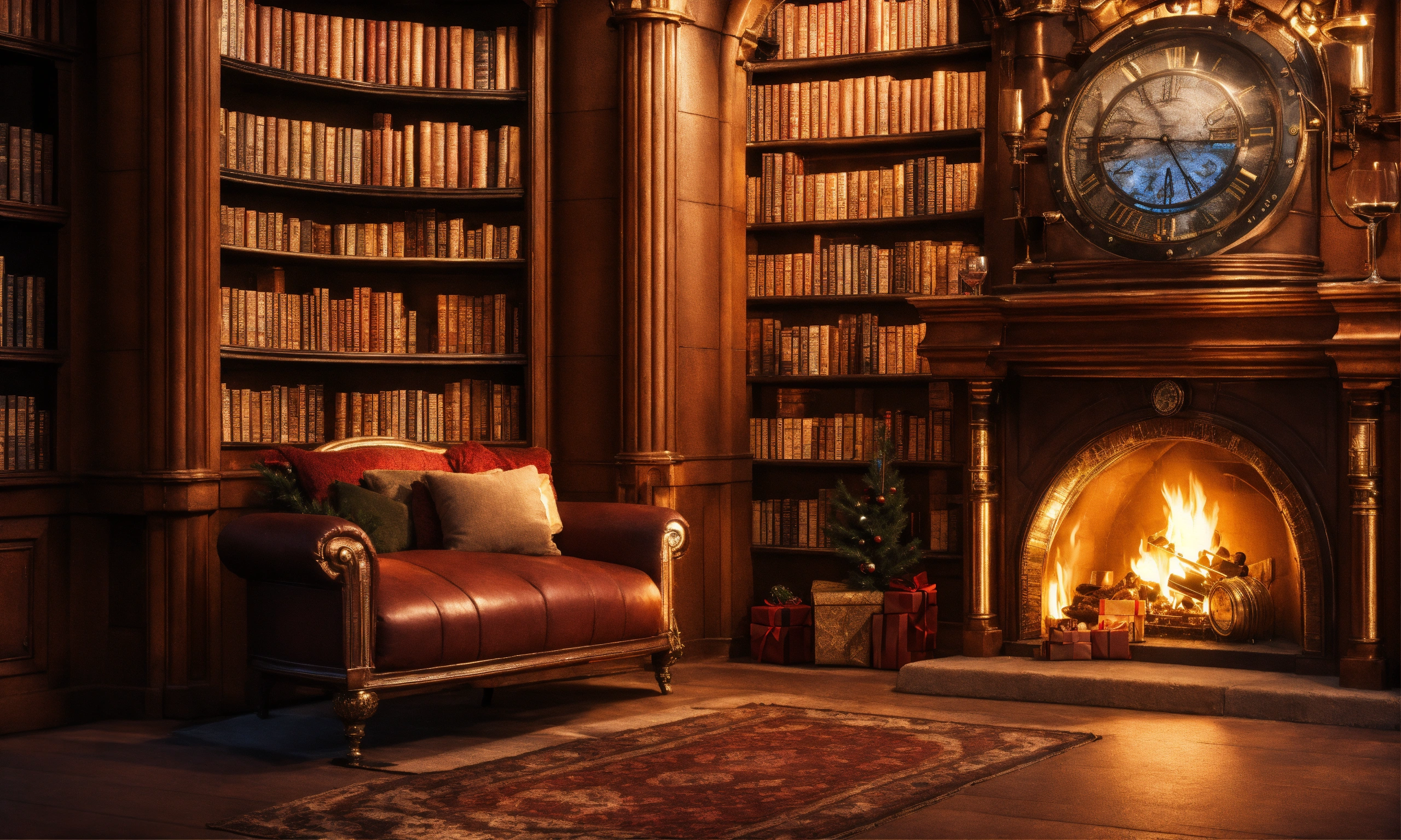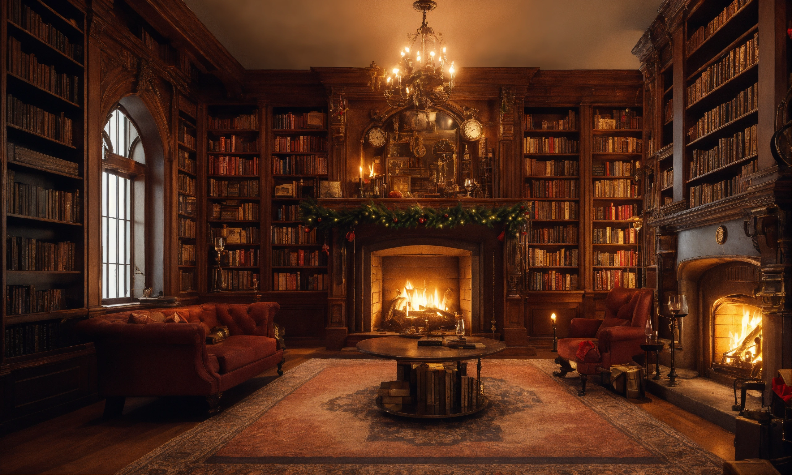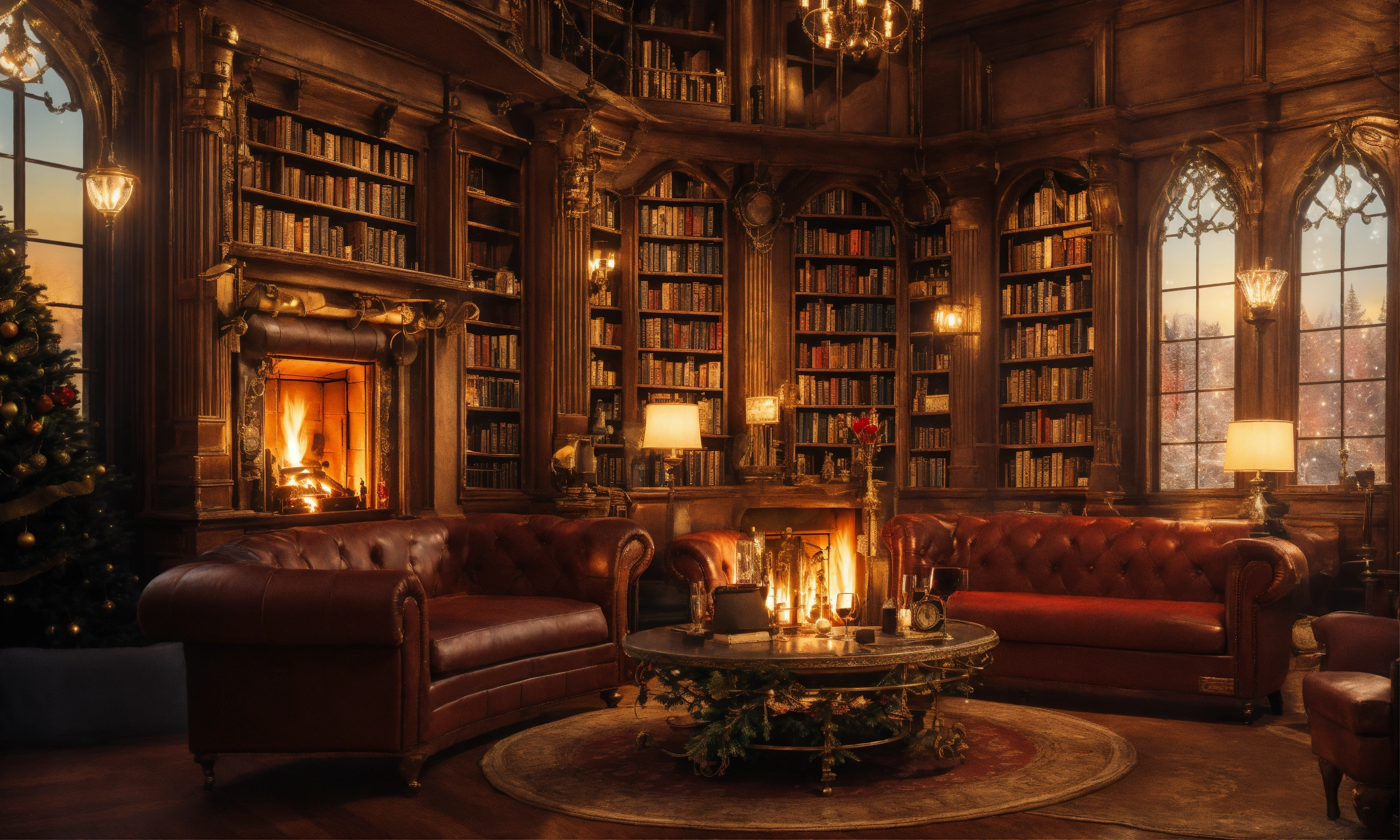 Steampunk library with a giant fireplace with a wine glass at christmas