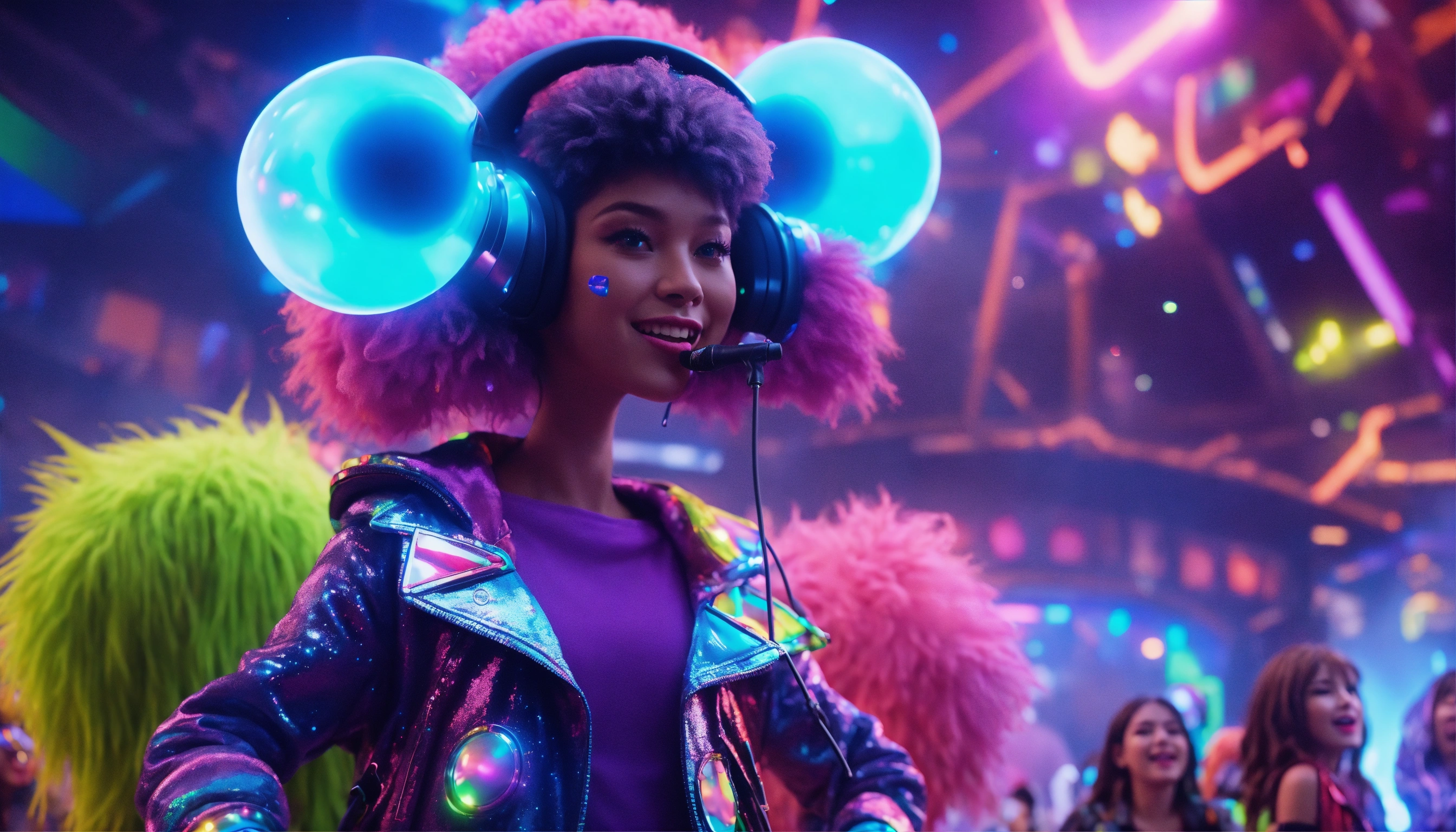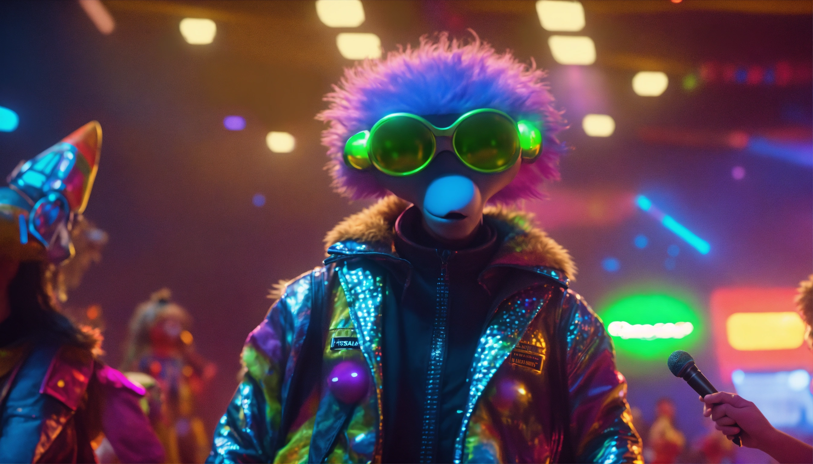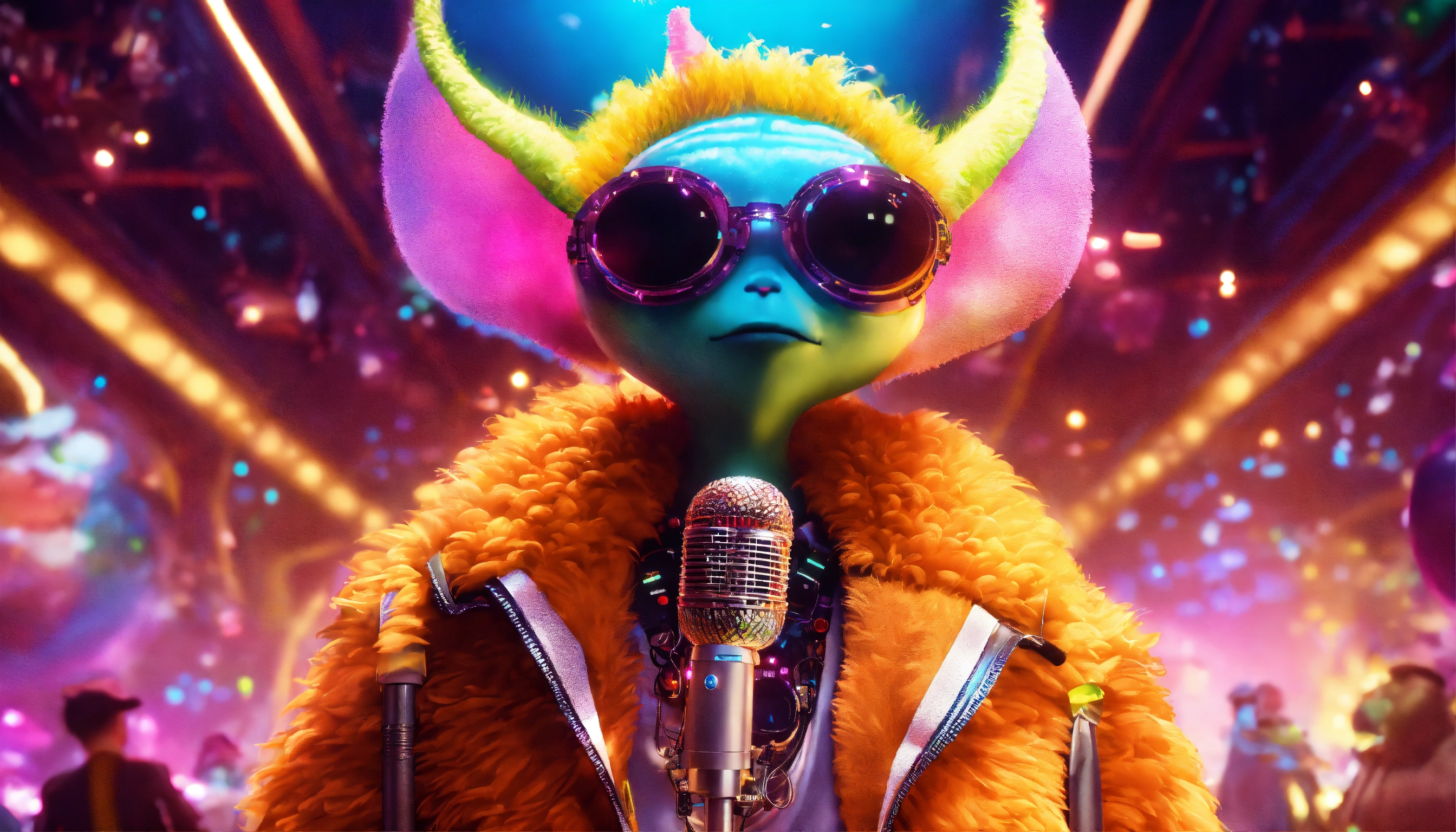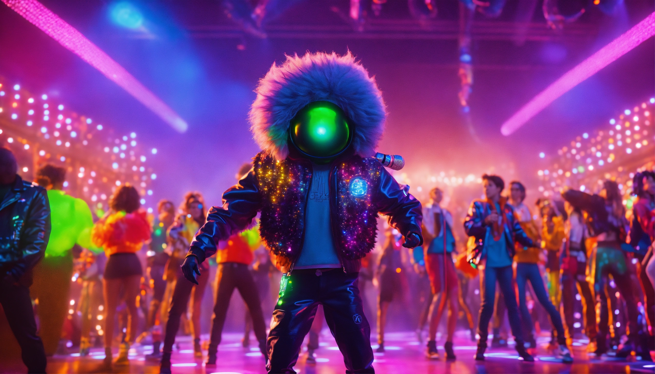 Zoom out on tall funky big fuzzy rockstar jacket talking into a hi-tech alien microphone, people from different galaxies dancing and enjoying the music, pixar, unreal engine, 8k.