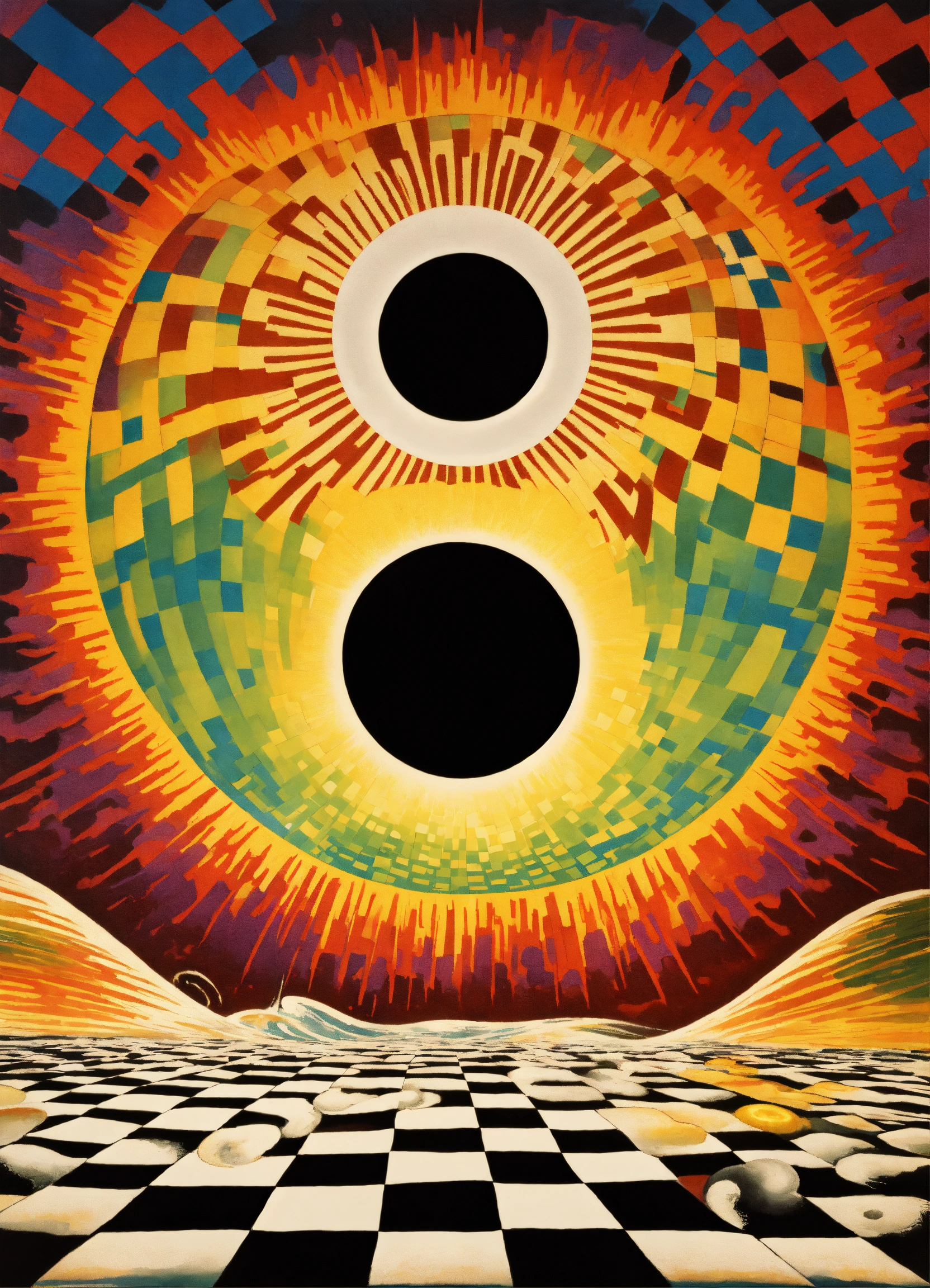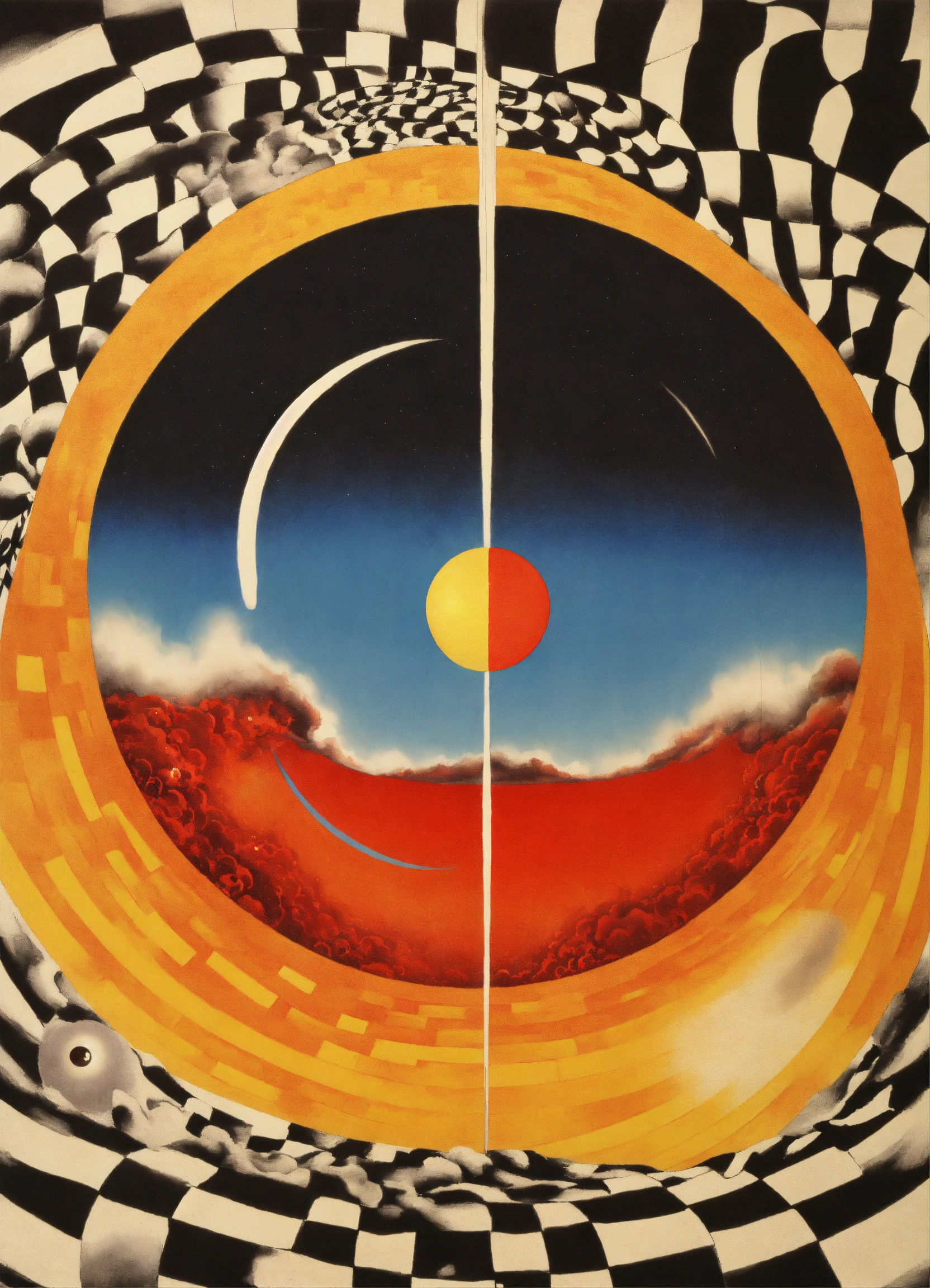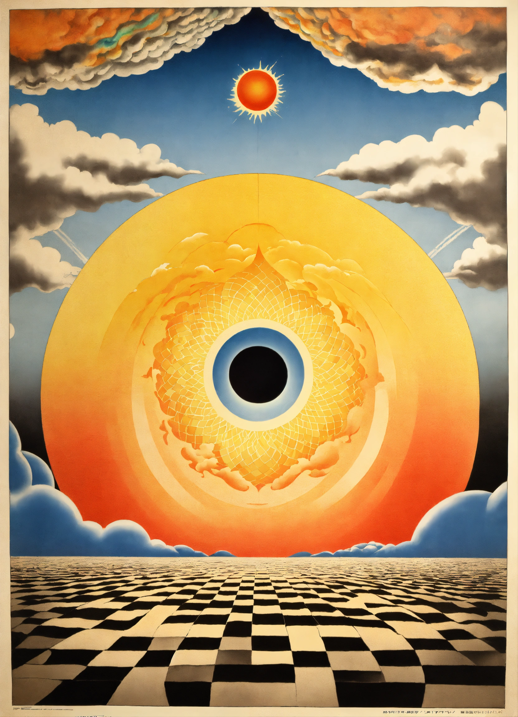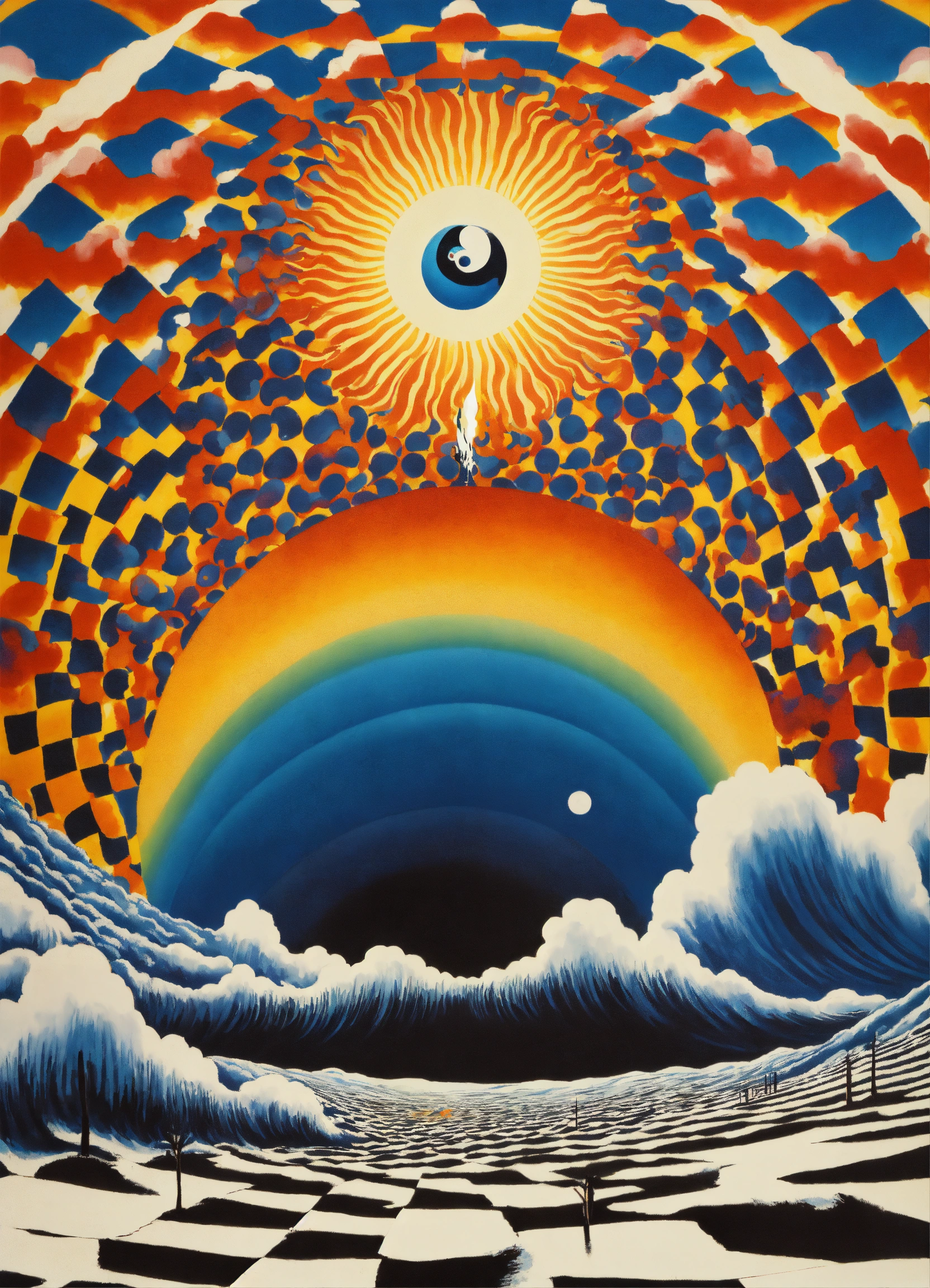 Japanese vintage poster, oriental, big sun, abstract psychedelic vortex, melting eyeball merging into yingyang, dream dimension merging into nebula merging into sun, rainbow geometrical clouds dripping, the four corners of the universe, wavy black and white checkerboard patterns dripping by rene magritte