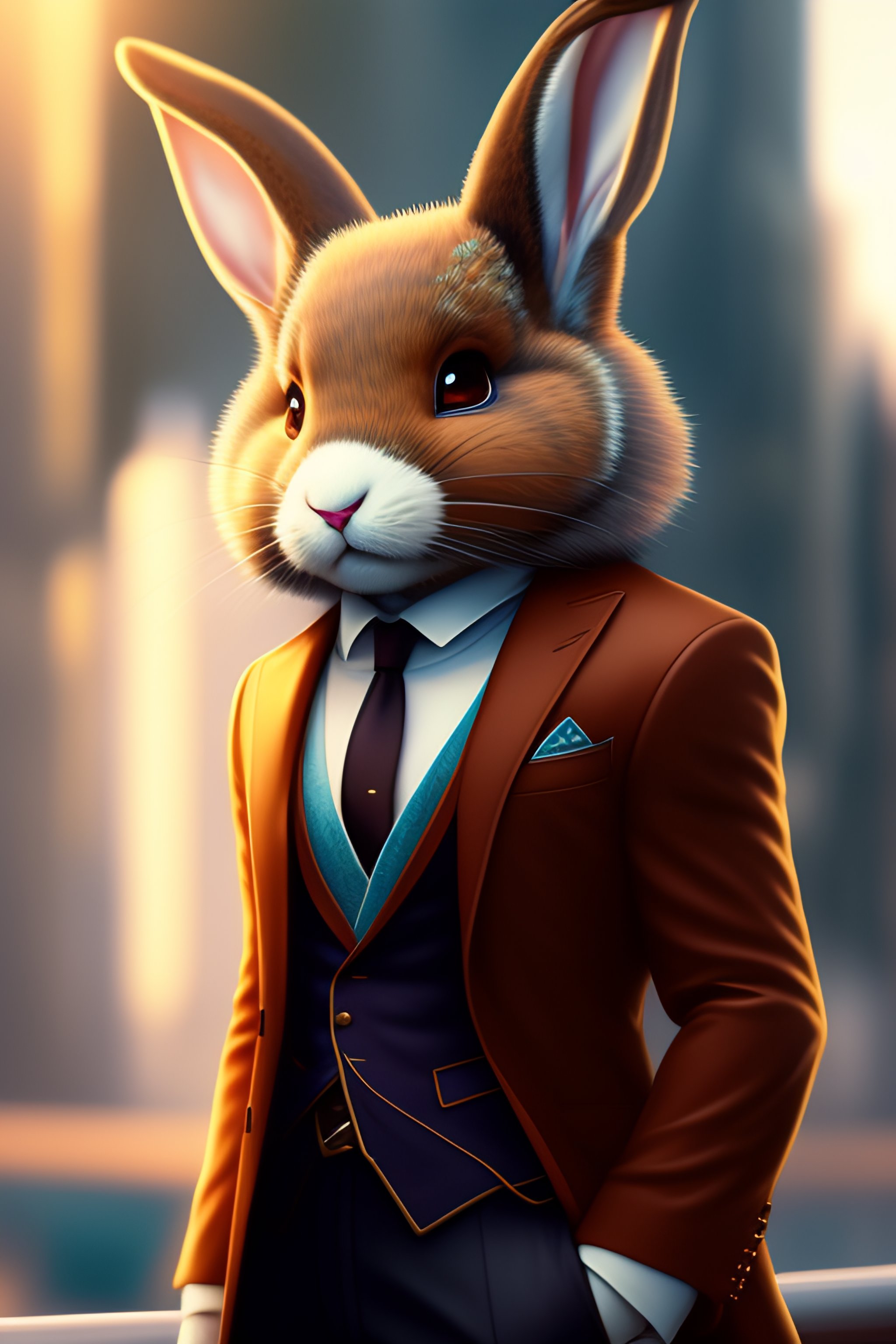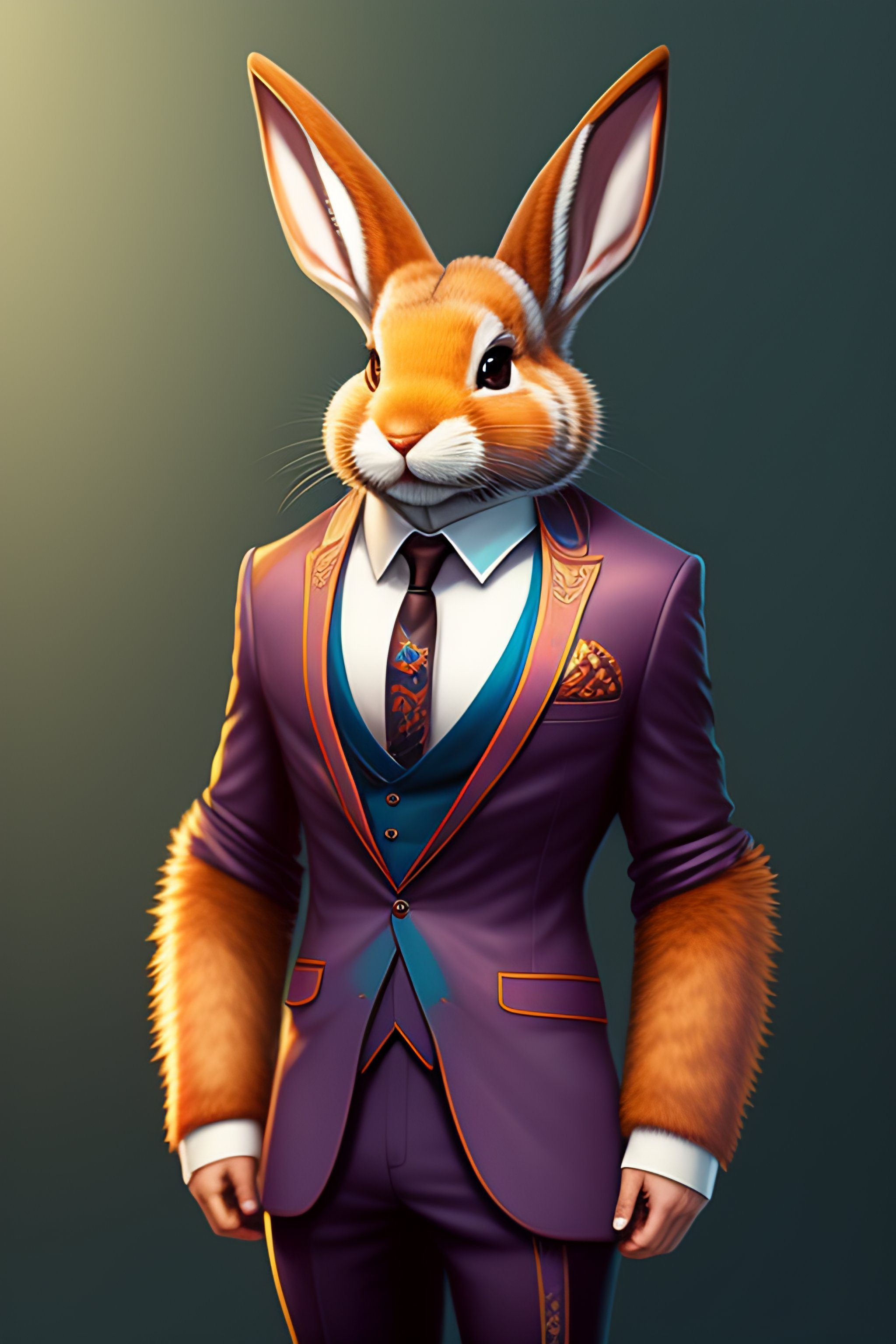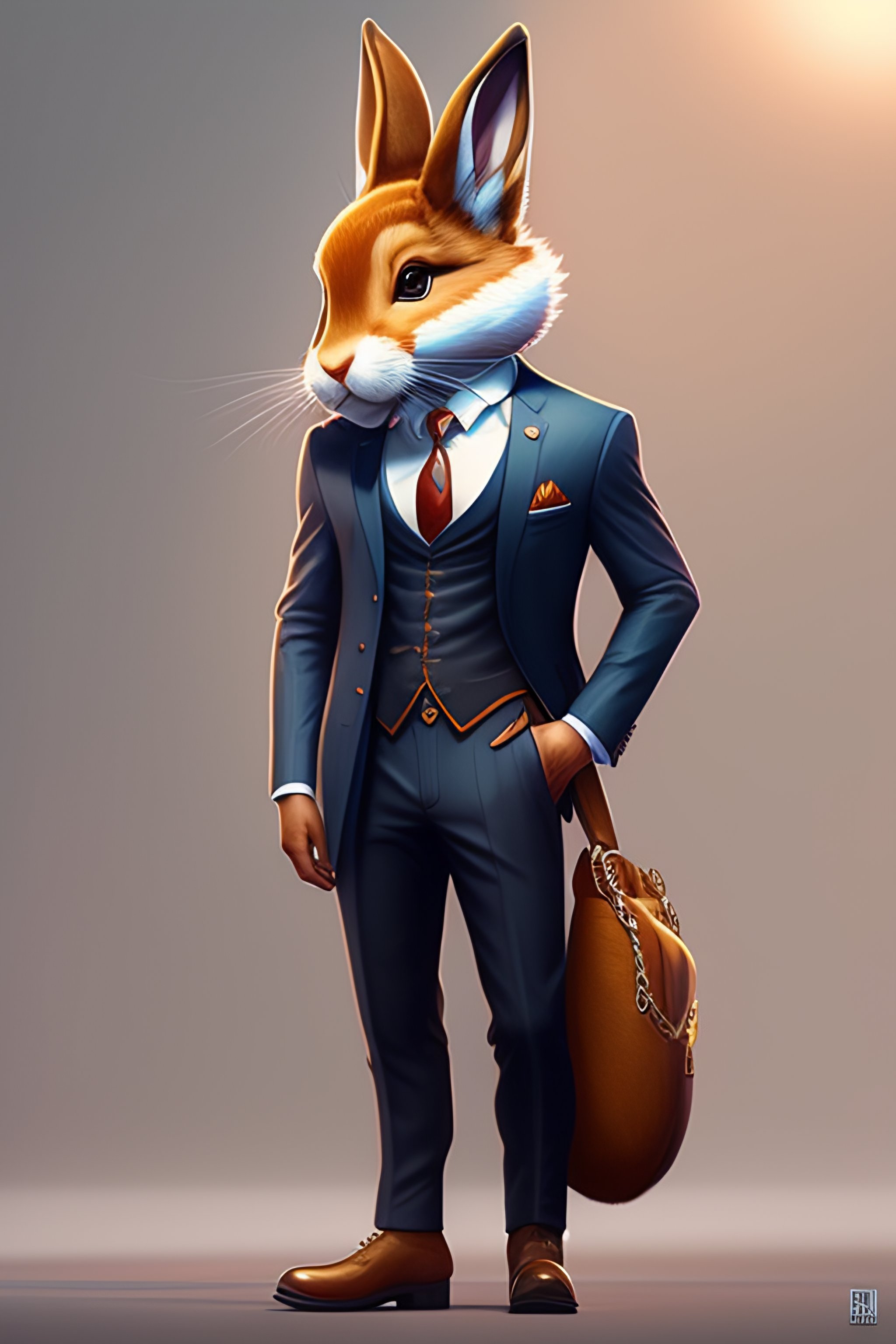 Anthro furry humanoid bunny, three piece suit, checking watch, character concept design, painting, detailed, vivid, trending on artstation