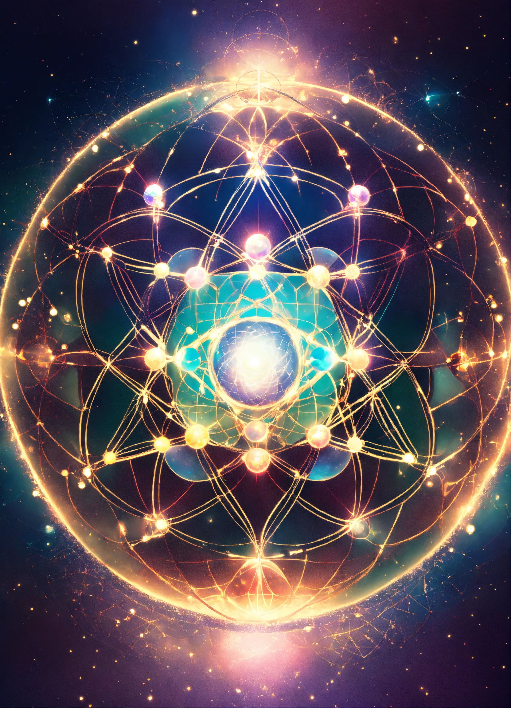 A atom symboles, infinite, connected to other universe, pastel colors, shinning light, sacred geometry