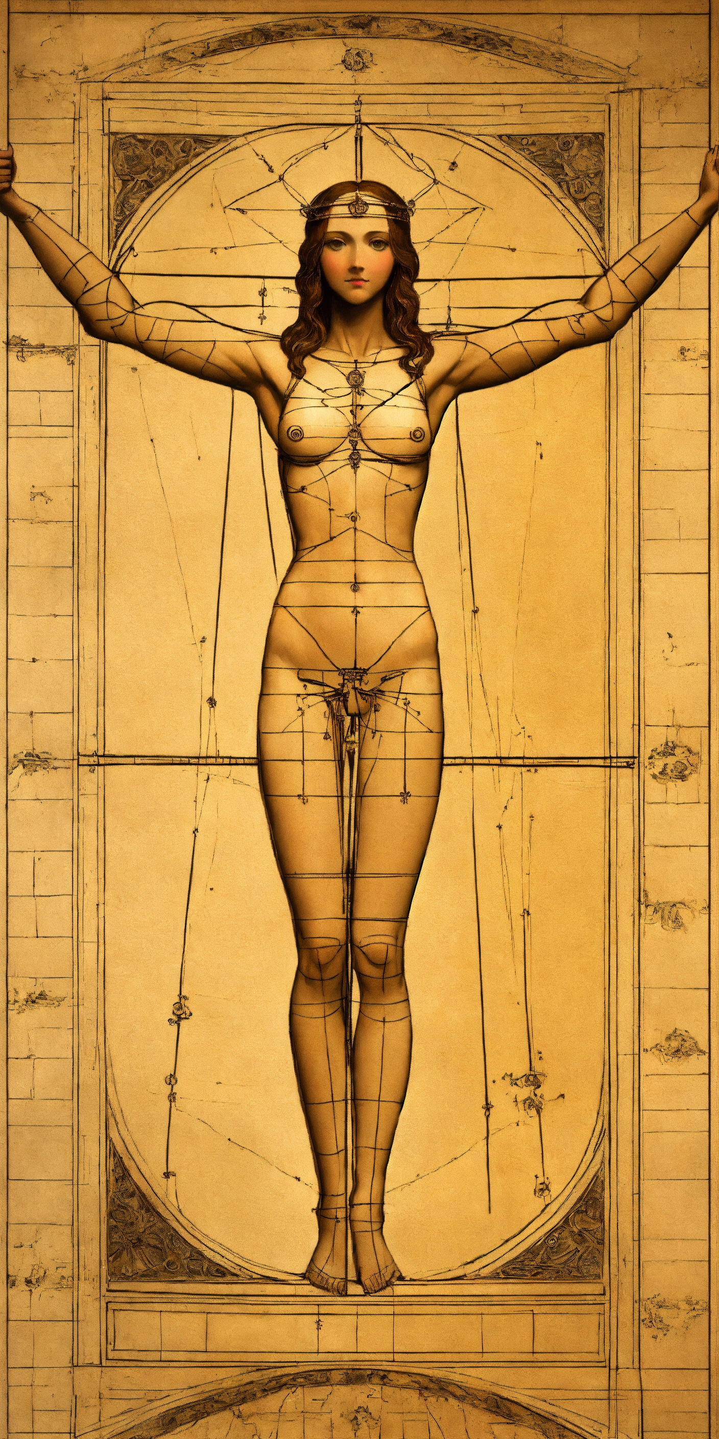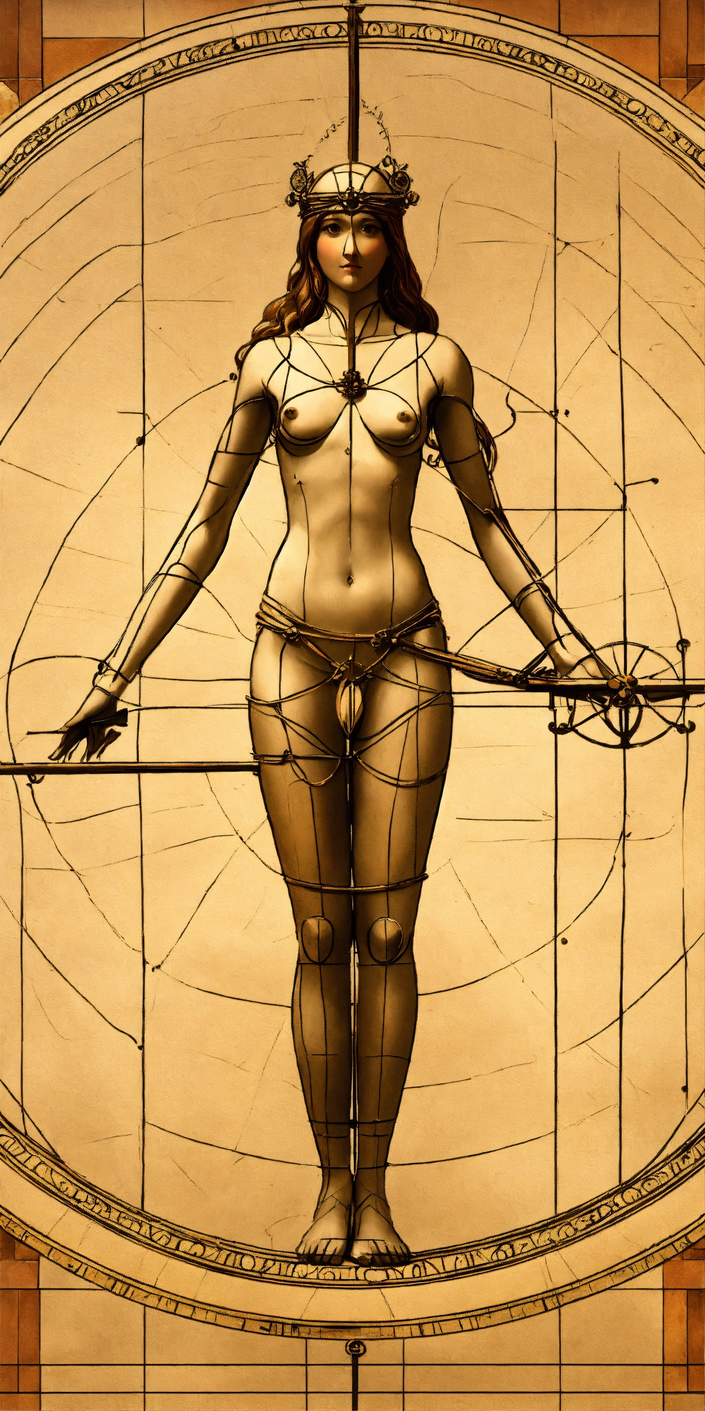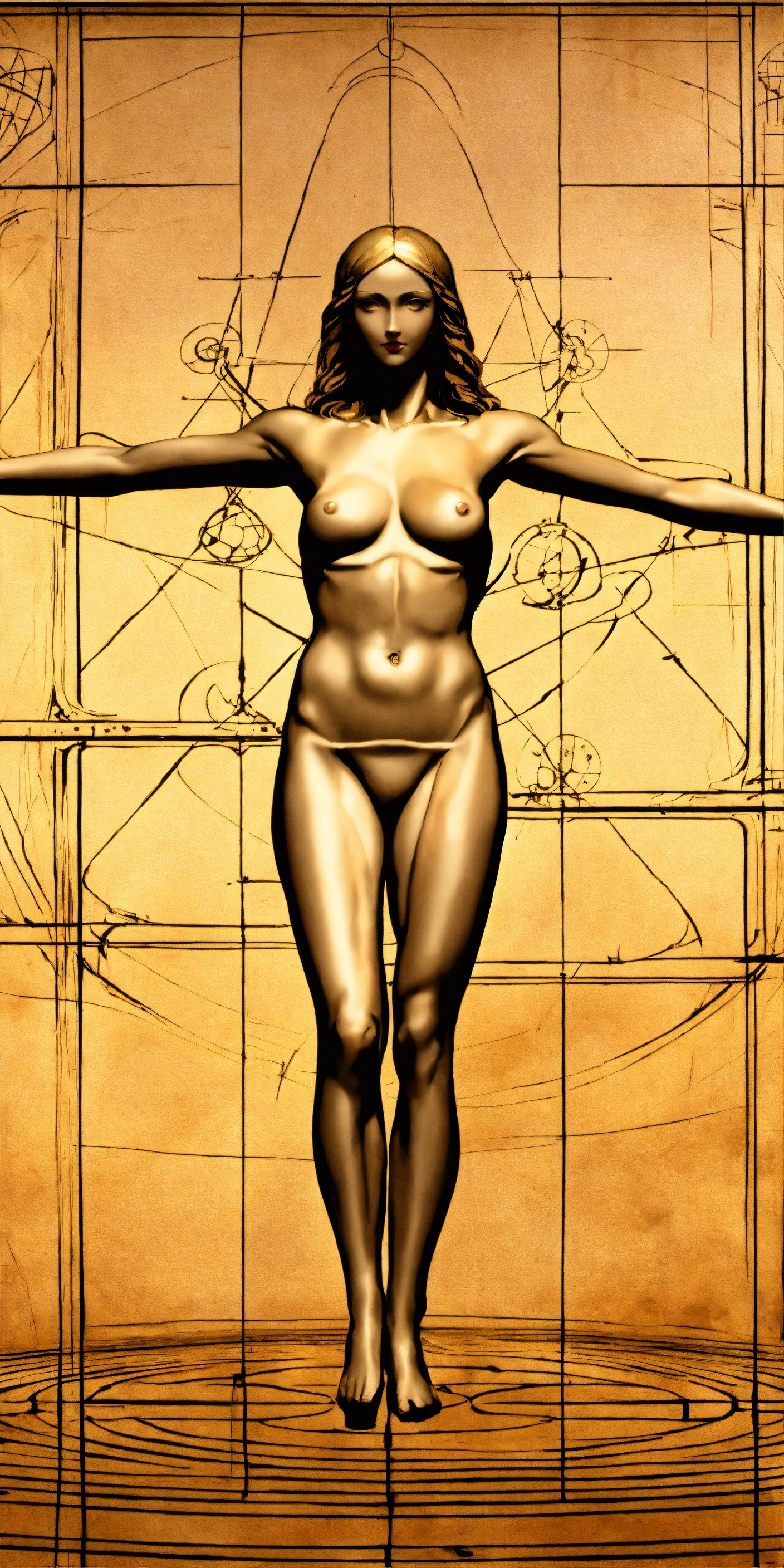 Vitruvian women, leonardo da vinci style, art, very close to the original but with a woman, lot of details, 8k, detailed body, lot of details